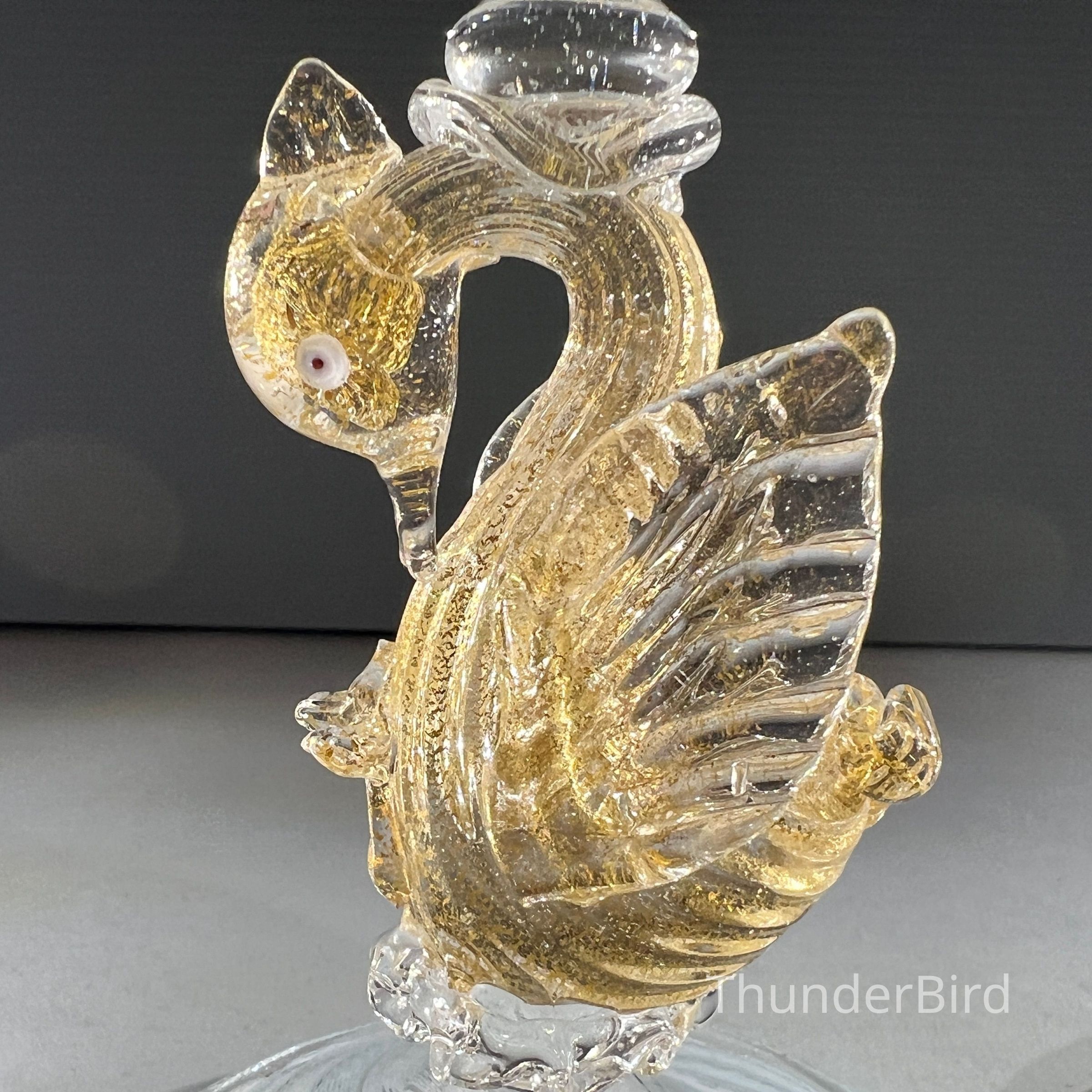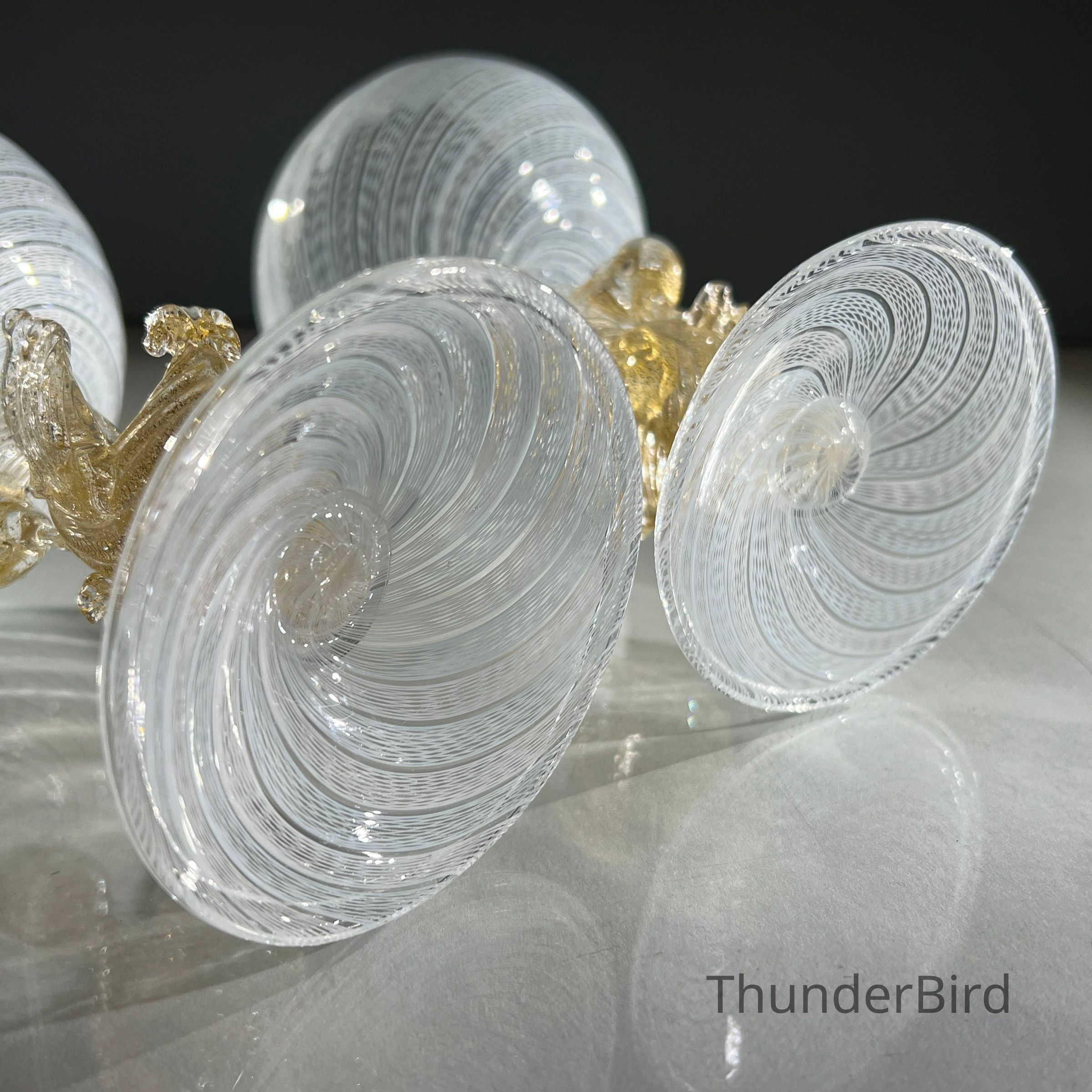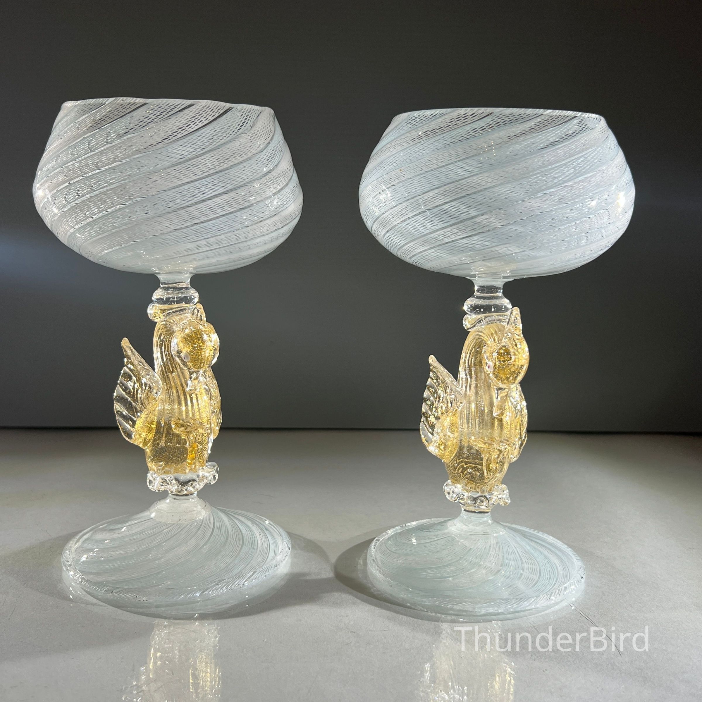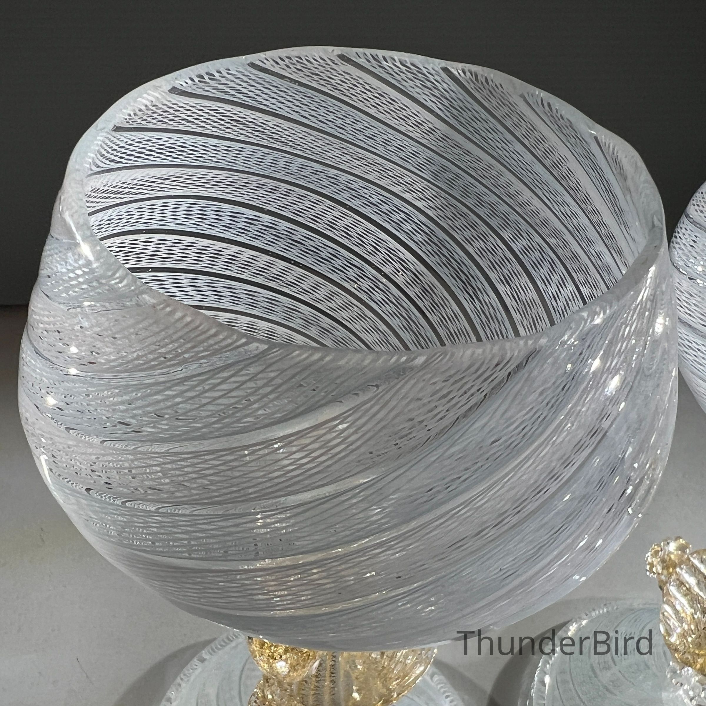 A very special vintage pair of Italian Murano art glass wine goblets featuring sculptural swan form stems enriched with gold. The generously proportioned bowls are crafted using Garza filigrana cane work, a fine gauze like lattice technique, in white with pale blue tones arranged in an elegant spiral. Each stem is individually hand formed with applied wings, curved neck and detailed eyes, demonstrating the skilled hot worked glass techniques of mid century Murano. With their rounded bowl shape and open rim by period standards, these were intended as true wine goblets, suitable for white wines, rosé and lighter reds, as well as traditional European table wines. Dating to circa 1950s to 1960s, they would originally have formed part of a larger matched set and remain both functional and highly decorative. [I am listing 2 pairs of these goblets].
