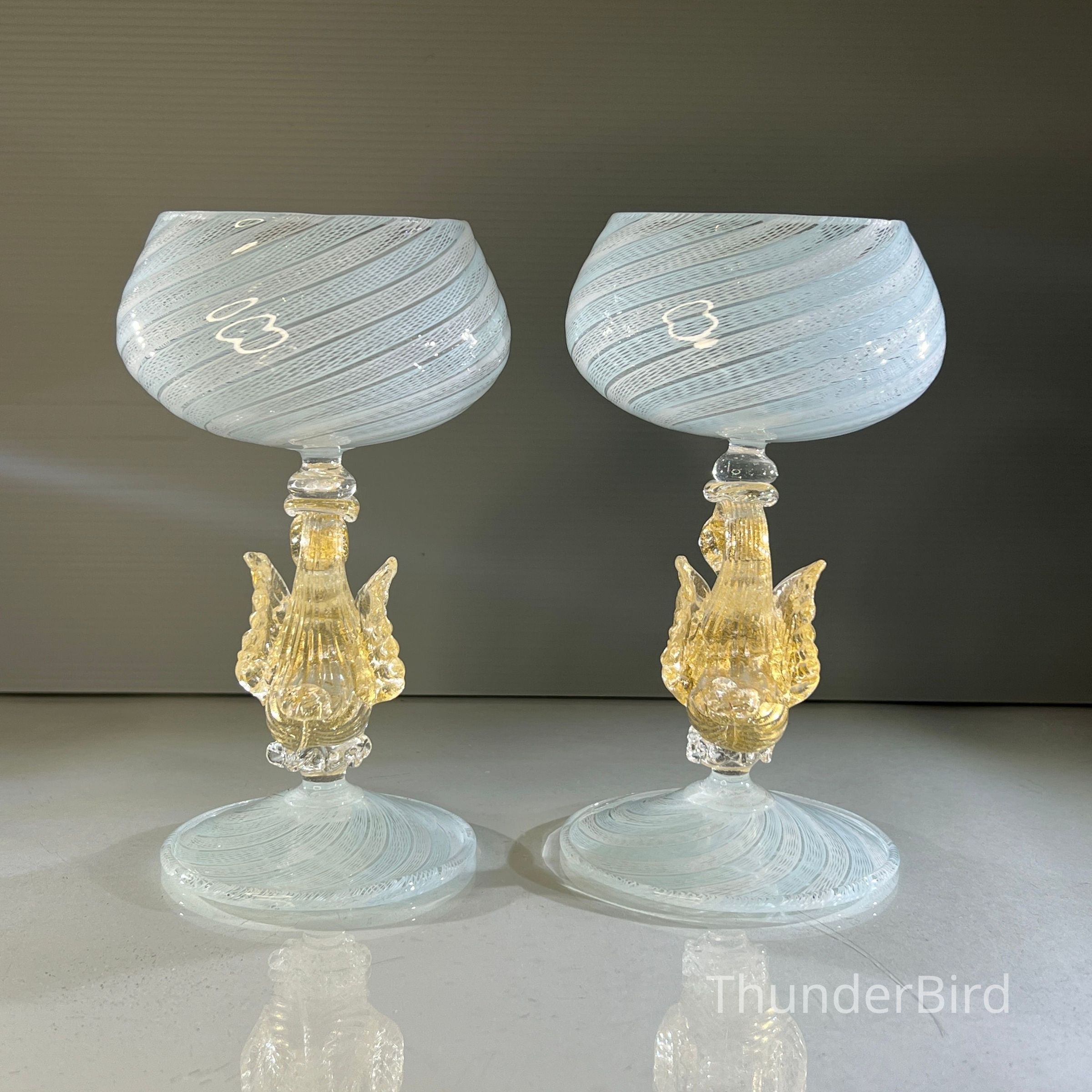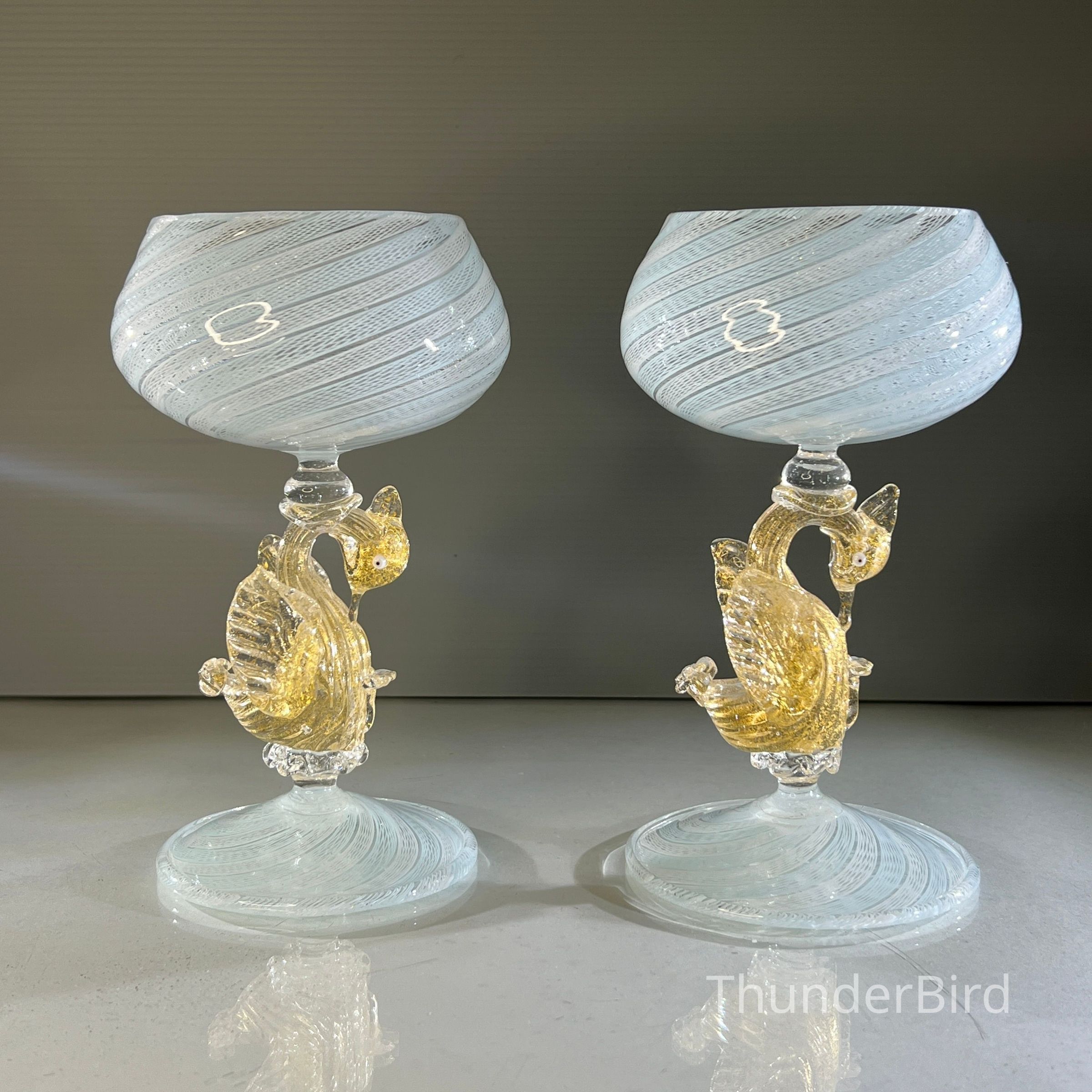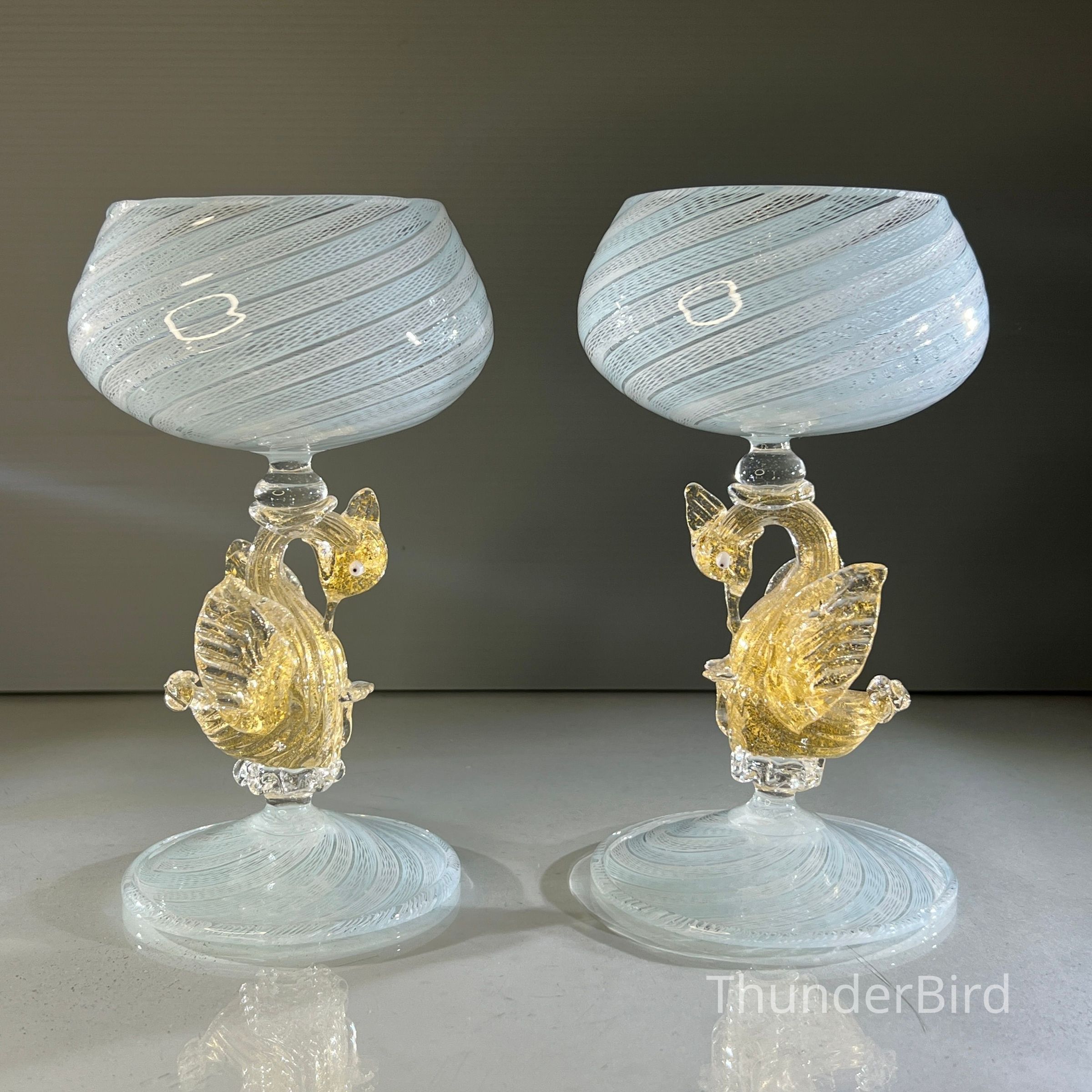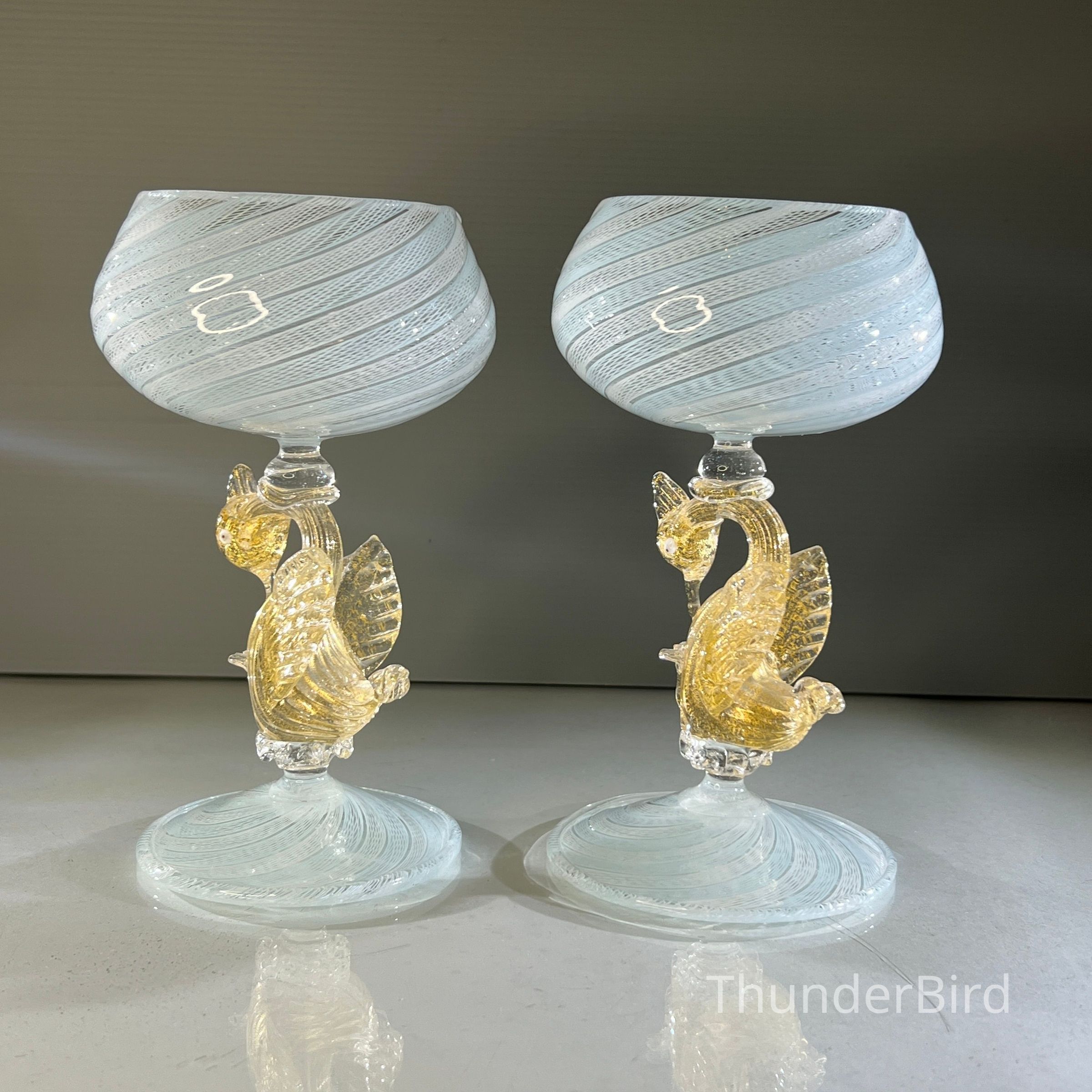 A very special vintage pair of Italian Murano art glass wine goblets featuring sculptural swan form stems enriched with gold. The generously proportioned bowls are crafted using Garza filigrana cane work, a fine gauze like lattice technique, in white with pale blue tones arranged in an elegant spiral. Each stem is individually hand formed with applied wings, curved neck and detailed eyes, demonstrating the skilled hot worked glass techniques of mid century Murano. With their rounded bowl shape and open rim by period standards, these were intended as true wine goblets, suitable for white wines, rosé and lighter reds, as well as traditional European table wines. Dating to circa 1950s to 1960s, they would originally have formed part of a larger matched set and remain both functional and highly decorative. [I am listing 2 pairs of these goblets].