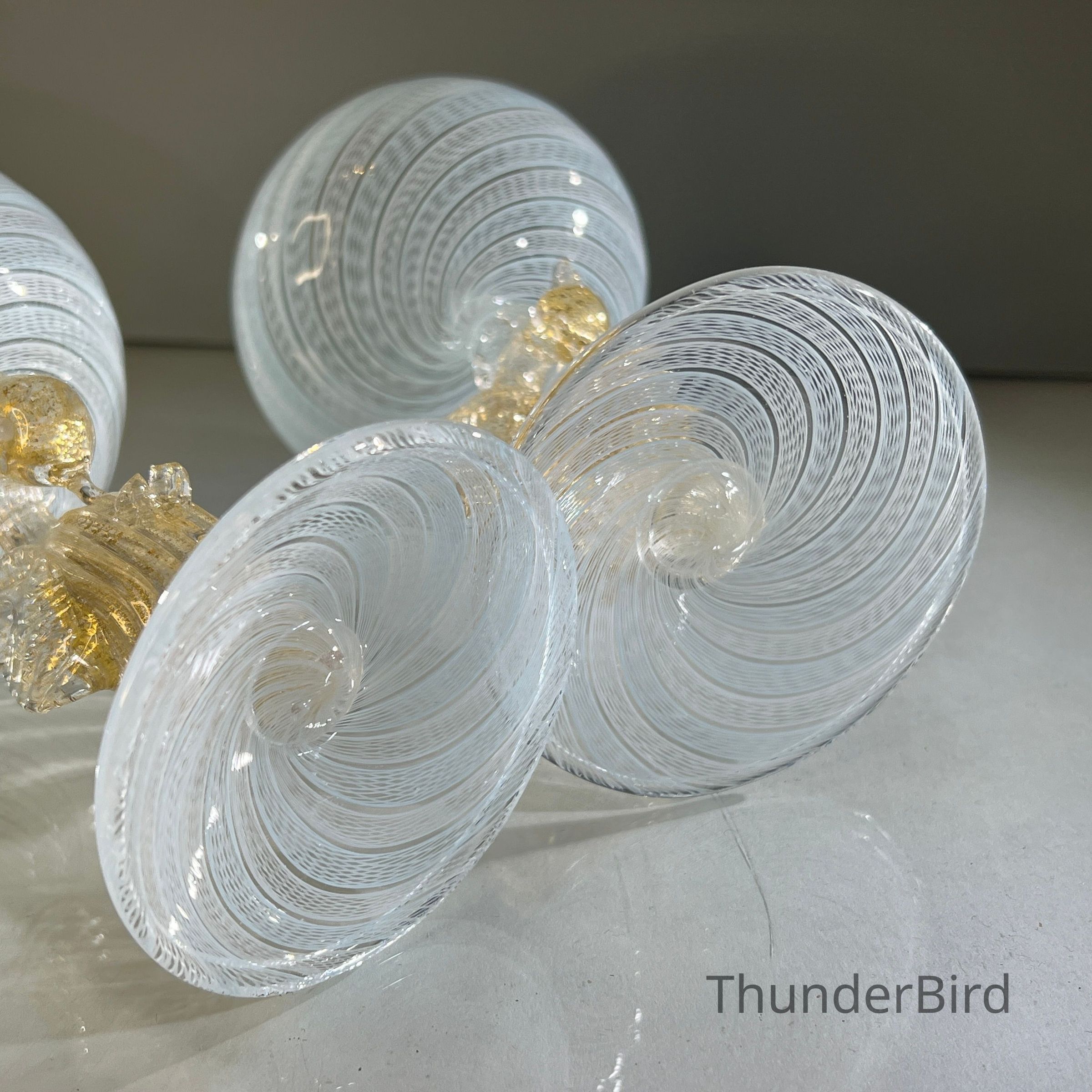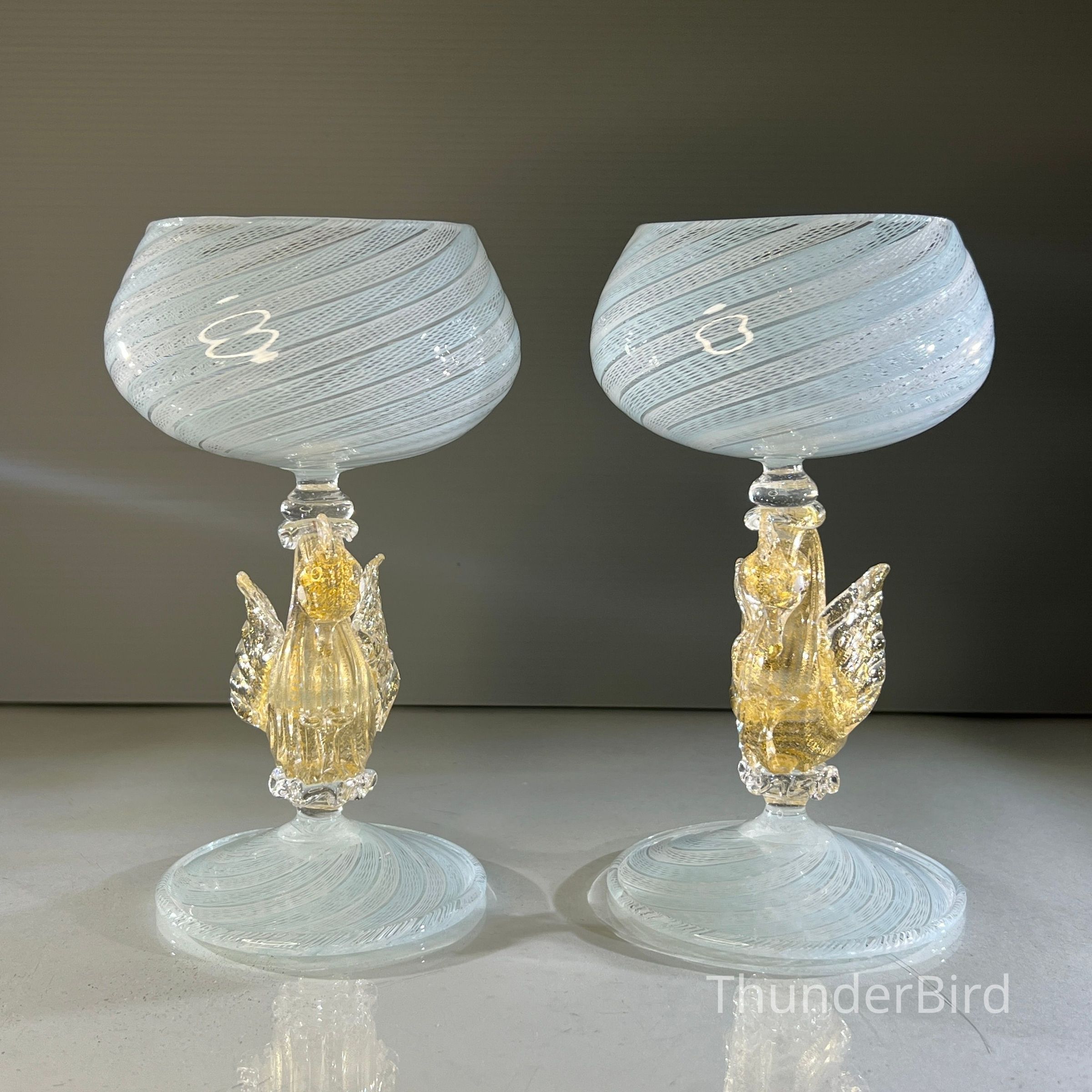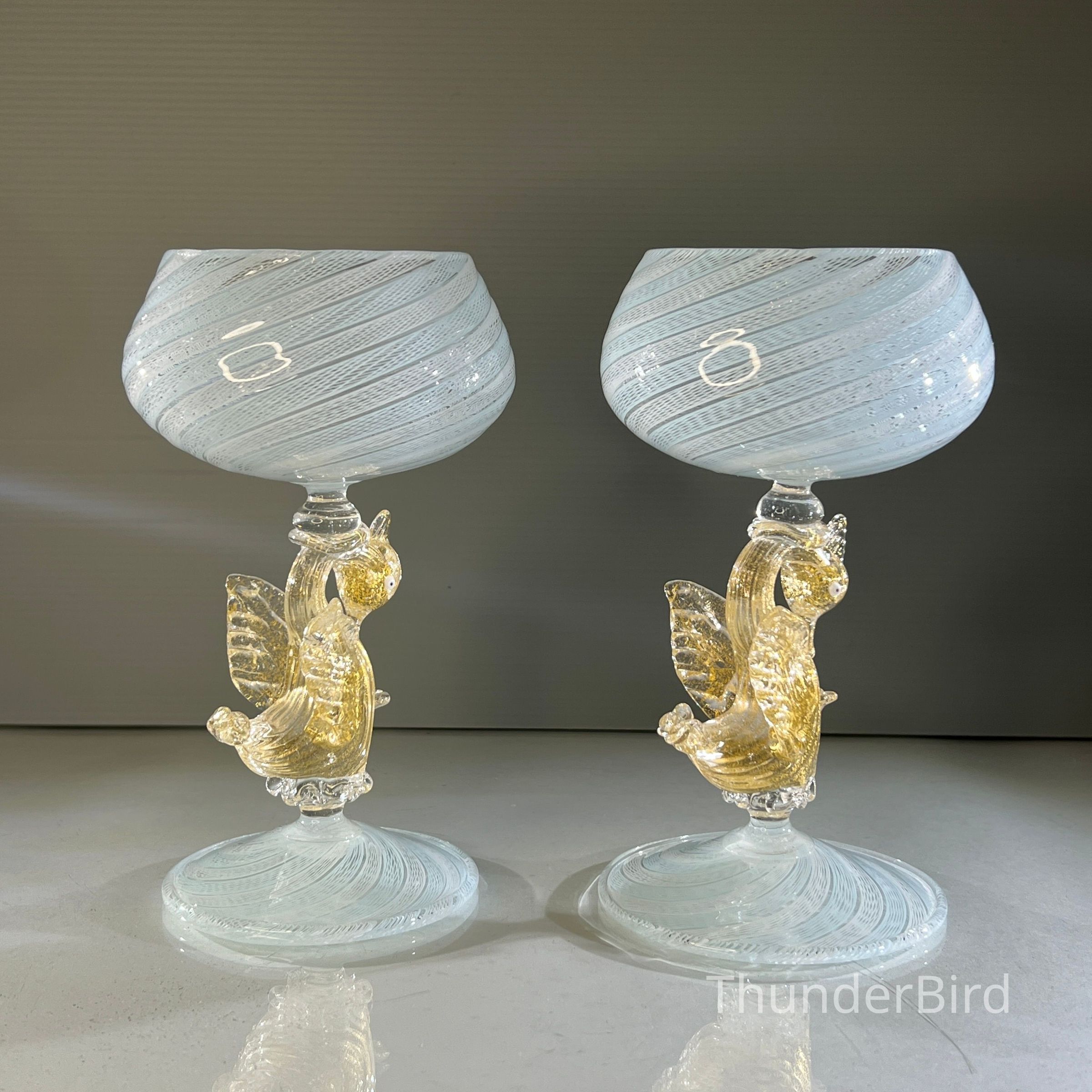 A very special vintage pair of Italian Murano art glass wine goblets featuring sculptural swan form stems enriched with gold. The generously proportioned bowls are crafted using Garza filigrana cane work, a fine gauze like lattice technique, in white with pale blue tones arranged in an elegant spiral. Each stem is individually hand formed with applied wings, curved neck and detailed eyes, demonstrating the skilled hot worked glass techniques of mid century Murano. With their rounded bowl shape and open rim by period standards, these were intended as true wine goblets, suitable for white wines, rosé and lighter reds, as well as traditional European table wines. Dating to circa 1950s to 1960s, they would originally have formed part of a larger matched set and remain both functional and highly decorative. [I am listing 2 pairs of these goblets].