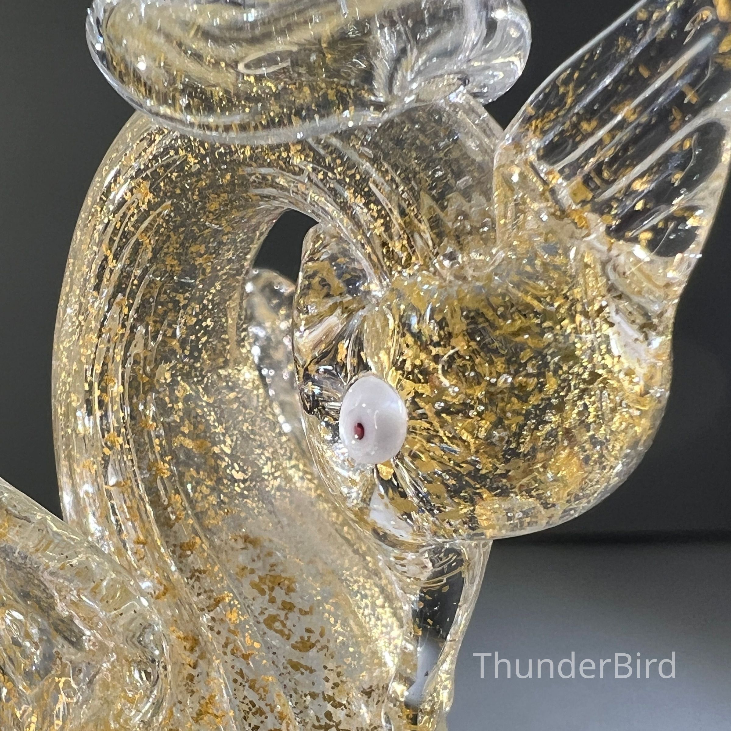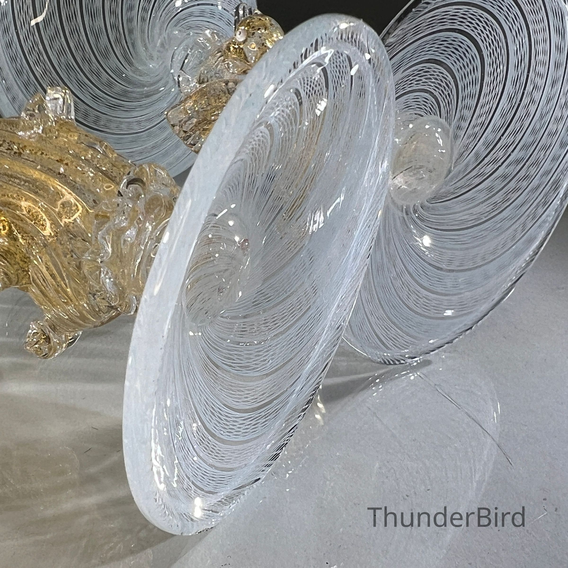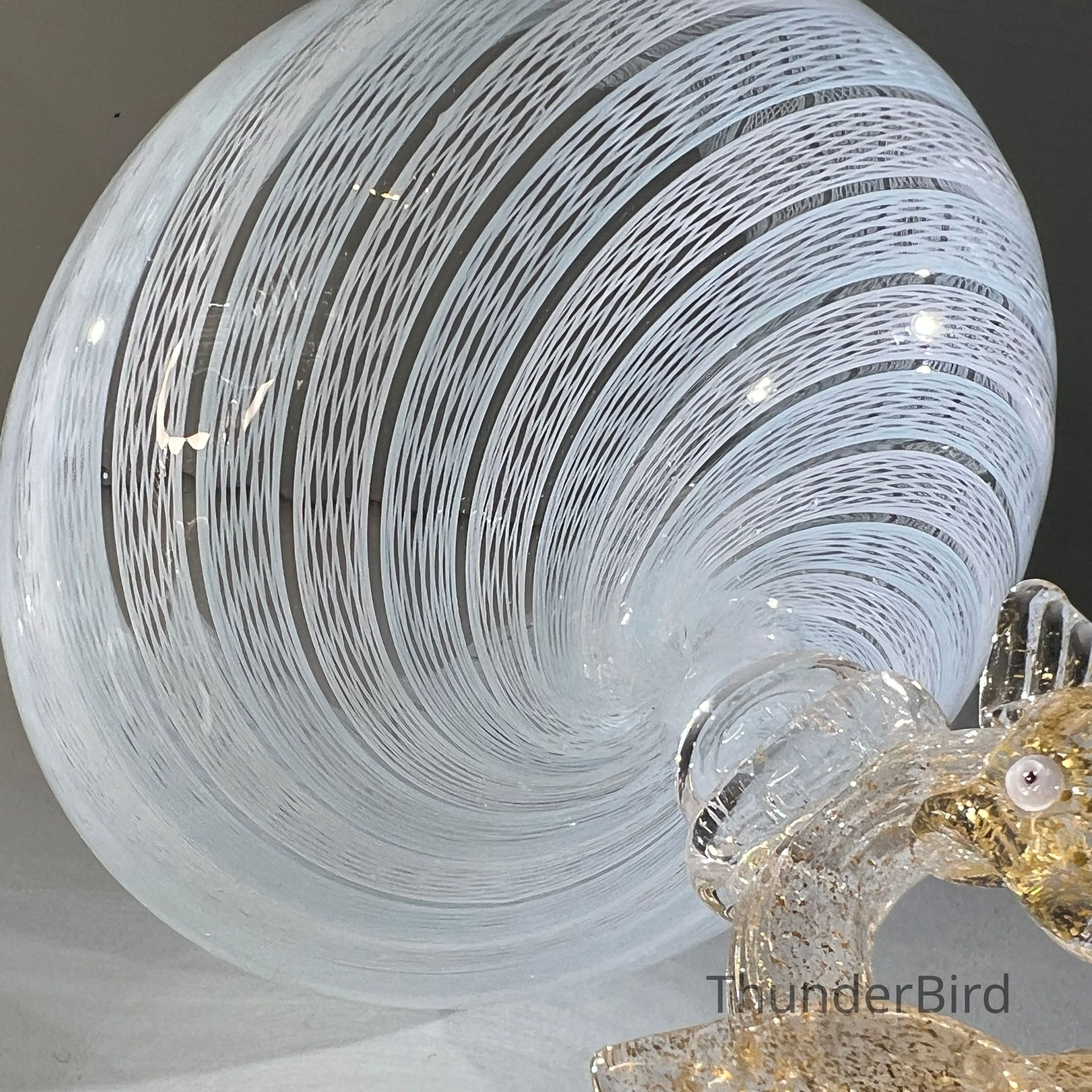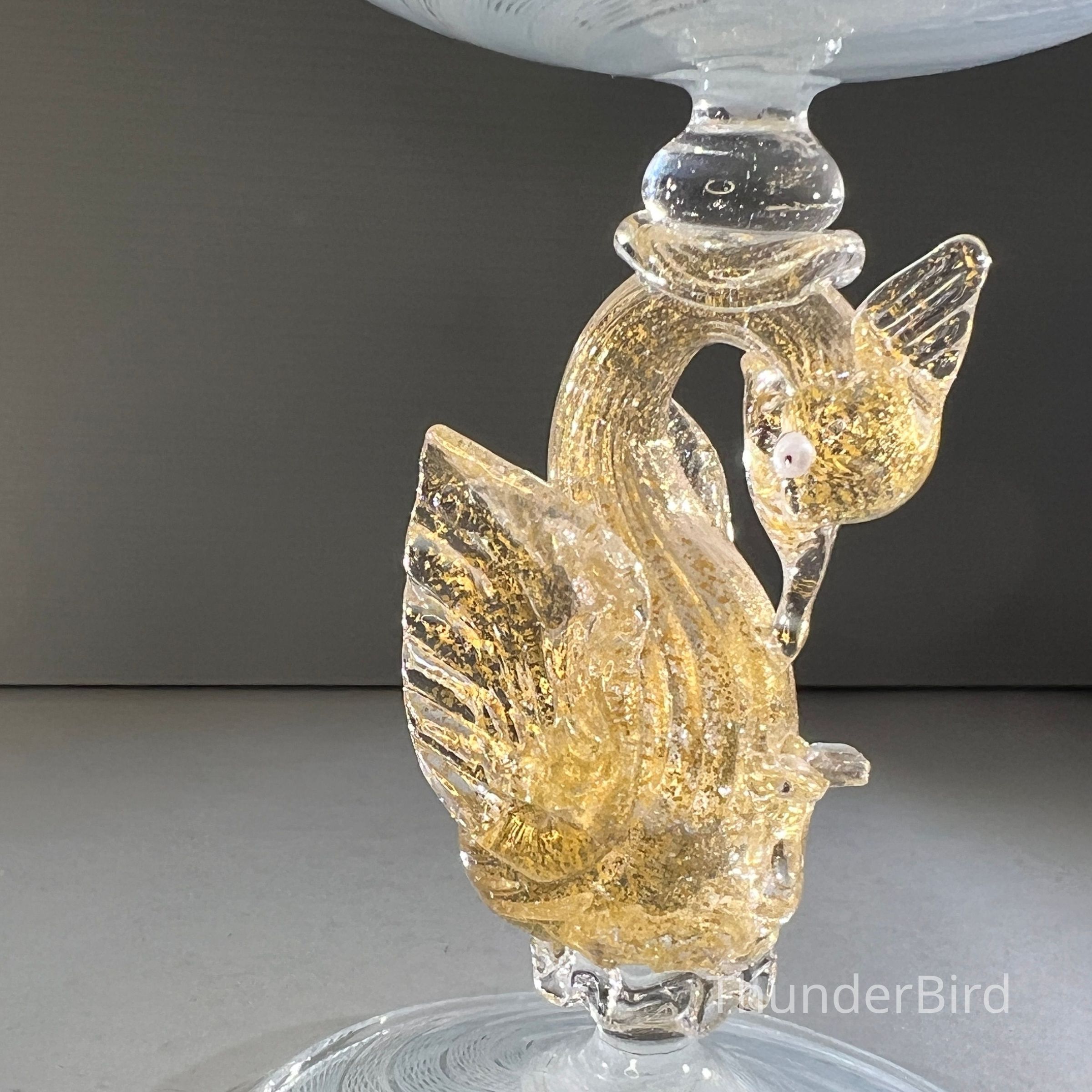 A very special vintage pair of Italian Murano art glass wine goblets featuring sculptural swan form stems enriched with gold. The generously proportioned bowls are crafted using Garza filigrana cane work, a fine gauze like lattice technique, in white with pale blue tones arranged in an elegant spiral. Each stem is individually hand formed with applied wings, curved neck and detailed eyes, demonstrating the skilled hot worked glass techniques of mid century Murano. With their rounded bowl shape and open rim by period standards, these were intended as true wine goblets, suitable for white wines, rosé and lighter reds, as well as traditional European table wines. Dating to circa 1950s to 1960s, they would originally have formed part of a larger matched set and remain both functional and highly decorative. [I am listing 2 pairs of these goblets].