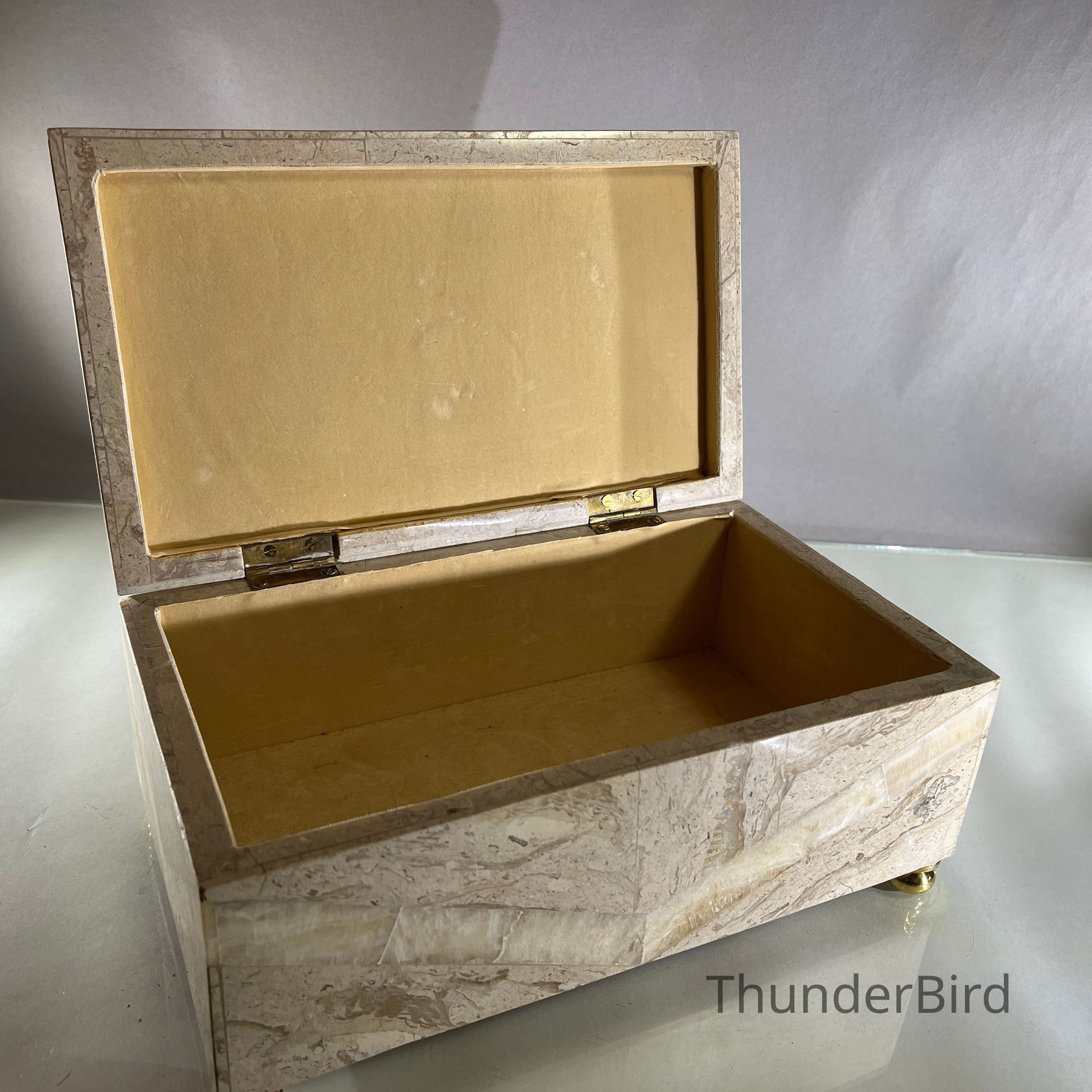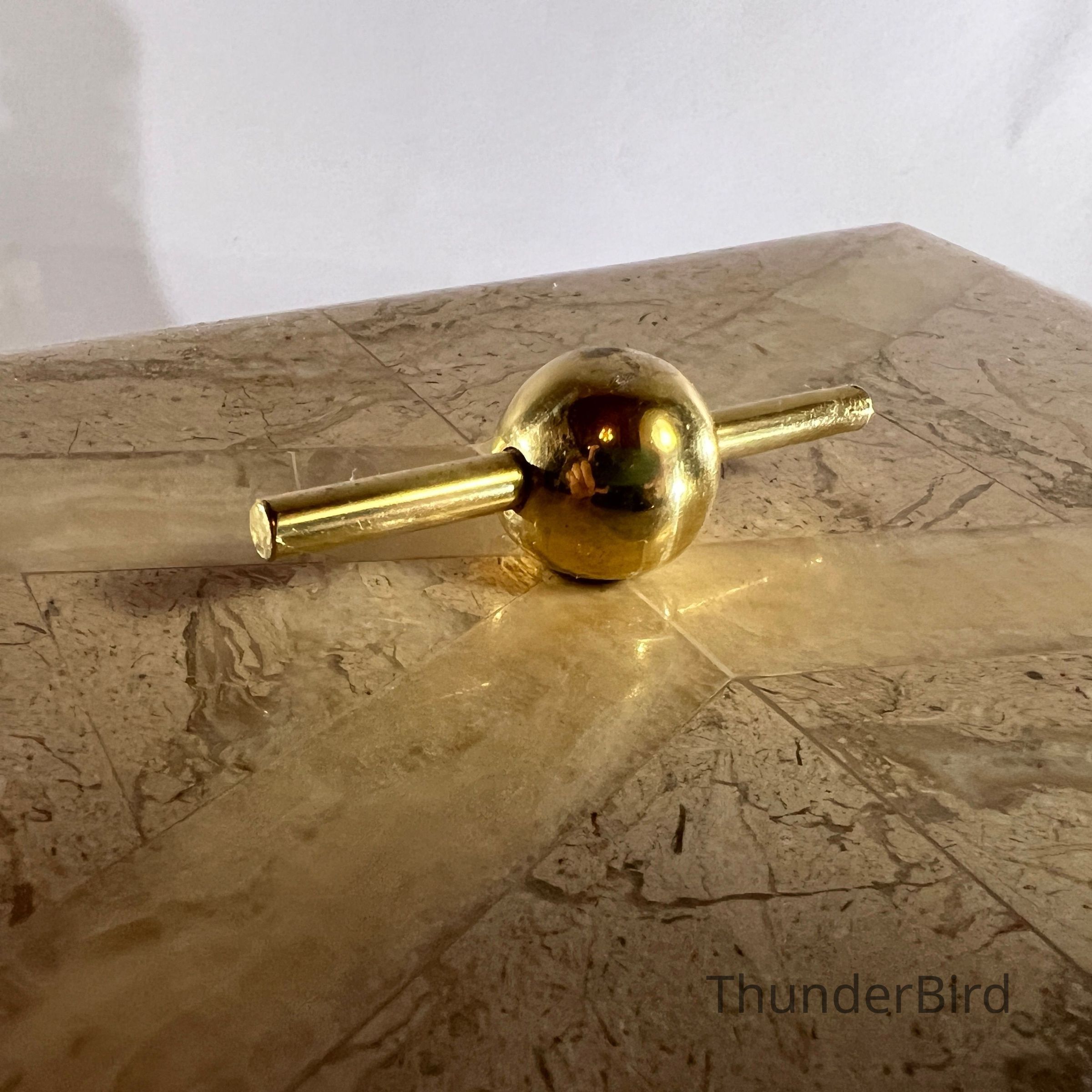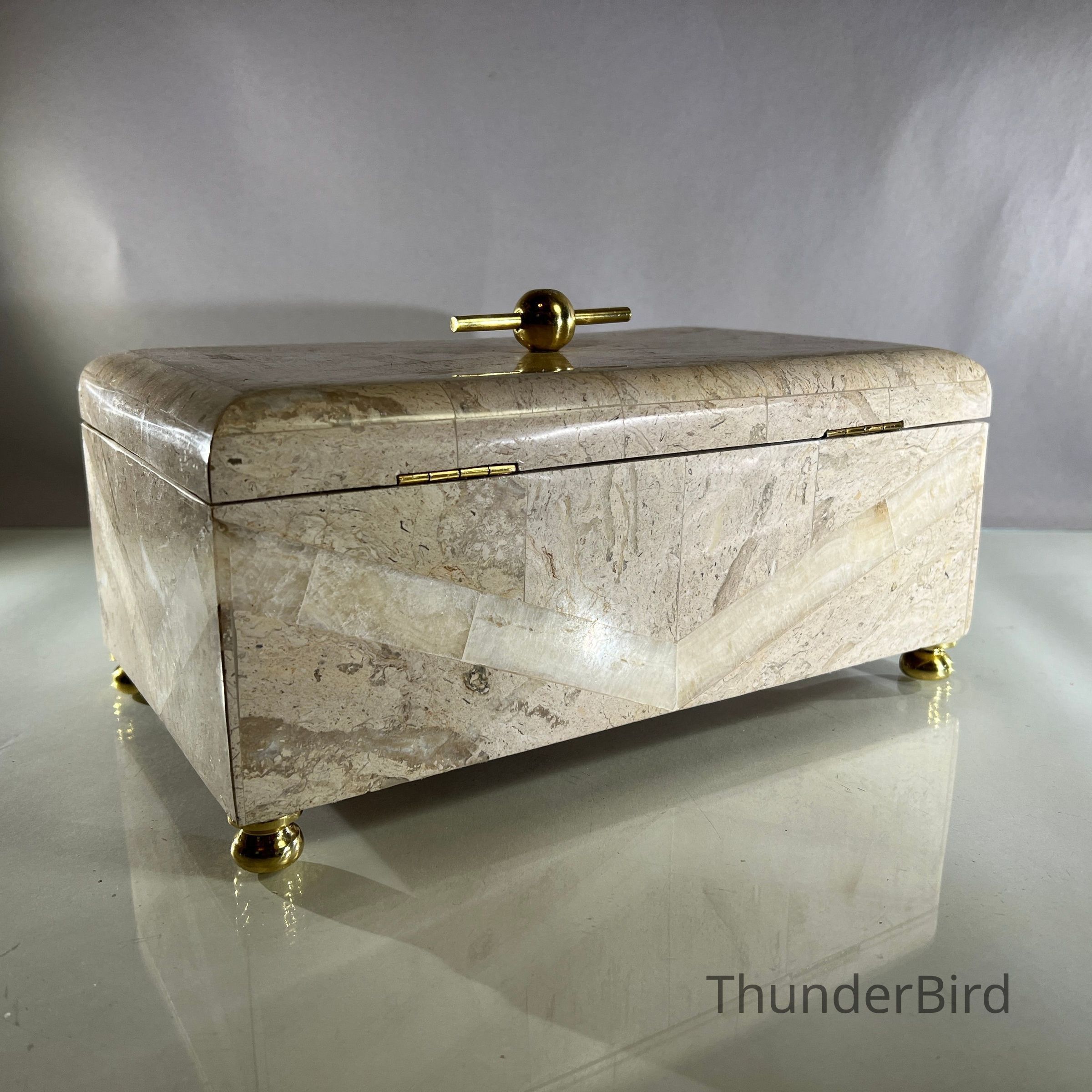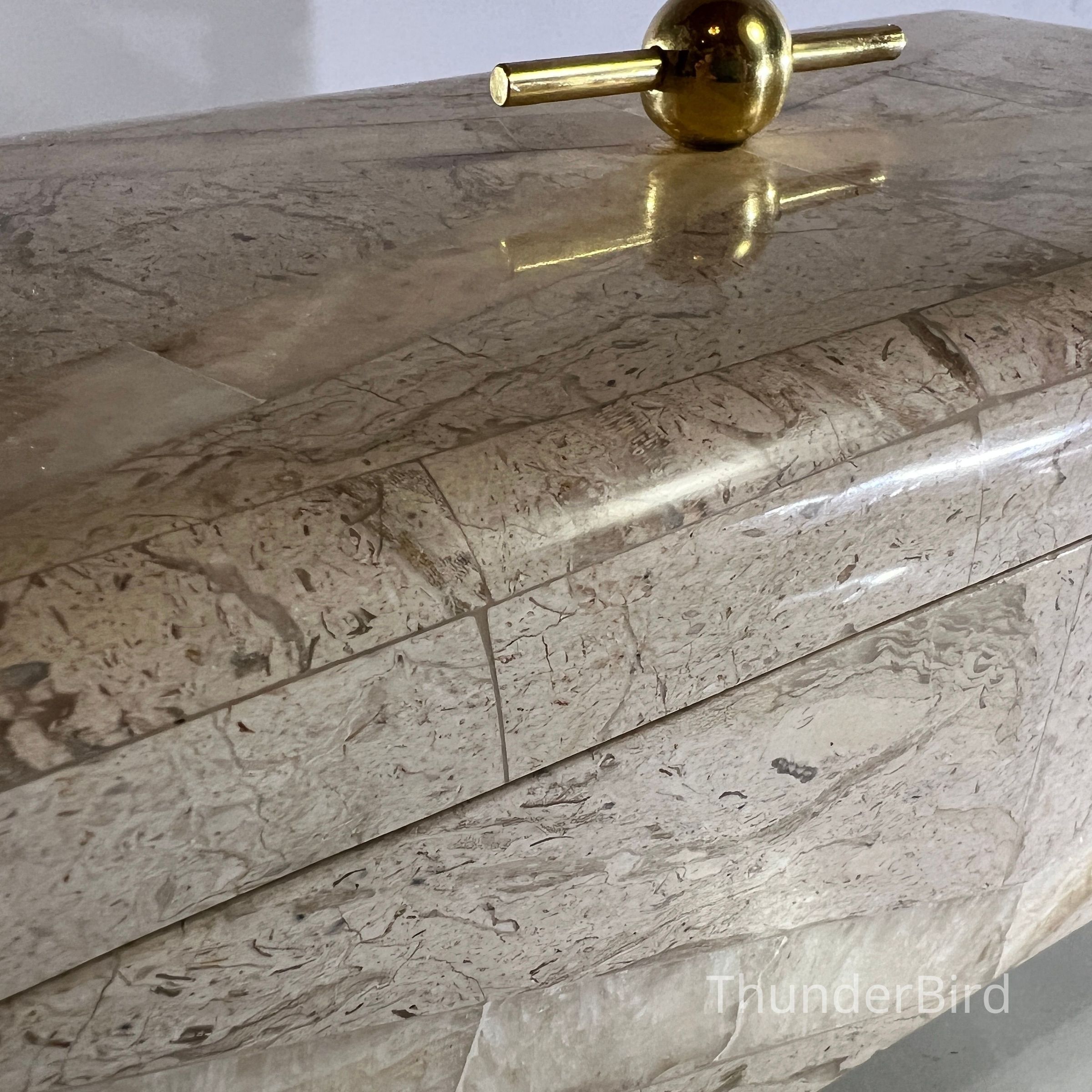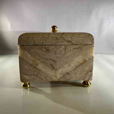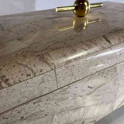 This substantial vintage casket dates to the 1970s and is attributed to Maitland Smith, a maker renowned for high quality decorative objects using luxurious materials. The box is clad in tessellated stone panels with natural variegation, arranged to create a subtle geometric chevron effect across the exterior. It is raised on brass bun feet and finished with a solid brass spherical handle mounted on a horizontal bar, reflecting strong Hollywood Regency influence. The interior is fully lined, making it suitable for jewellery, keepsakes or desk storage. Maitland Smith pieces are highly sought after, and while this example is unlabeled, documented, and labeled examples of identical construction and design support its authenticity.