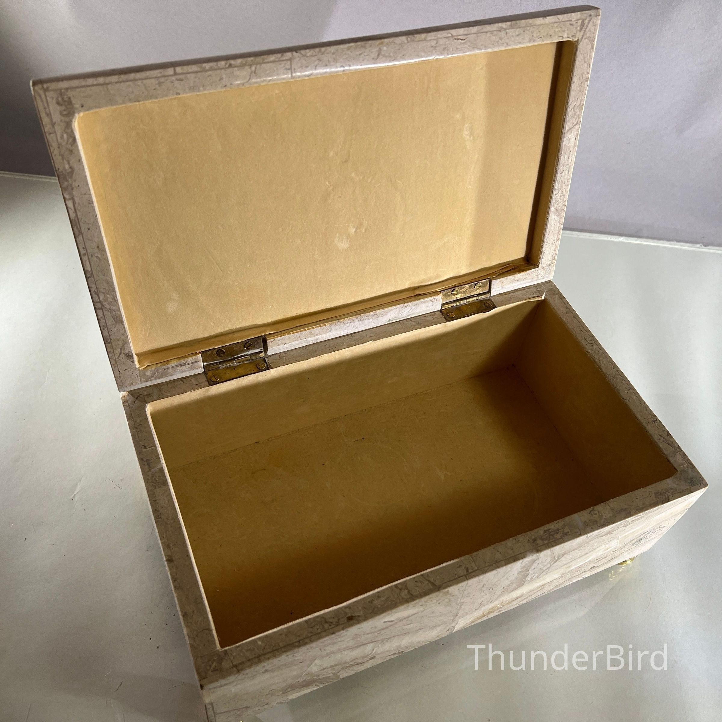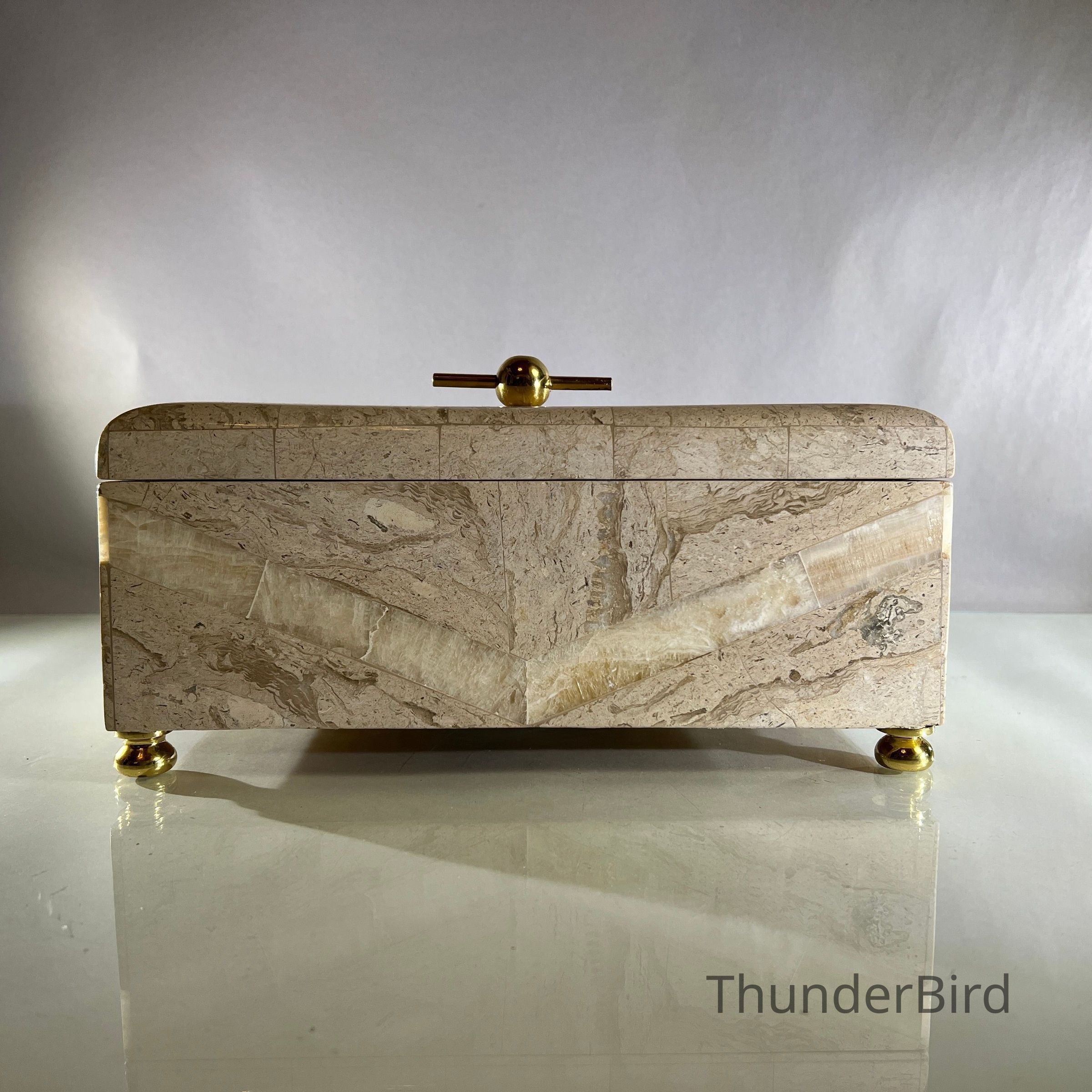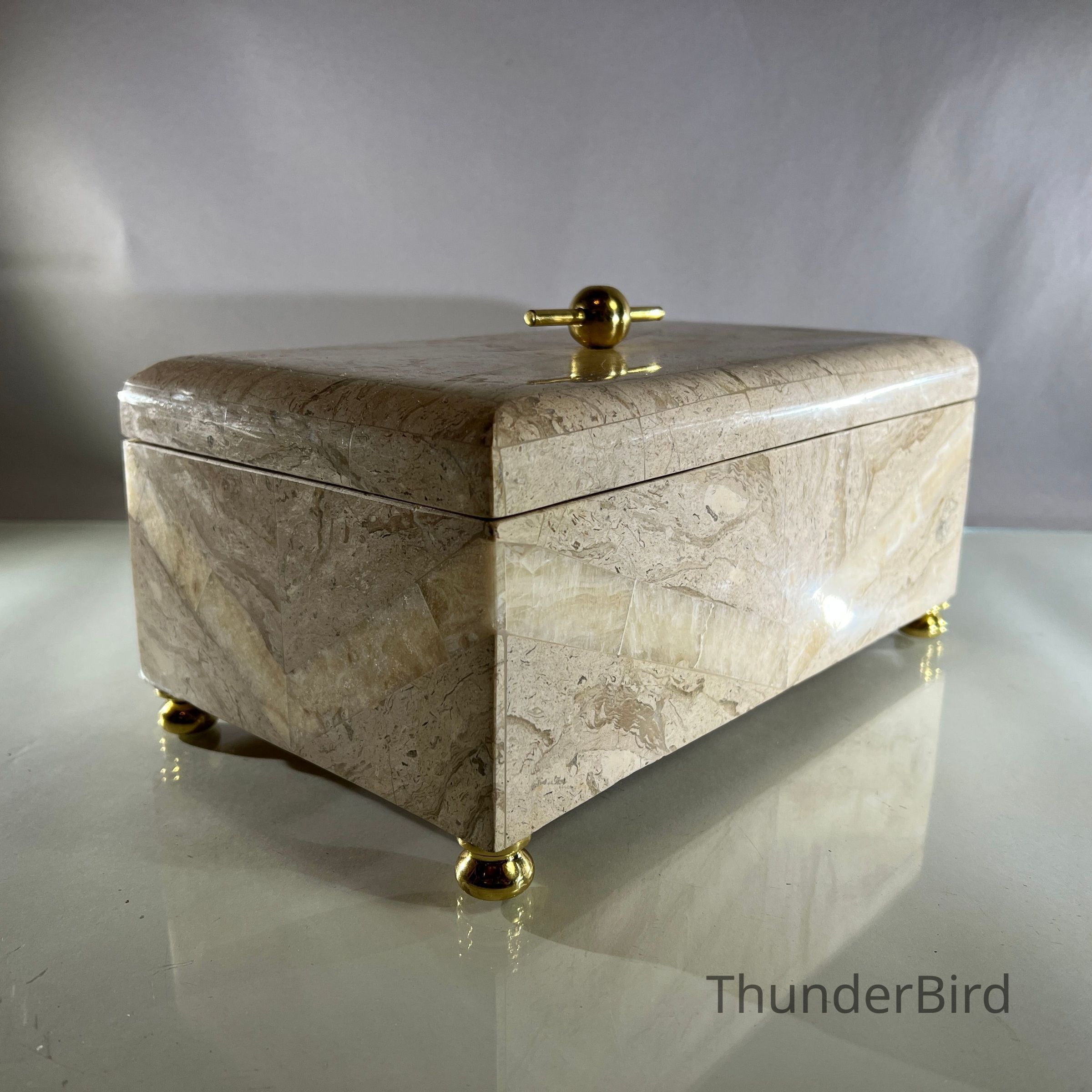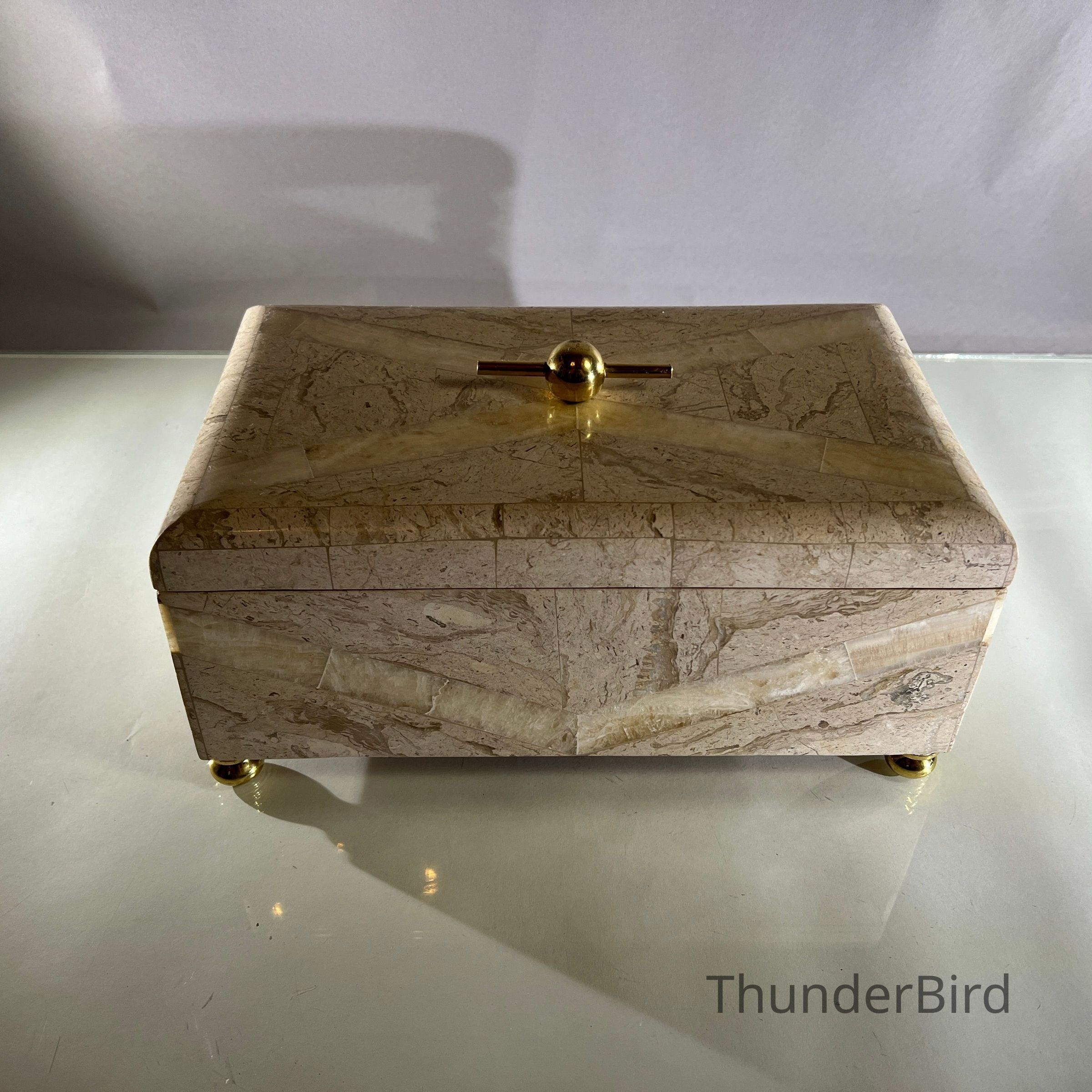 This substantial vintage casket dates to the 1970s and is attributed to Maitland Smith, a maker renowned for high quality decorative objects using luxurious materials. The box is clad in tessellated stone panels with natural variegation, arranged to create a subtle geometric chevron effect across the exterior. It is raised on brass bun feet and finished with a solid brass spherical handle mounted on a horizontal bar, reflecting strong Hollywood Regency influence. The interior is fully lined, making it suitable for jewellery, keepsakes or desk storage. Maitland Smith pieces are highly sought after, and while this example is unlabeled, documented, and labeled examples of identical construction and design support its authenticity.