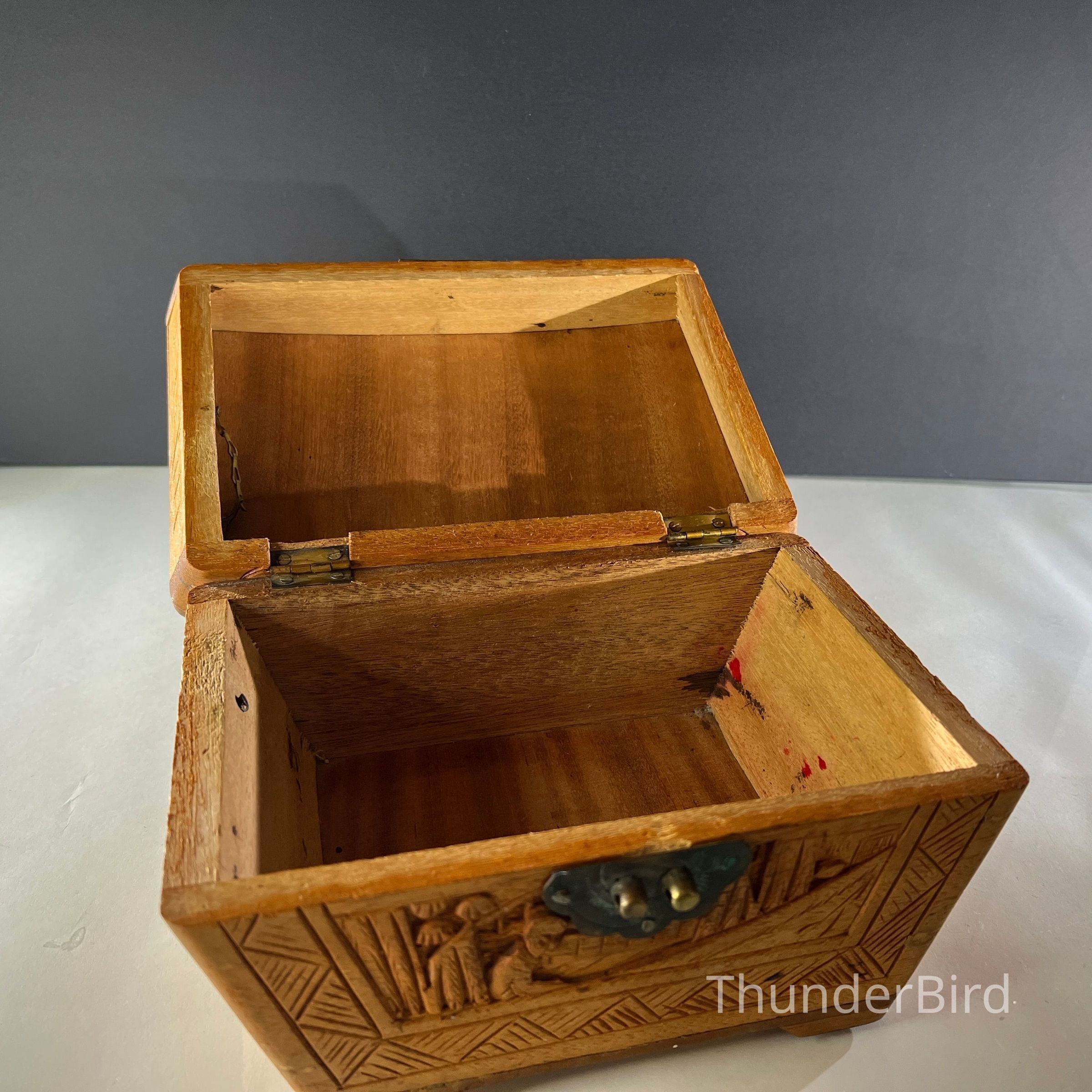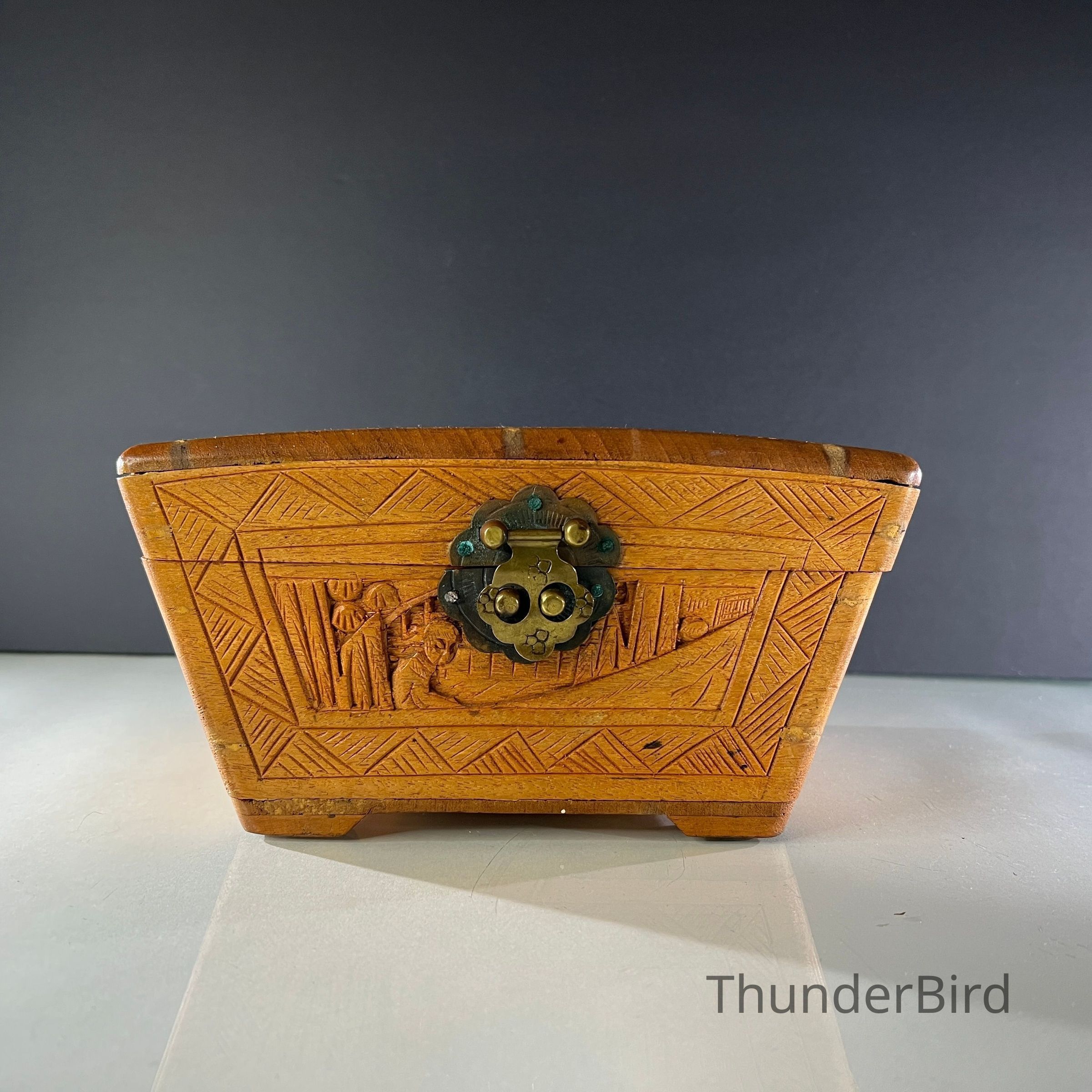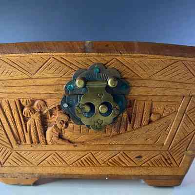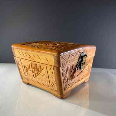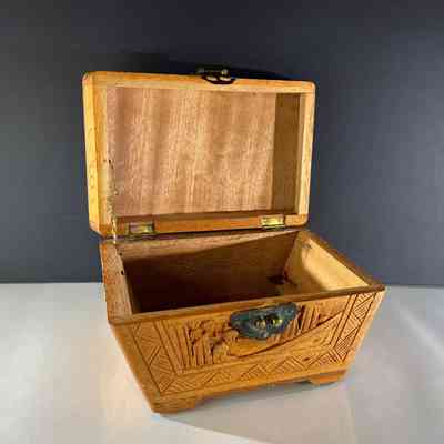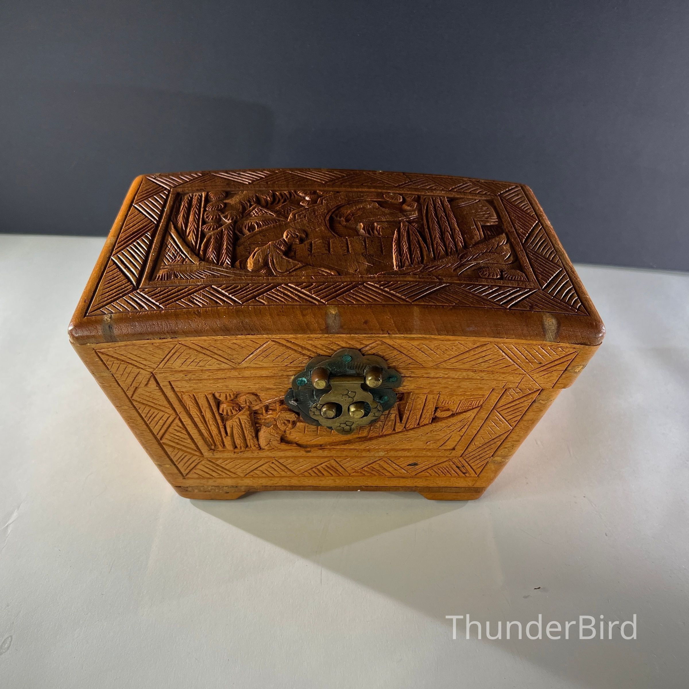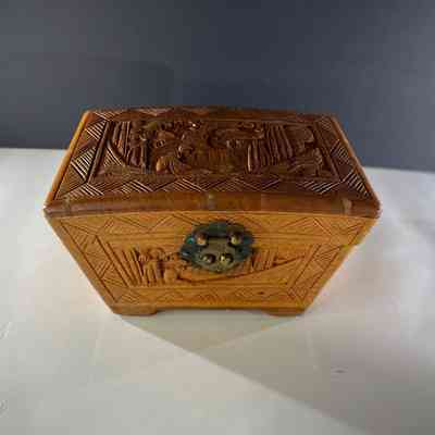 9.2.26a Vintage Hand Carved Chinese Camphor Wood Jewellery Box With Brass LockEntry/Object ID