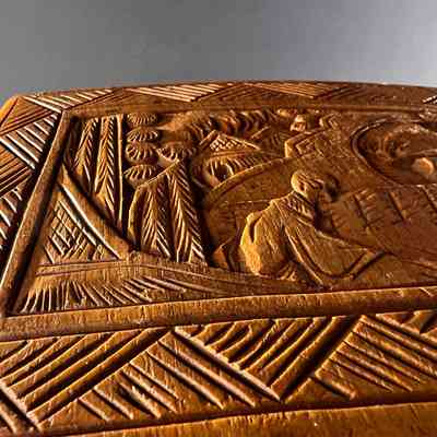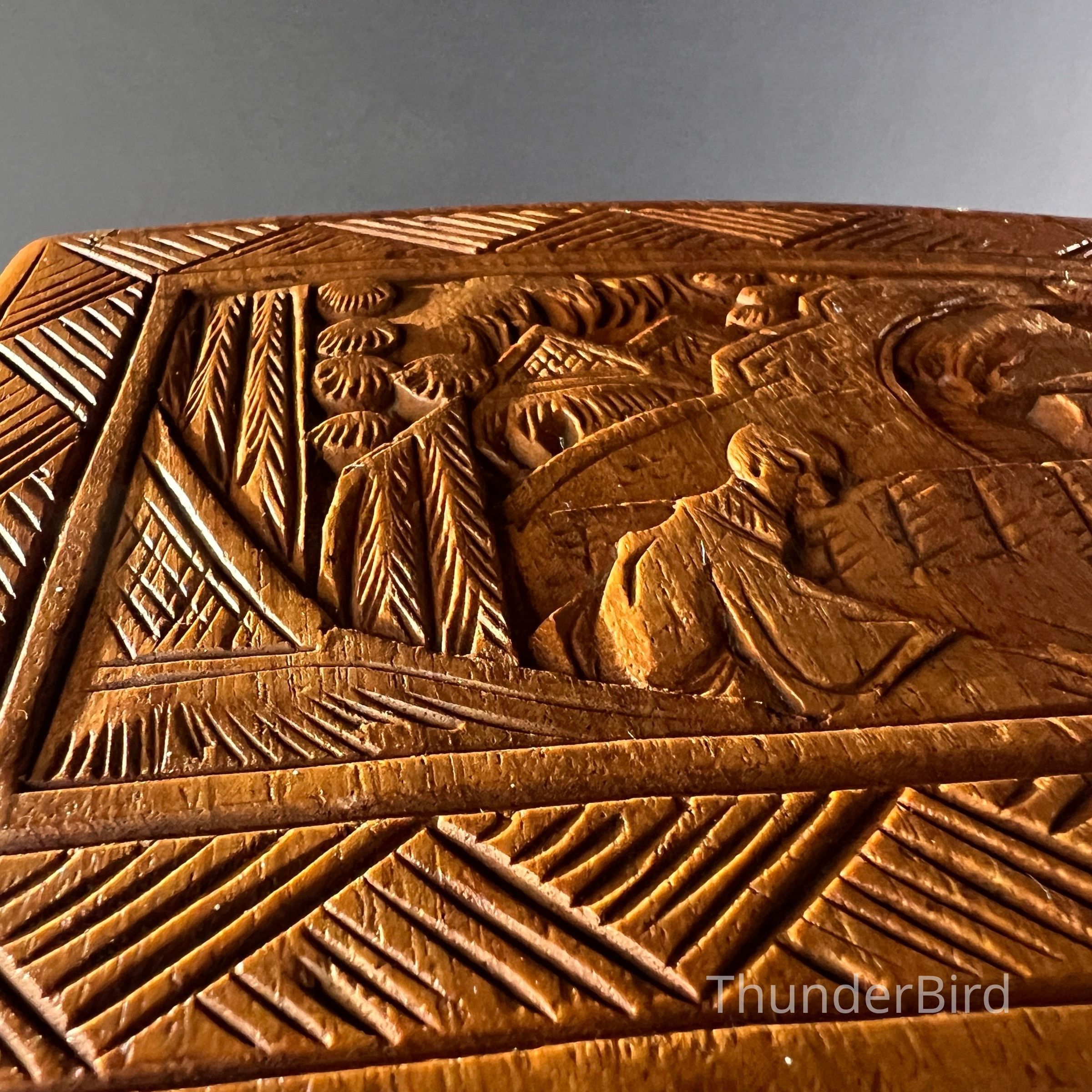 A beautifully hand carved Chinese camphor wood box featuring detailed relief carving to the lid and front panel. The central scene depicts a traditional landscape with figures, trees, mountains and architectural elements, framed by geometric carved borders. Camphor wood boxes such as this were produced throughout the mid 20th century, particularly from the 1940s to 1970s, for both domestic use and export. Camphor wood is prized for its aromatic qualities and natural insect repellent properties, making it ideal for storing jewellery, keepsakes and textiles.