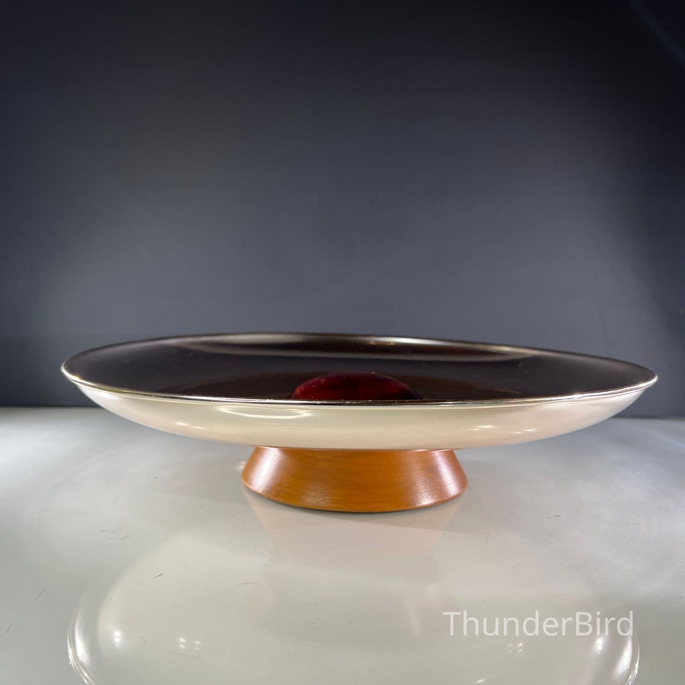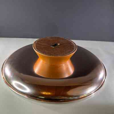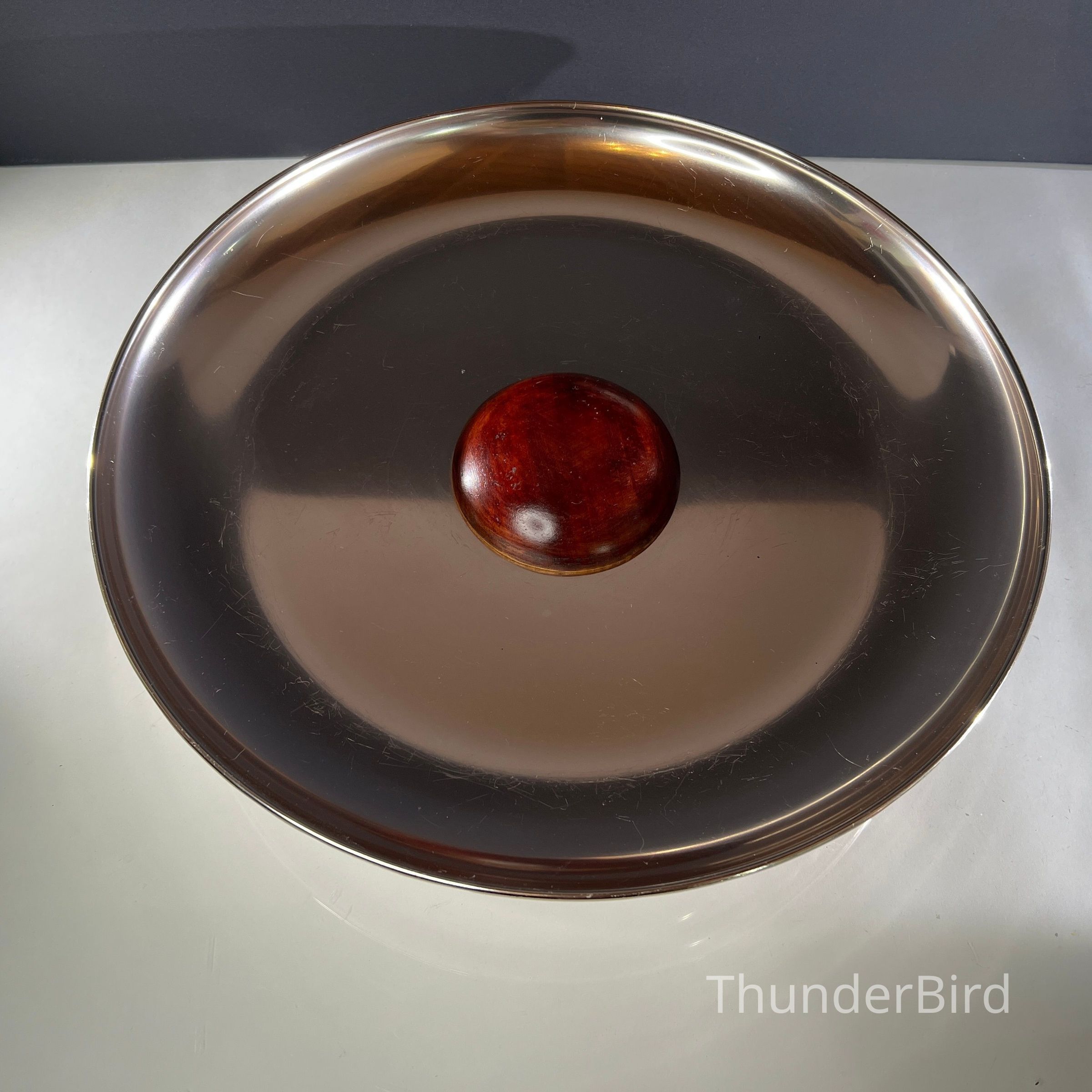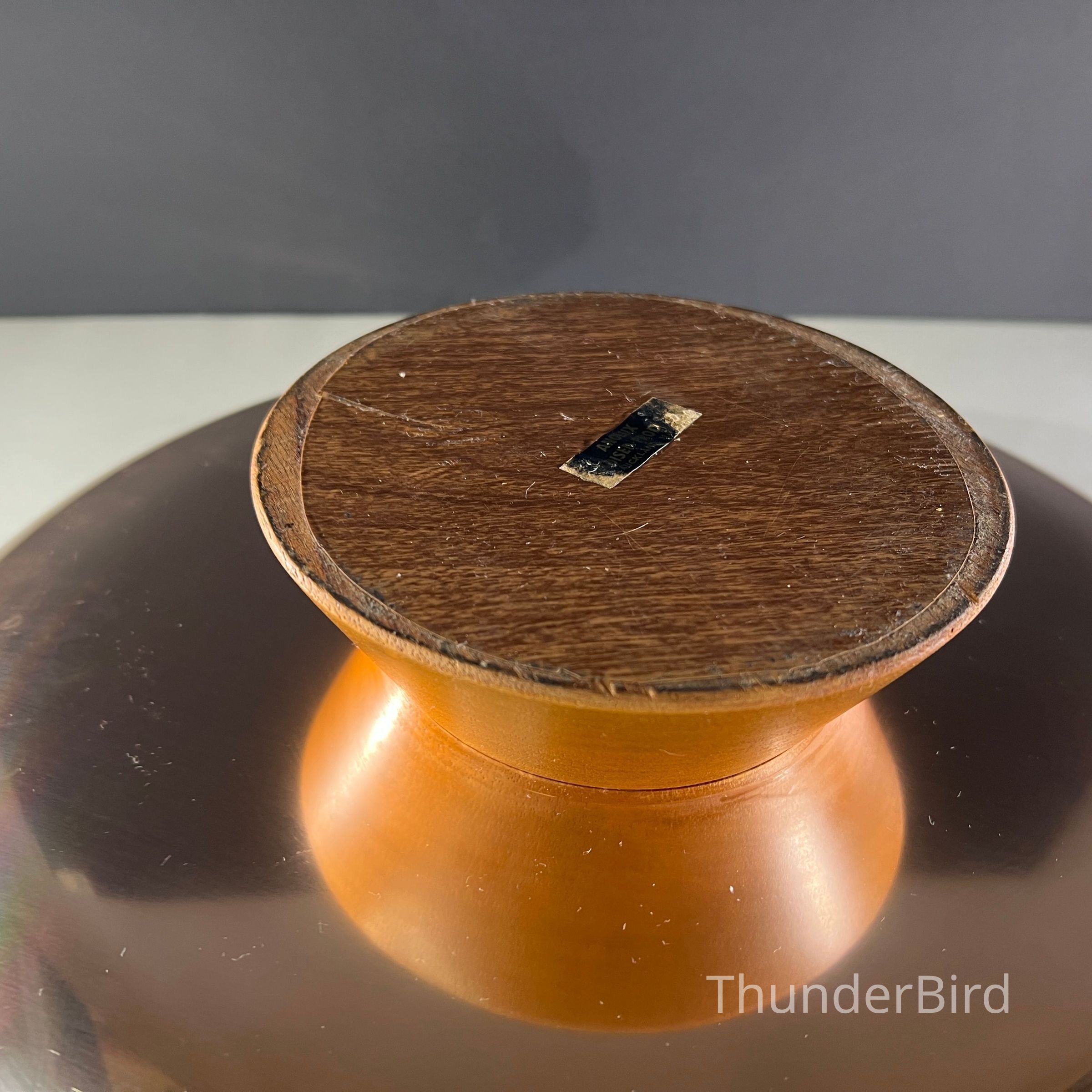 A large mid century Anolux pedestal serving dish, made in Auckland, New Zealand, as indicated on the original underside label. The dish features a beautifully spun anodised aluminium bowl in a rich smoky bronze tone, elevated on a sculptural wooden pedestal base with a central turned timber detail. Anolux produced high quality anodised aluminium kitchenware and serving pieces, valued for their durability, lightweight construction, and distinctive metallic finishes.
