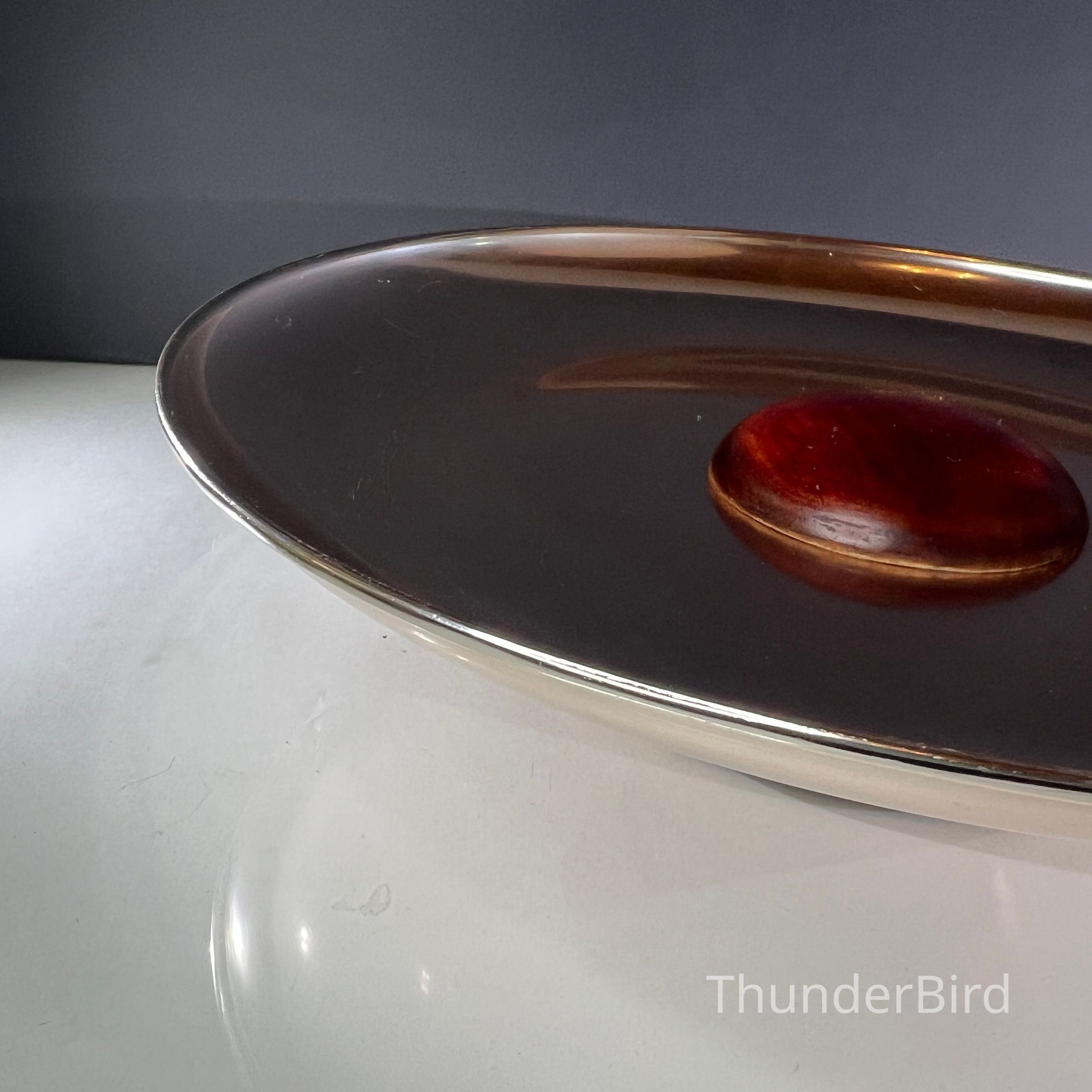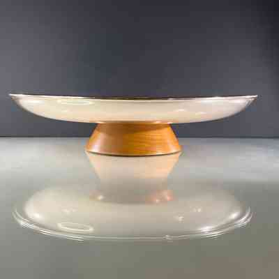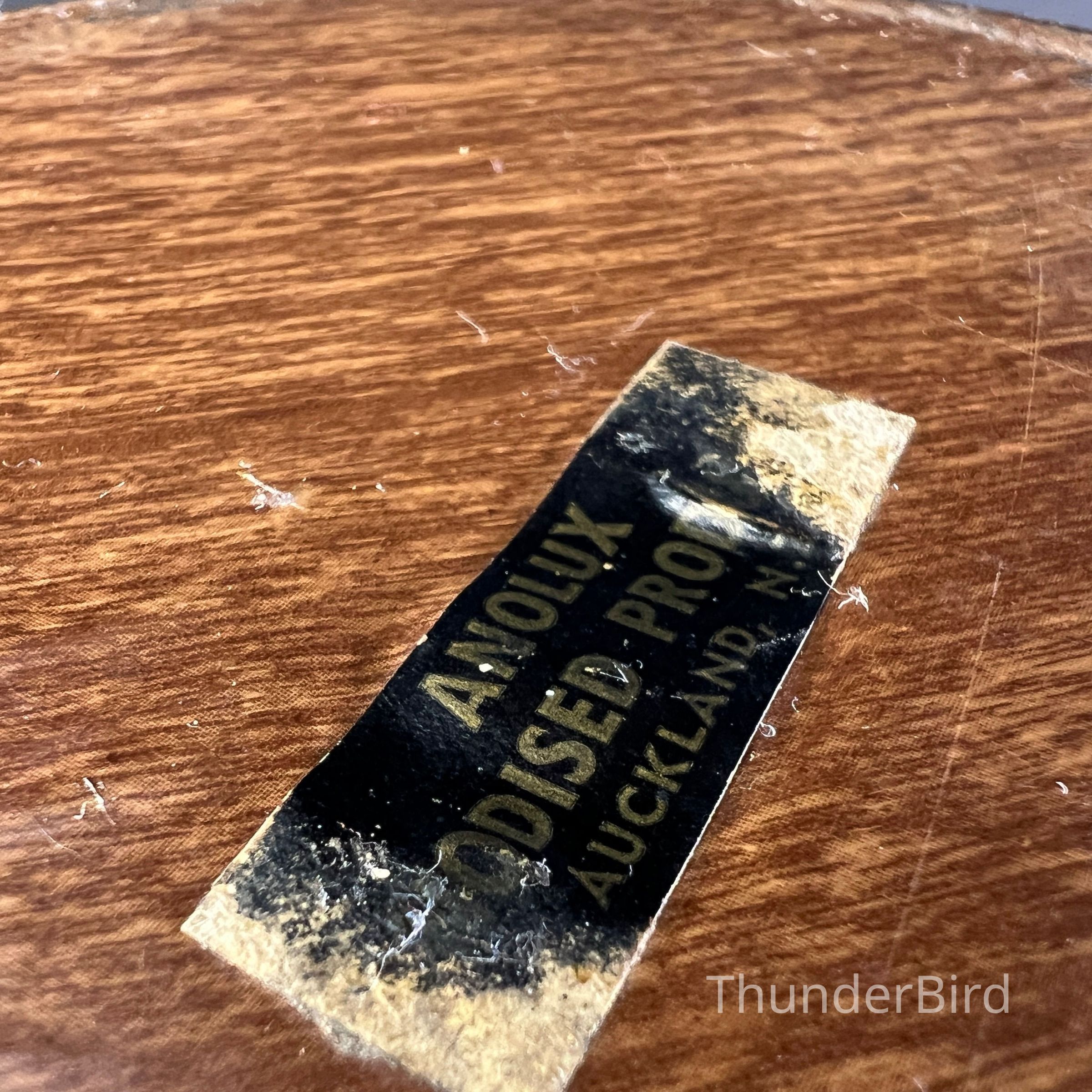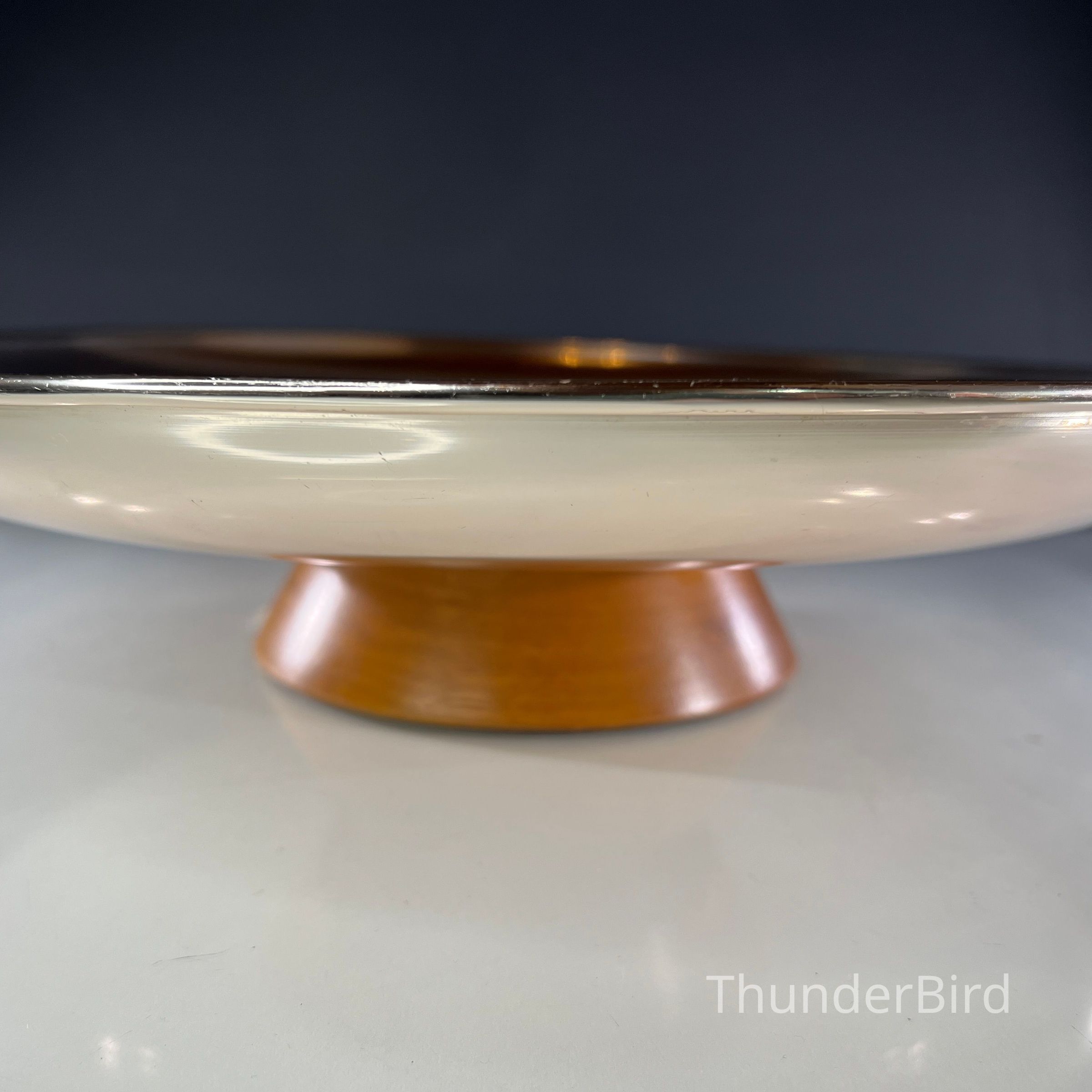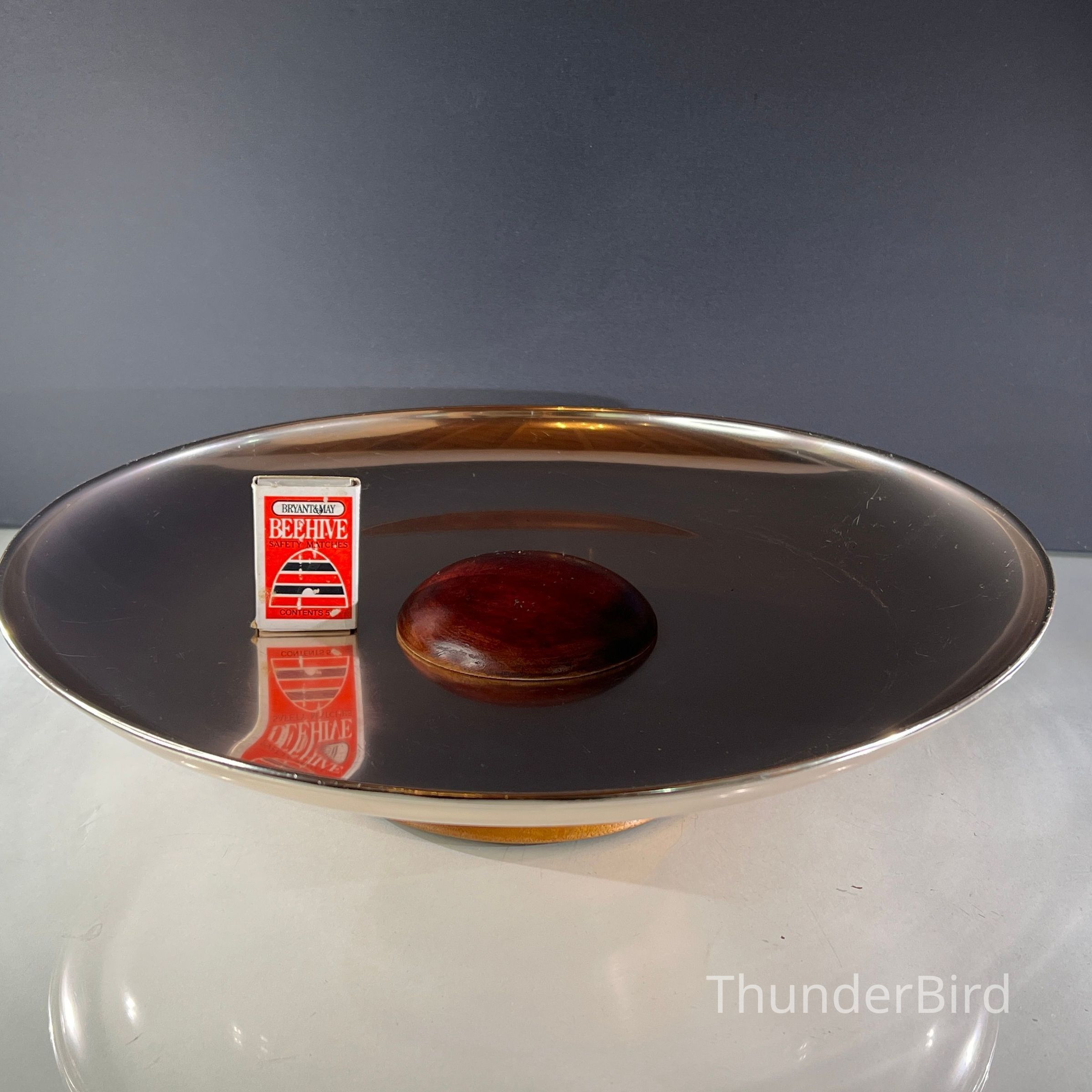 A large mid century Anolux pedestal serving dish, made in Auckland, New Zealand, as indicated on the original underside label. The dish features a beautifully spun anodised aluminium bowl in a rich smoky bronze tone, elevated on a sculptural wooden pedestal base with a central turned timber detail. Anolux produced high quality anodised aluminium kitchenware and serving pieces, valued for their durability, lightweight construction, and distinctive metallic finishes.