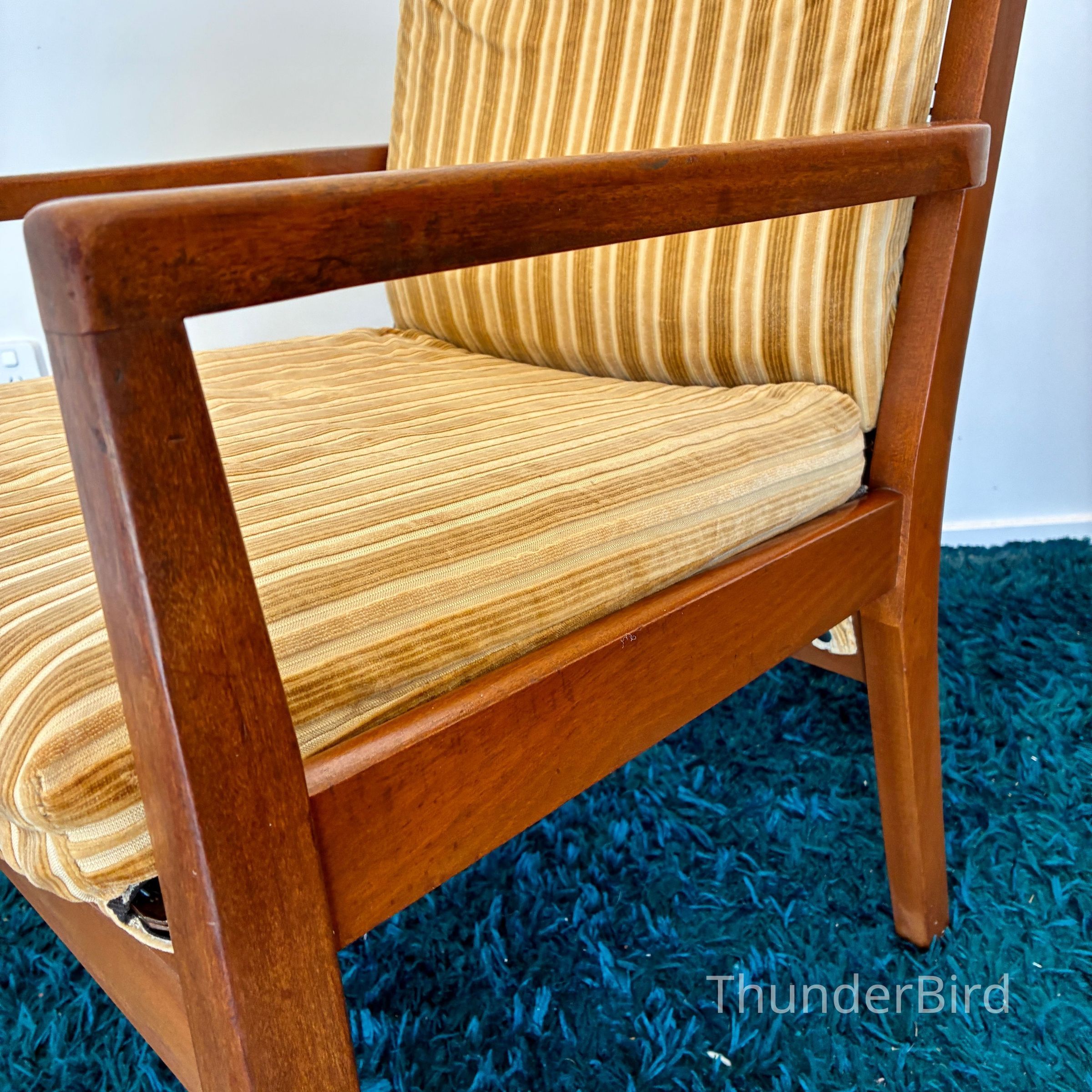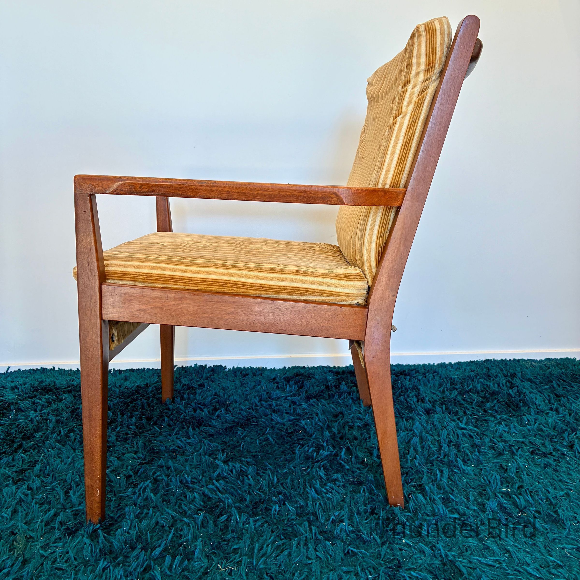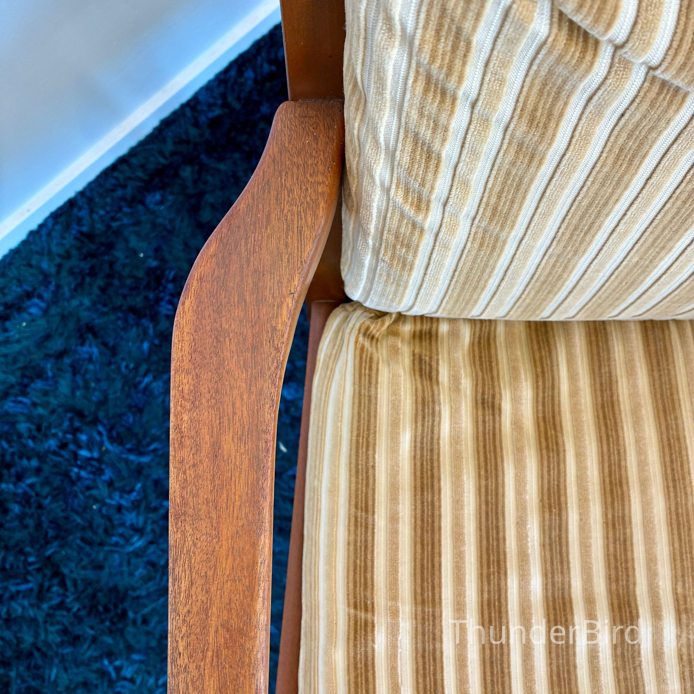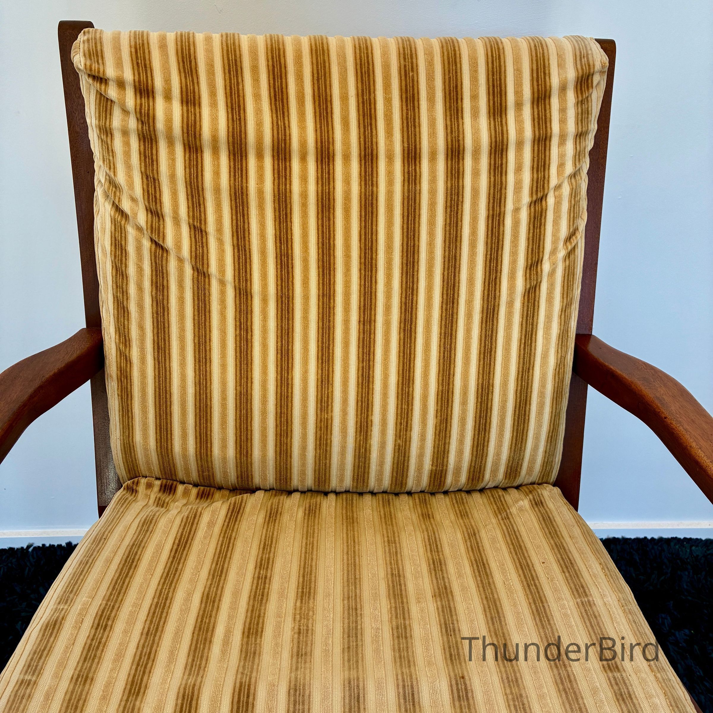 This mid-century design features a beautifully shaped solid teak frame with original striped upholstered cushions and a sprung canvas back. The distinctive curved arms and angled legs speak to its refined craftsmanship and ergonomic comfort.