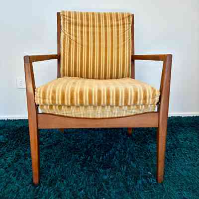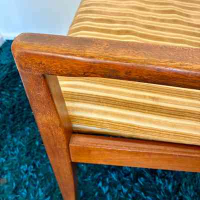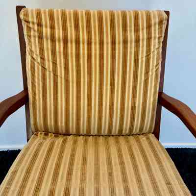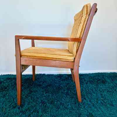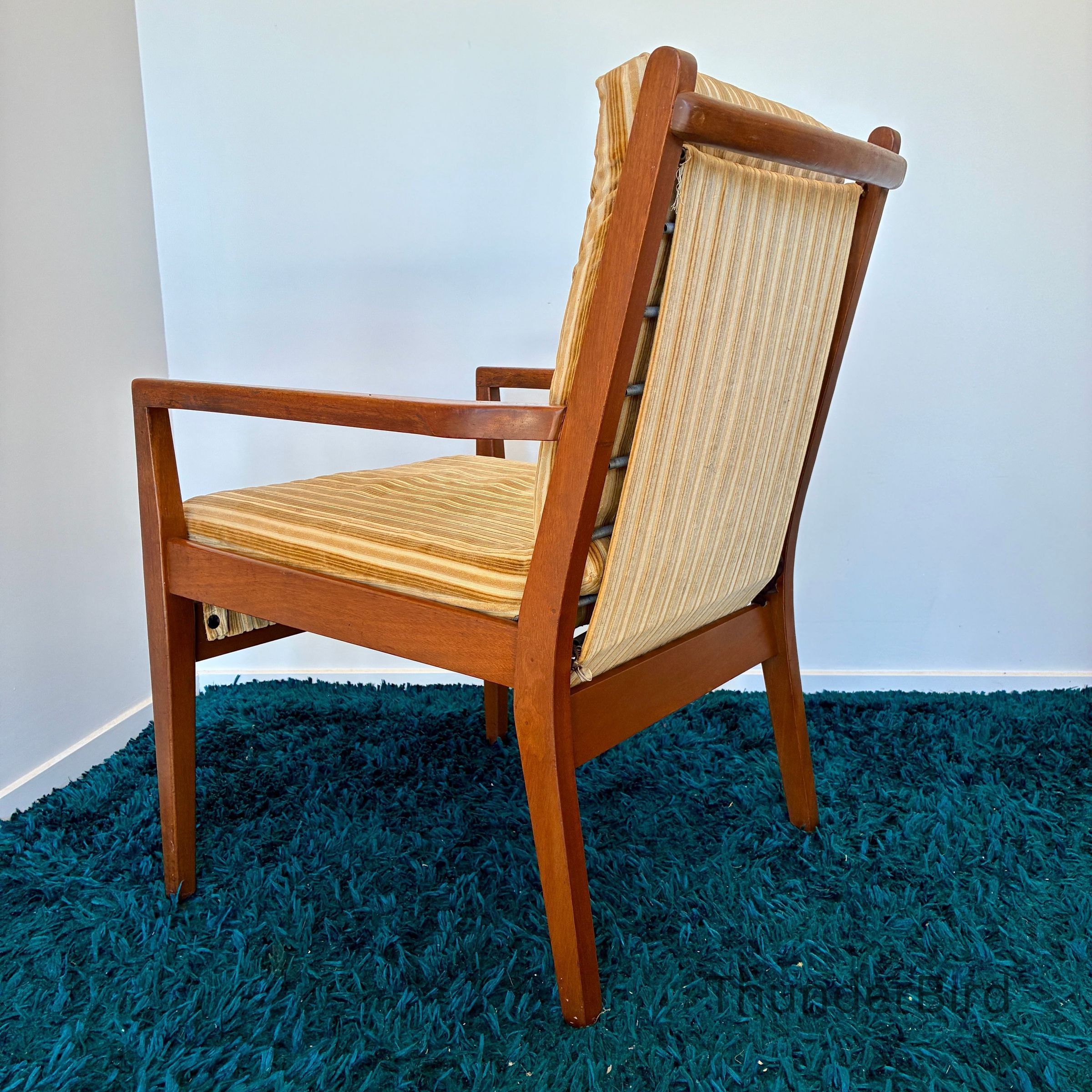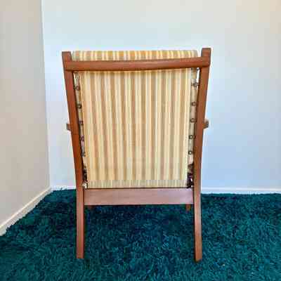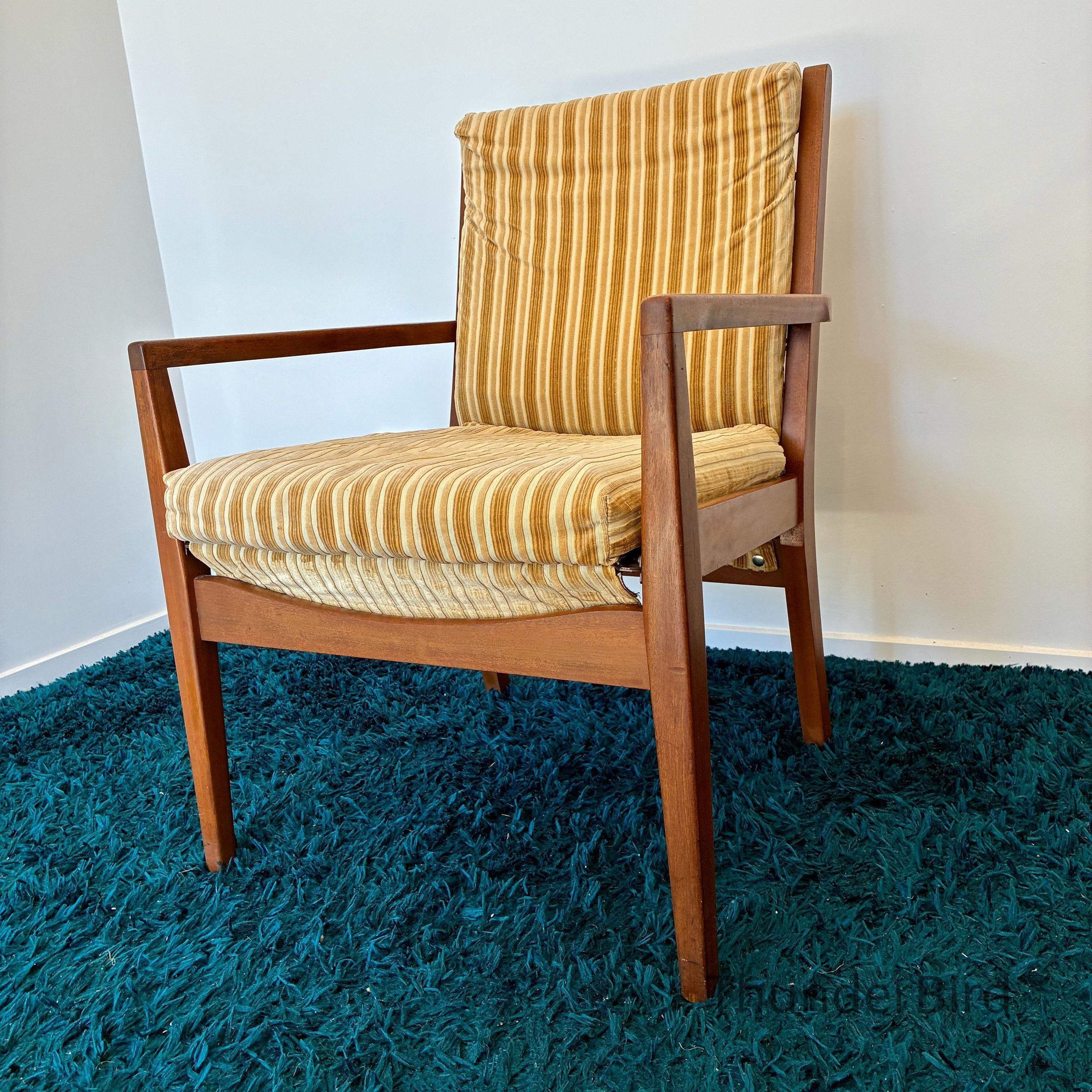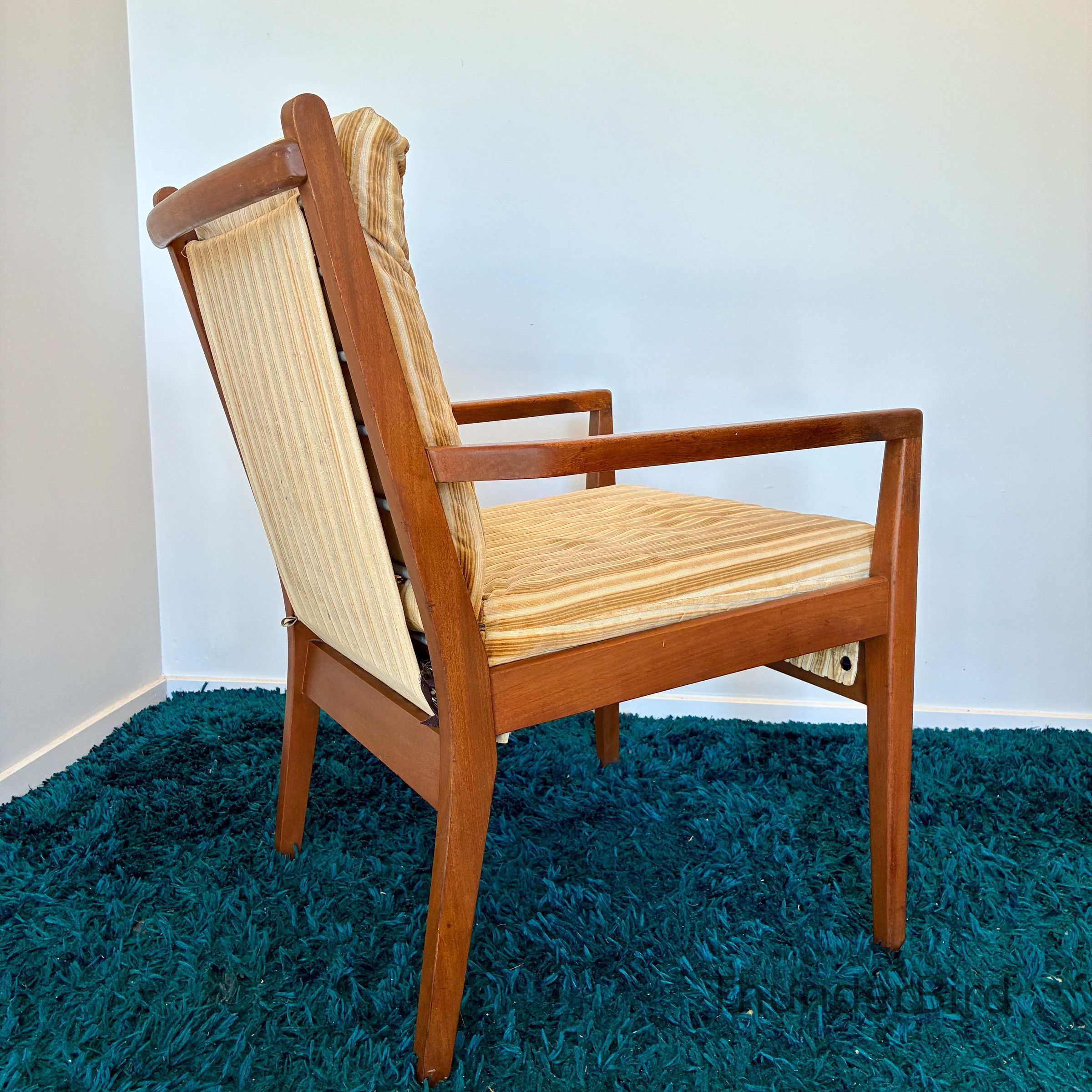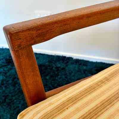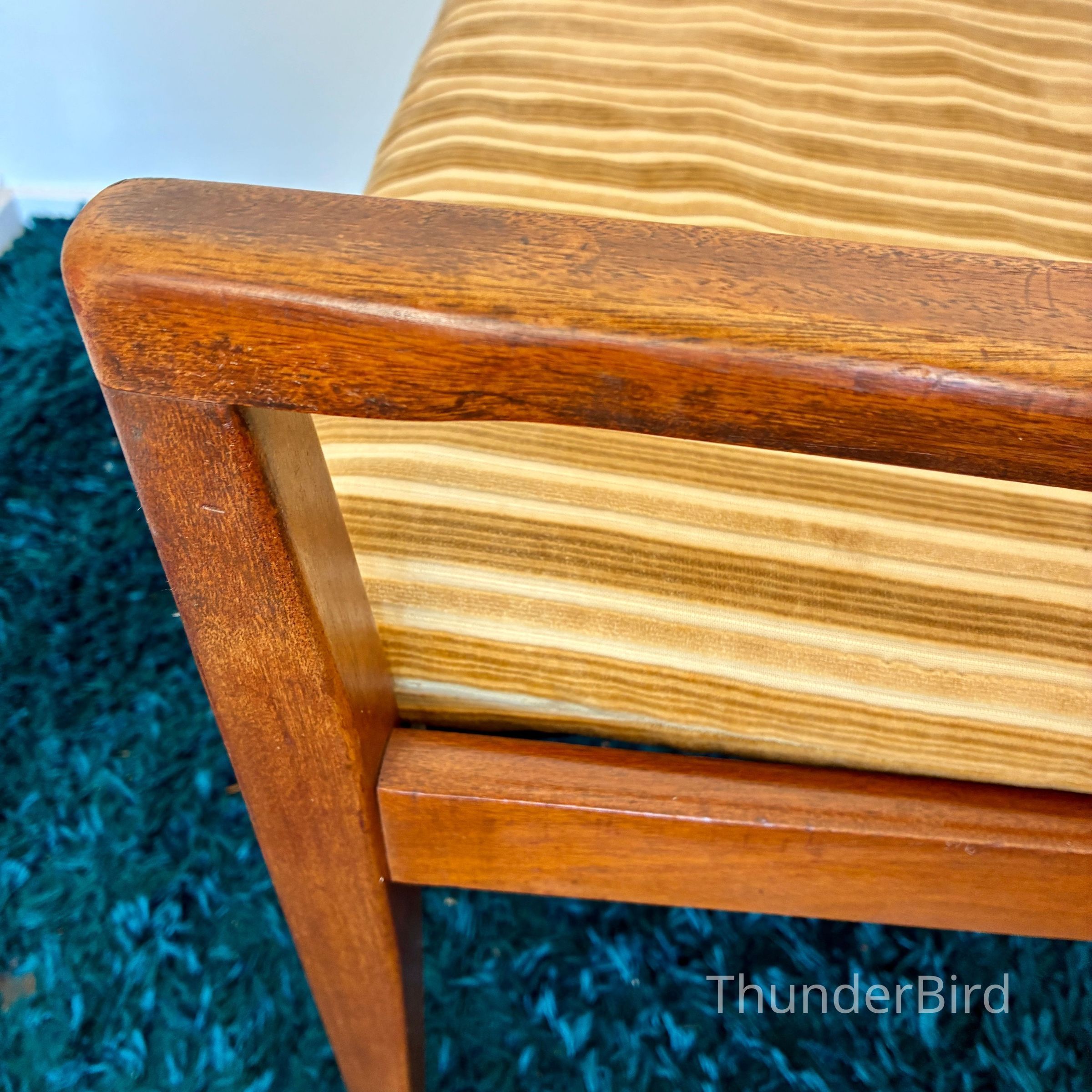 This mid-century design features a beautifully shaped solid teak frame with original striped upholstered cushions and a sprung canvas back. The distinctive curved arms and angled legs speak to its refined craftsmanship and ergonomic comfort.