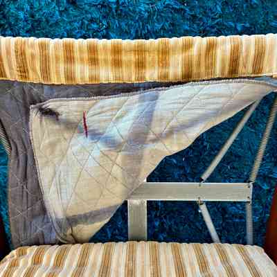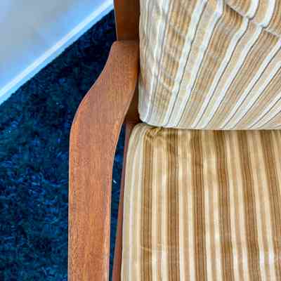 Good original condition. Frame is solid and stable. Upholstery exhibits expected wear for its age, including light fading, and some fabric aging. [Could benefit from a refresh & new squabs as it is soft?] Please inspect all photos as they form part of the item’s description.