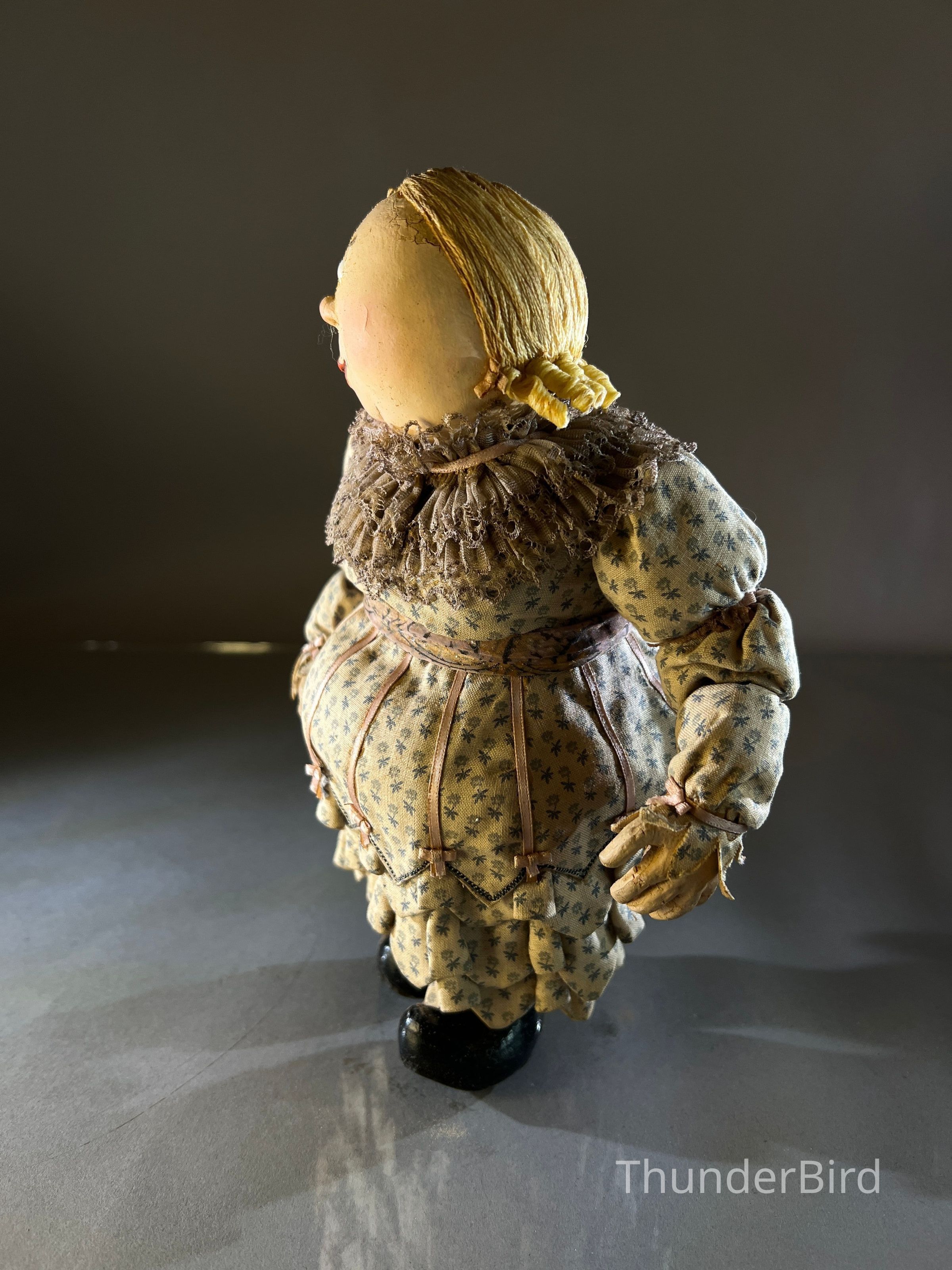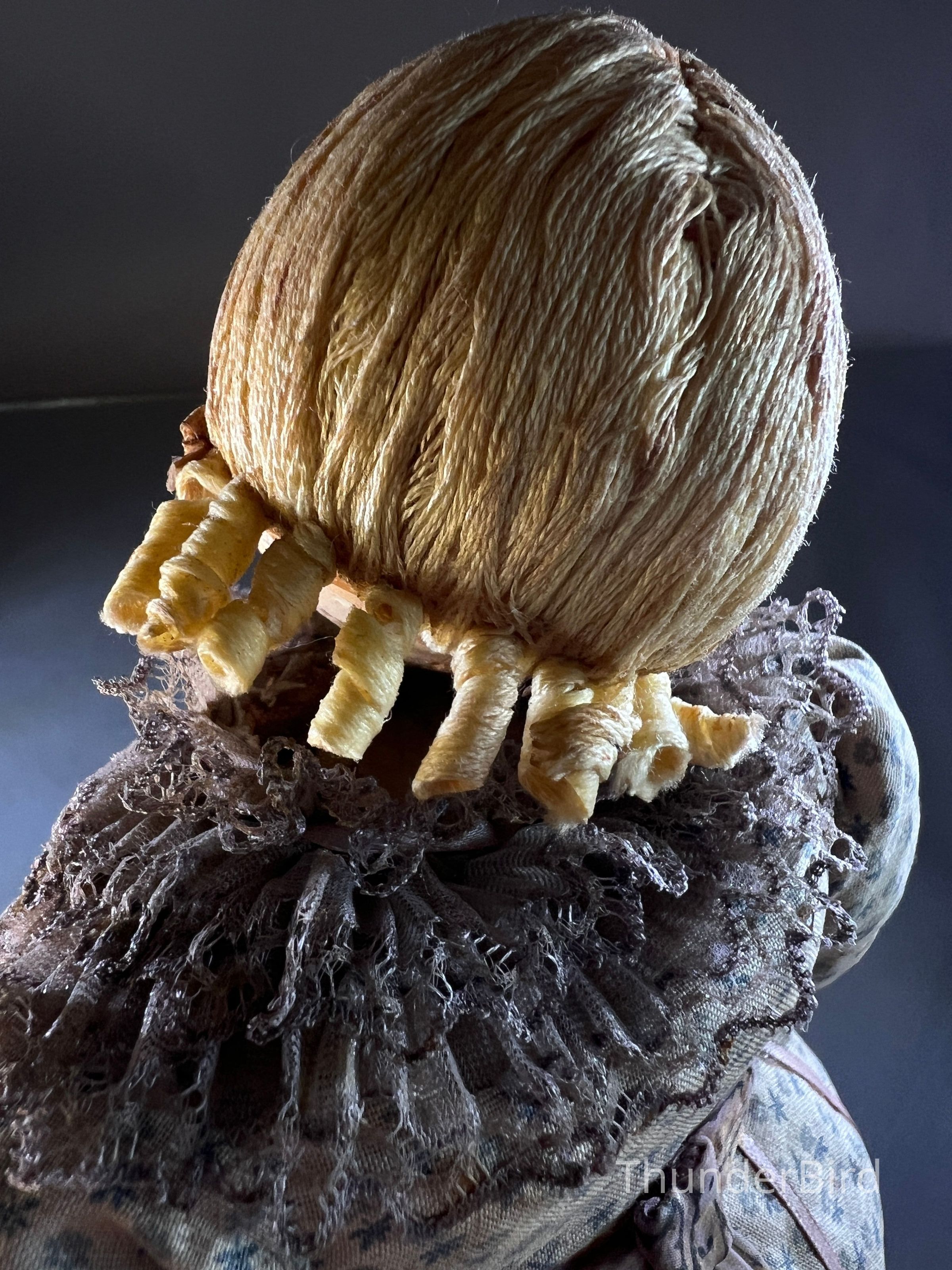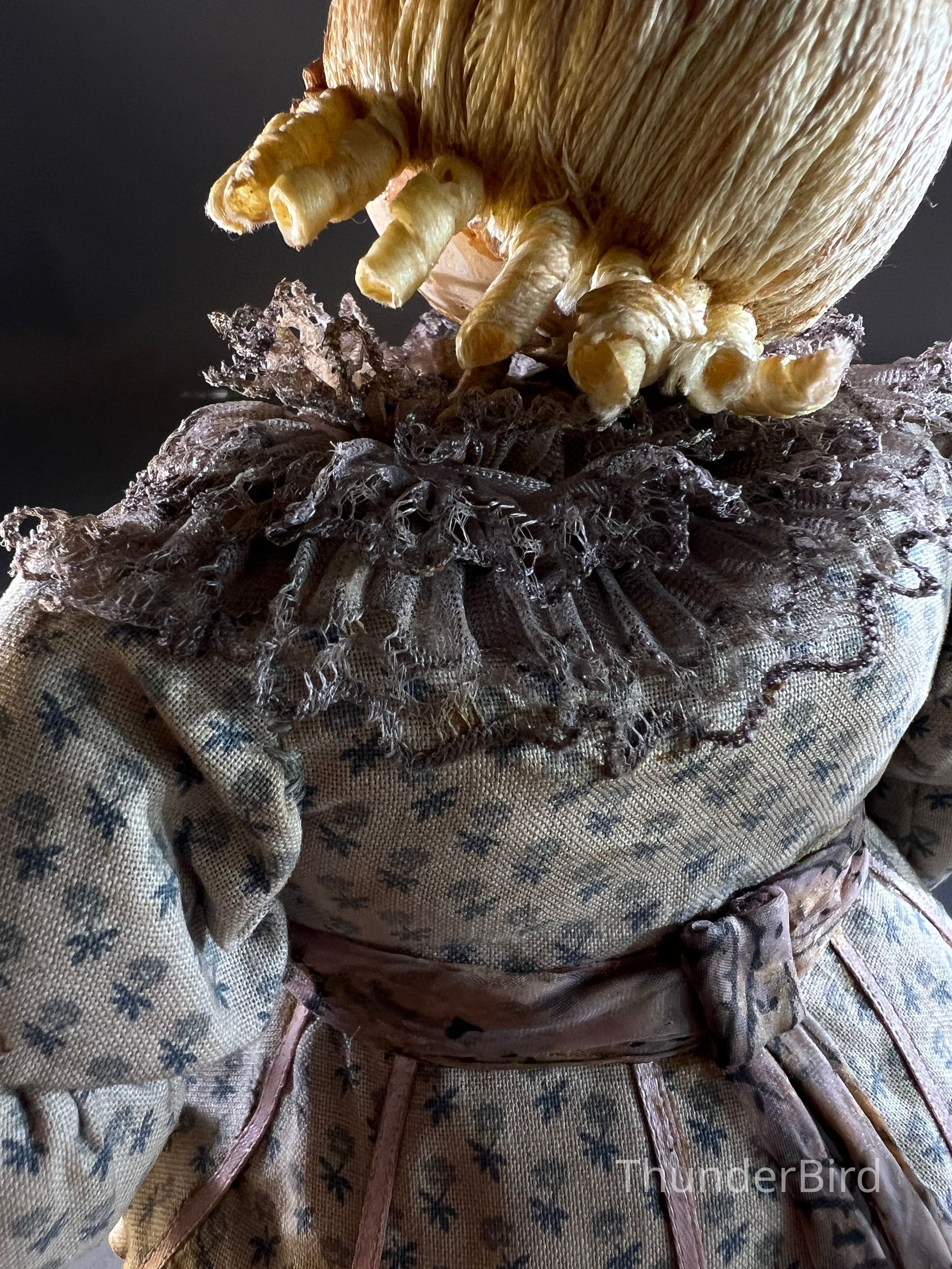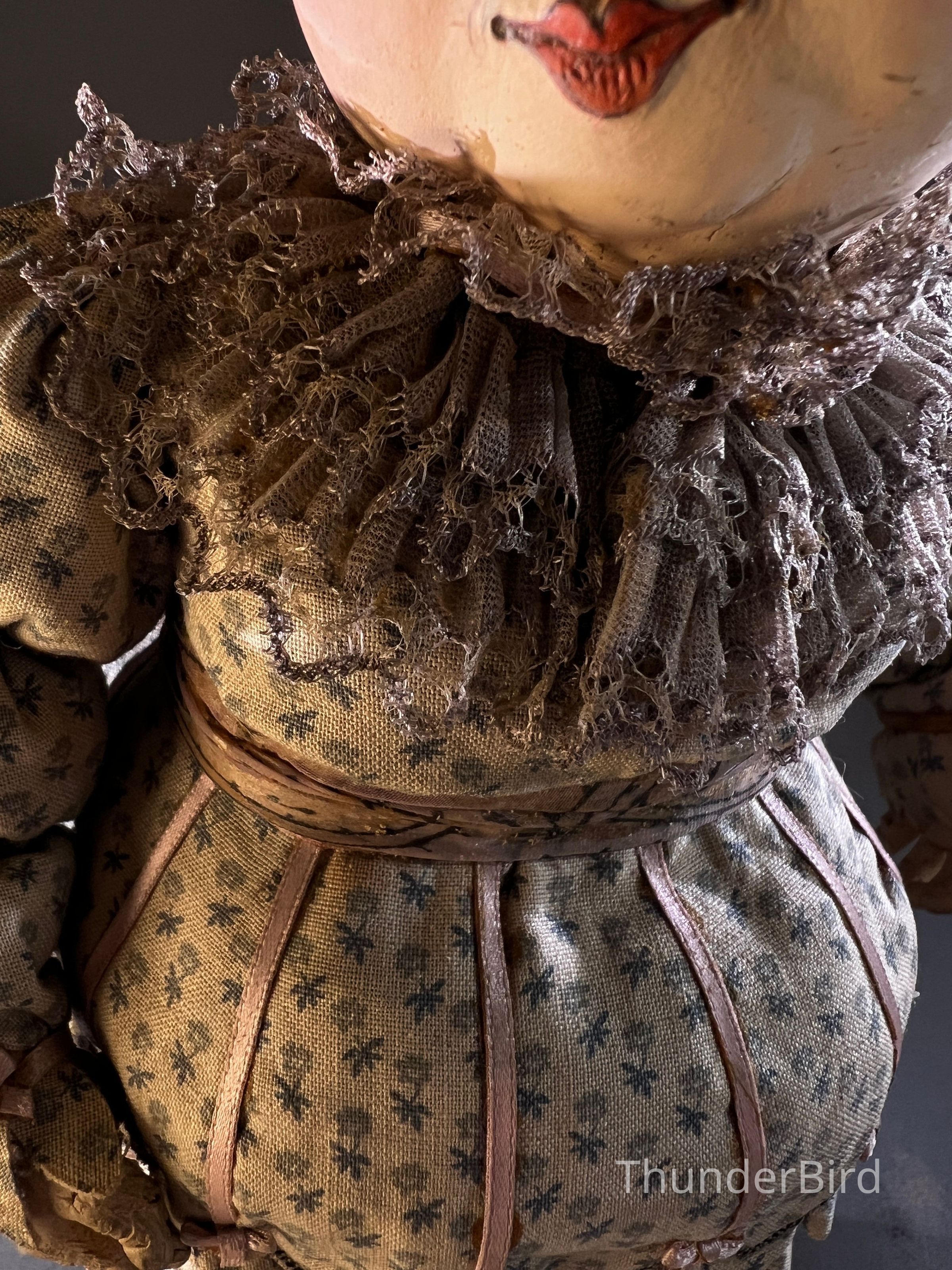 Medium: Mixed media – hand-moulded head, painted detail, costumed with textile, lace, and synthetic hair