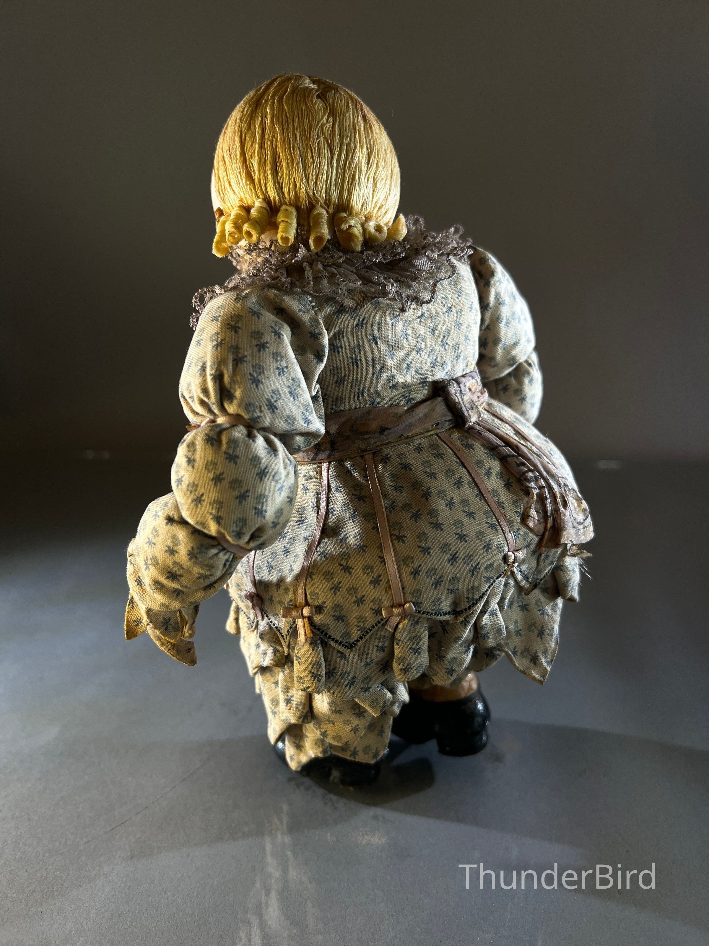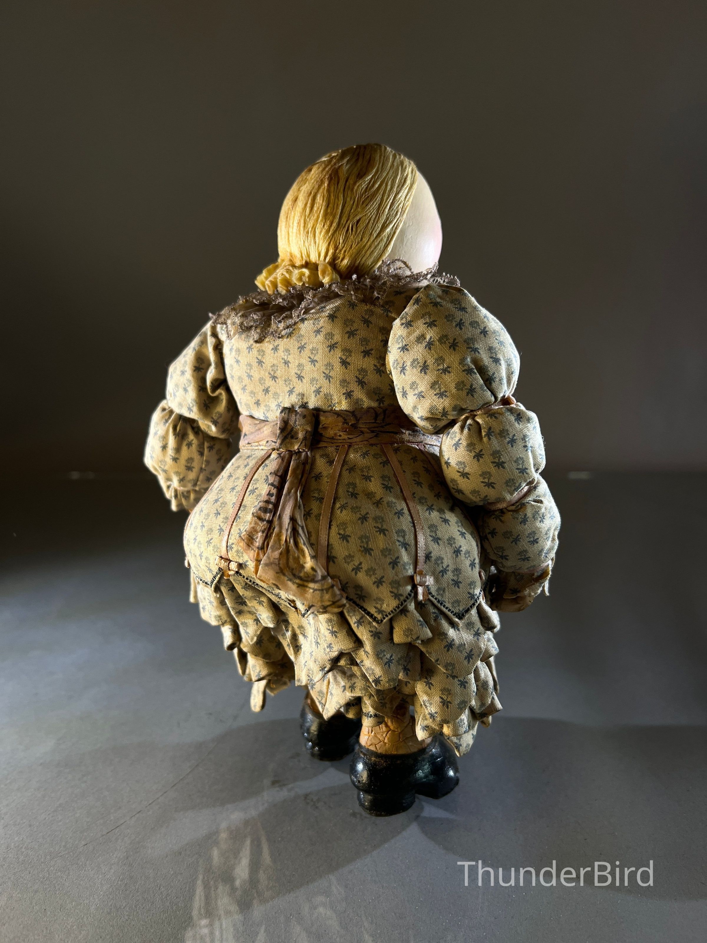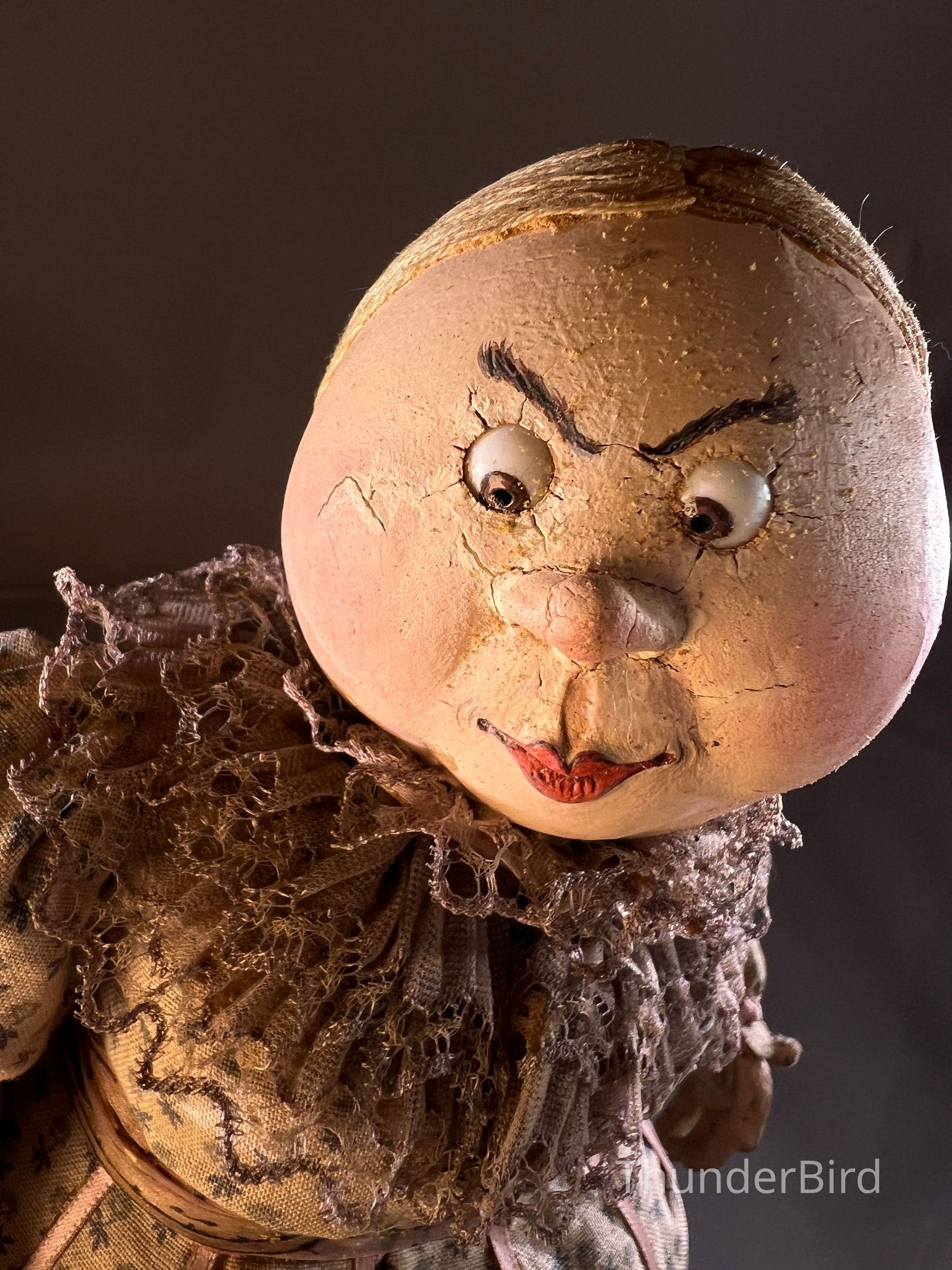 Medium: Mixed media – hand-moulded head, painted detail, costumed with textile, lace, and synthetic hair