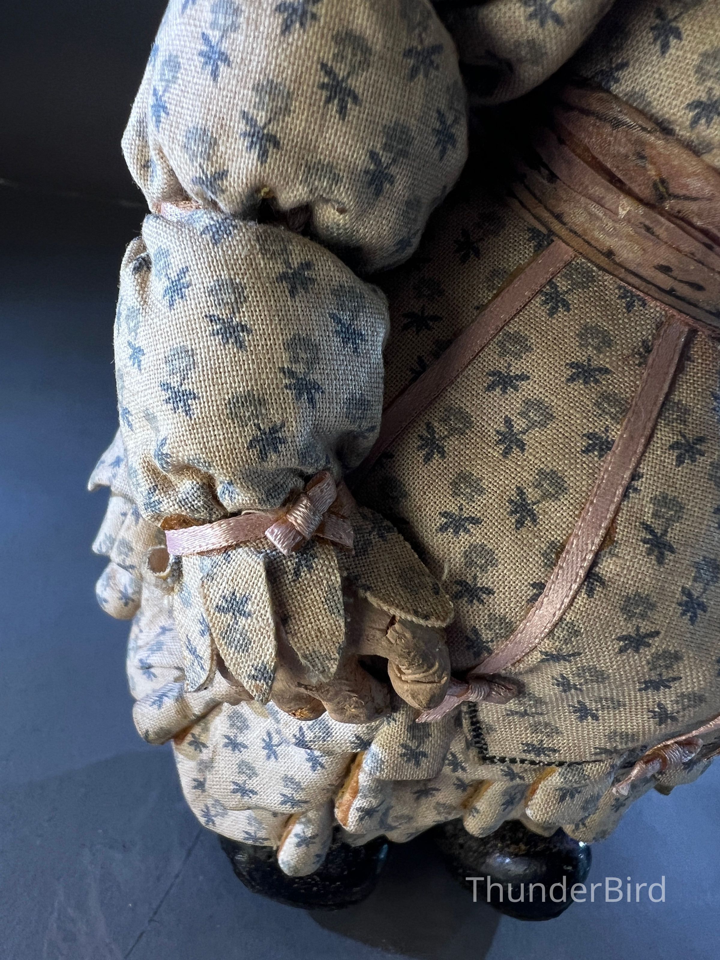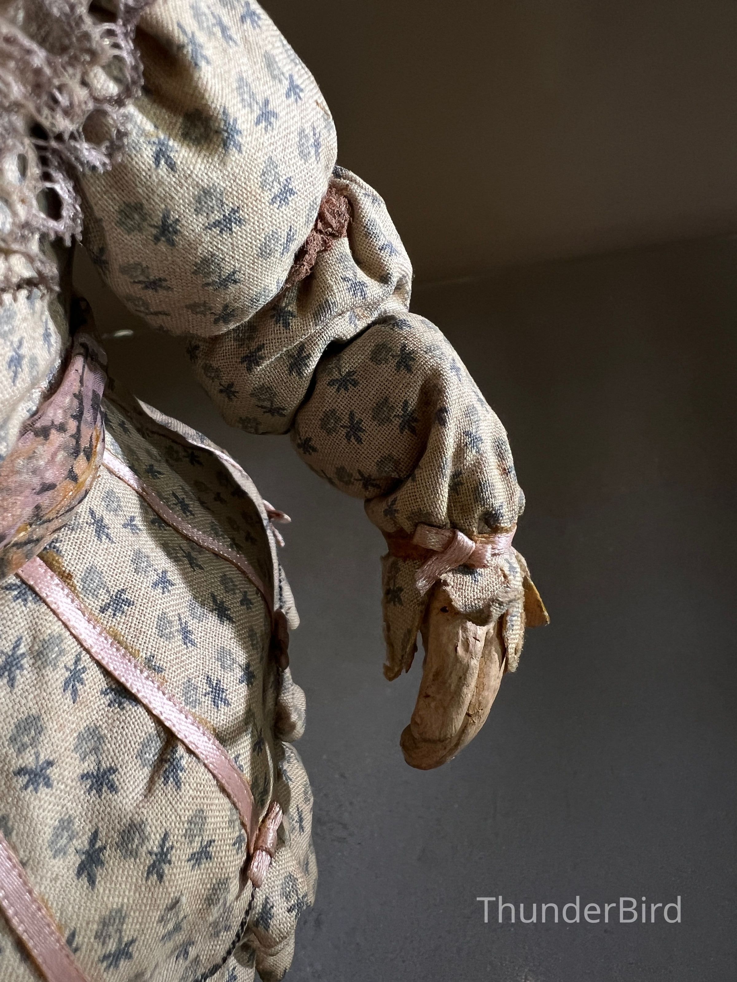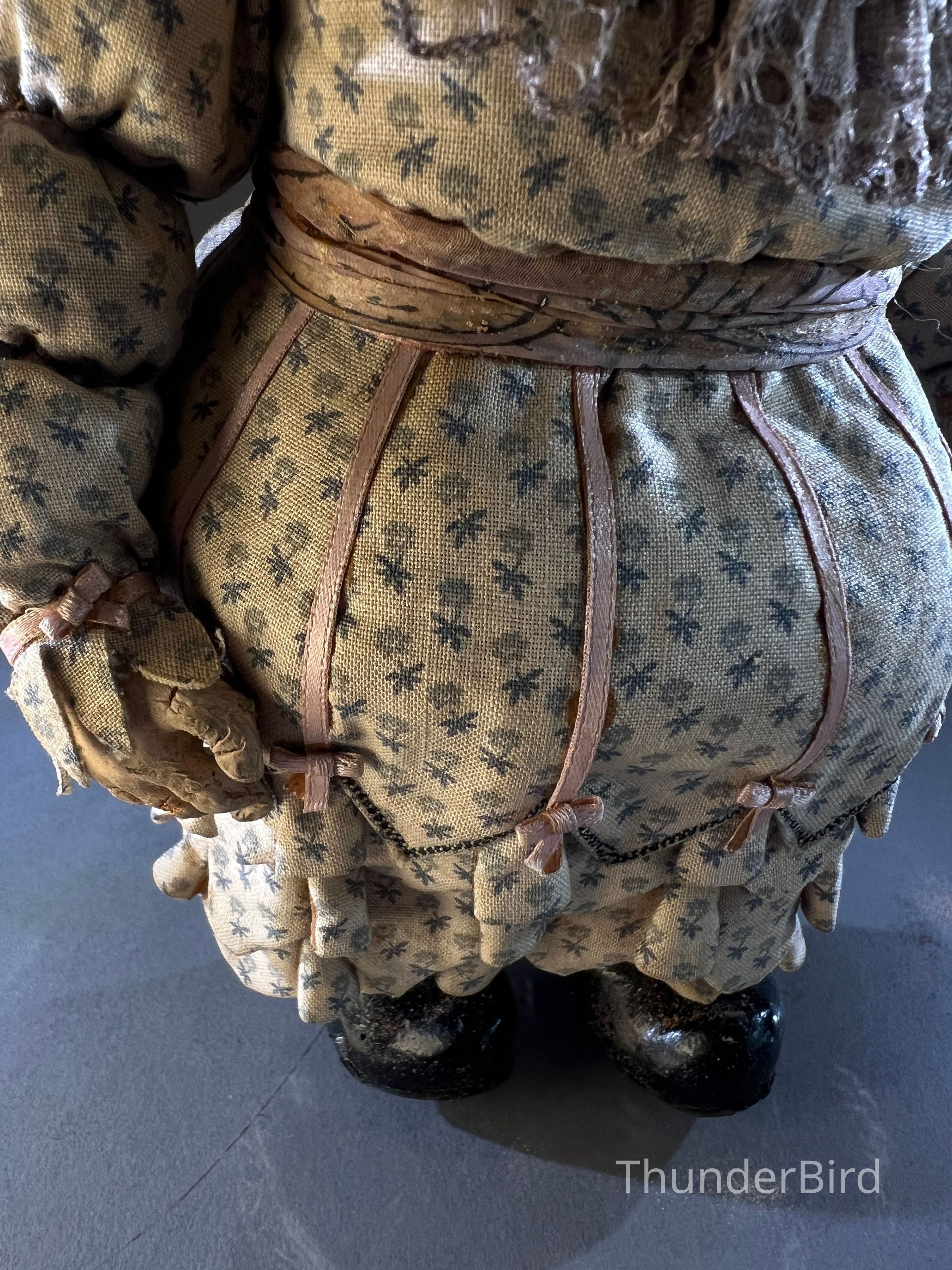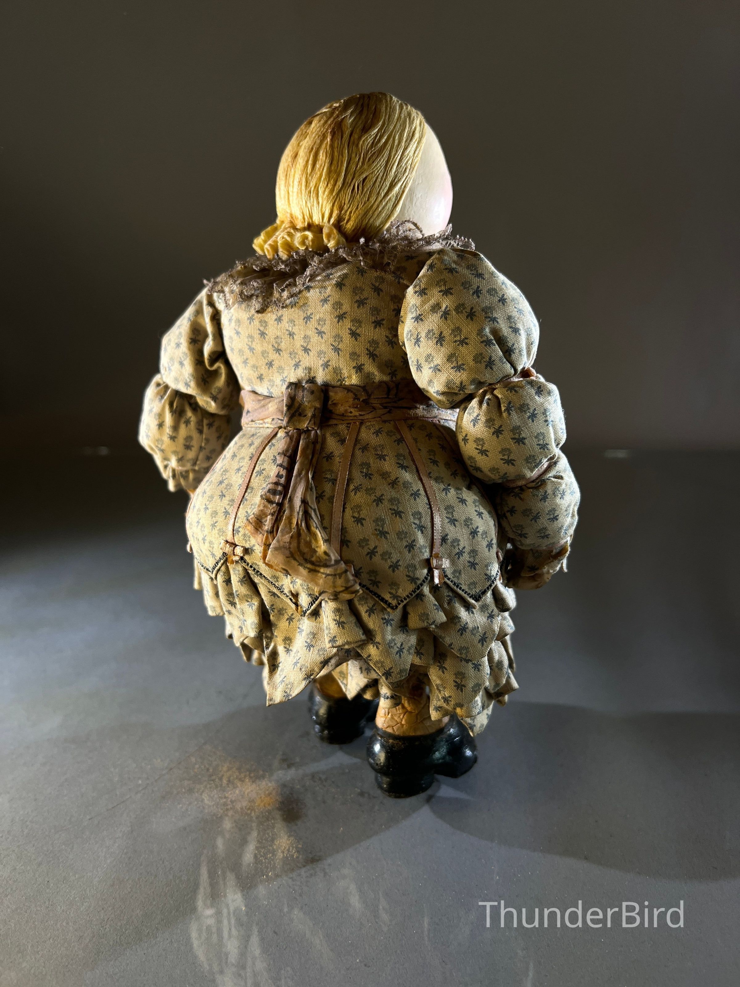 Medium: Mixed media – hand-moulded head, painted detail, costumed with textile, lace, and synthetic hair