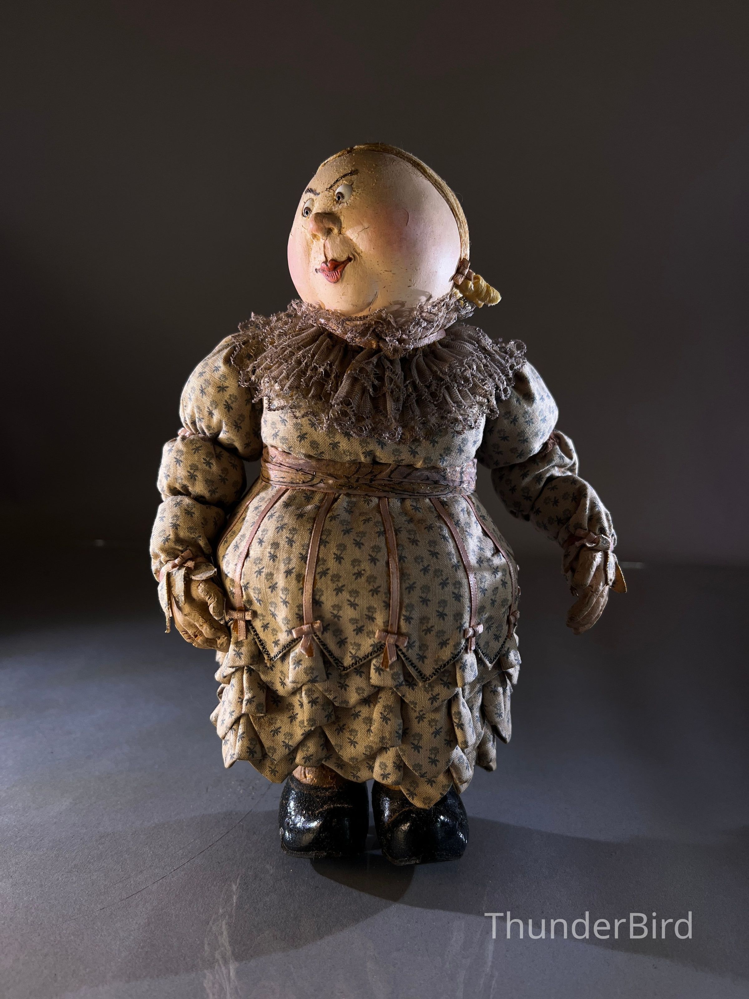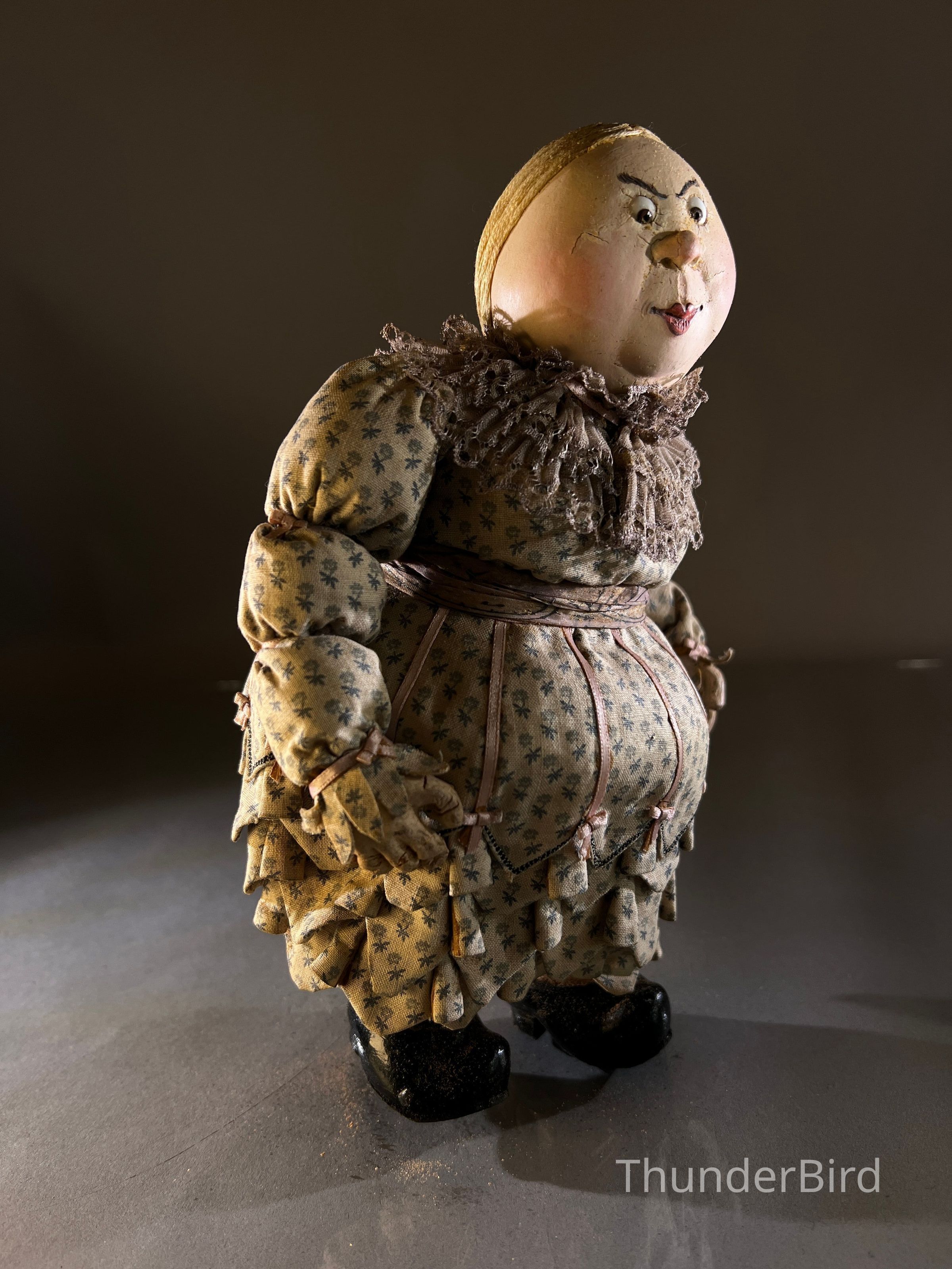 A brilliantly expressive matron figure, likely created for a BBC stop-motion production. Her round features, hand-sculpted expression, and heavily padded textile body point to a formidable yet humorous character—perhaps a governess, innkeeper, or matriarchal townsperson. She wears a richly detailed costume with layered calico, lace collar, and period ribboning, with painted wooden shoes and carefully styled ringlets.