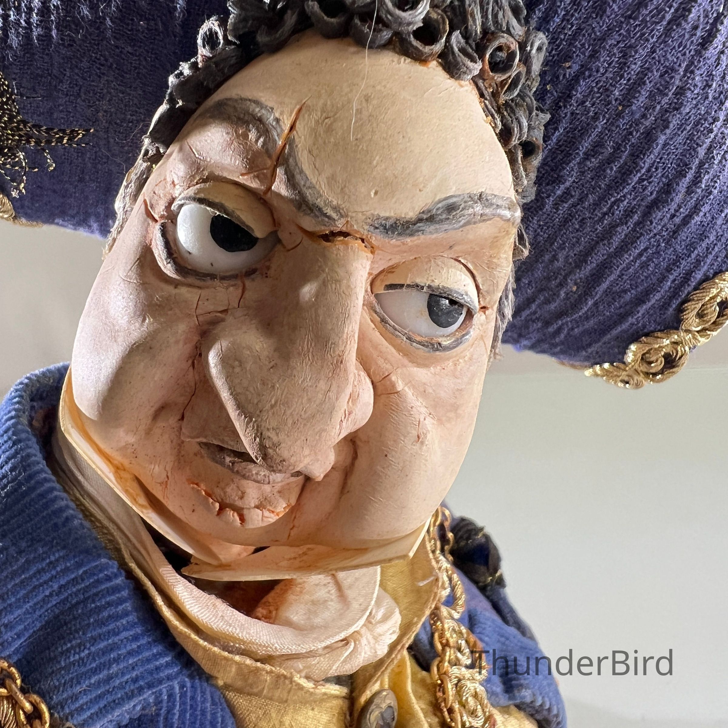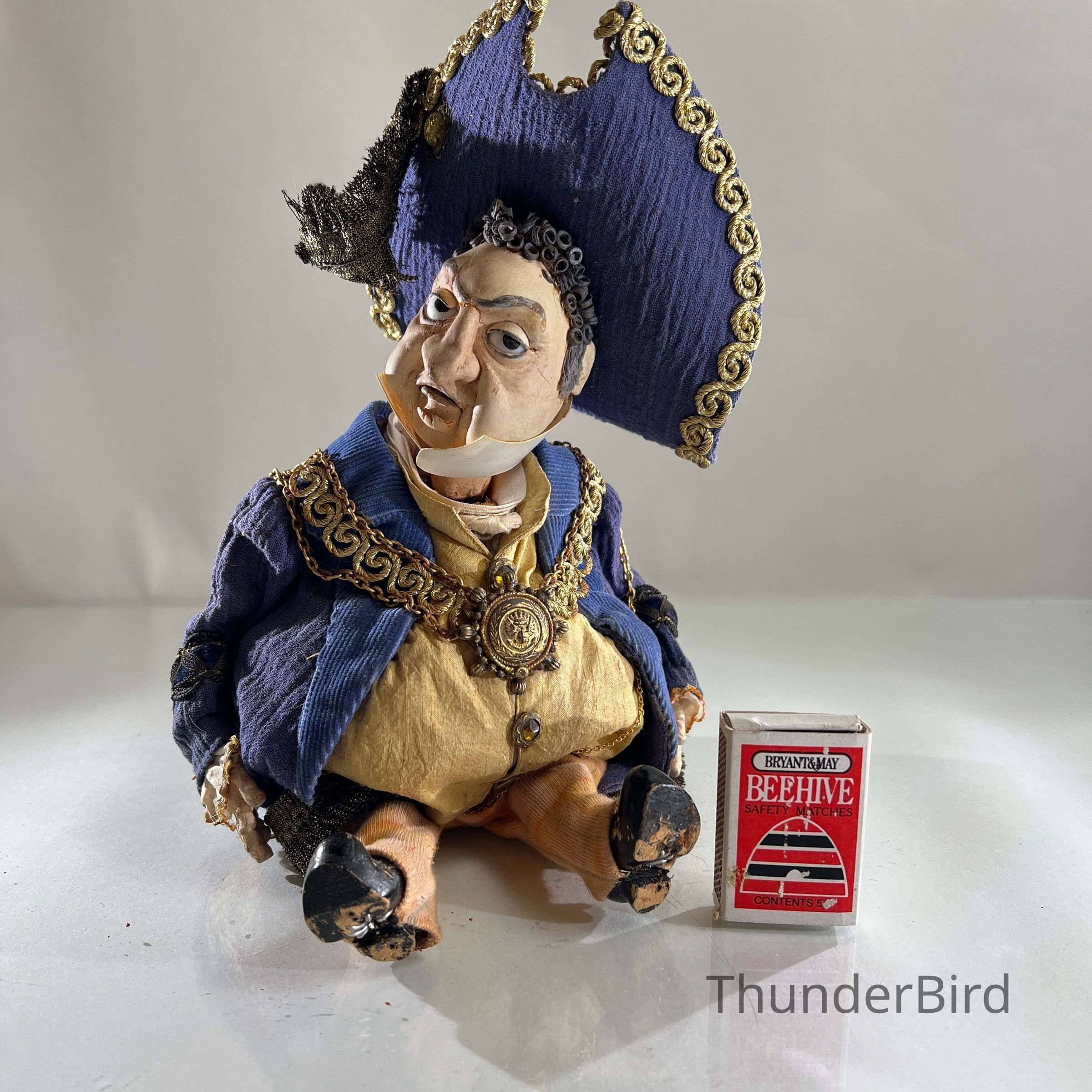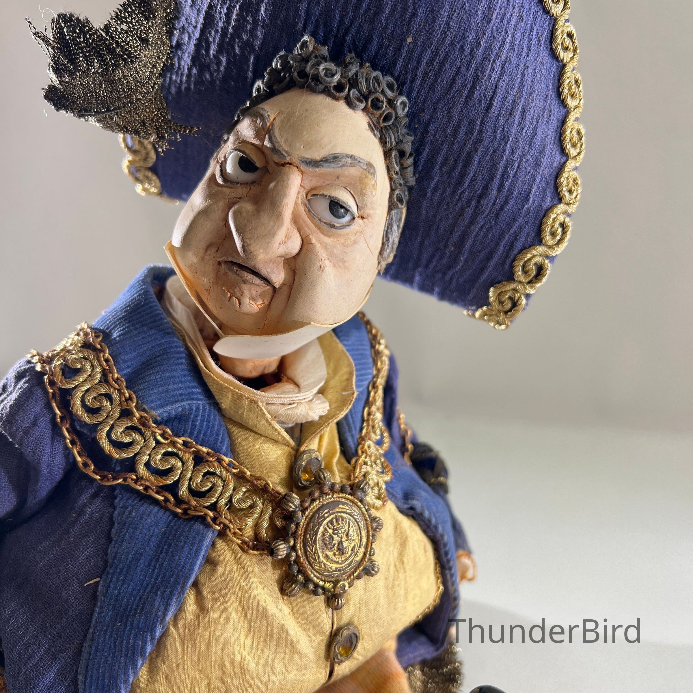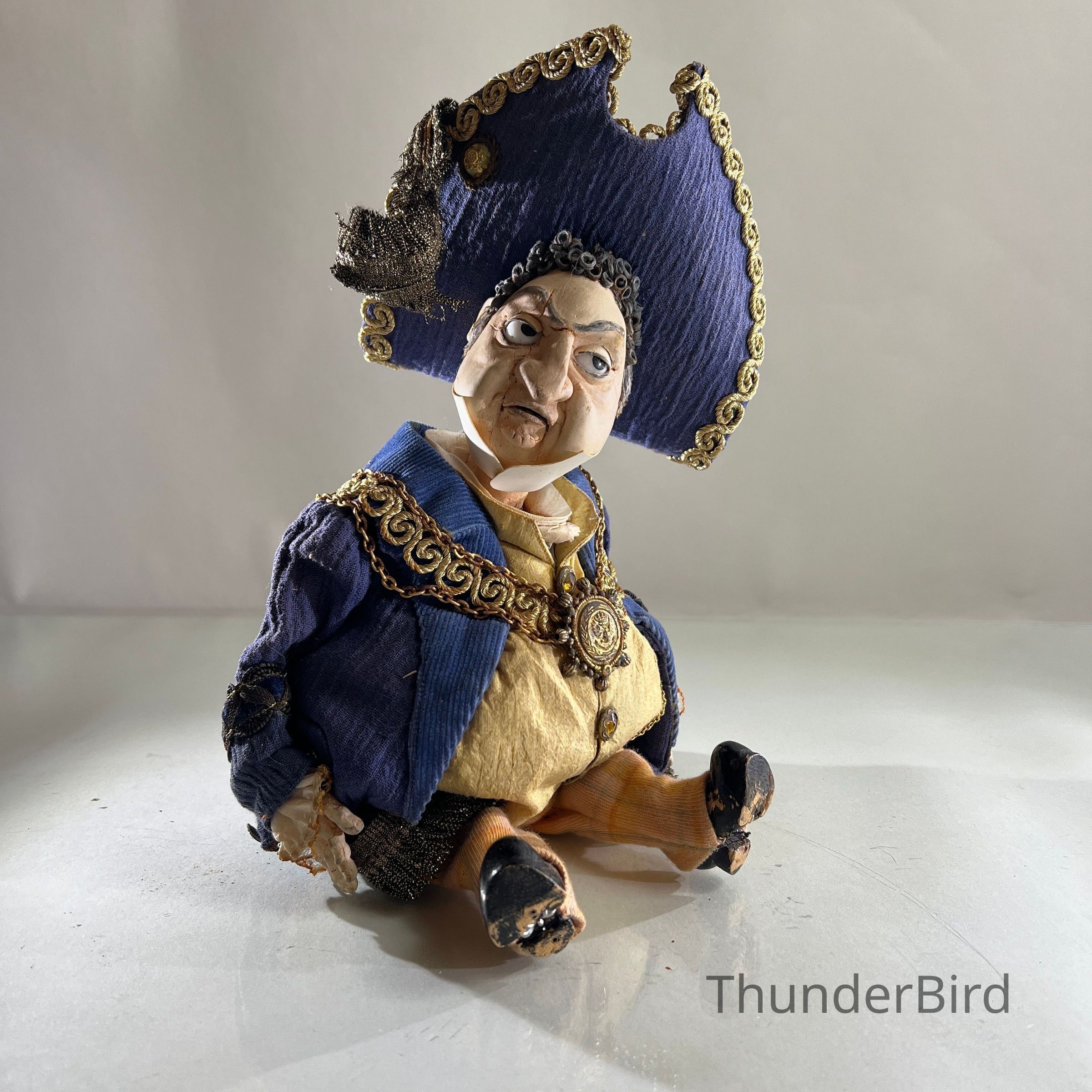 An expressive stop-motion puppet depicting a richly dressed nobleman or civic dignitary. Featuring a curled wig, elaborate bicorn hat with decorative plume, and resplendent gold chain and medallion, the character suggests satire or parody of authority figures. His exaggerated facial expression and body posture reflect Alan Platt’s distinct blend of humour and theatricality in puppet design.