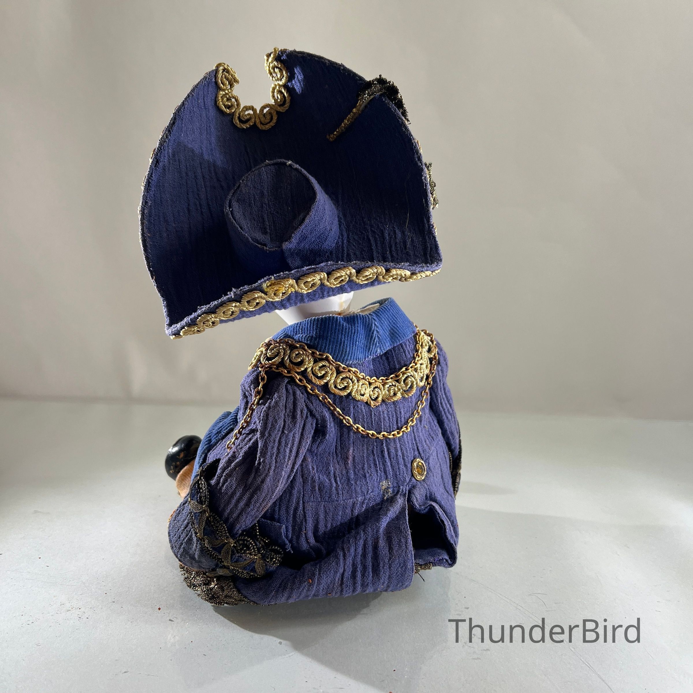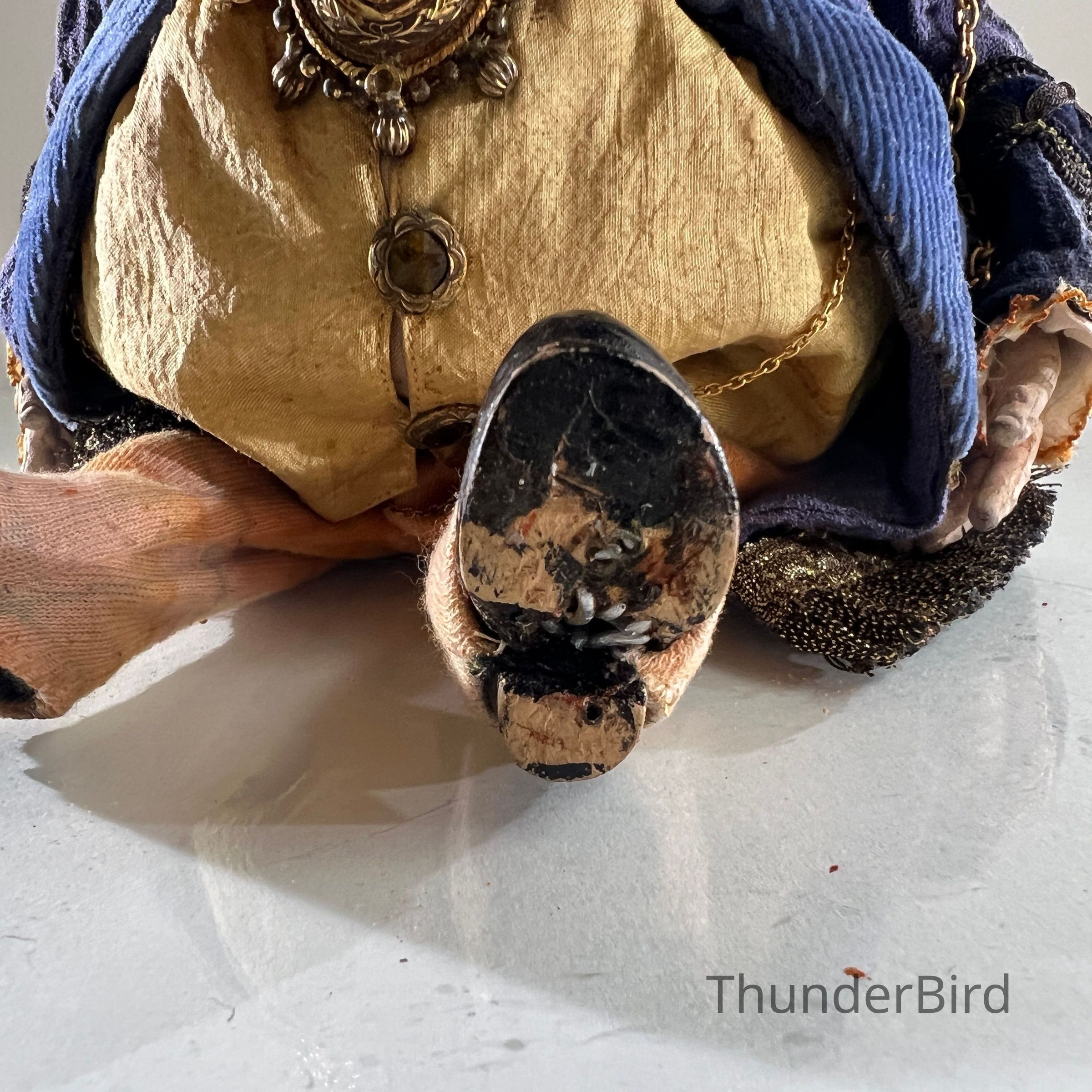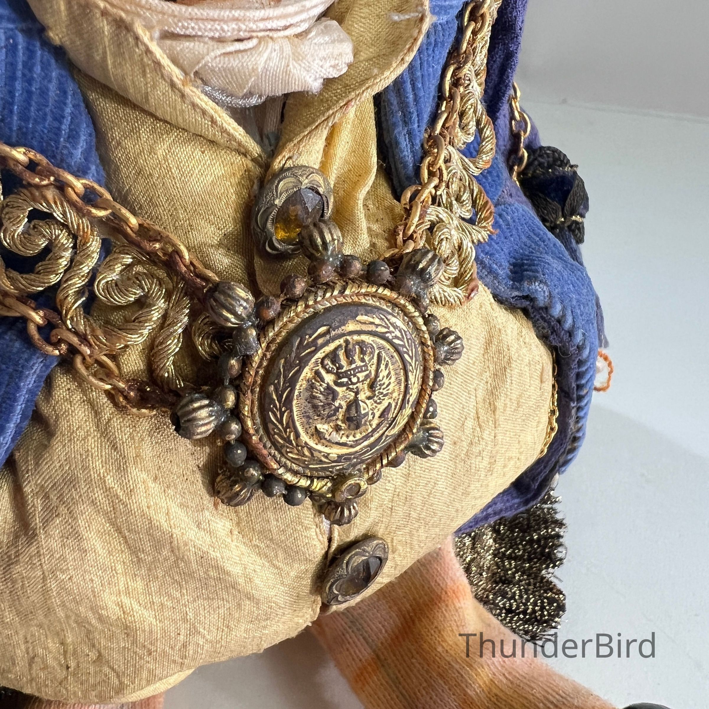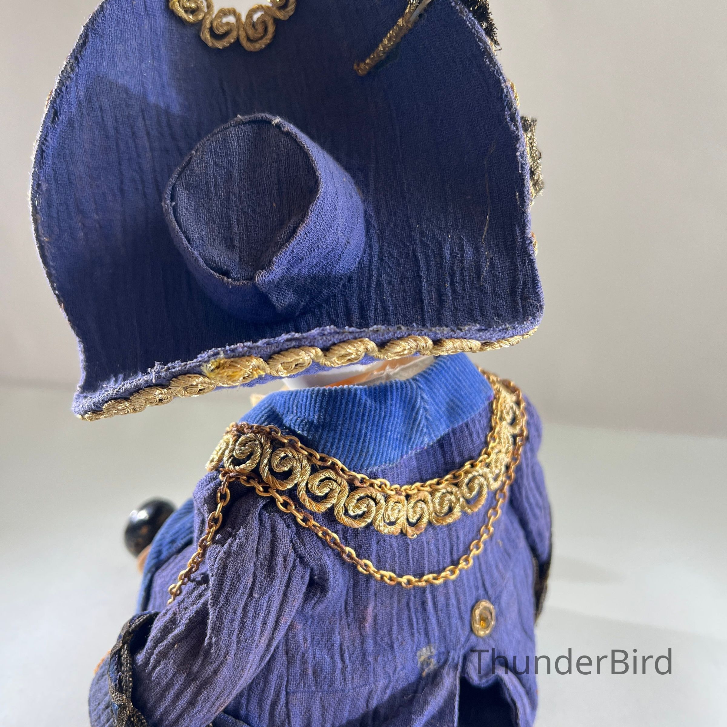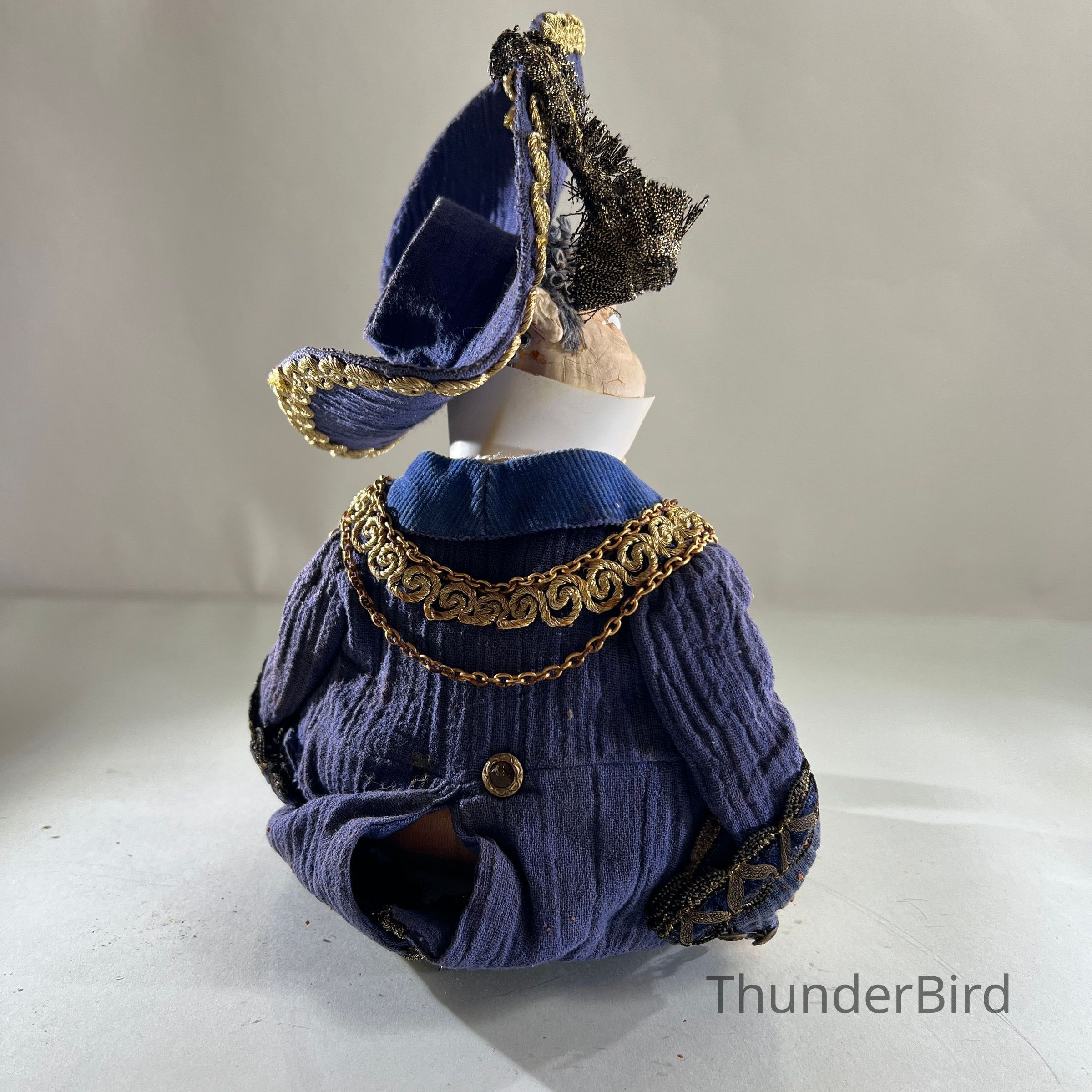 Medium: Mixed media – hand-moulded head, painted detail, costumed with fabric, synthetic hair, and metallic trims