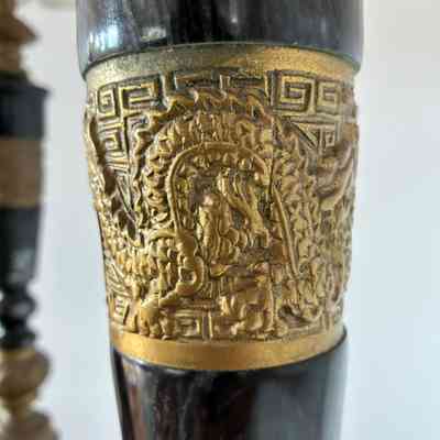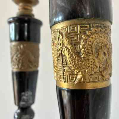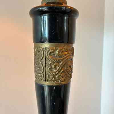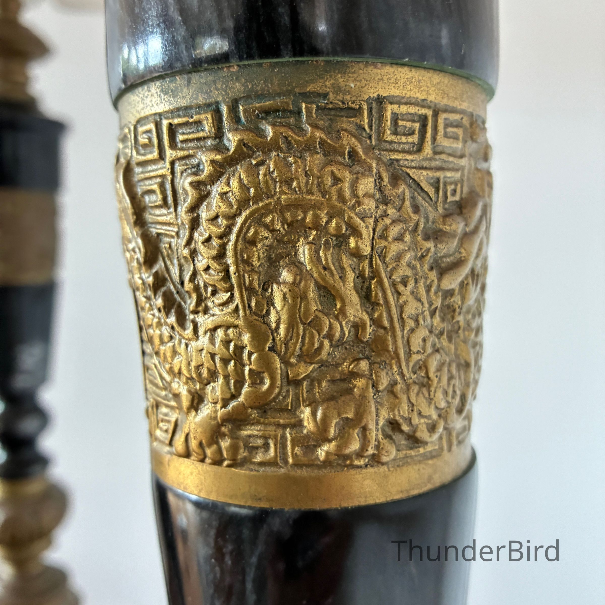 An impressive pair of mid-century table lamps crafted from cast bronze and polished black Italian marble, attributed to James Mont, in the manner of Marbro Lamp Co. The combination of stylised Asian dragon motifs, architectural profiles, and luxurious materiality are all hallmarks of Mont’s celebrated East–West fusion aesthetic.