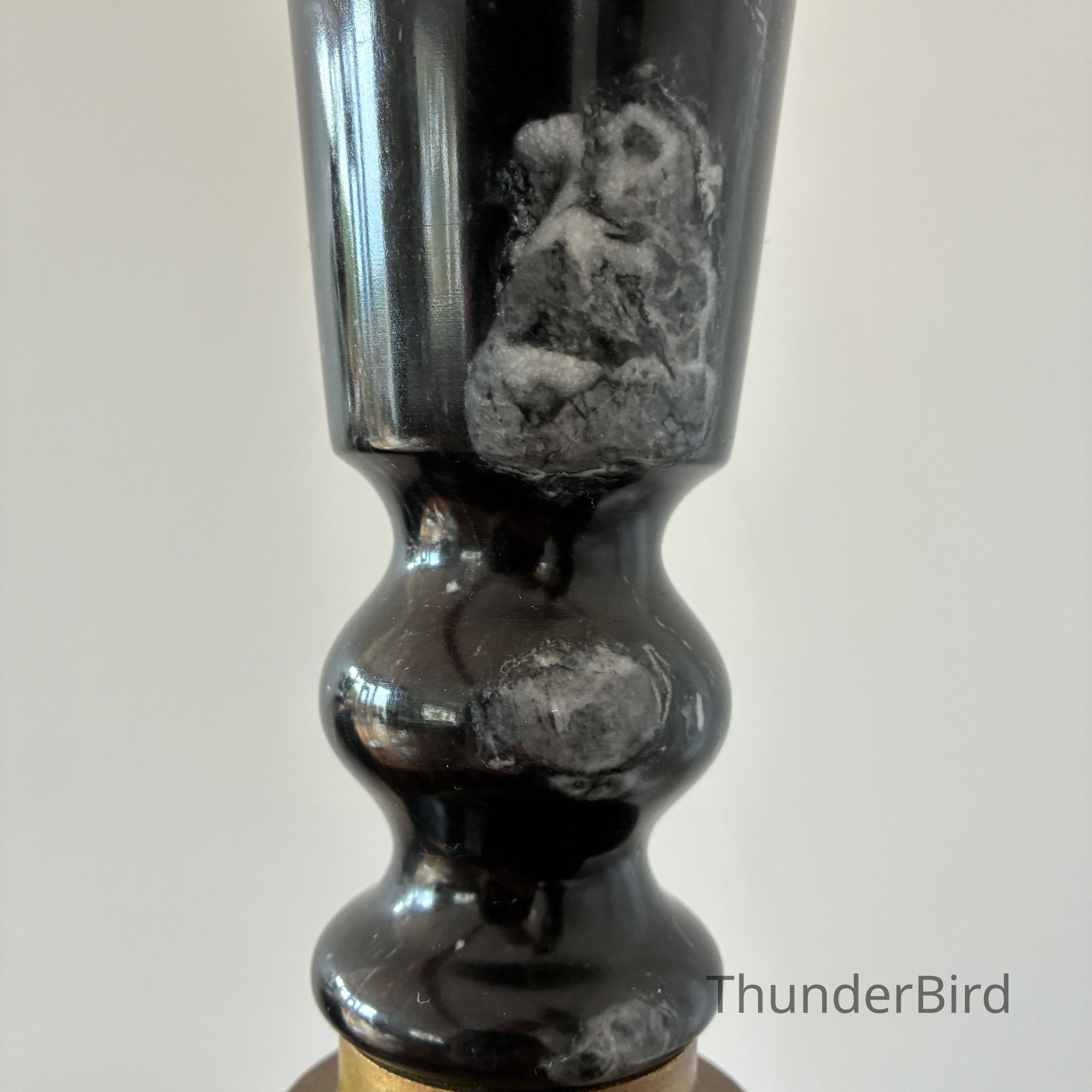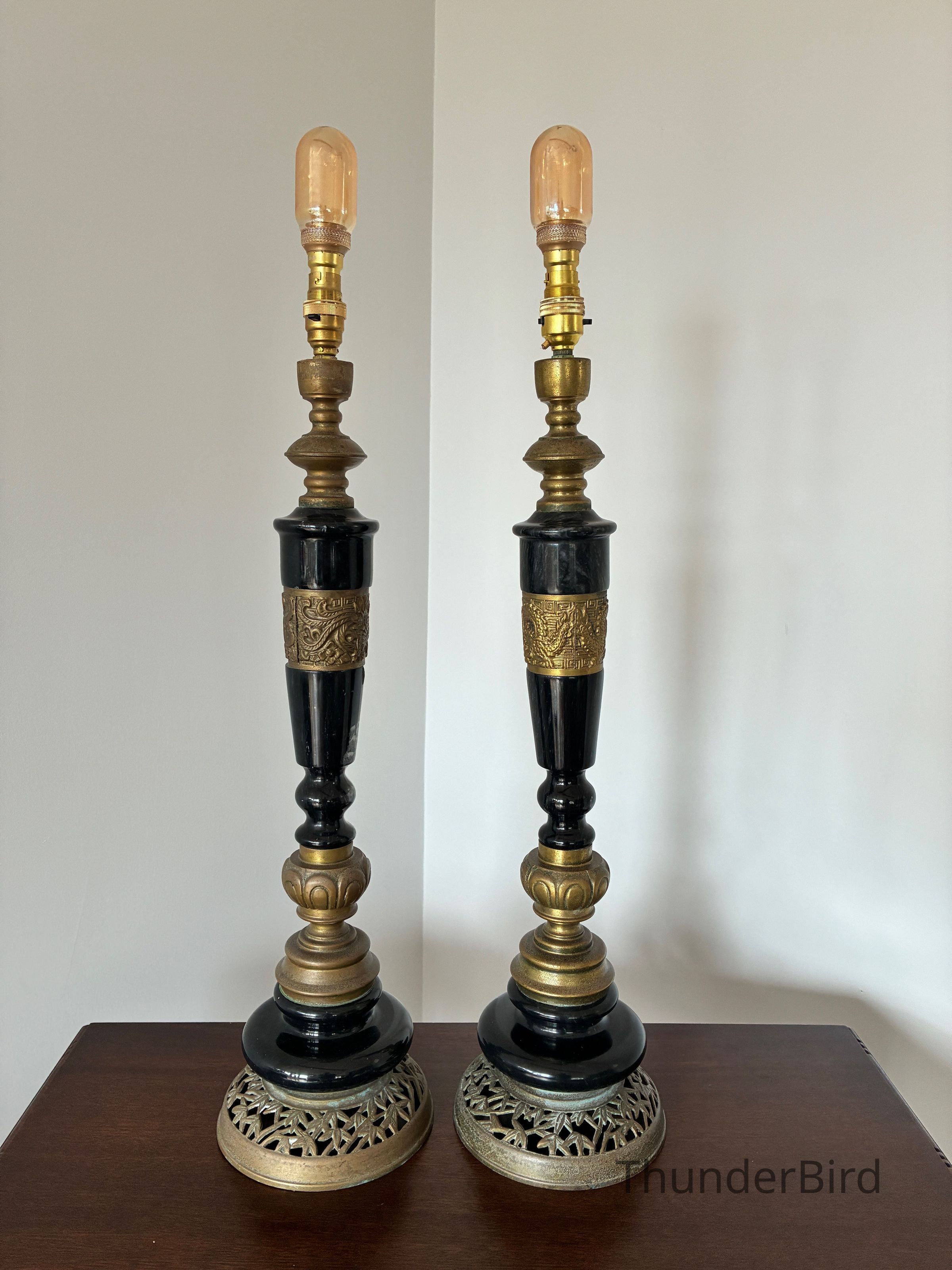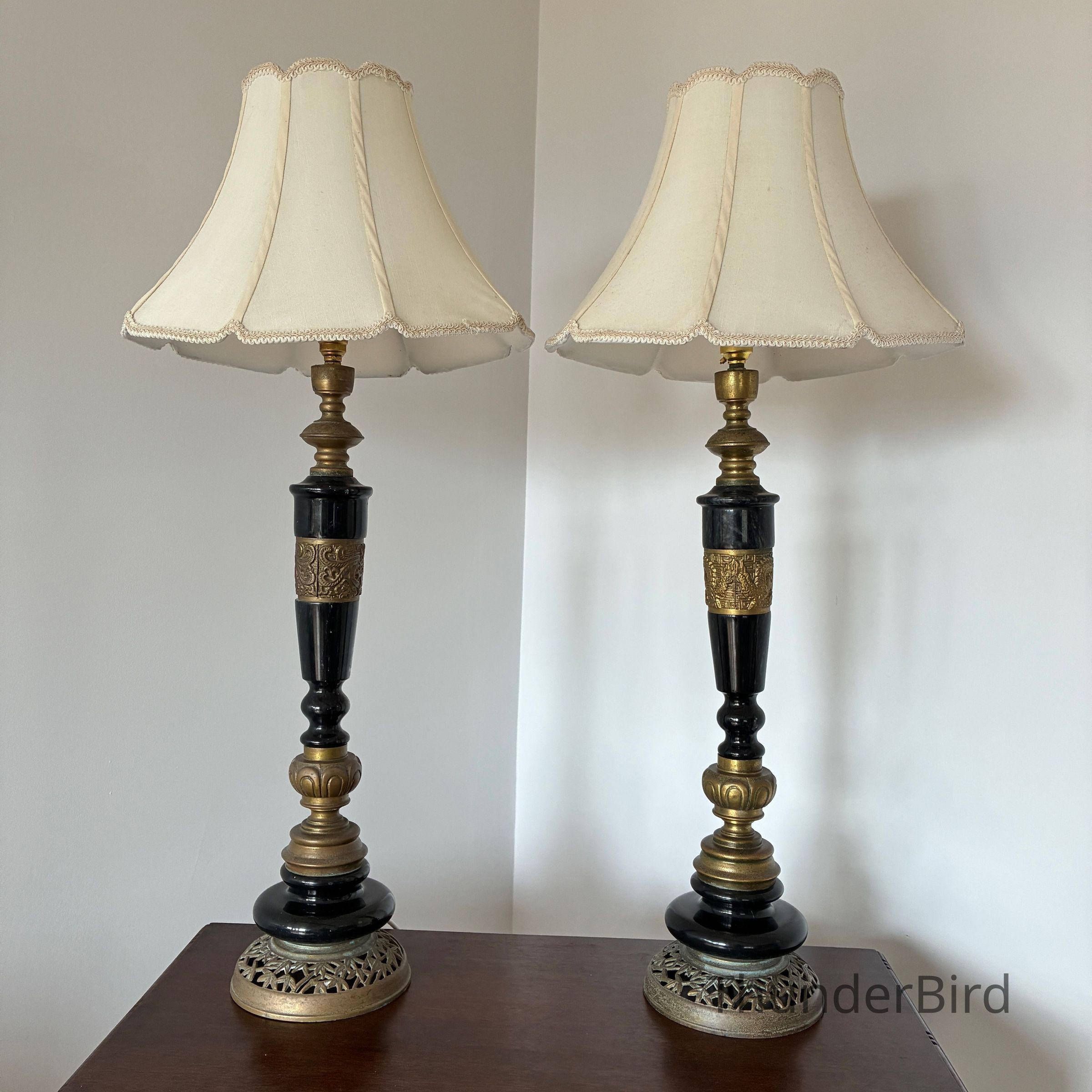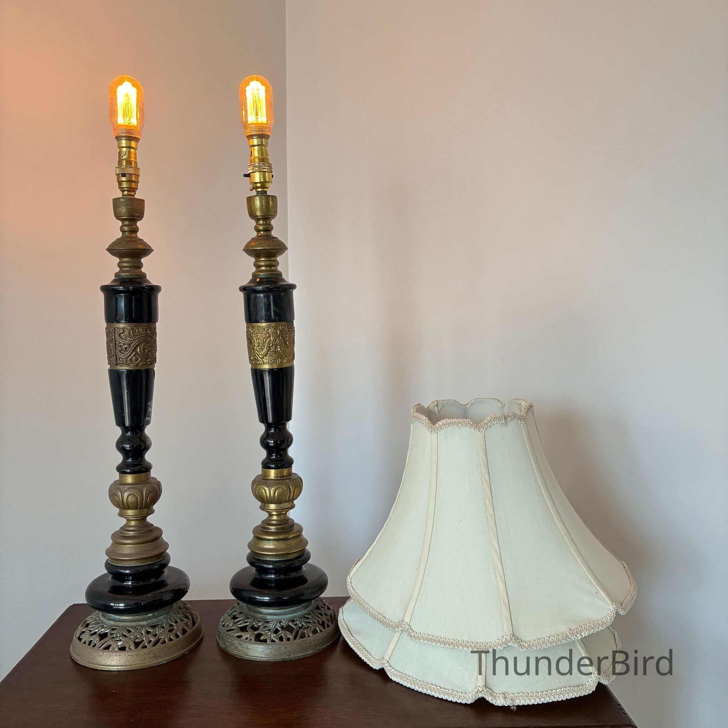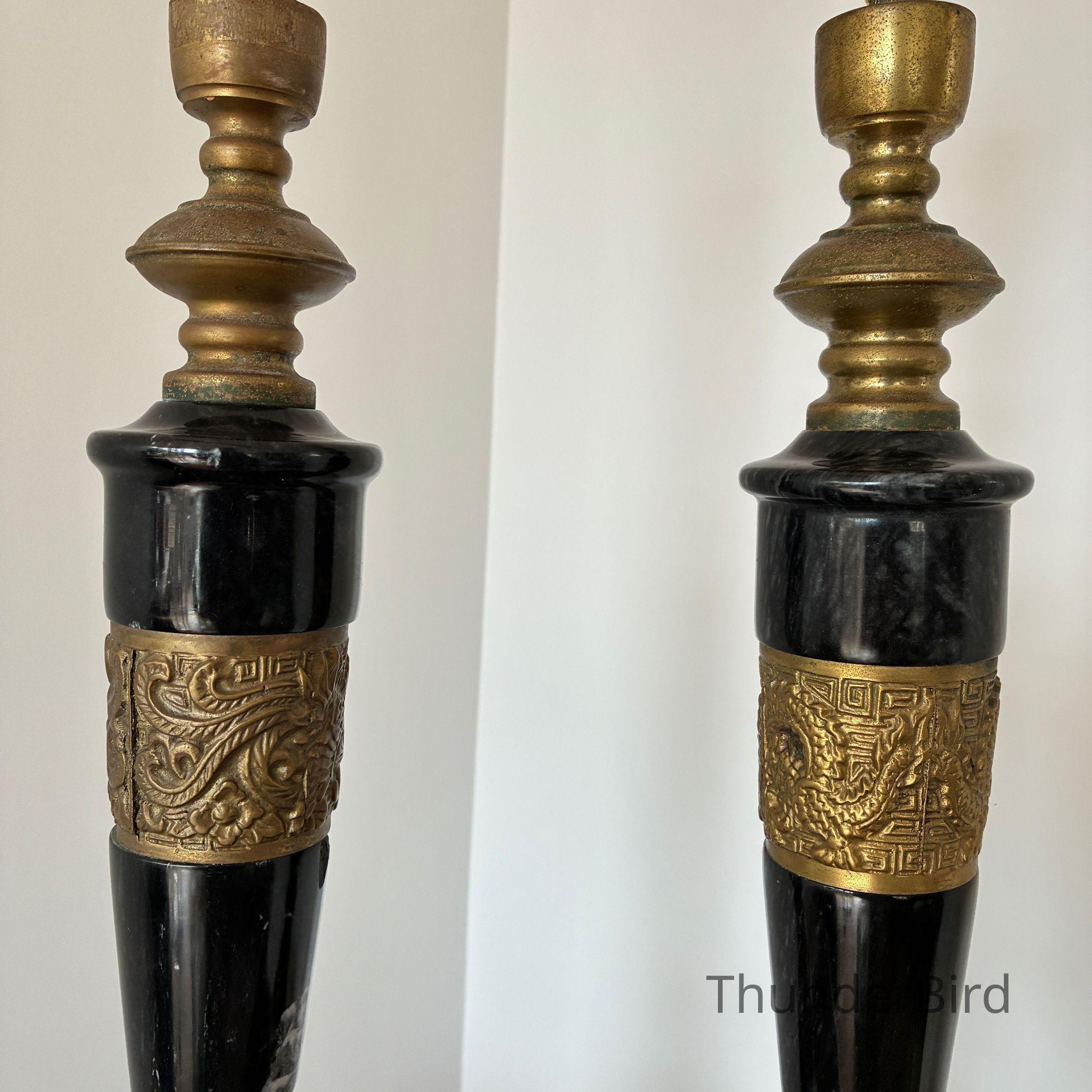 Very good vintage condition, see photos for detail. Light surface wear to bronze consistent with age. Lovely green patina developing. Marble is highly polished with natural veining and mineral inclusions. One lamp has natural stone patterning (not damage) to the shaft, visible in photographs. Shades are vintage and do have wear etc. They are optional.