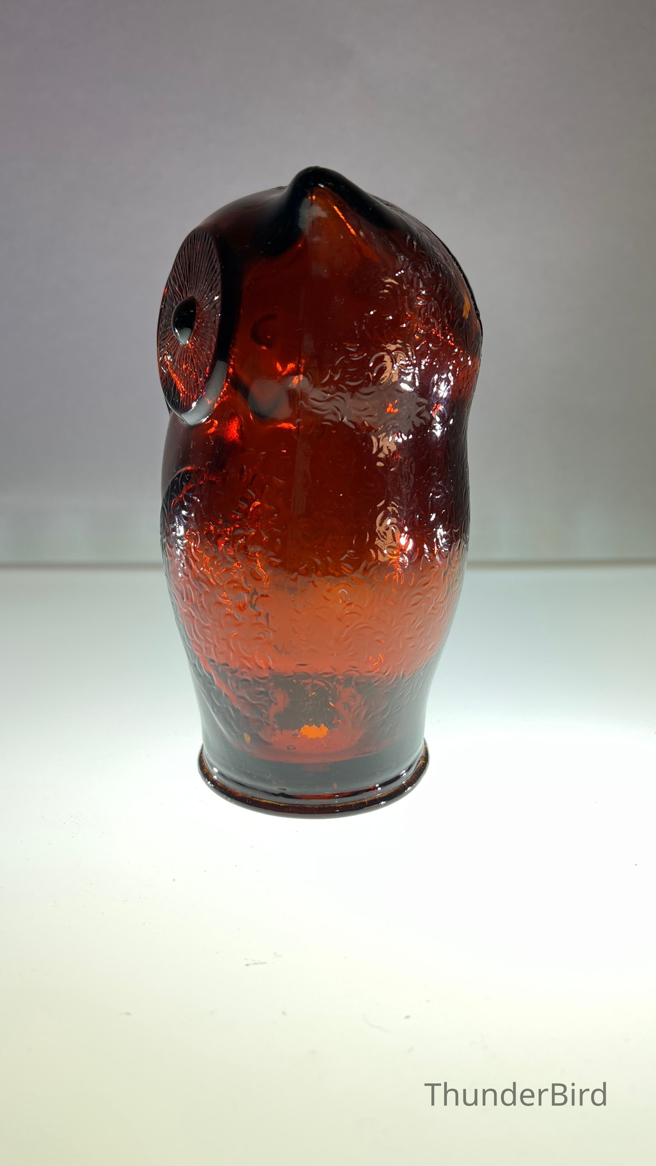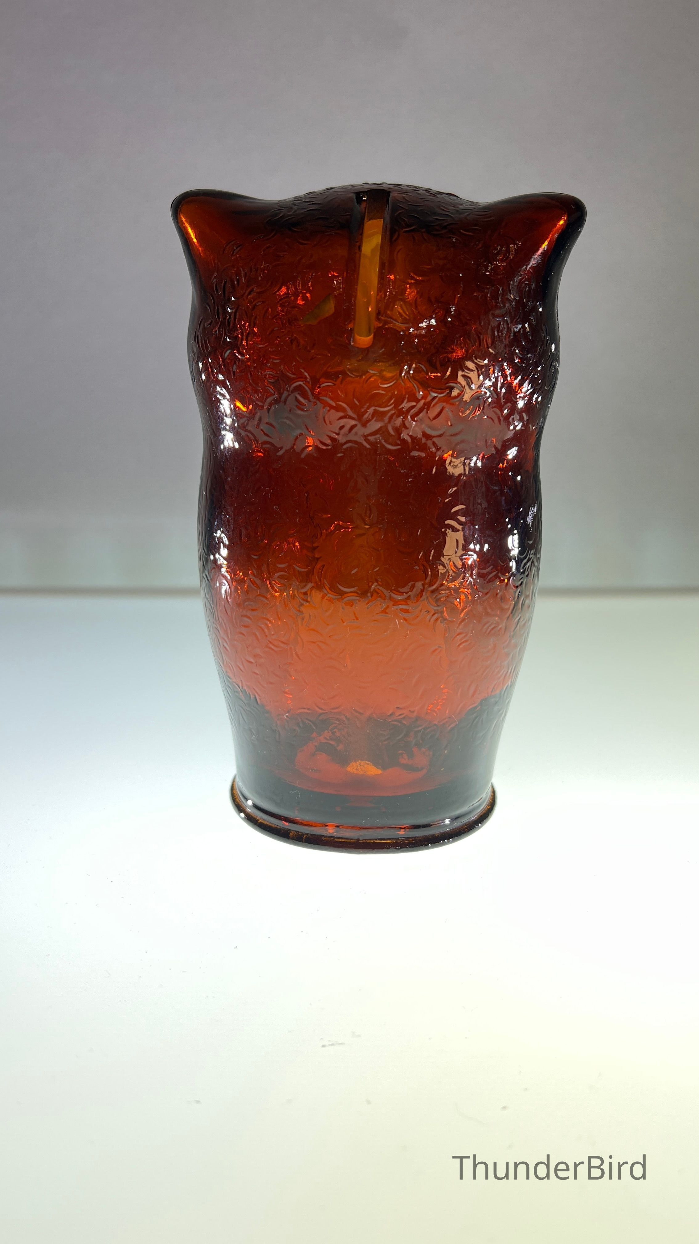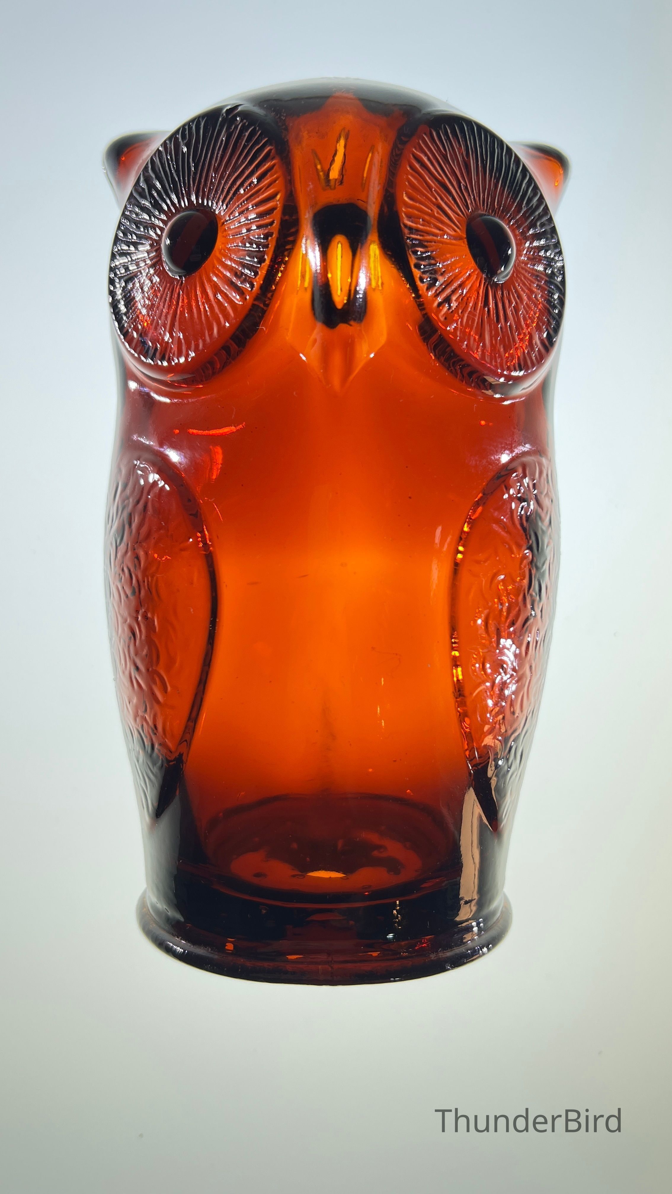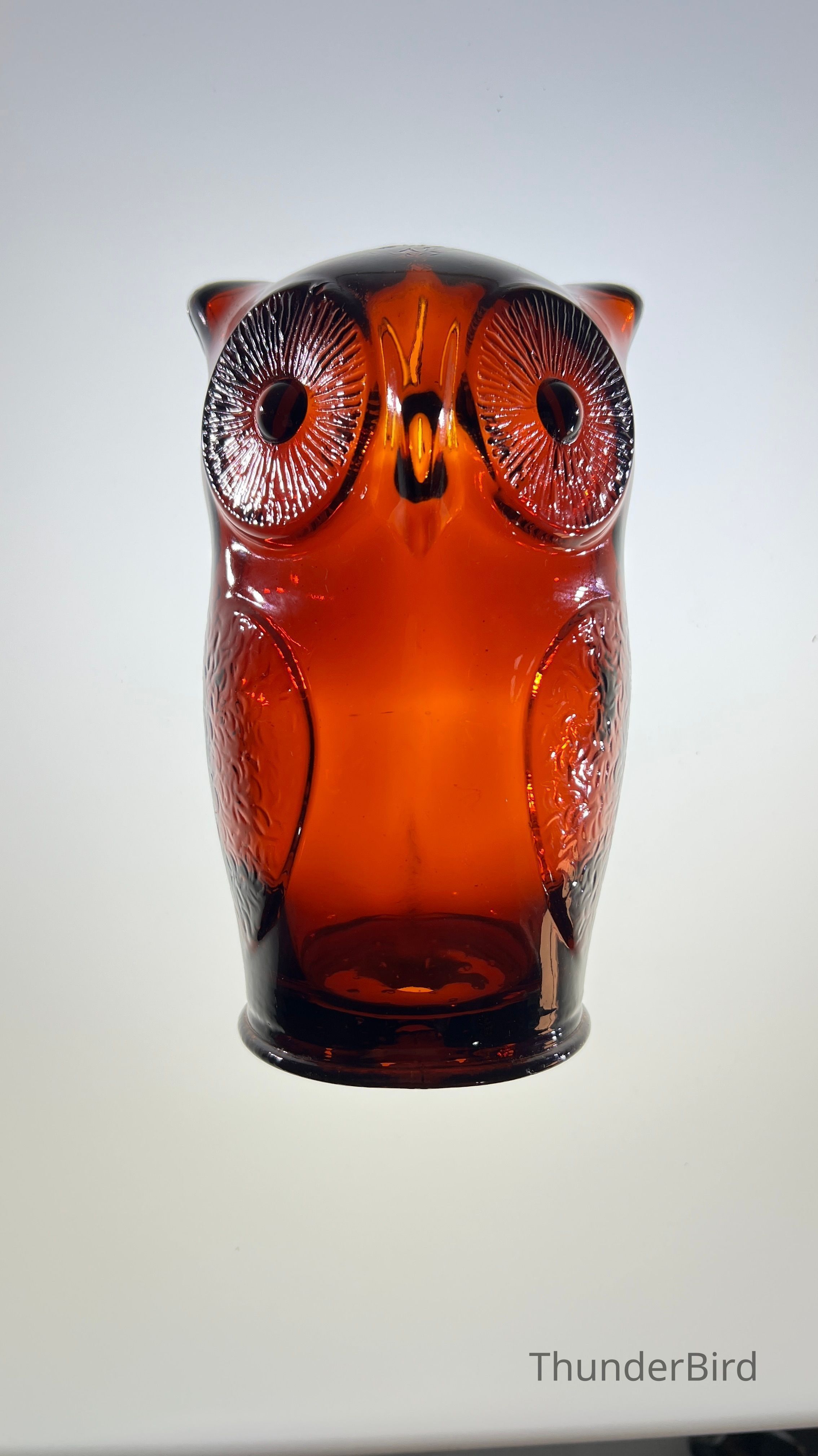 A vintage amber glass owl-shaped money box produced by Cascade Glass, England, during the 1960s–70s. This pressed glass piece features a stylised owl form with textured wings and large radiating eyes. Originally manufactured as a novelty money bank, these are now sought after as retro decorative objects. This version is unlabelled but matches labelled examples in form and colour, confirmed by comparative references.
