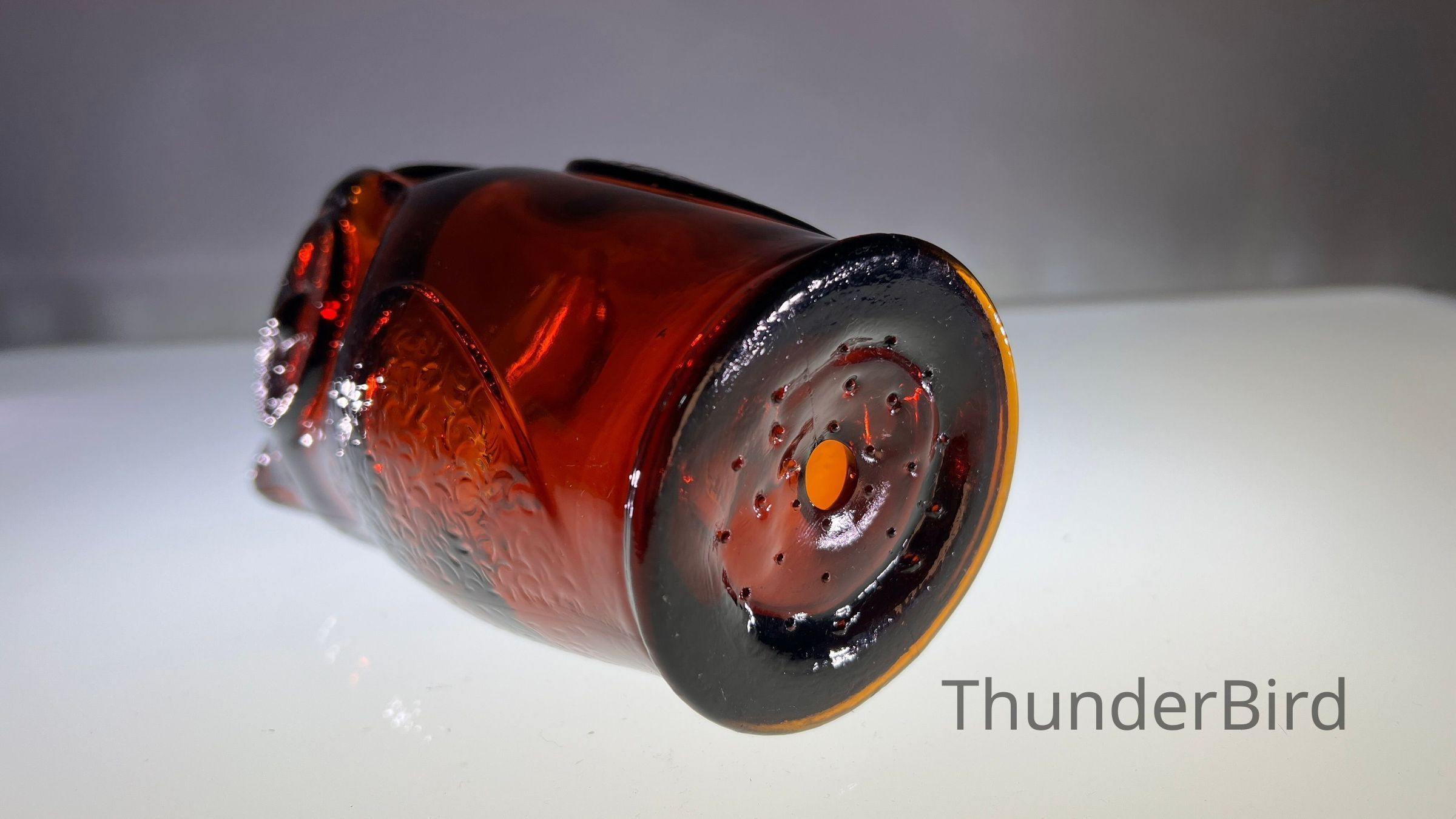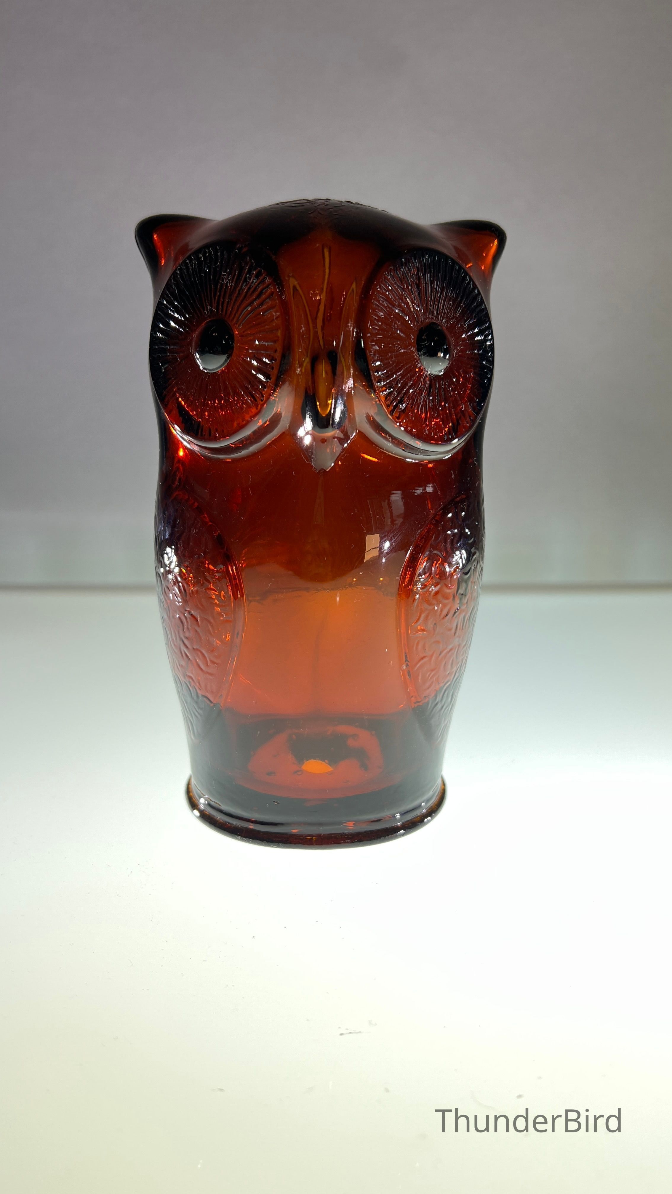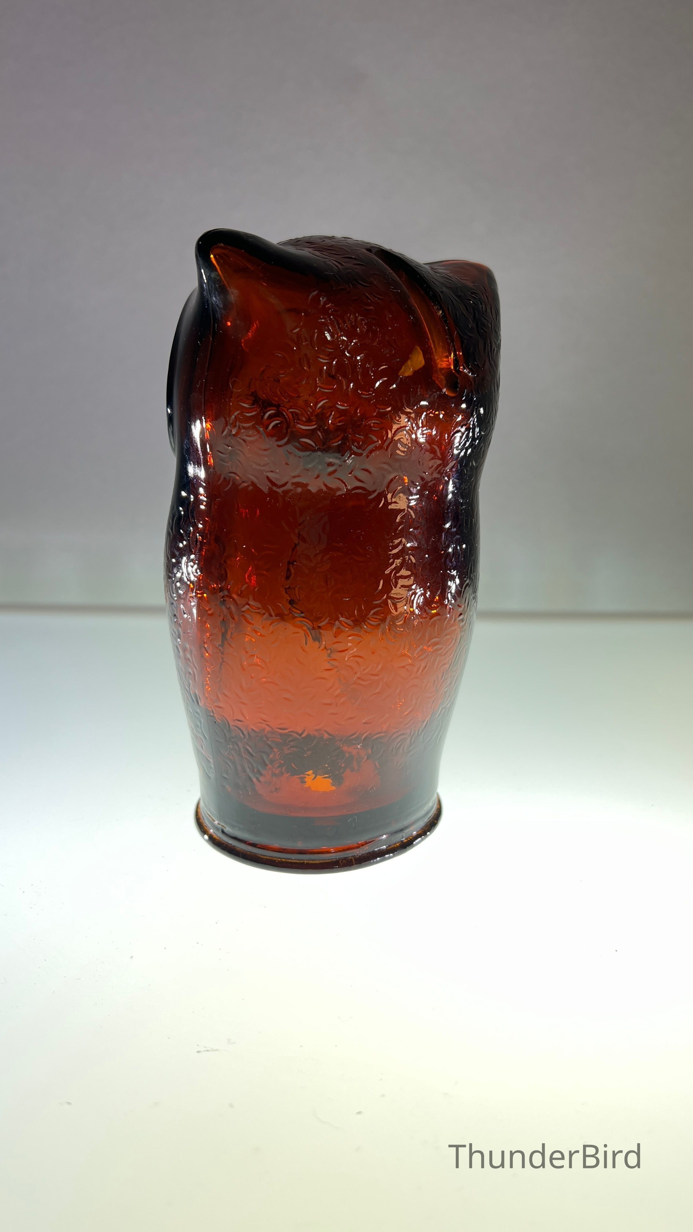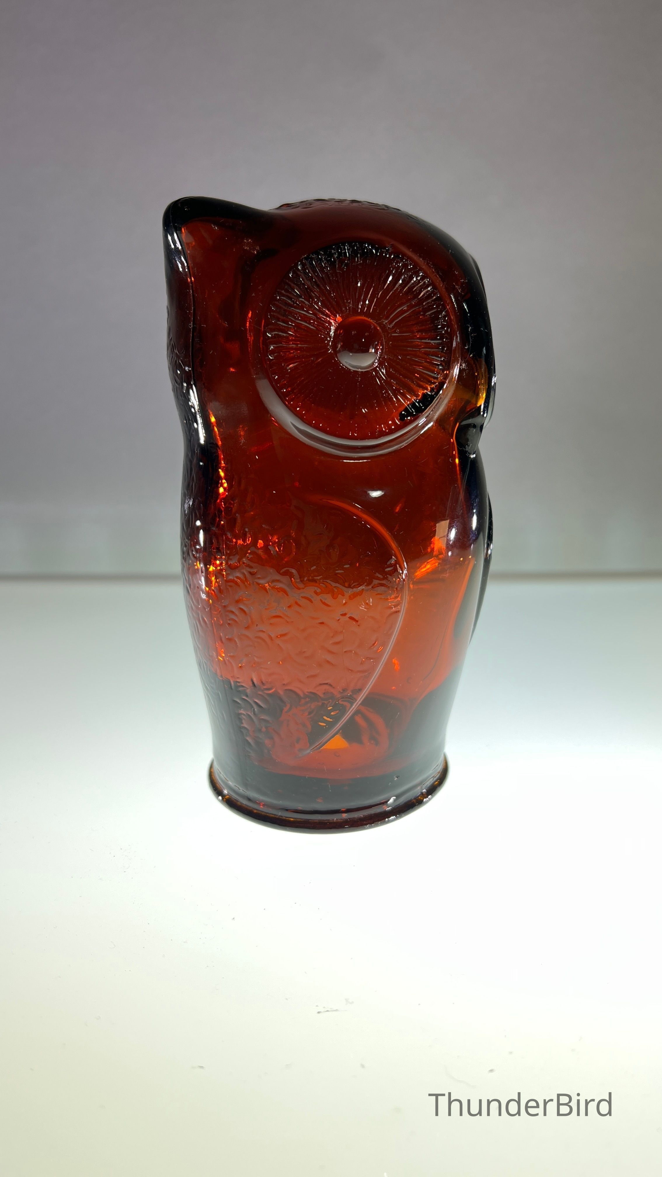 A vintage amber glass owl-shaped money box produced by Cascade Glass, England, during the 1960s–70s. This pressed glass piece features a stylised owl form with textured wings and large radiating eyes. Originally manufactured as a novelty money bank, these are now sought after as retro decorative objects. This version is unlabelled but matches labelled examples in form and colour, confirmed by comparative references.