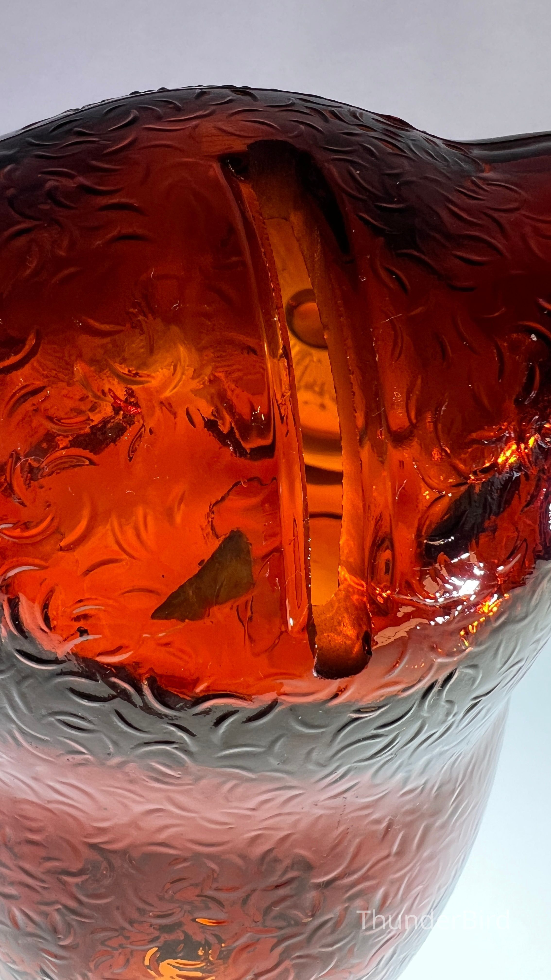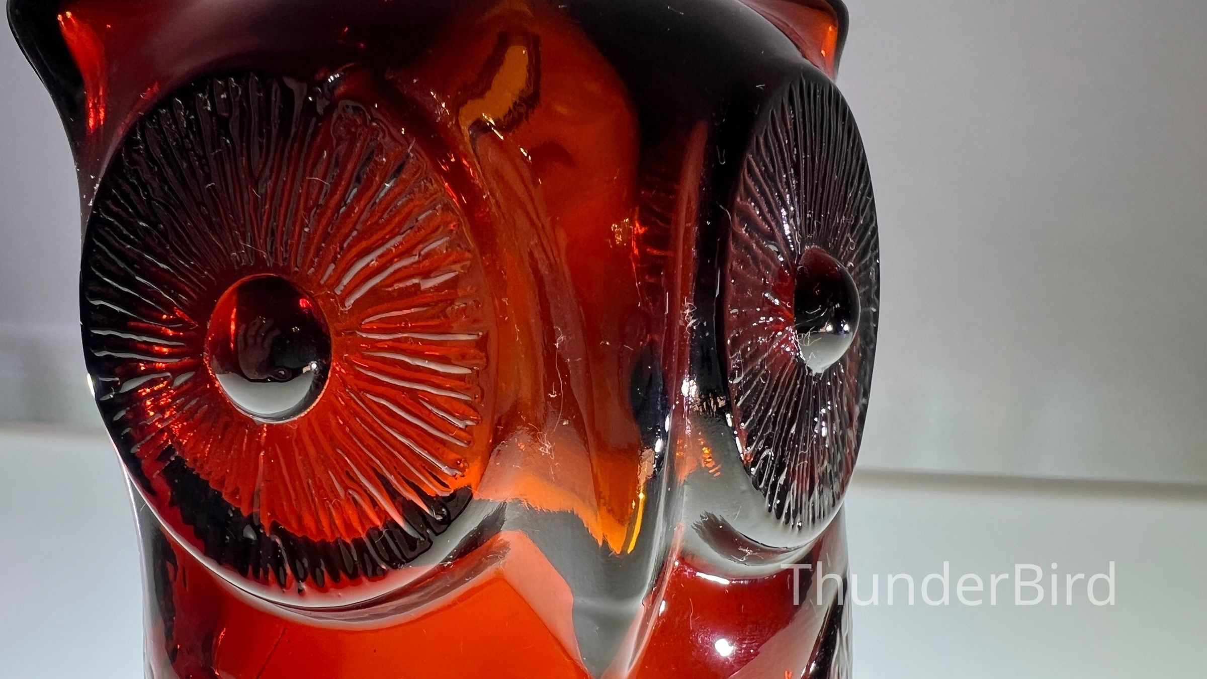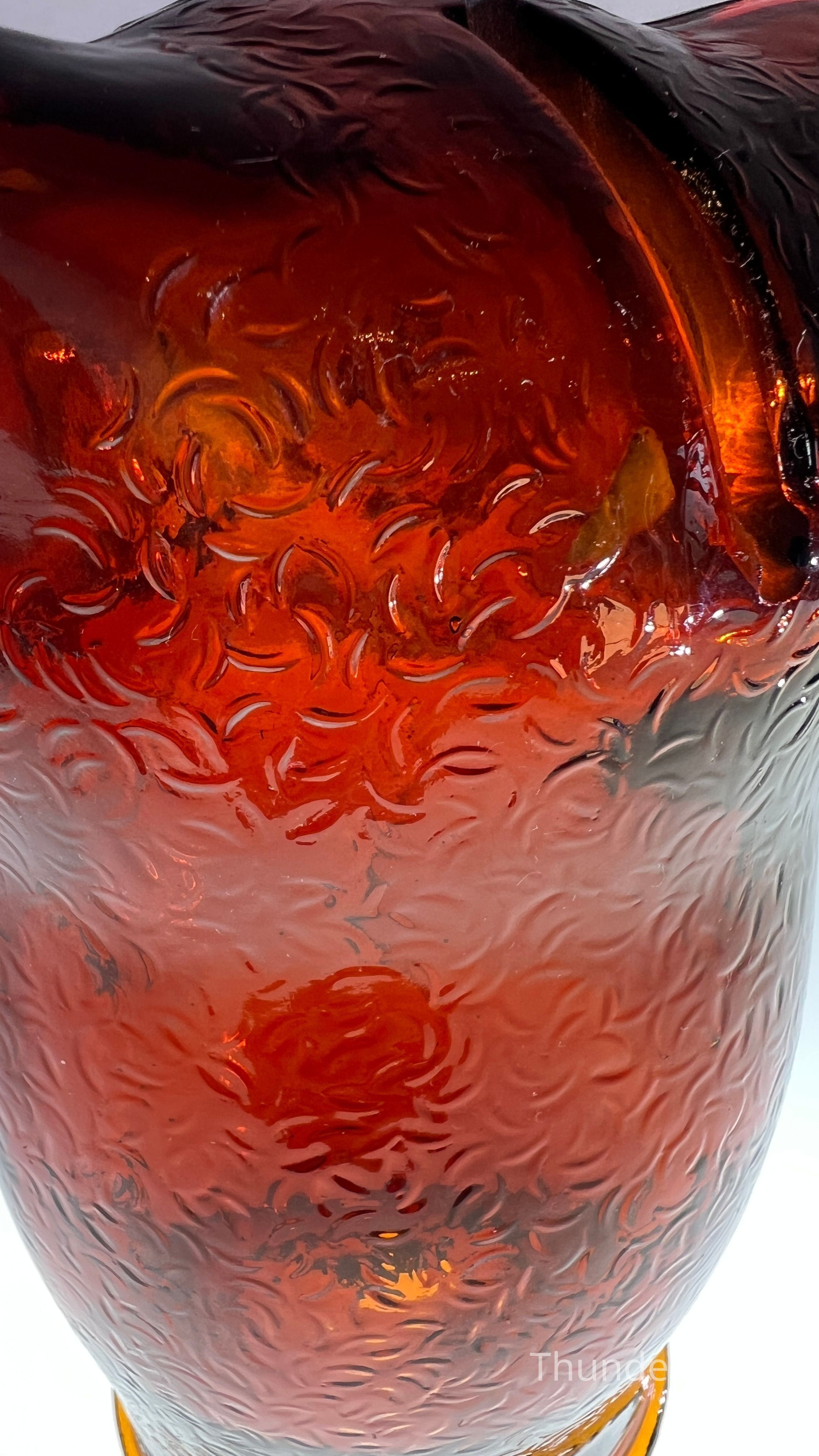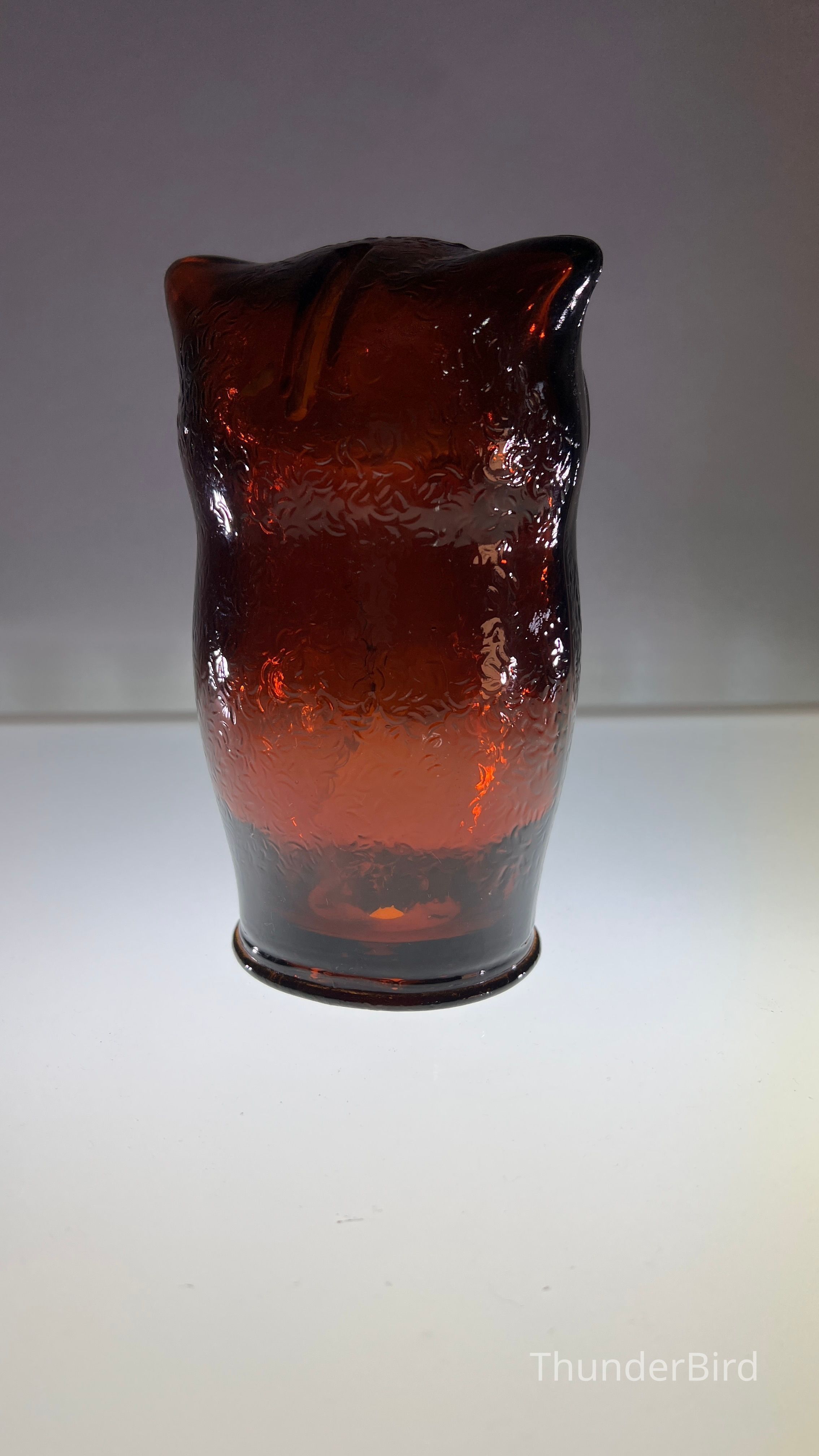 A vintage amber glass owl-shaped money box produced by Cascade Glass, England, during the 1960s–70s. This pressed glass piece features a stylised owl form with textured wings and large radiating eyes. Originally manufactured as a novelty money bank, these are now sought after as retro decorative objects. This version is unlabelled but matches labelled examples in form and colour, confirmed by comparative references.