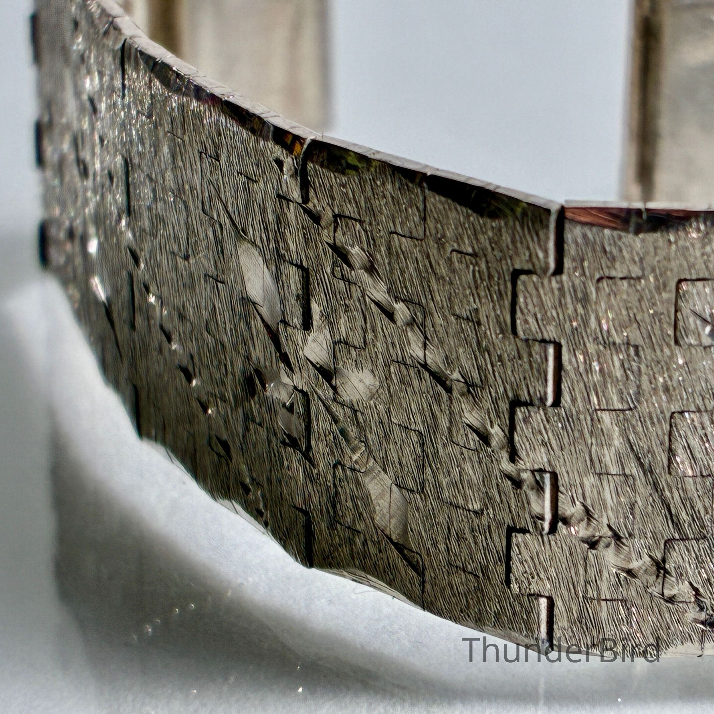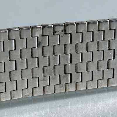 The bracelet features a woven articulated link structure, with textured surface decoration in a repeating geometric motif. It is substantial in weight and constructed for durability and comfort, closing with a box clasp and safety latch for secure wear.