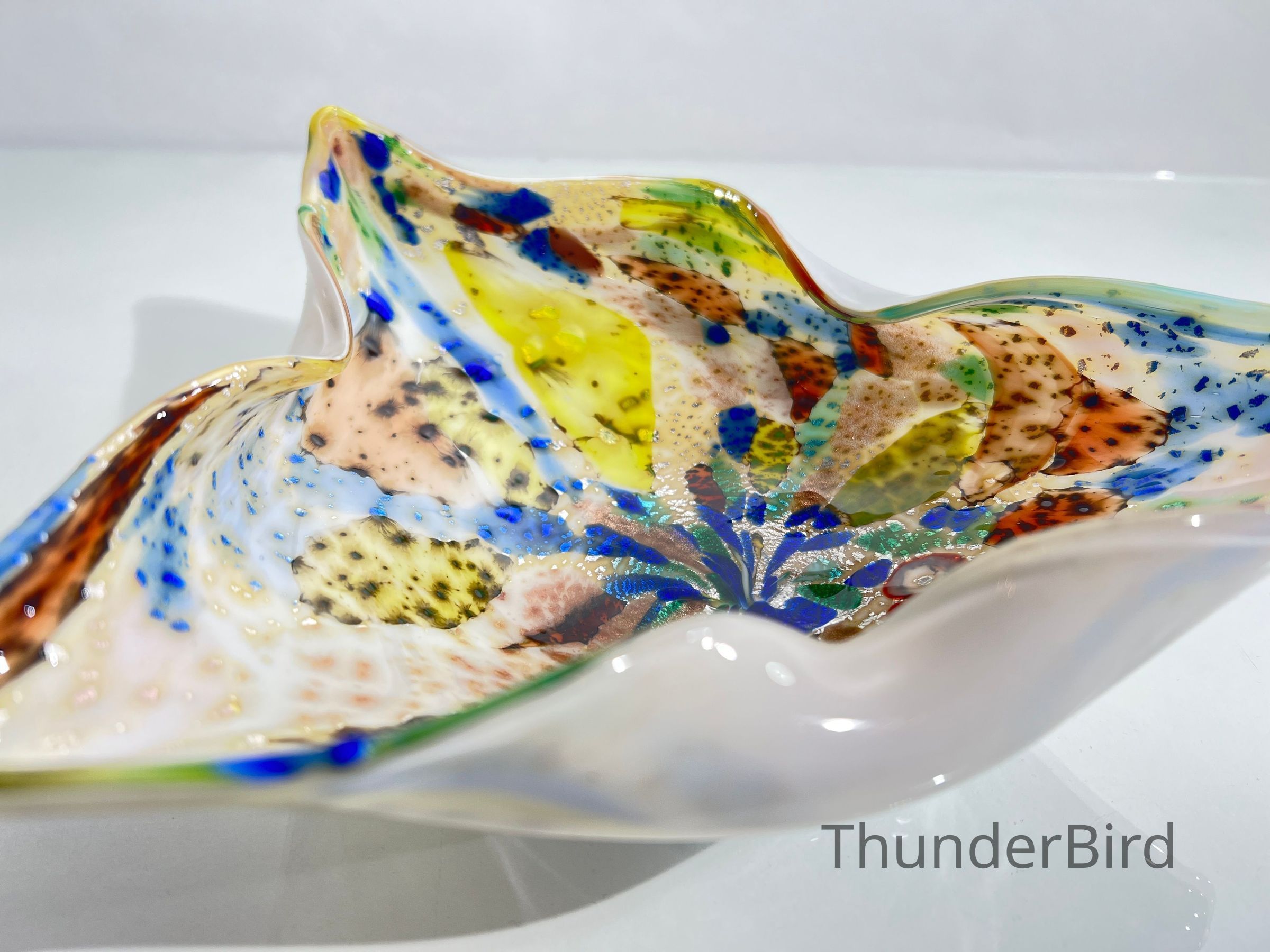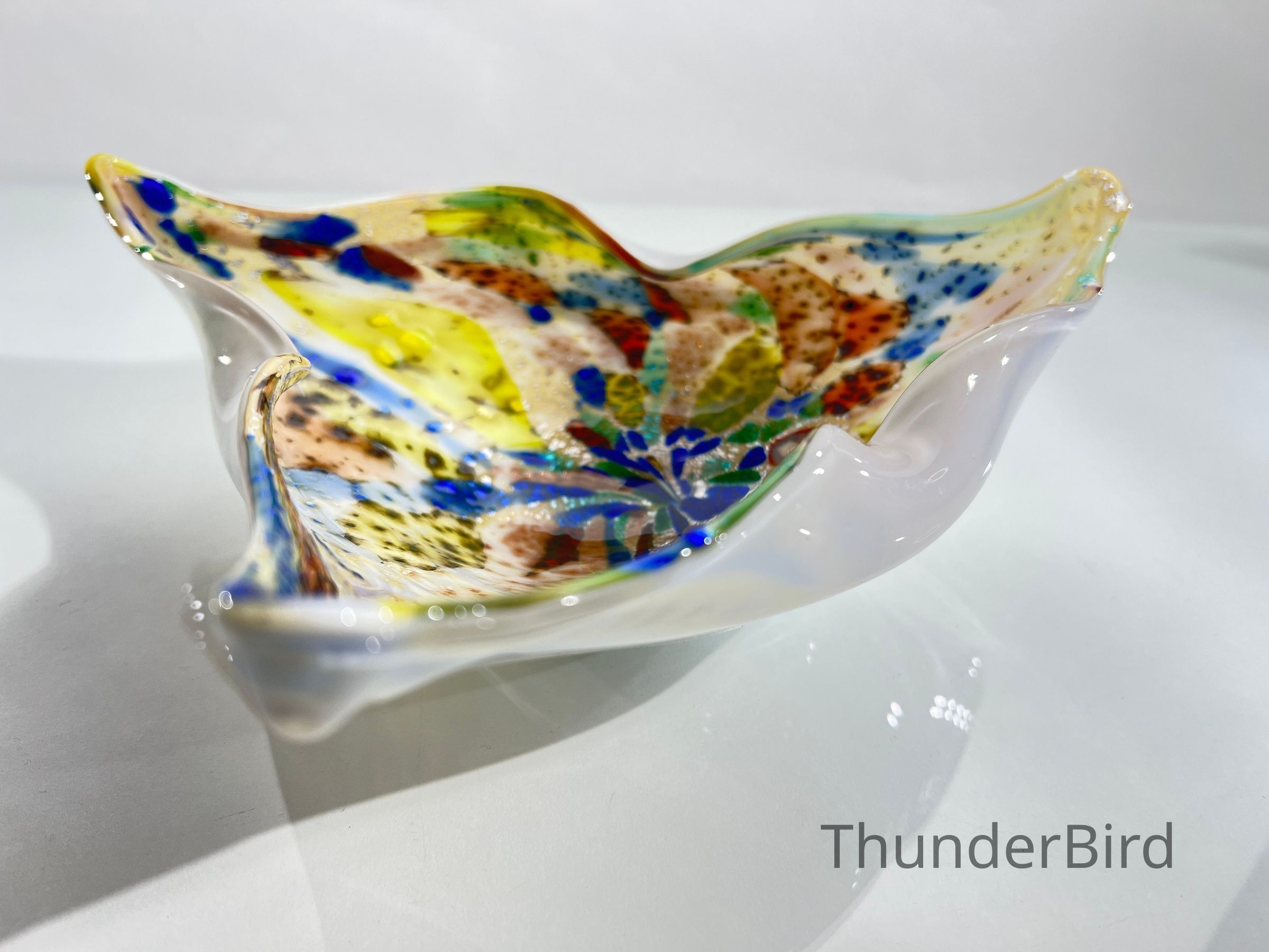 A hand-blown Murano art glass dish with the interior richly decorated with colourful millefiori inclusions and aventurine (metallic) flecks, set against an opaline ground. Retains part of its original red and silver Murano foil label to base, identifying it as genuine Venetian glass. Mid to late 20th century in origin.