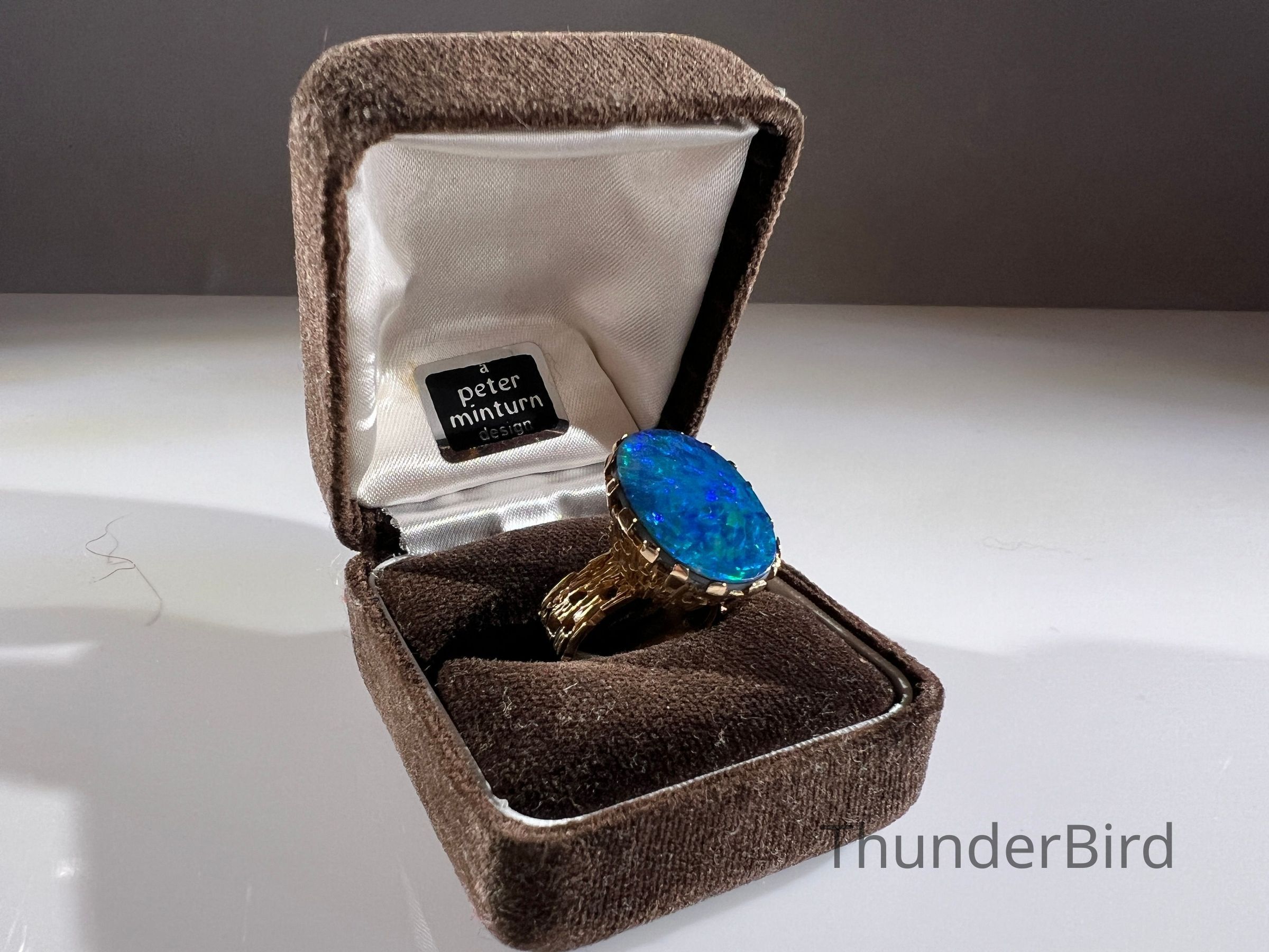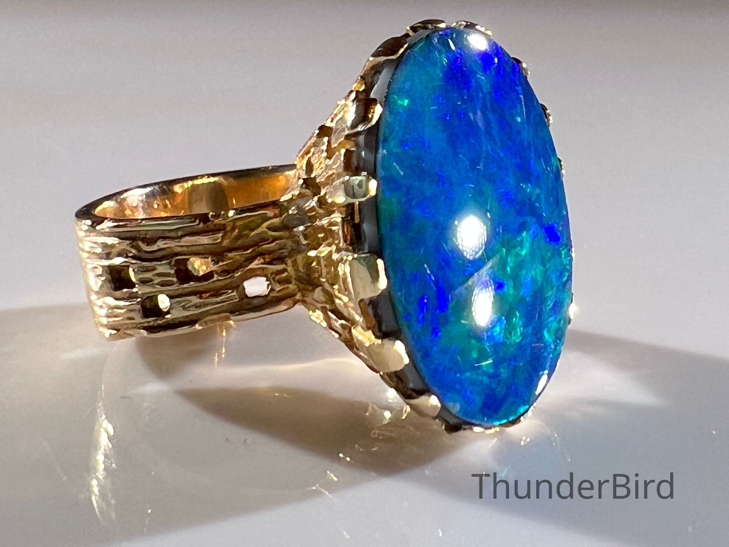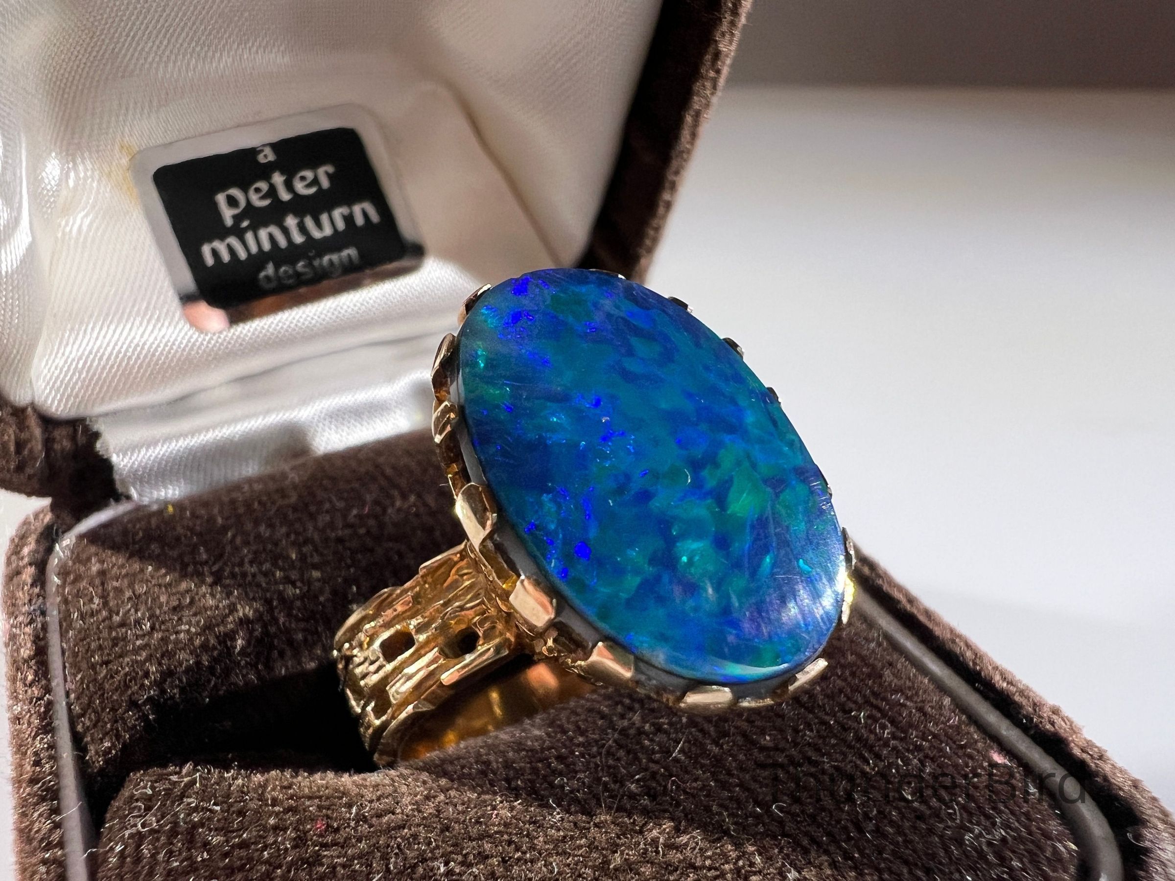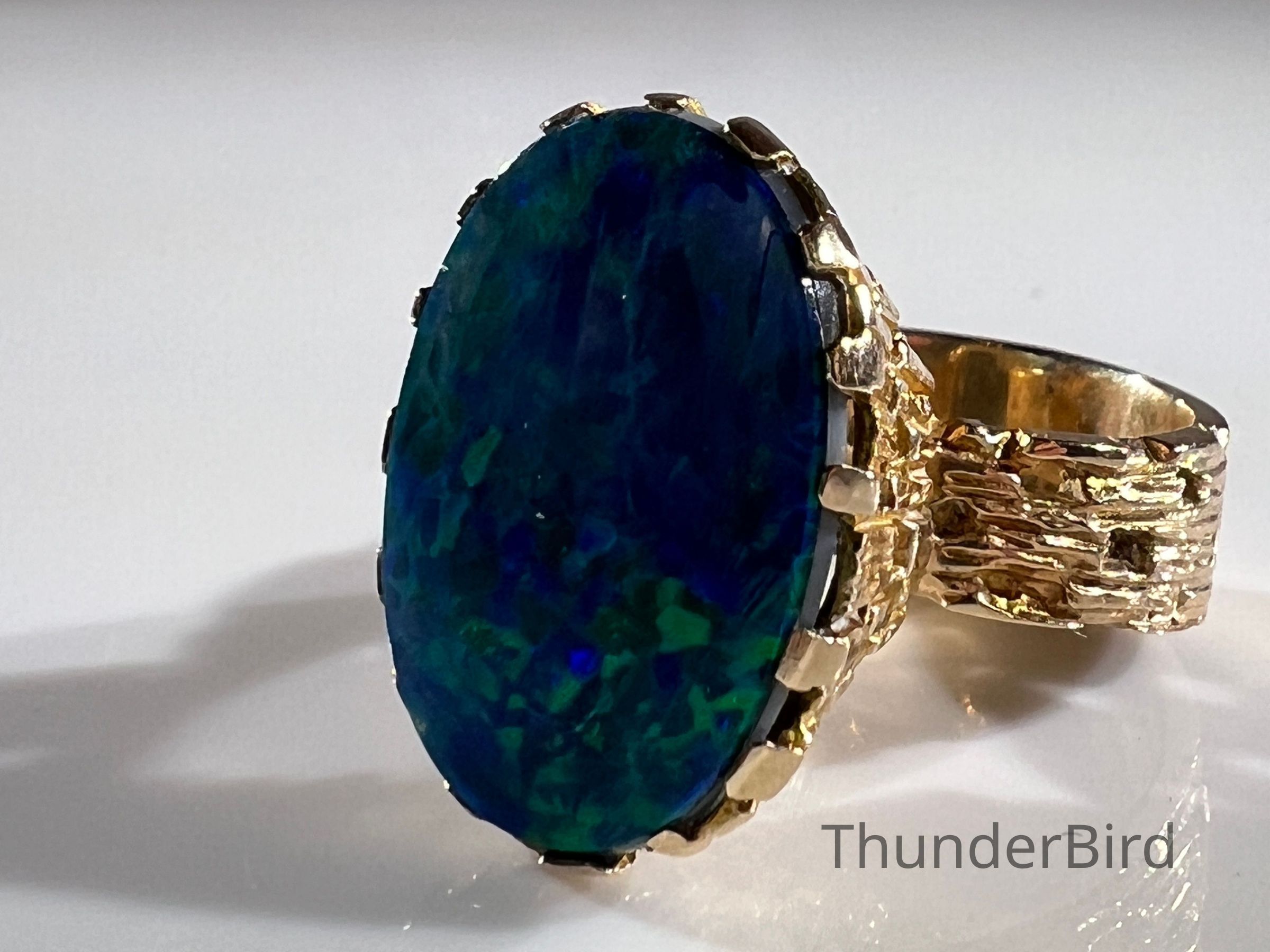 A striking midcentury 9ct gold cocktail ring, designed by Peter Minturn, a master jeweller from New Zealand. The "Sculpture" design features an organic, textured gold setting inspired by Brutalist aesthetics, holding a large opal doublet with vivid blue and green play-of-colour. The openwork gold structure showcases Minturn’s signature craftsmanship, making this a rare collector’s item.