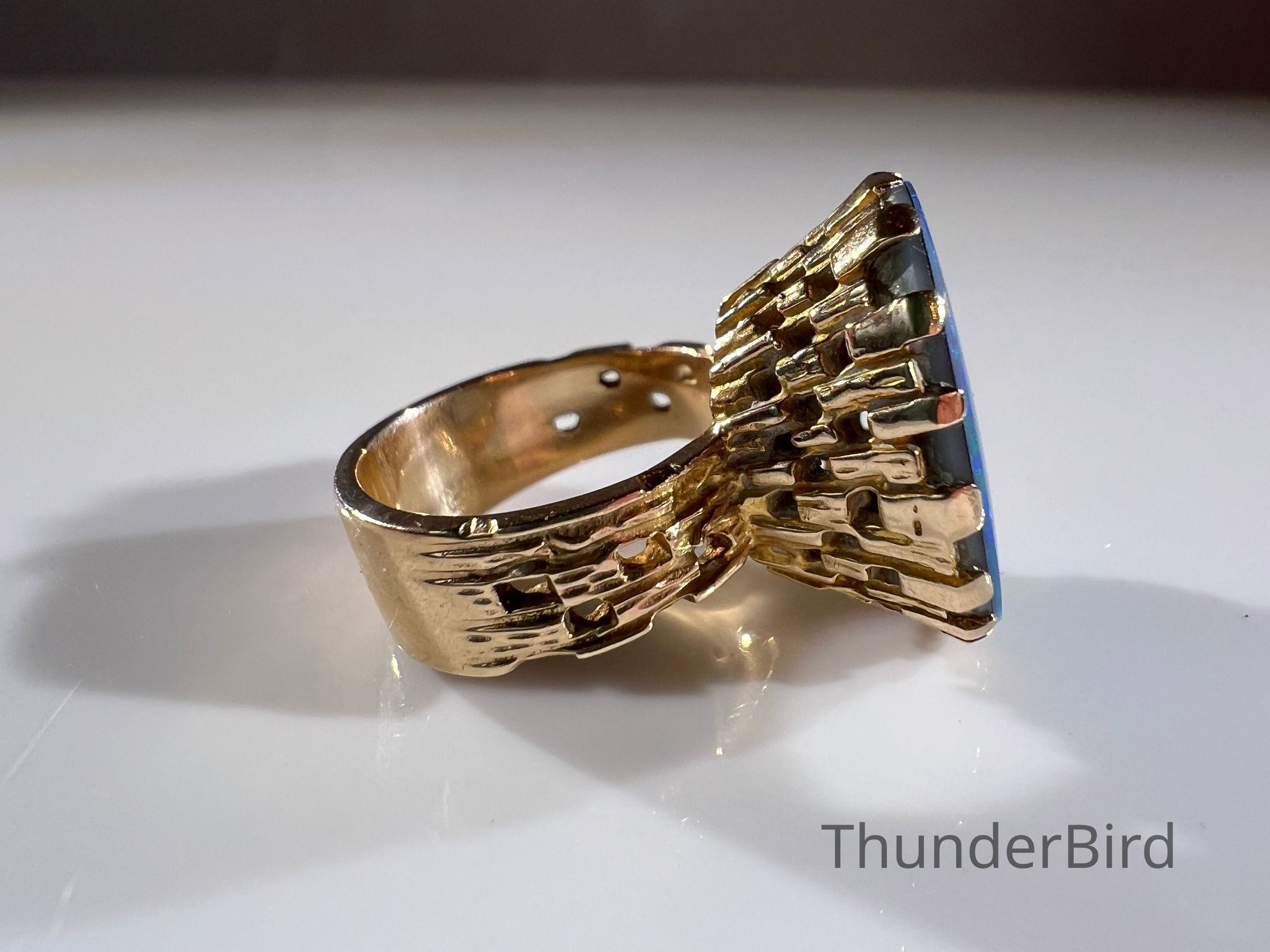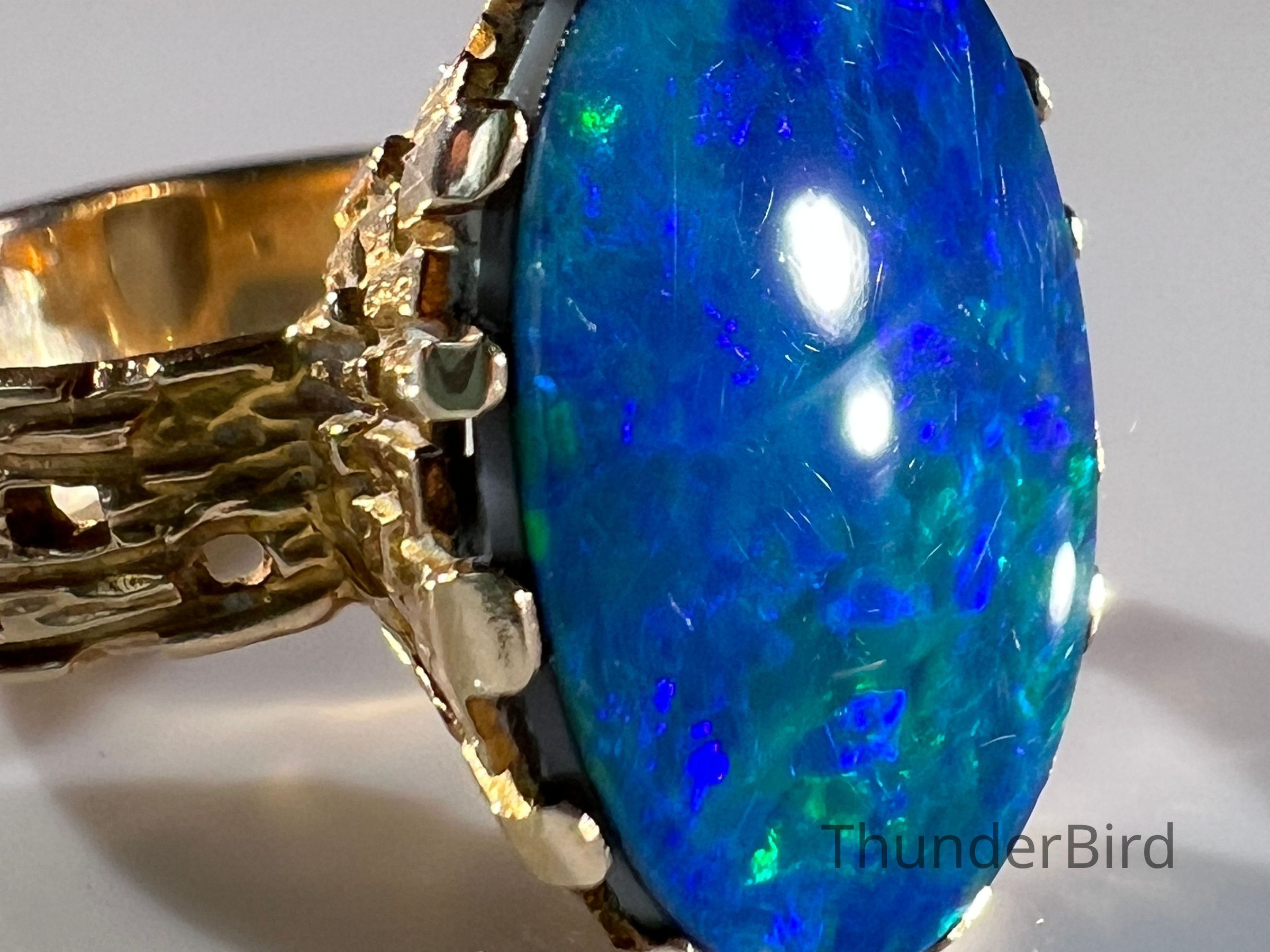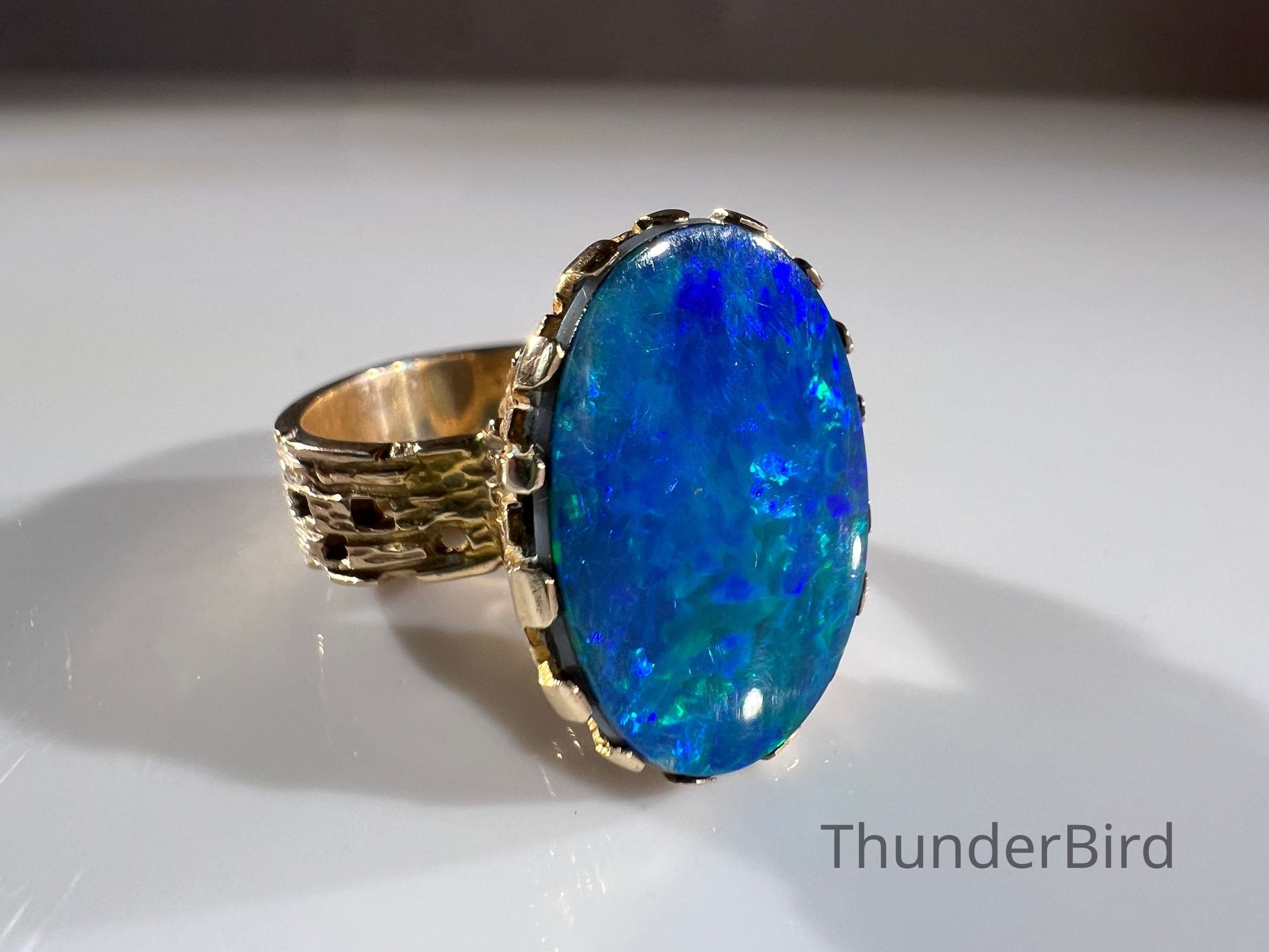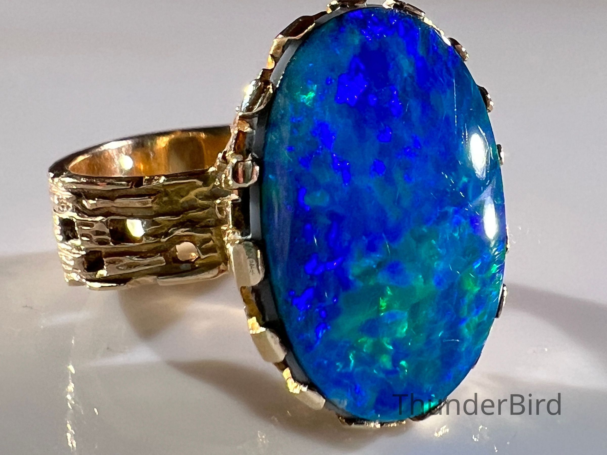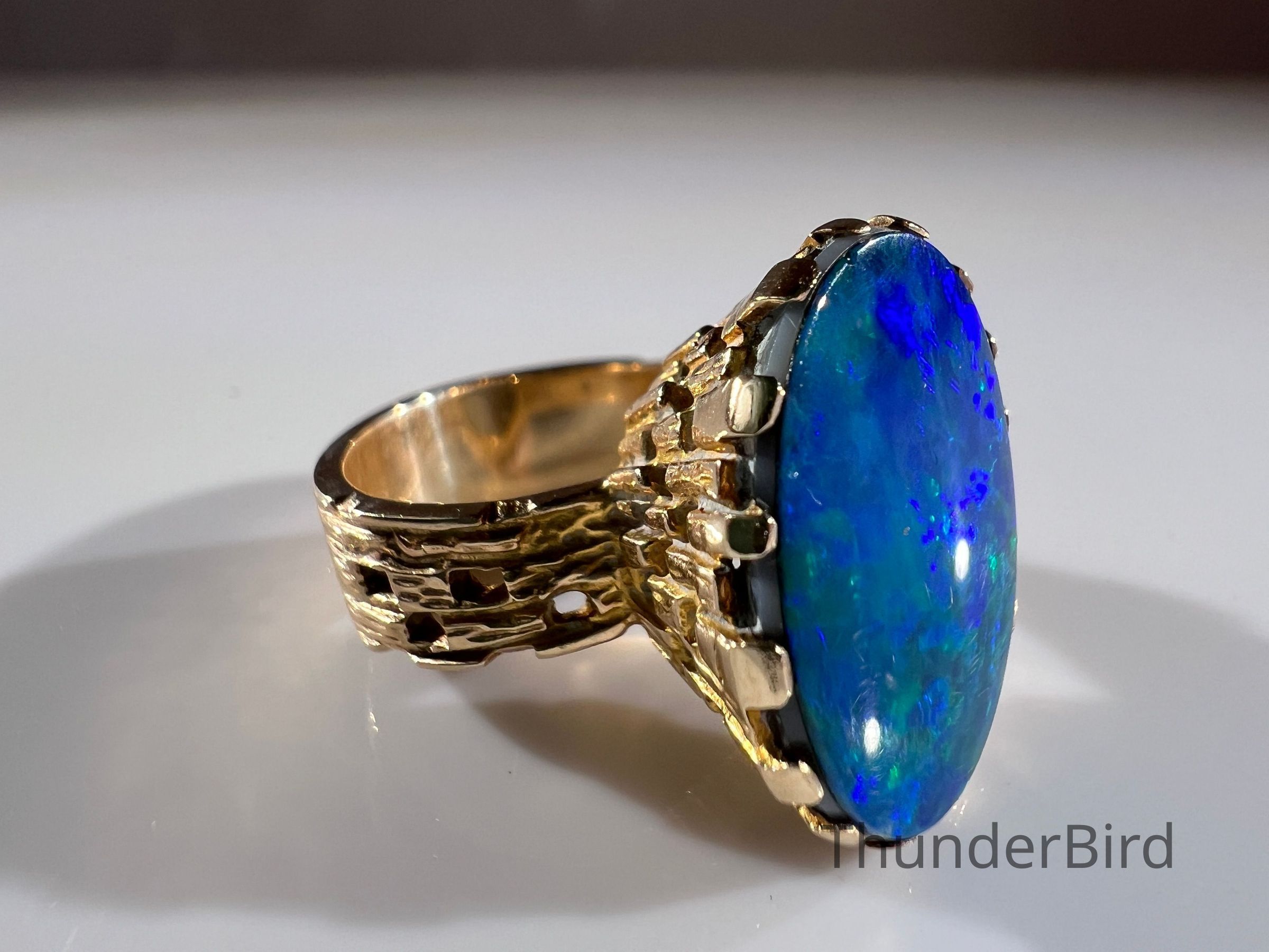 A striking midcentury 9ct gold cocktail ring, designed by Peter Minturn, a master jeweller from New Zealand. The "Sculpture" design features an organic, textured gold setting inspired by Brutalist aesthetics, holding a large opal doublet with vivid blue and green play-of-colour. The openwork gold structure showcases Minturn’s signature craftsmanship, making this a rare collector’s item.