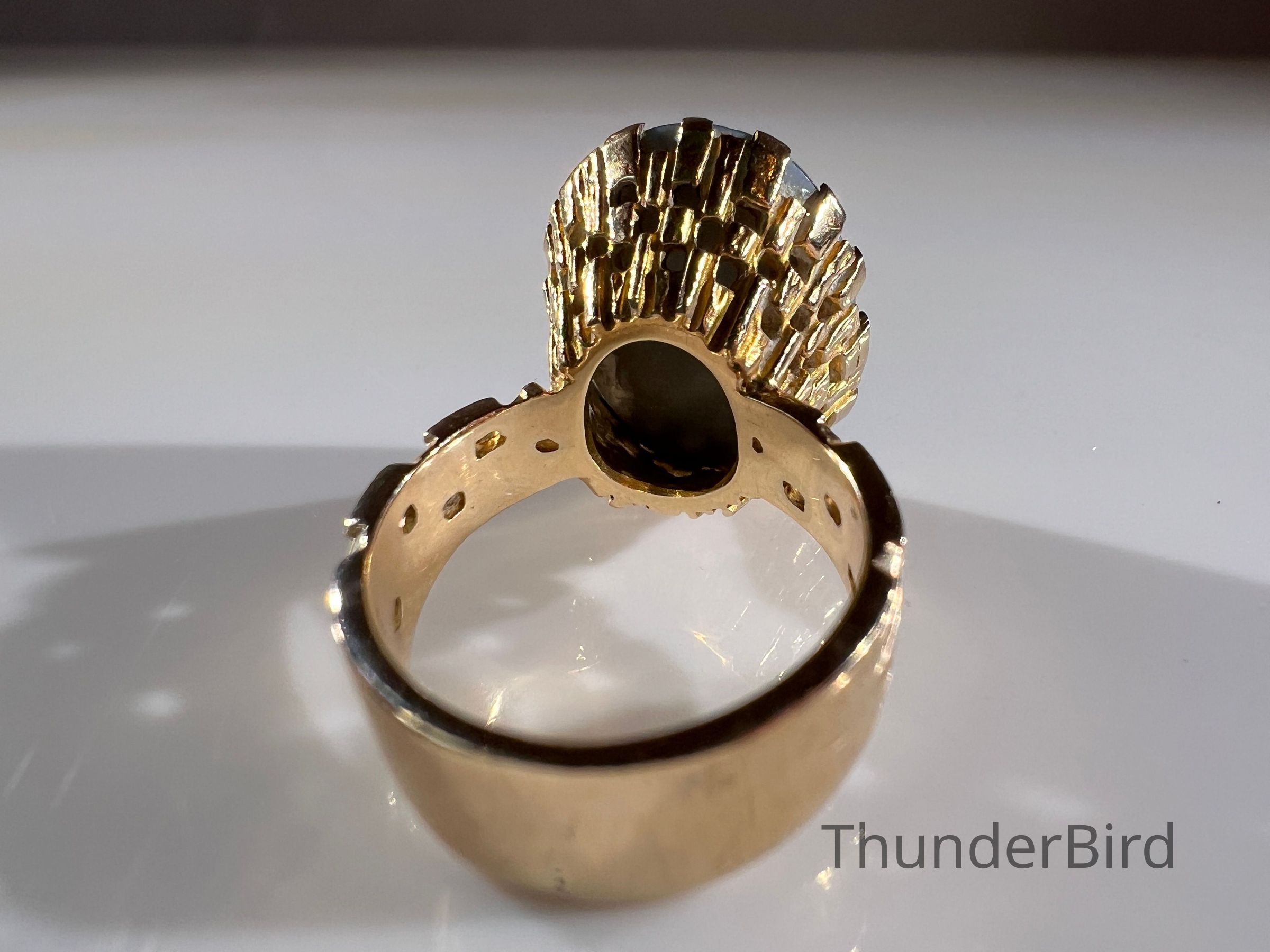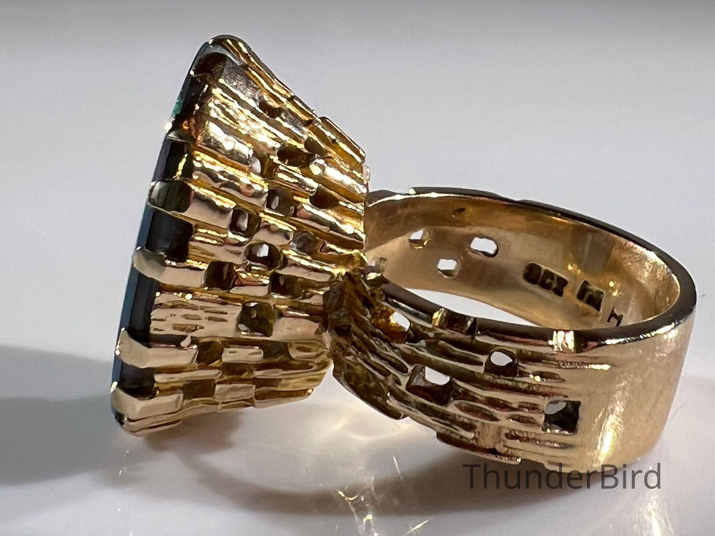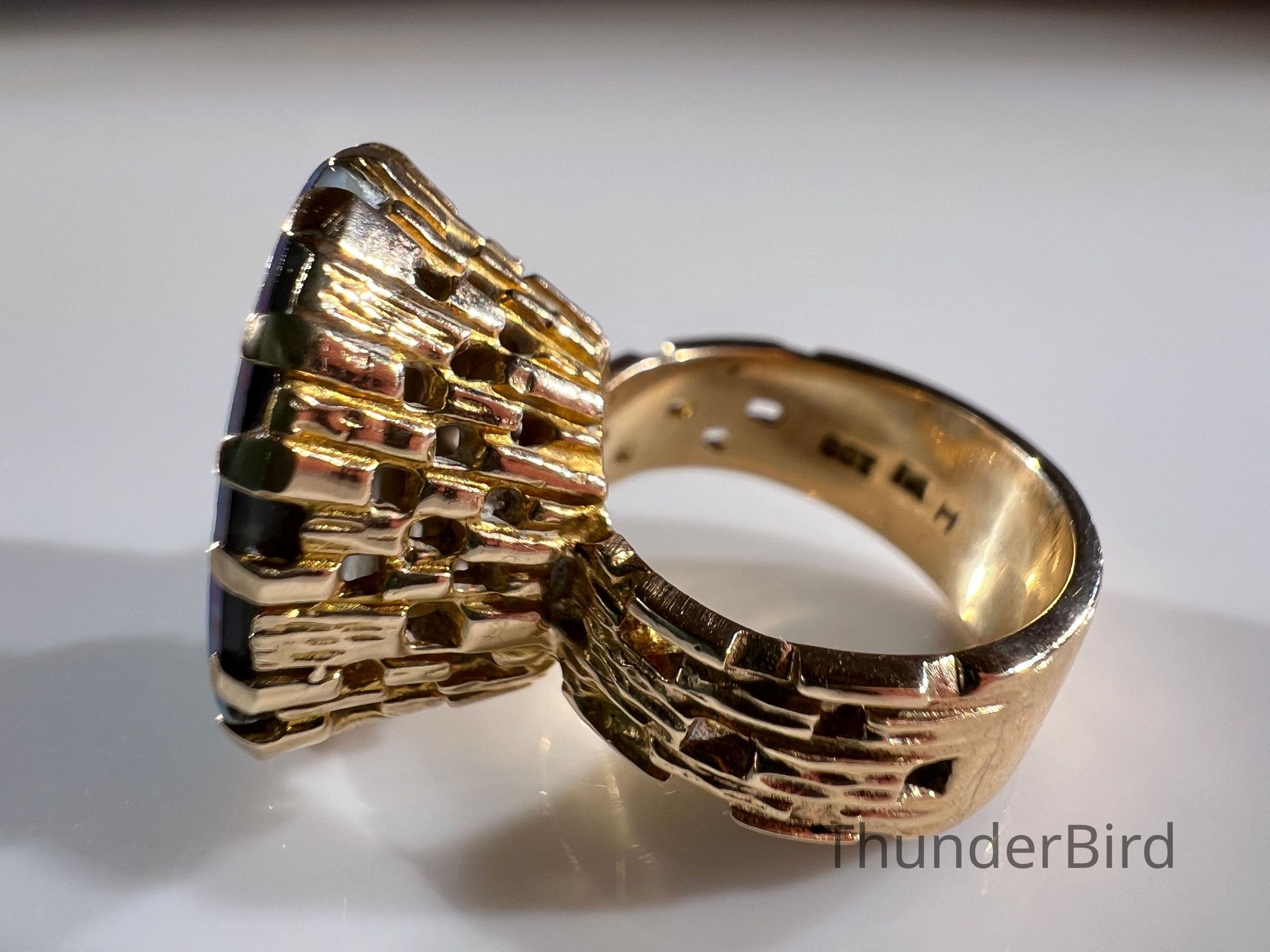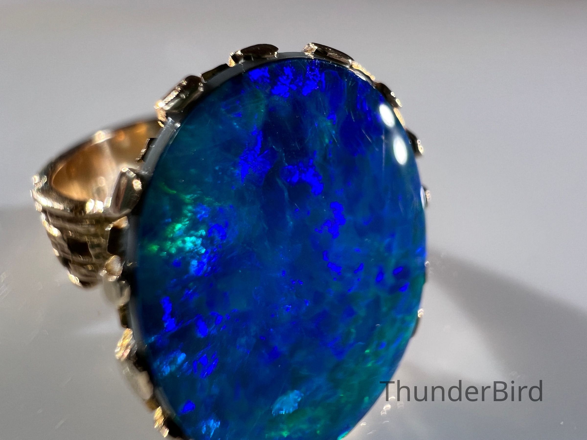 A striking midcentury 9ct gold cocktail ring, designed by Peter Minturn, a master jeweller from New Zealand. The "Sculpture" design features an organic, textured gold setting inspired by Brutalist aesthetics, holding a large opal doublet with vivid blue and green play-of-colour. The openwork gold structure showcases Minturn’s signature craftsmanship, making this a rare collector’s item.