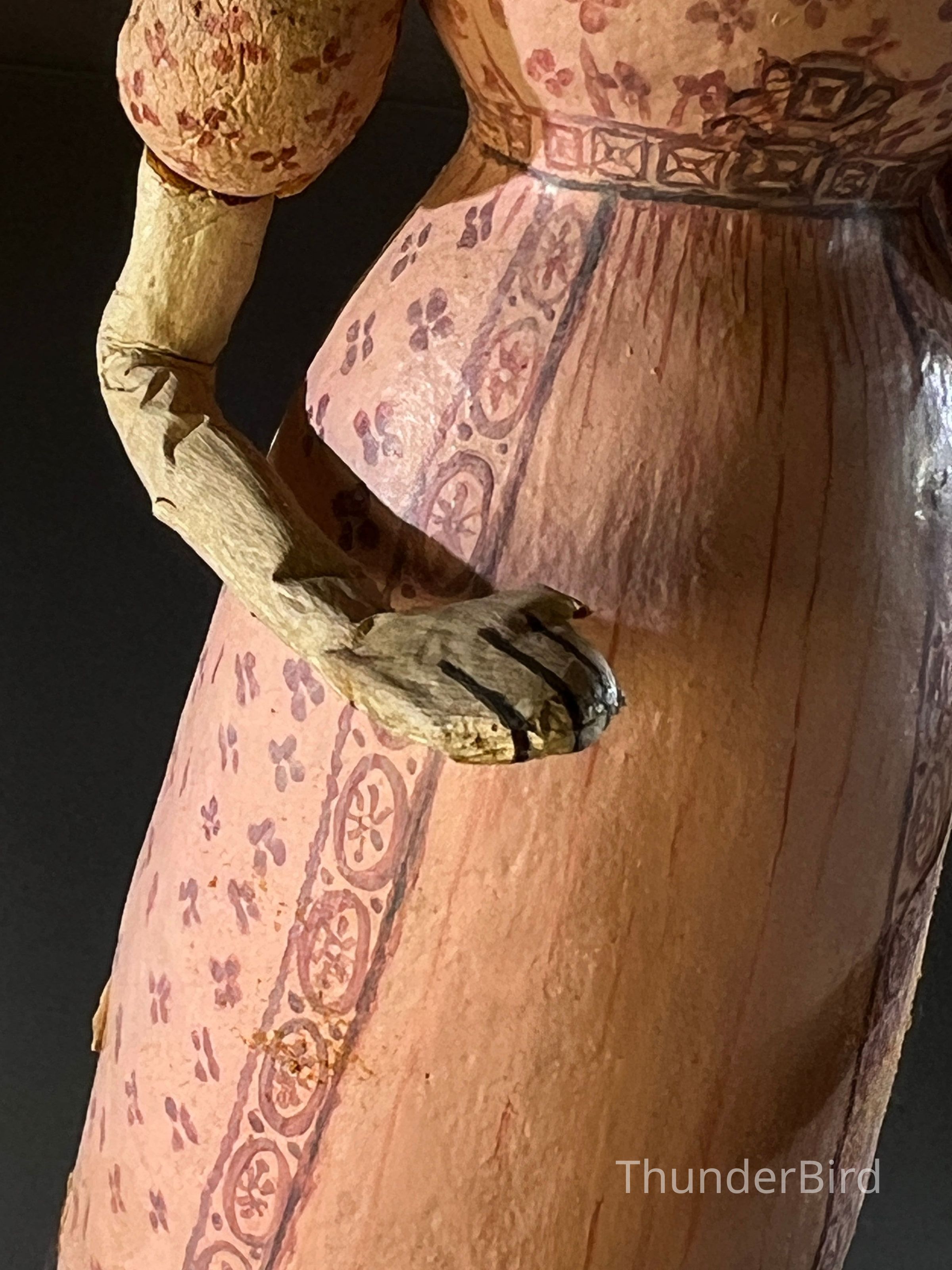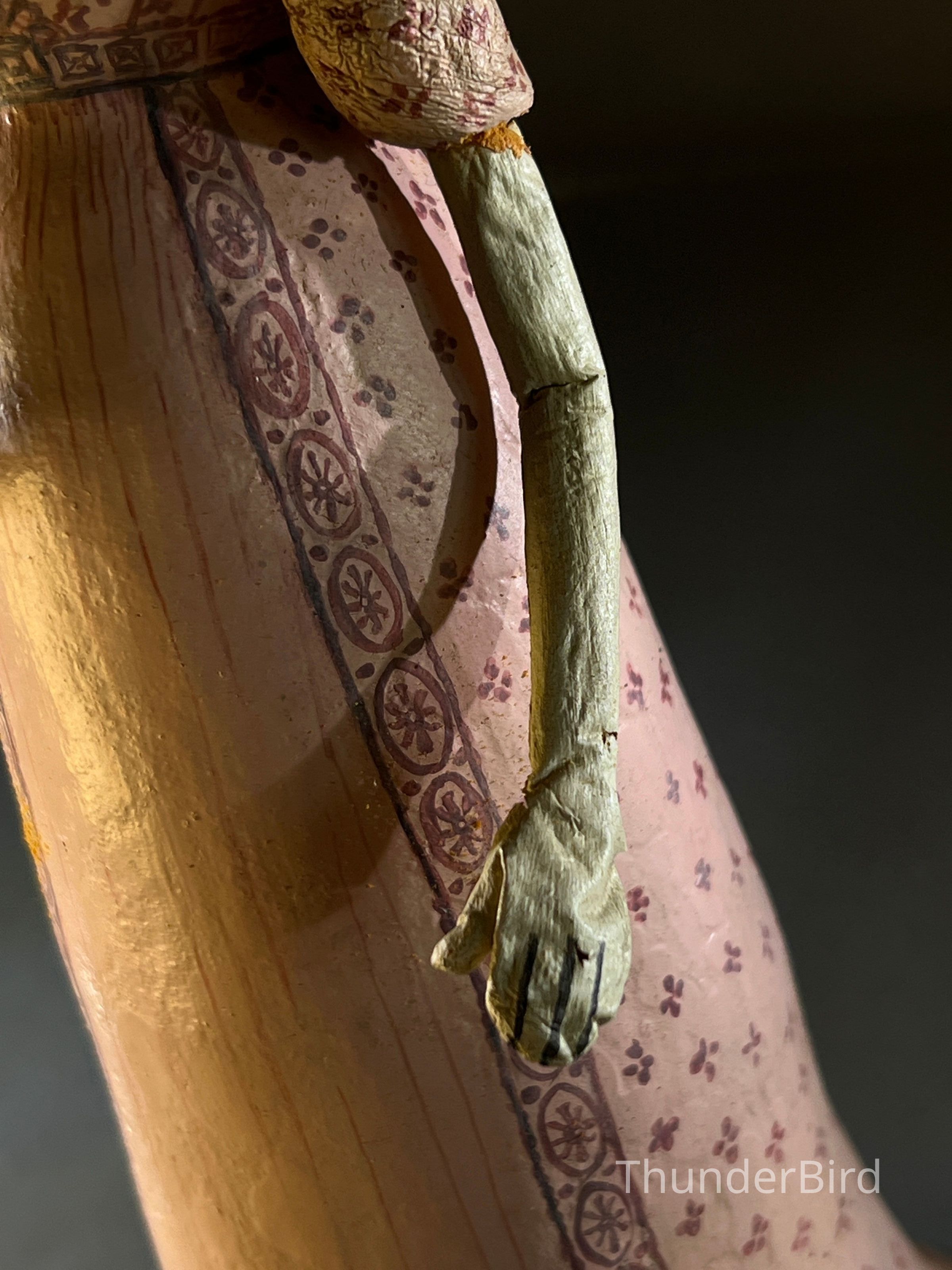 As expected from vintage studio-used puppets, this piece exhibits wear including surface cracks, aged varnish, minor flaking to limbs, and small paint loss. Please refer to photographs. Best suited for static display.
