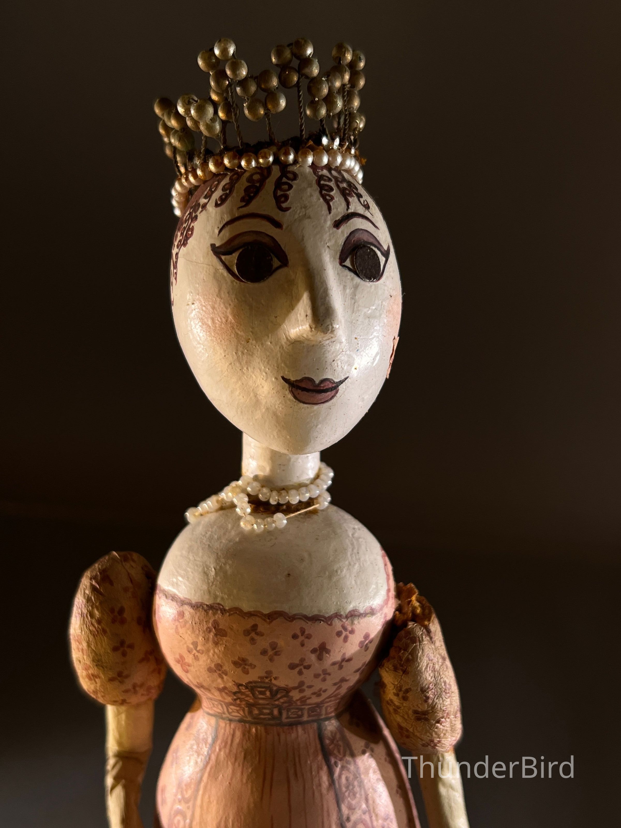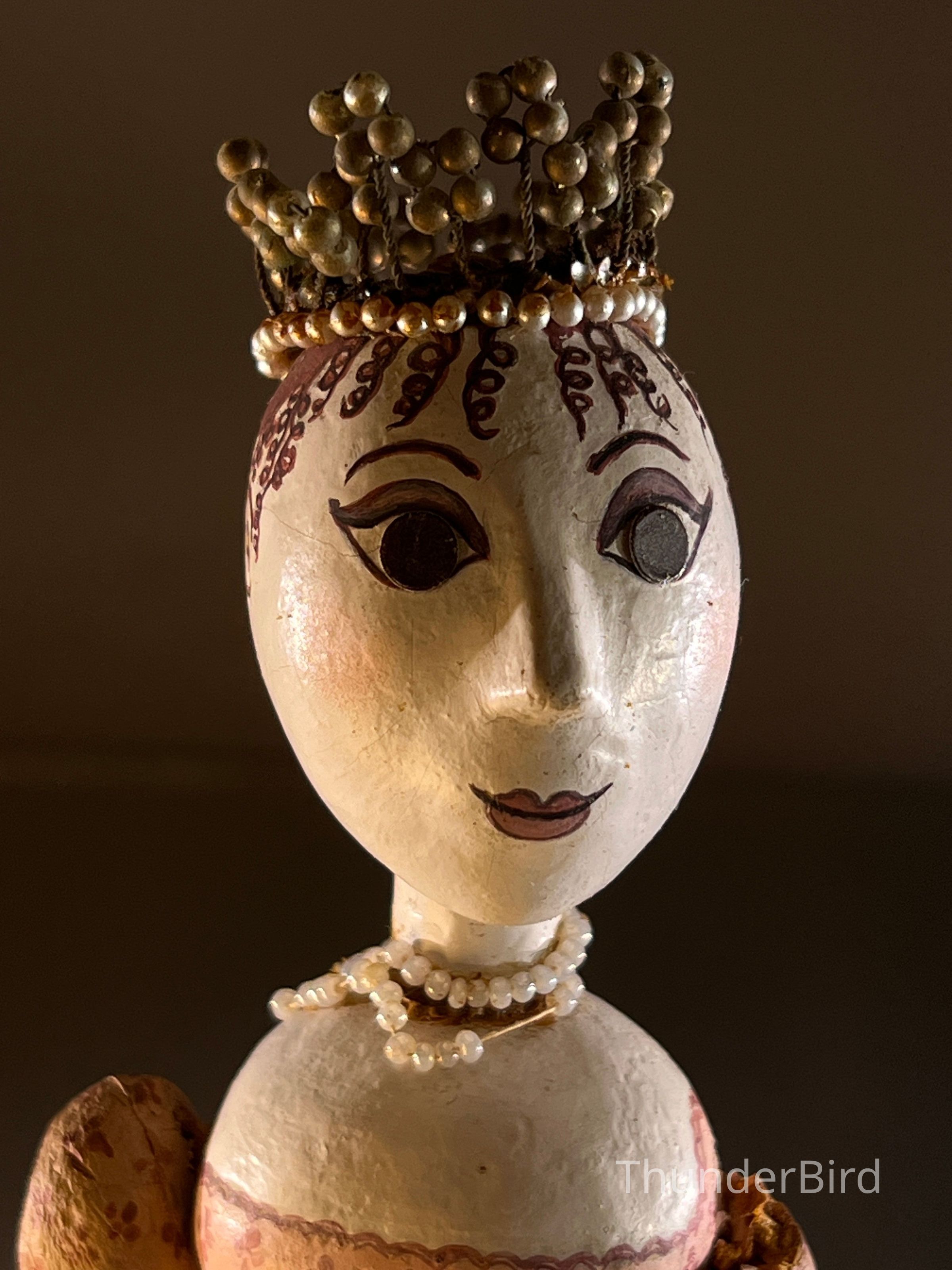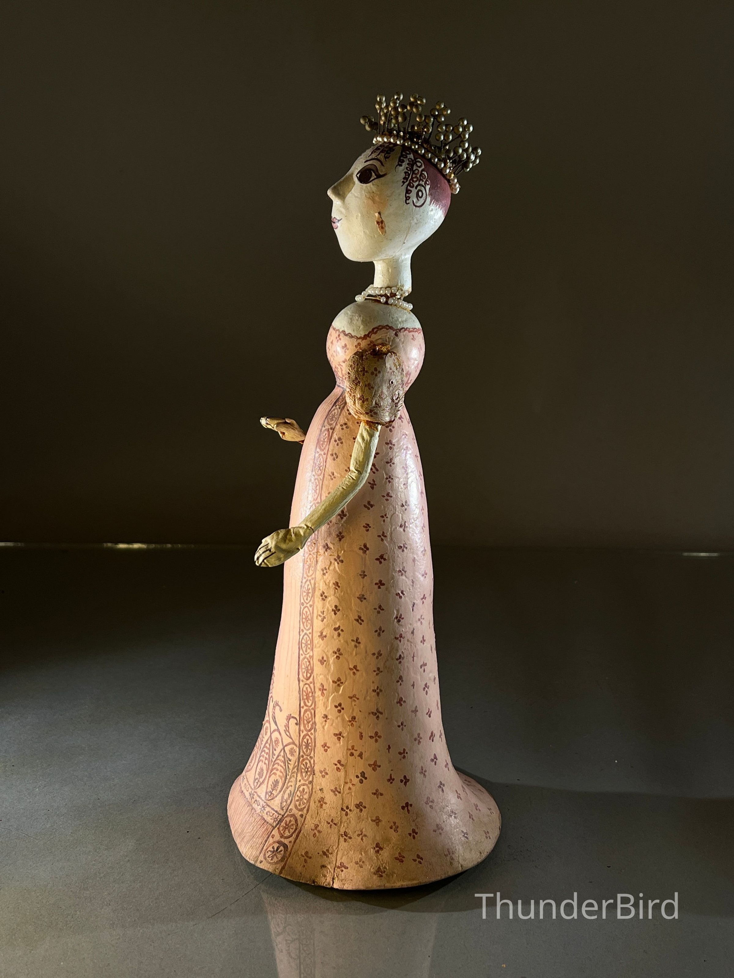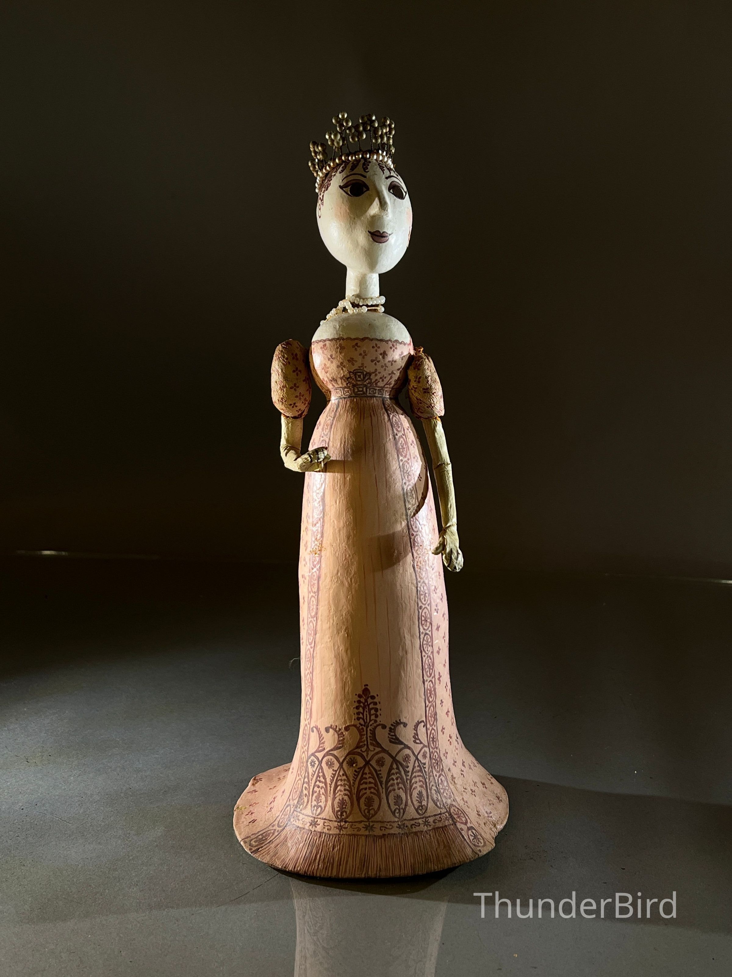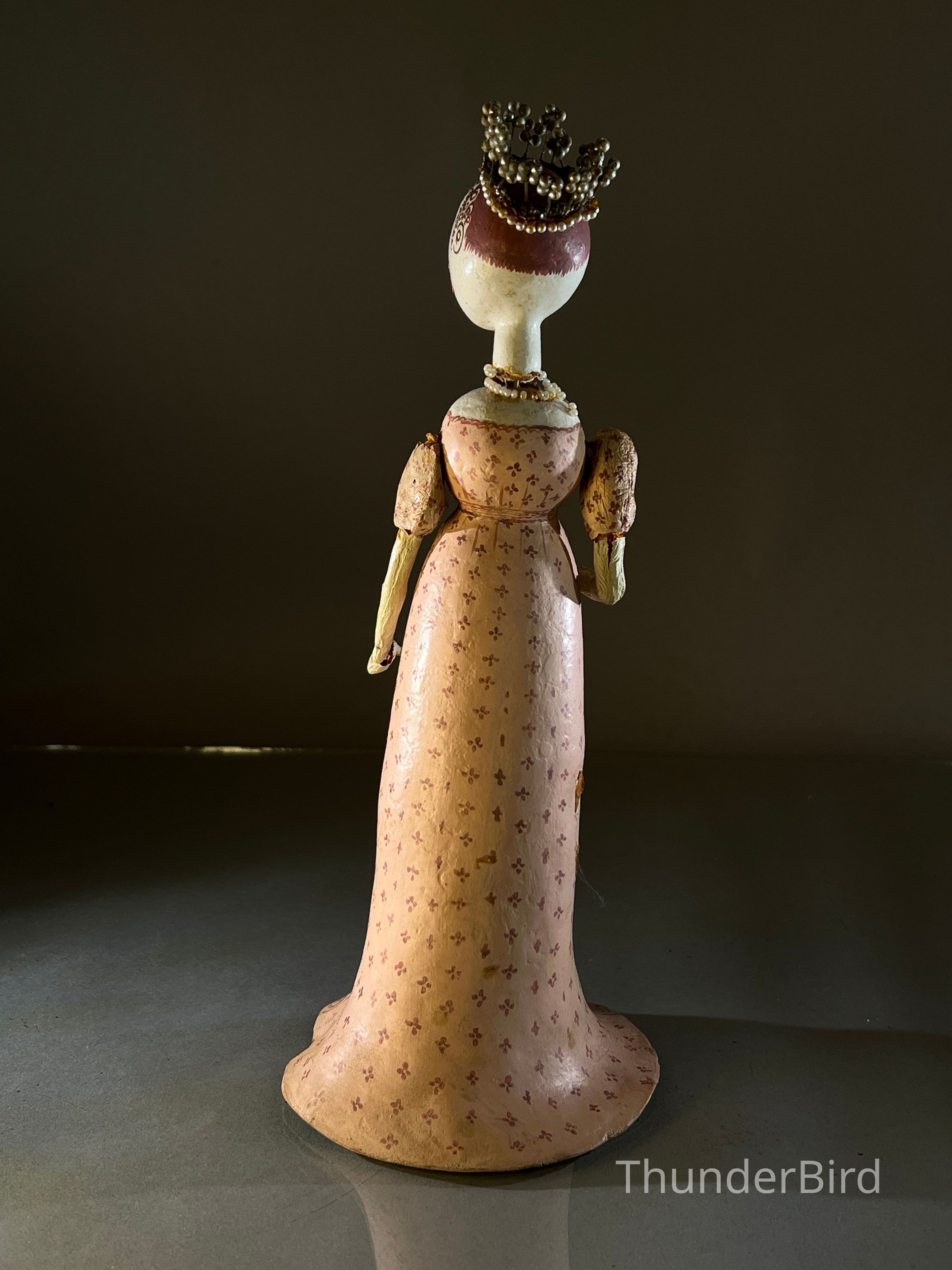 Medium: Mixed media – hand-moulded head, painted surface, printed textile detail, wire and bead crown, string pearls, articulated limbs
