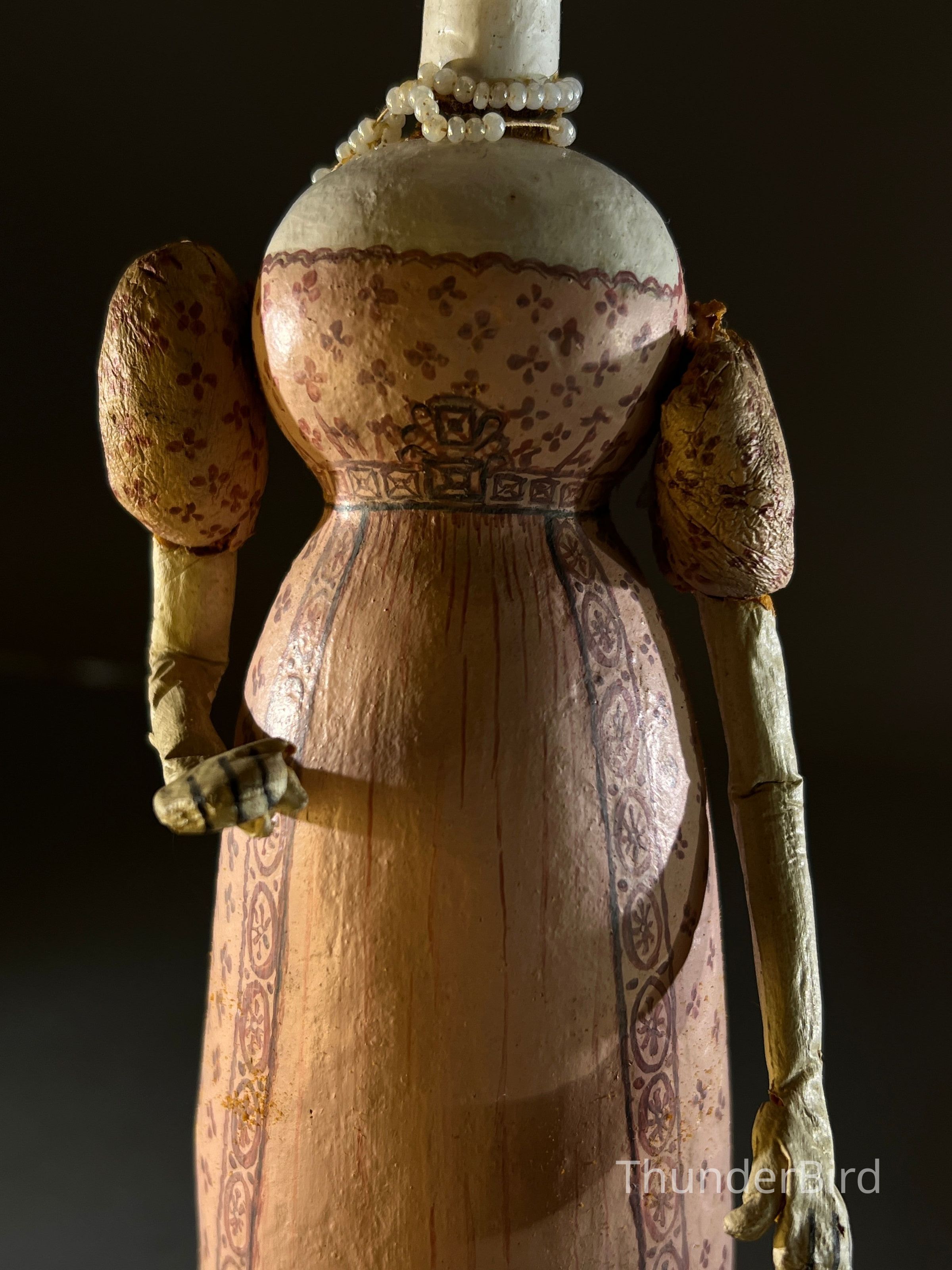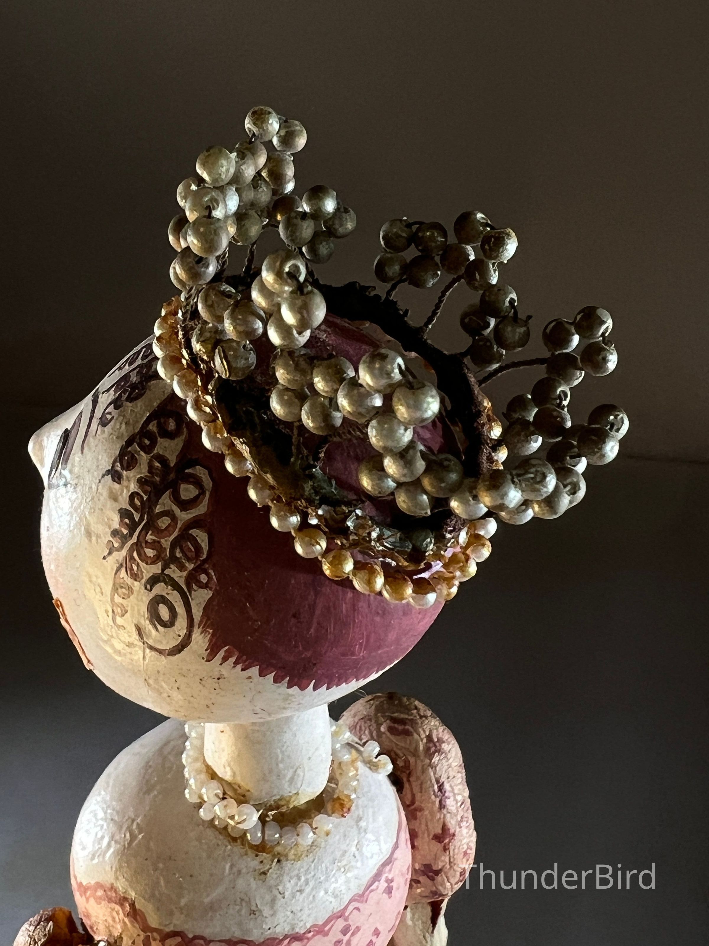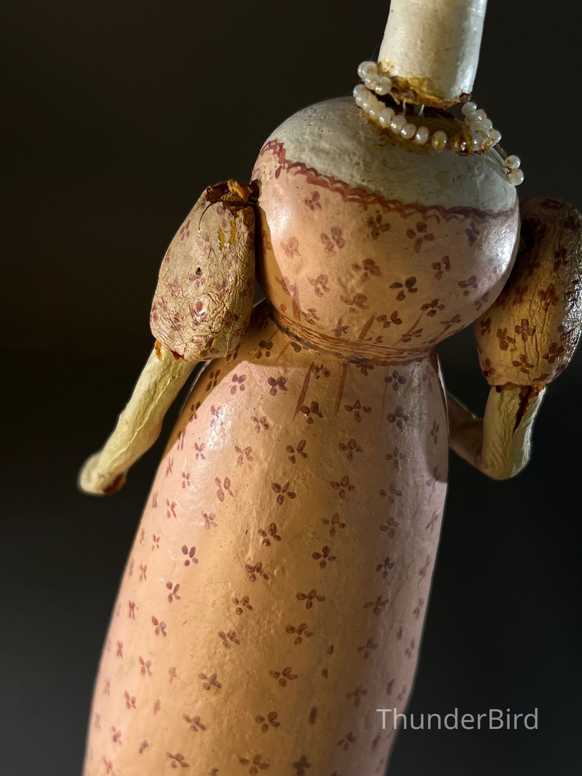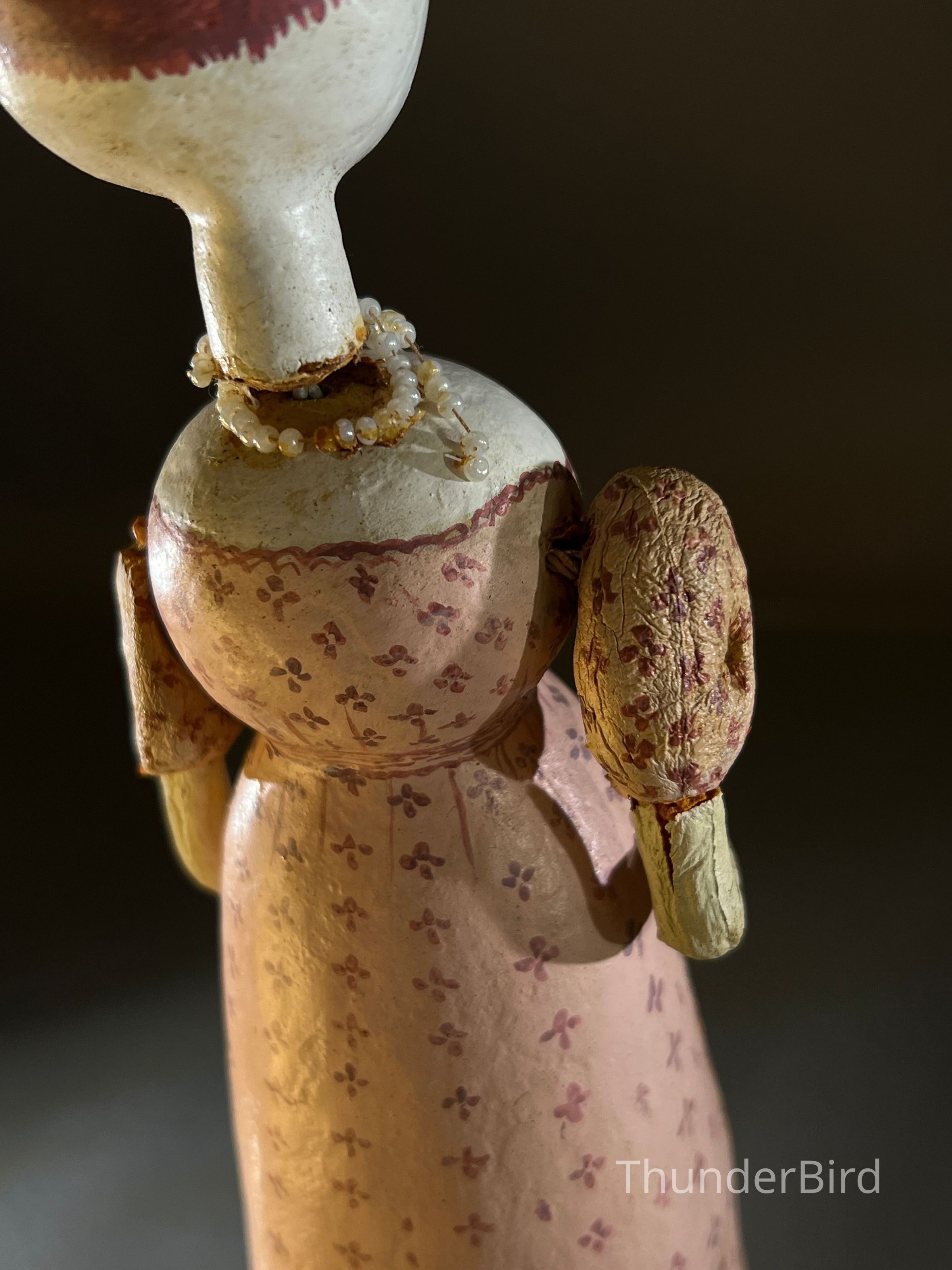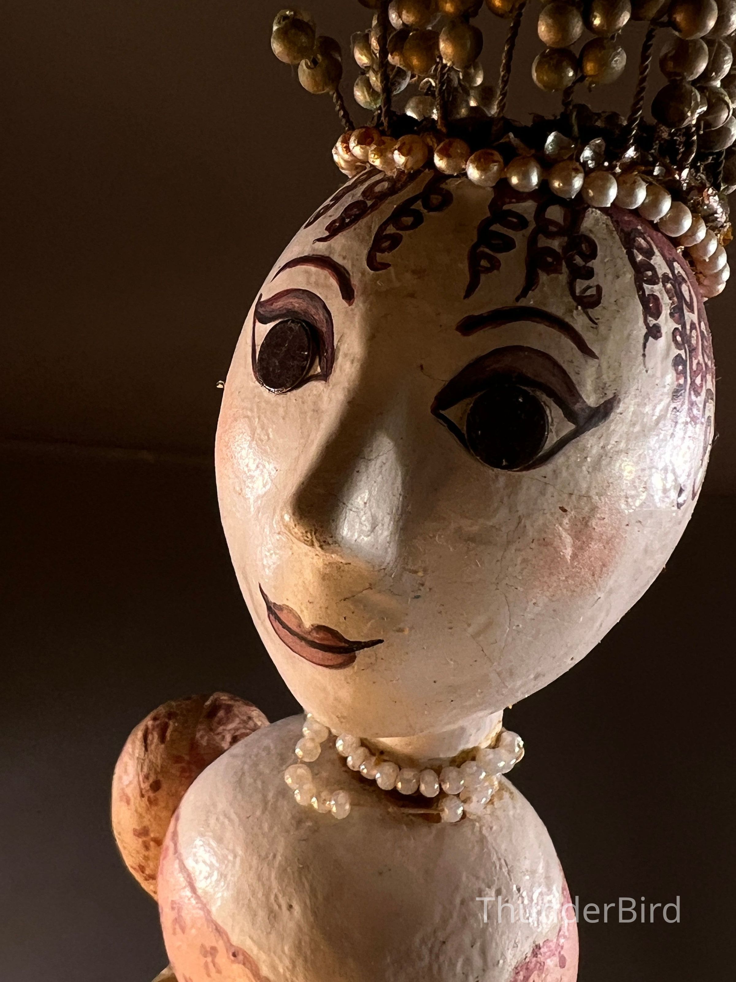 Medium: Mixed media – hand-moulded head, painted surface, printed textile detail, wire and bead crown, string pearls, articulated limbs