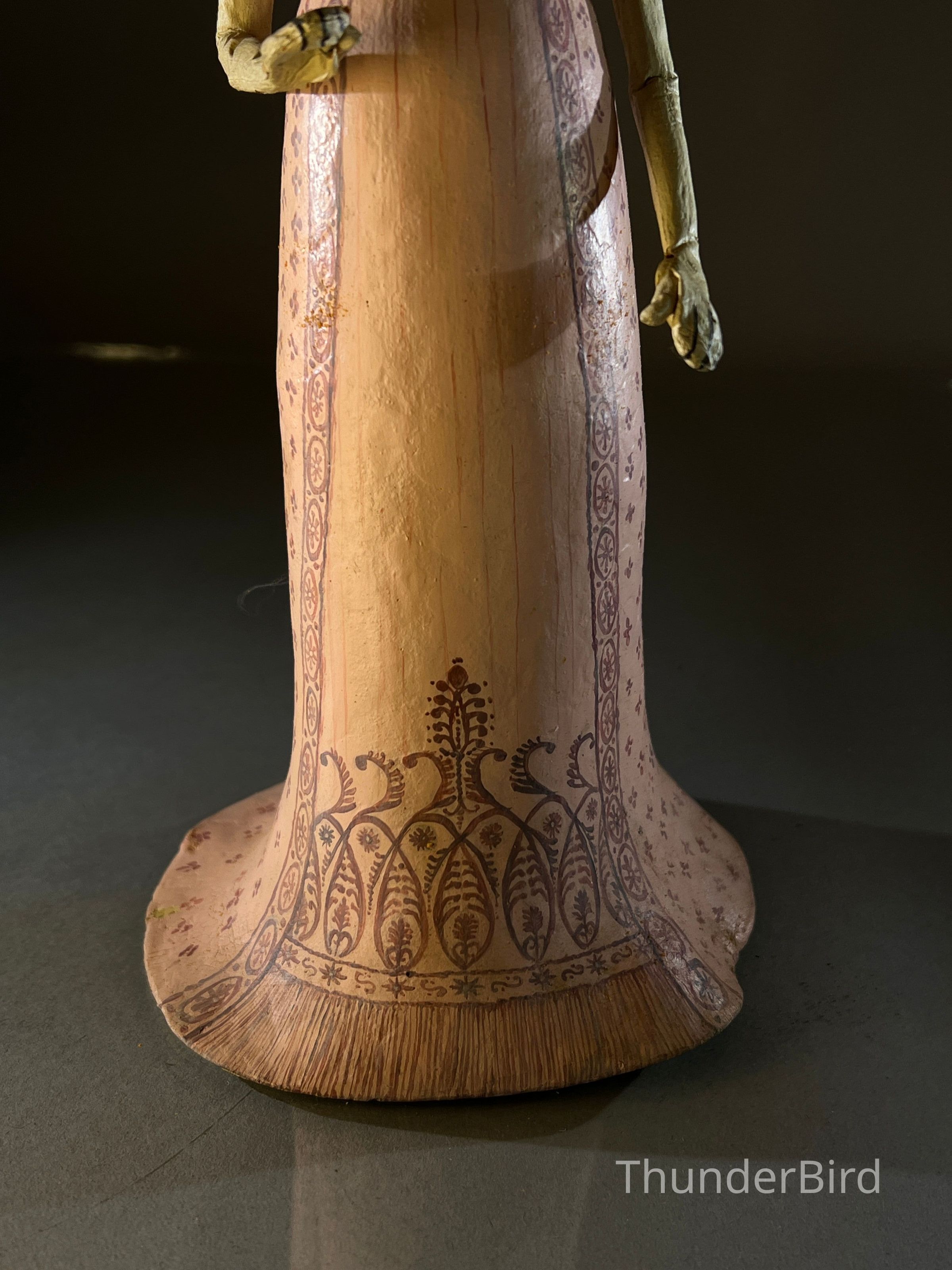 A striking regal character from the stop-motion archive of Alan Platt, this elegant puppet is presented in a high-waisted gown with intricate surface decoration and a stylised crown. Her expressive, hand-painted face features delicately arched brows, softly rouged cheeks, and rose-tinted lips, suggesting noble grace. The arms are wired for articulation, and the hands are sculpted with fine detail. She wears faux pearl strands and a highly textural crown made from coiled wire and metallic beads – likely designed to catch light in stop-frame filming. Her painted dress is patterned with a border of stylised foliage, and the bodice carries a symbol that may indicate royal rank or story function.