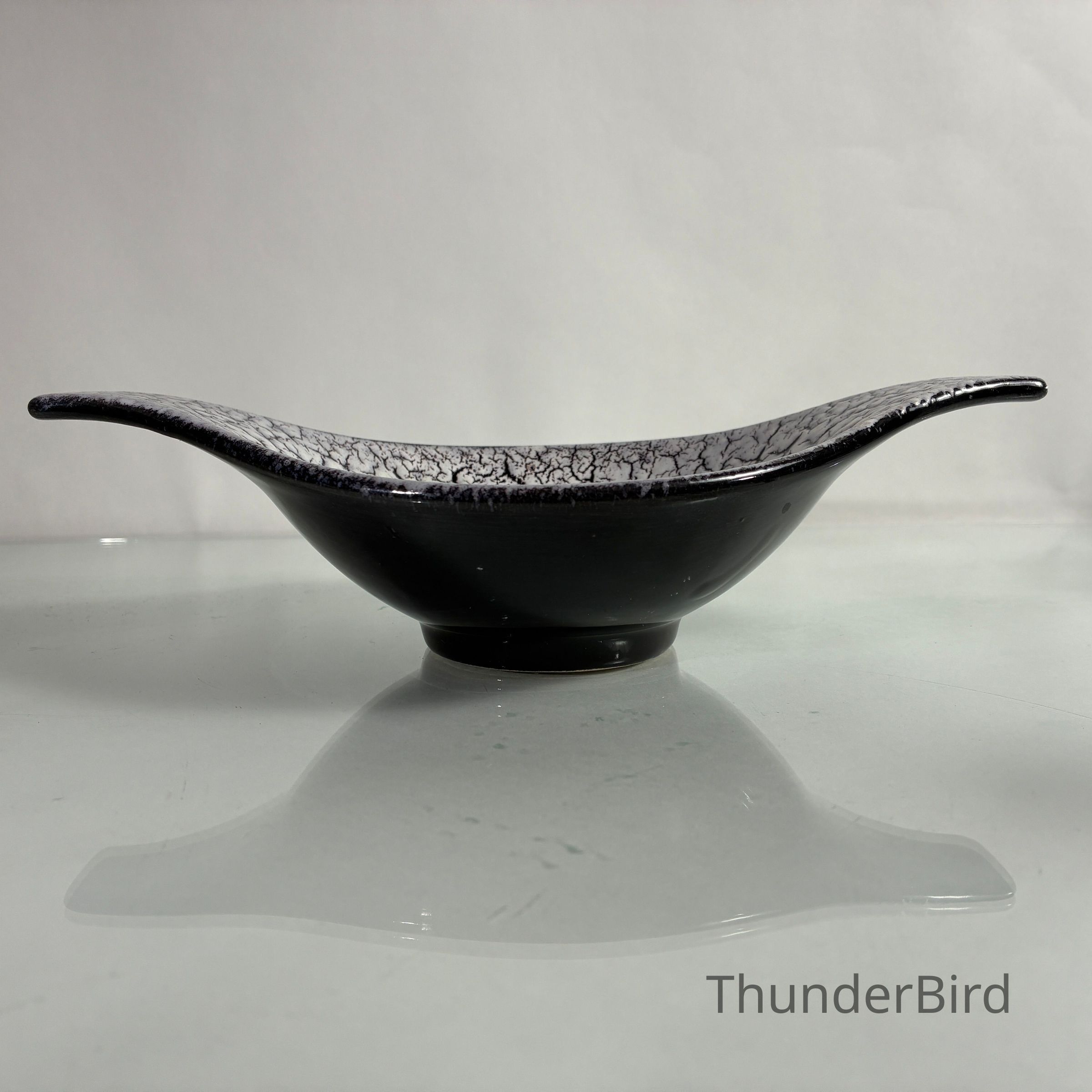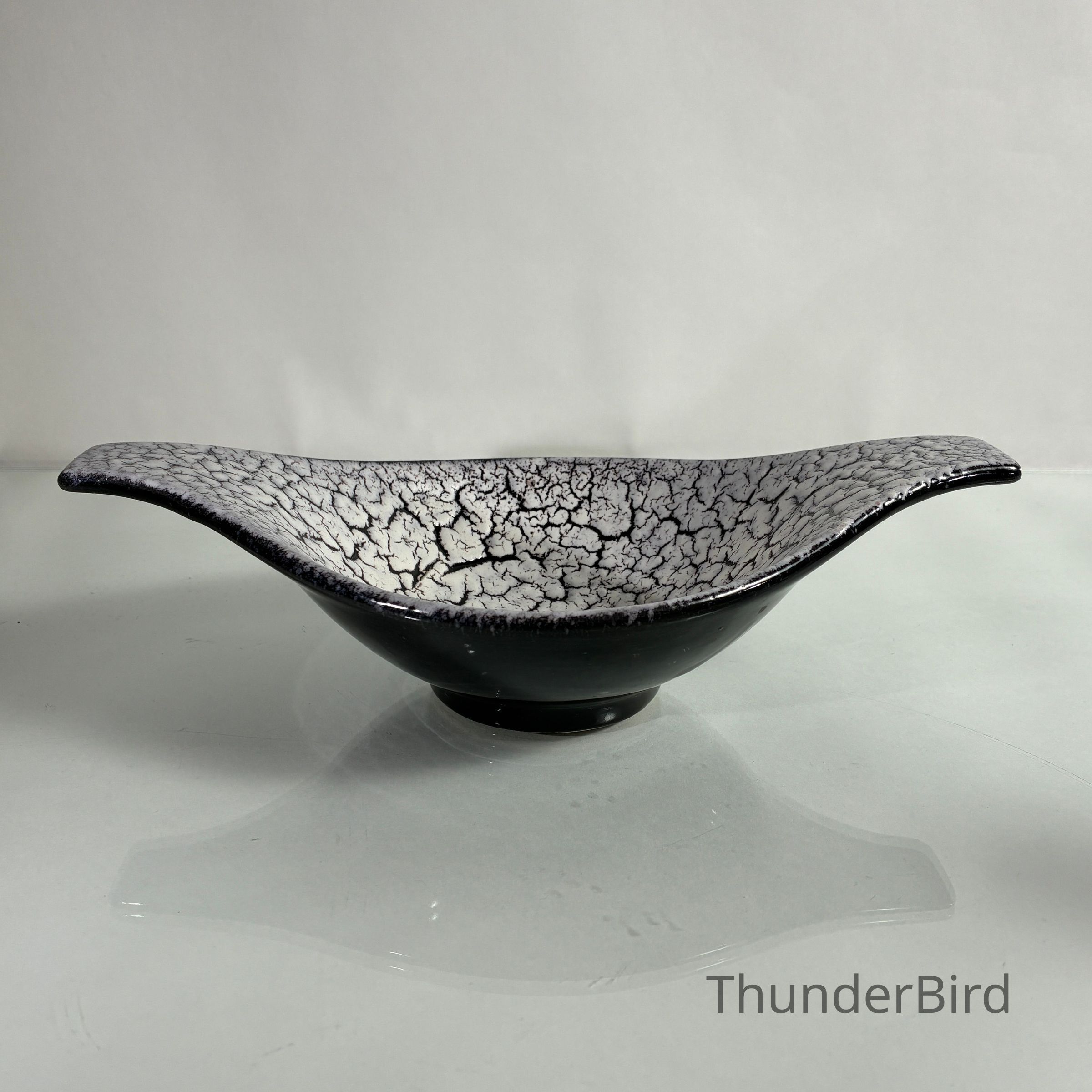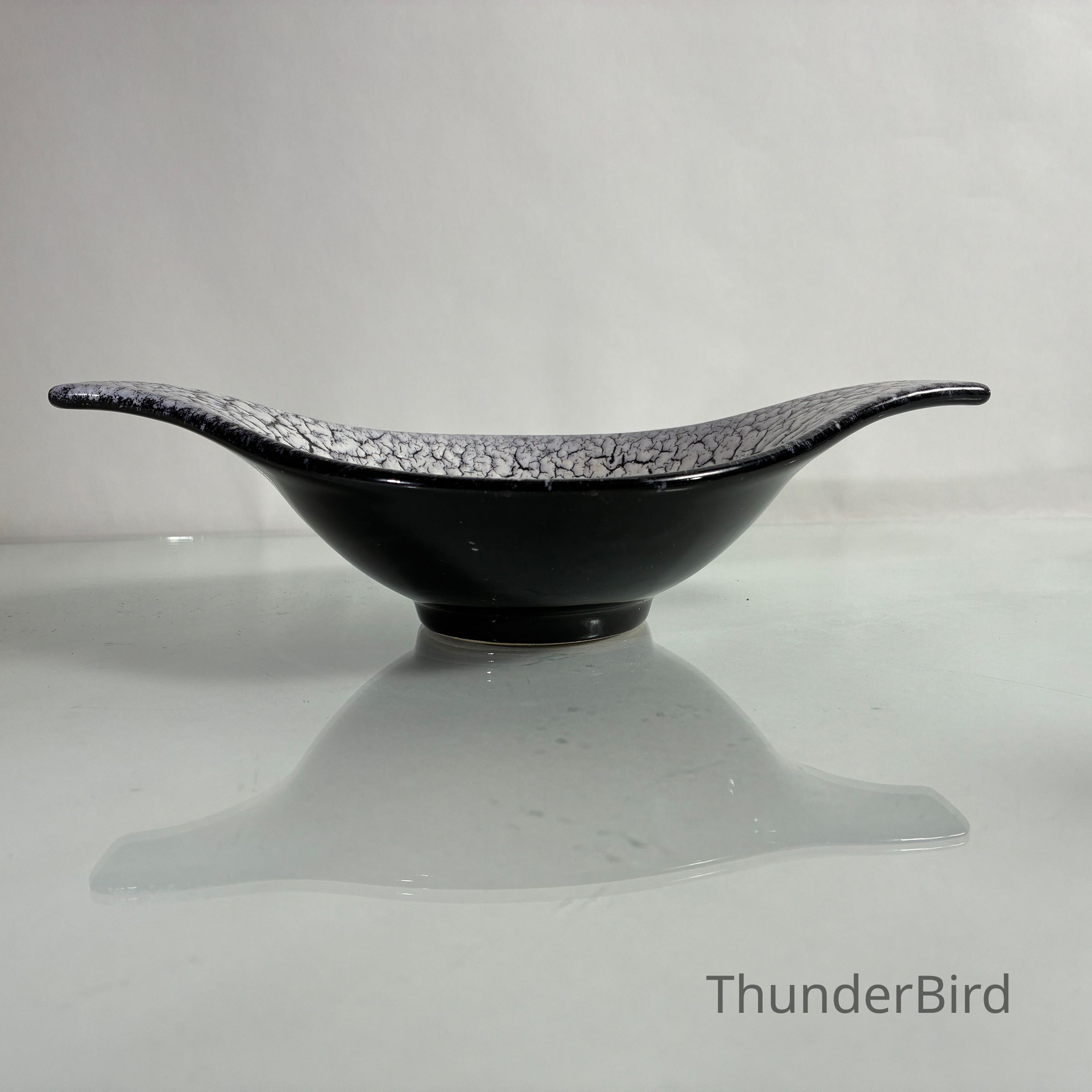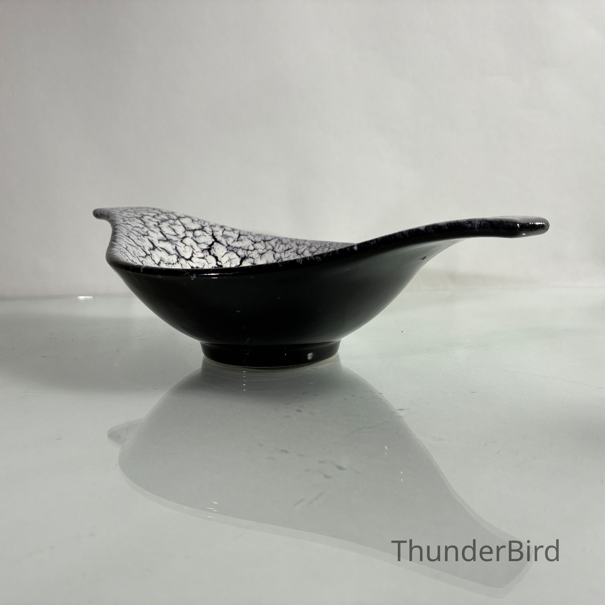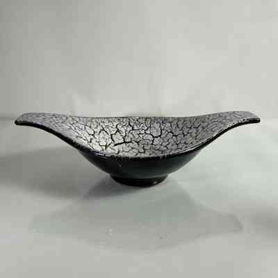 A sculptural mid-century ceramic bowl by Jasba Keramik, West Germany, dating from the 1950s–60s. This elegant form features Jasba’s distinctive Fat Lava-style glaze in a dramatic “cracked ice” finish — a textured white lava glaze that spreads across a glossy black ground, creating rich surface contrast.