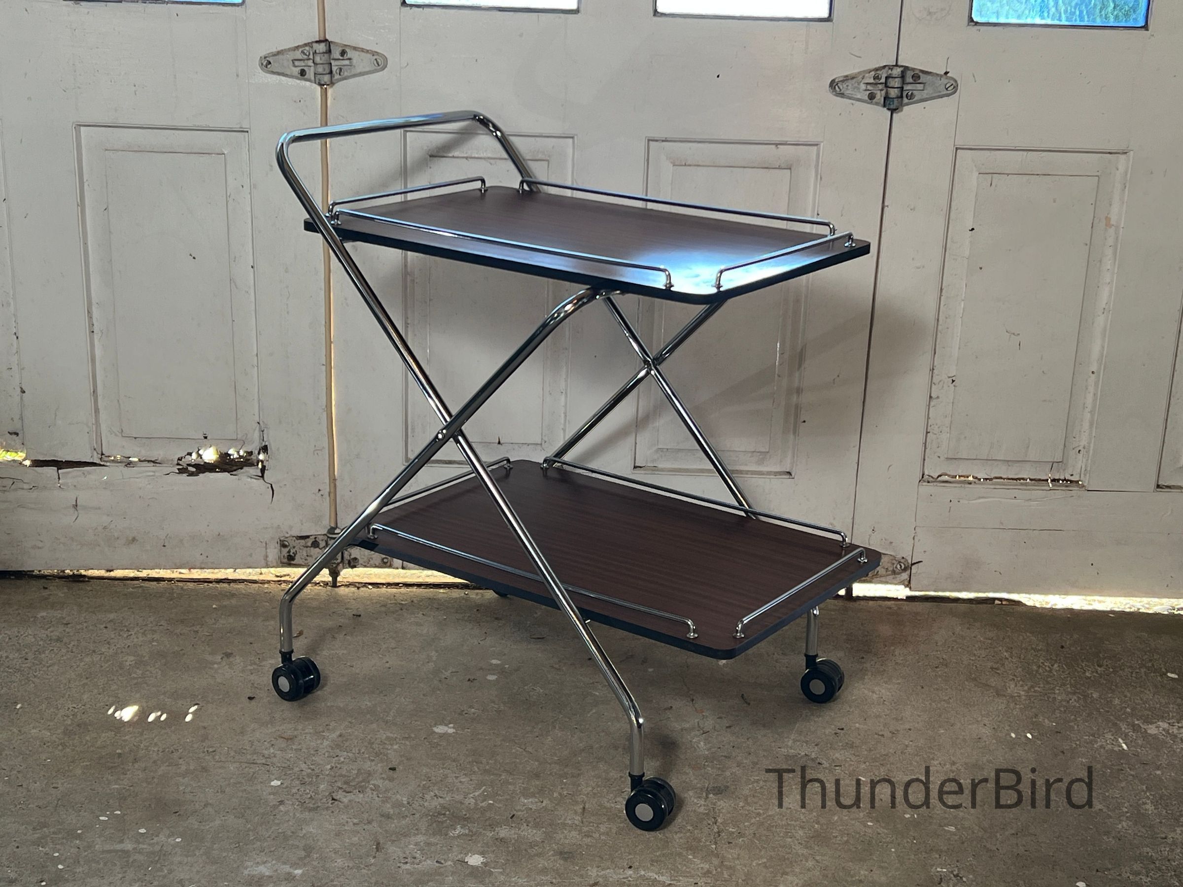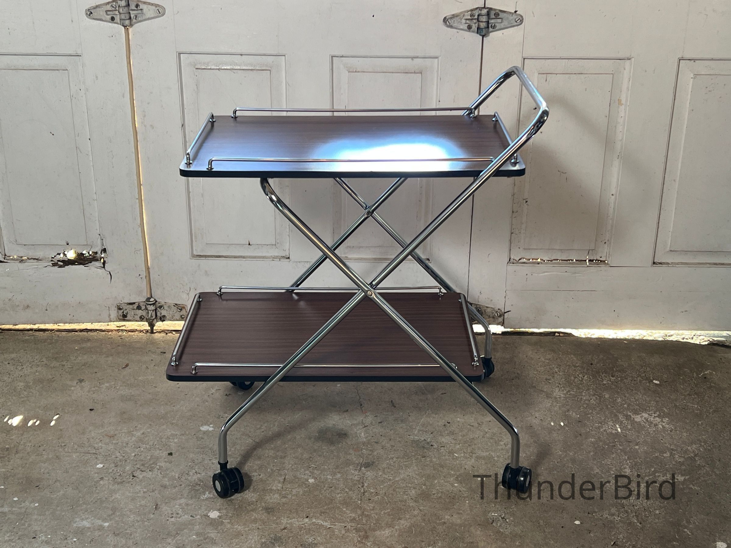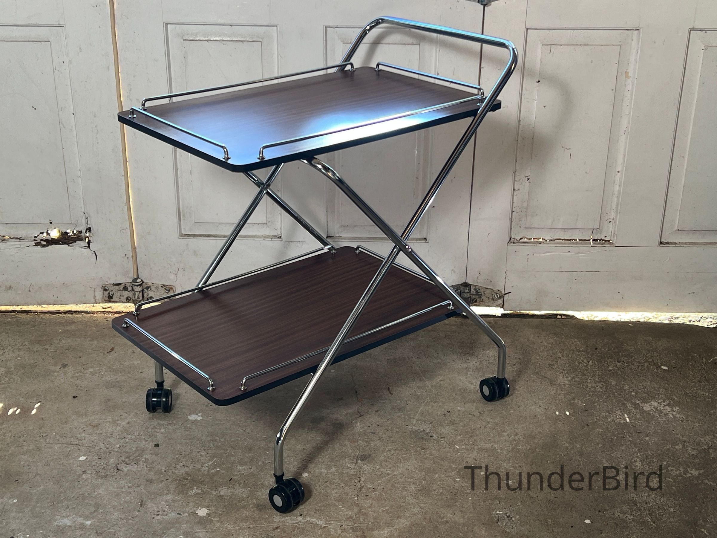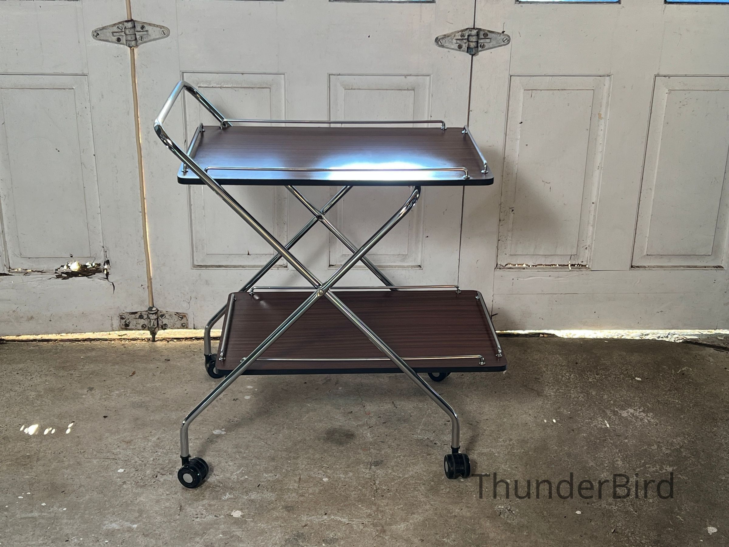 A versatile mid-century folding drinks trolley by Rodroc, Whanganui, New Zealand. Finished with a woodgrain laminate surface and chrome-plated tubular frame, this dual-tiered trolley features rolling casters and collapses flat for efficient storage. Retains its original label. Functional for serving drinks, displaying décor, or storing craft materials. Fantastic to find a labeled example!