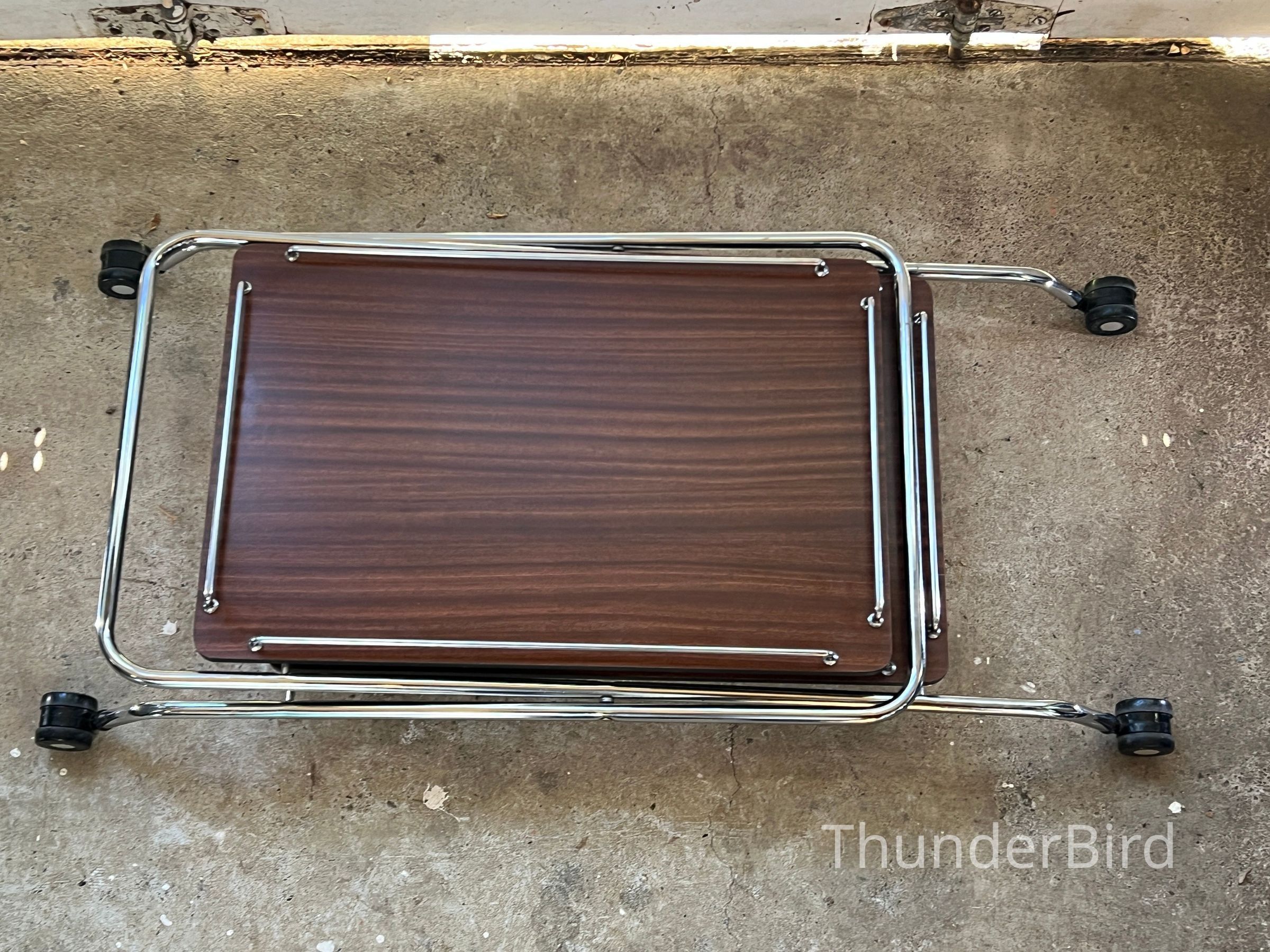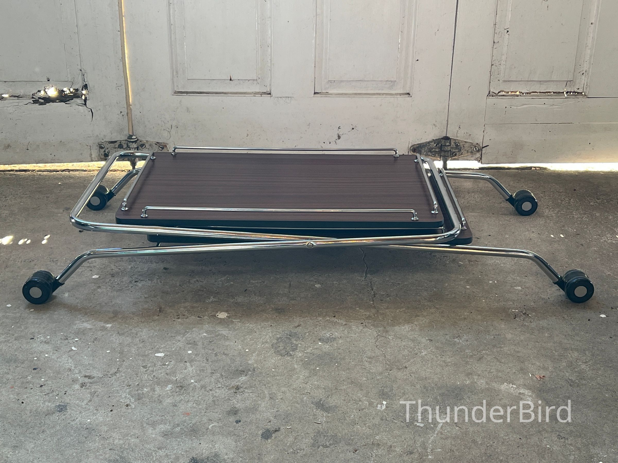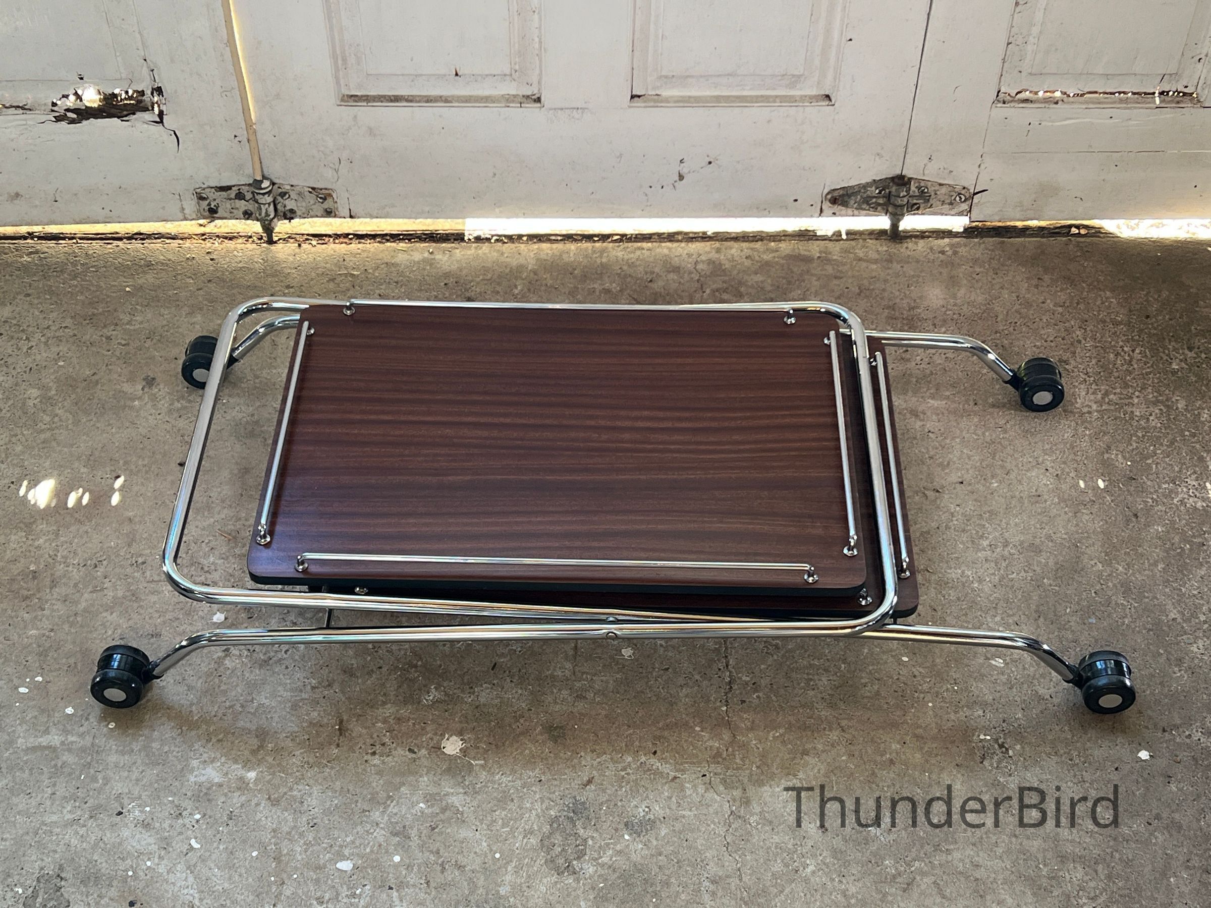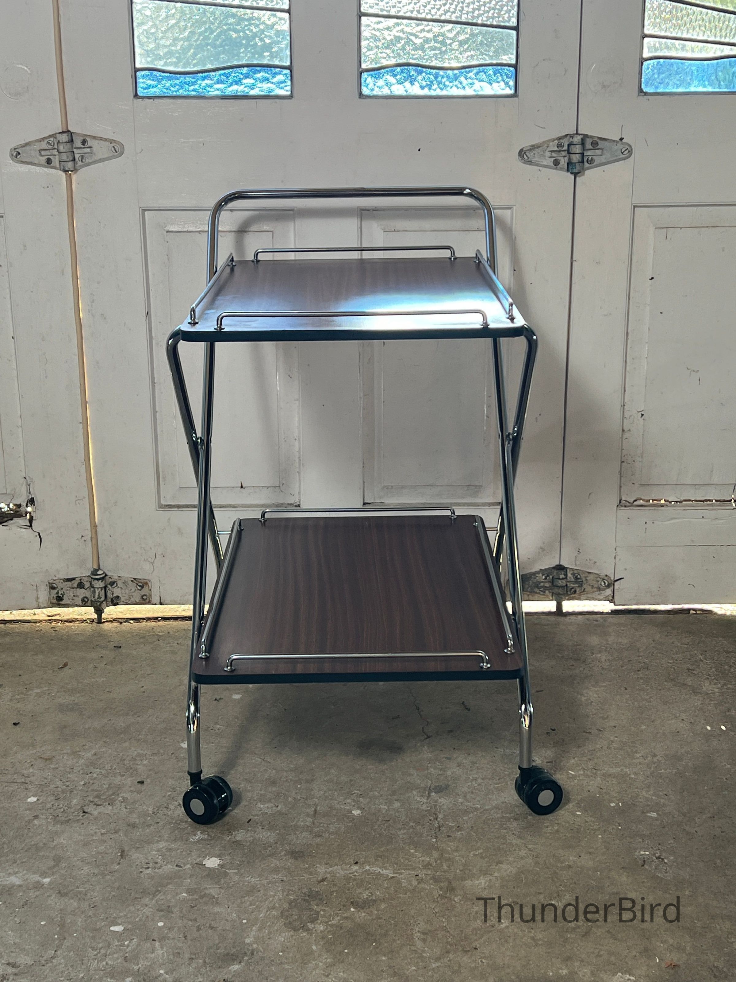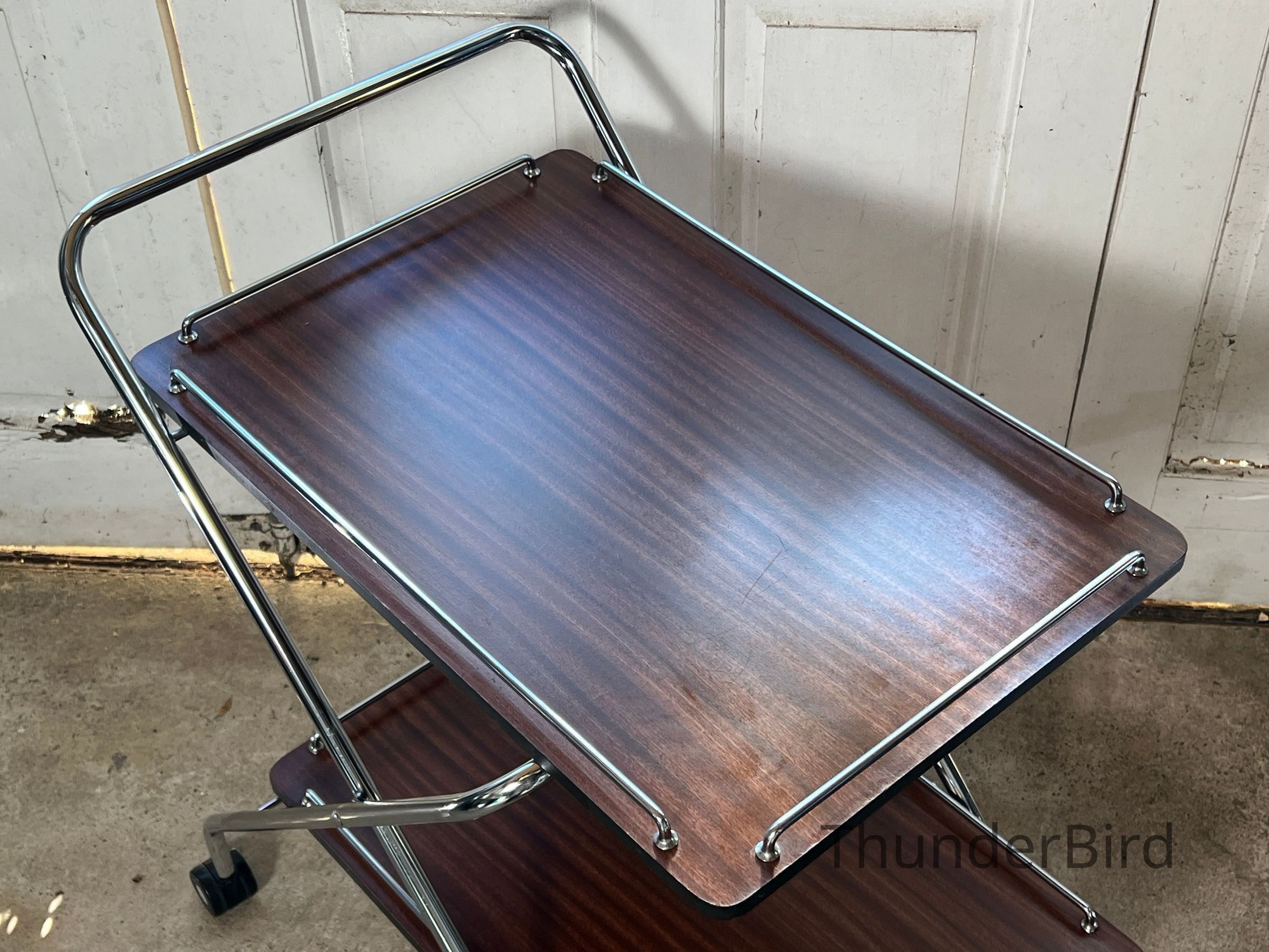 A versatile mid-century folding drinks trolley by Rodroc, Whanganui, New Zealand. Finished with a woodgrain laminate surface and chrome-plated tubular frame, this dual-tiered trolley features rolling casters and collapses flat for efficient storage. Retains its original label. Functional for serving drinks, displaying décor, or storing craft materials. Fantastic to find a labeled example!