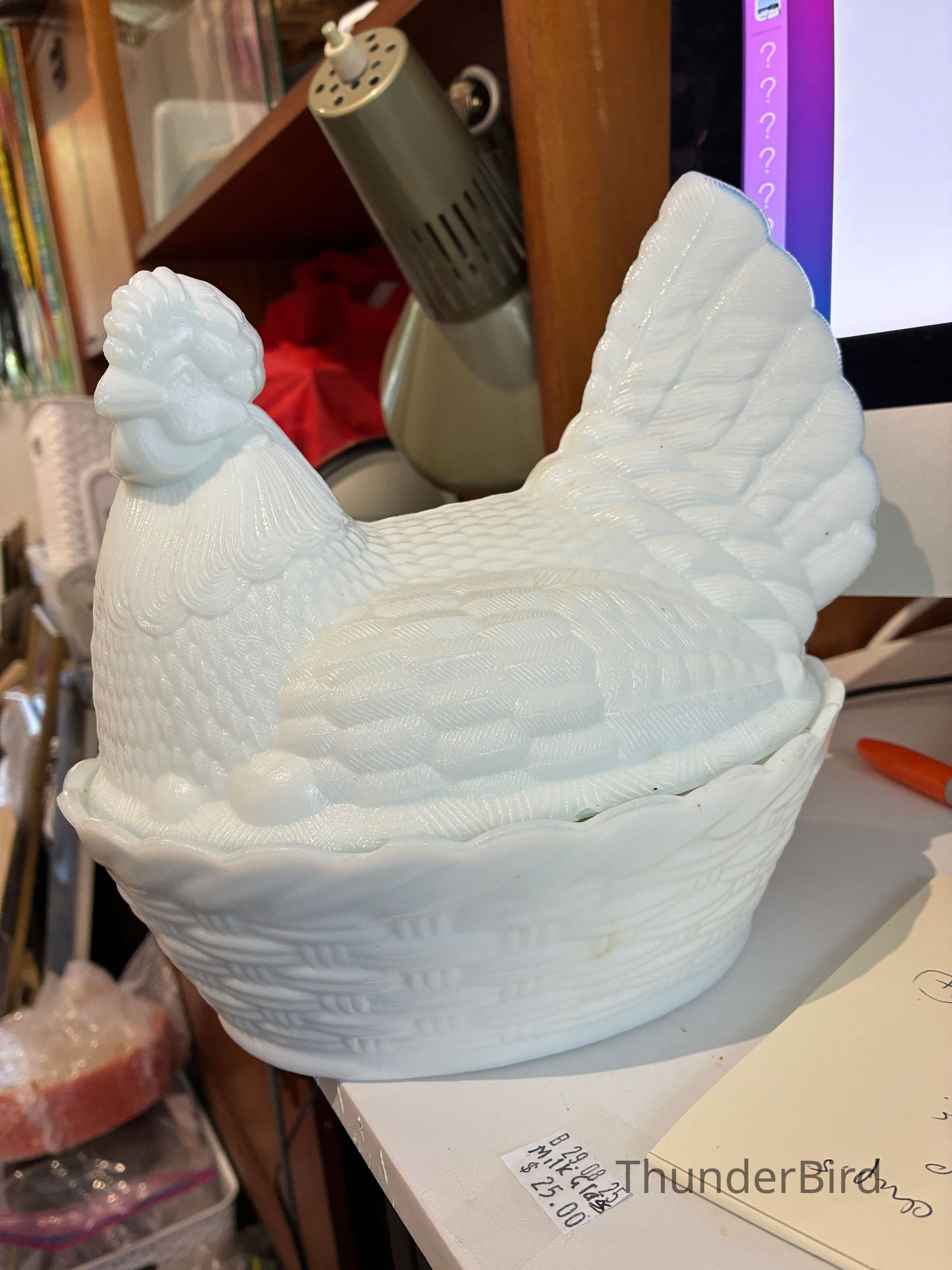 1.9.25c Opaline Milk Glass Hen on Nest – Possibly Antique French Carousel 1 Opaline Milk Glass Hen on Nest – Possibly Antique French Carousel 2 Opaline Milk Glass Hen on Nest – Possibly Antique French Carousel 3 Opaline Milk Glass Hen on Nest – Possibly Antique French Carousel 4 Opaline Milk Glass Hen on Nest – Possibly Antique French Carousel 5 Opaline Milk Glass Hen on Nest – Possibly Antique French Carousel 6 Opaline Milk Glass Hen on Nest – Possibly Antique French Carousel 7 Opaline Milk Glass Hen on Nest – Possibly Antique French Carousel 8 Opaline Milk Glass Hen on Nest – Possibly Antique French Carousel 9 Opaline Milk Glass Hen on Nest – Possibly Antique French Carousel 10 Description Recycle, Reuse, ReLove! Please make an offer via the ‘Questions’ panel below Thank you for your support of a purely NZ-owned small business A finely detailed and beautifully moulded opaline milk glass hen-on-nest covered dish, likely dating to the late 19th or early 20th century. The bluish tinge to the thinner glass edges and the soft internal glow of the opaline are consistent with early French production. These dishes were traditionally used to serve eggs or sweets. M E A S U R E S : Height: 19.5 cm Length: 22 cm Width: 18 cm C O N D I T I O N : Displays very well but has two noted flaws. There is a chip to the rim of the base dish (nest), and another chip to the base of the hen where it seats into the bowl. Both are shown clearly in the photographs and do not affect overall stability or display. P L E A S E N O T E : Please review all photos carefully, as they form an important part of the item description. We cannot be held liable for any damage incurred during transit. ref 1.9.25c Details Condition: Used Shipping & pick-up options Destination & description Price Courier - Wellington $7.20 Courier - Wellington > Rural $14.01 Courier - Rest of North Island $25.85 Courier - Rest of North Island > Rural $31.74 Courier - South Island $46.00 Courier - South Island > Rural $51.89 Seller does not allow pick-ups Learn more about shipping & delivery options. Payment Options Pay instantly by card, Ping balance or saved bank account. What's Ping? Four fortnightly interest-free payments. What's Afterpay? Other options Cash, NZ Bank Deposit Questions & Answers thunderbirdvtg enter comment 500 characters remaining Do not use this feature to bypass the auction process or for commercial purposes. Abuse may result in suspension of your account. No questions have been asked! Opaline Milk Glass Hen on Nest – Possibly Antique FrenchEntry/Object ID
