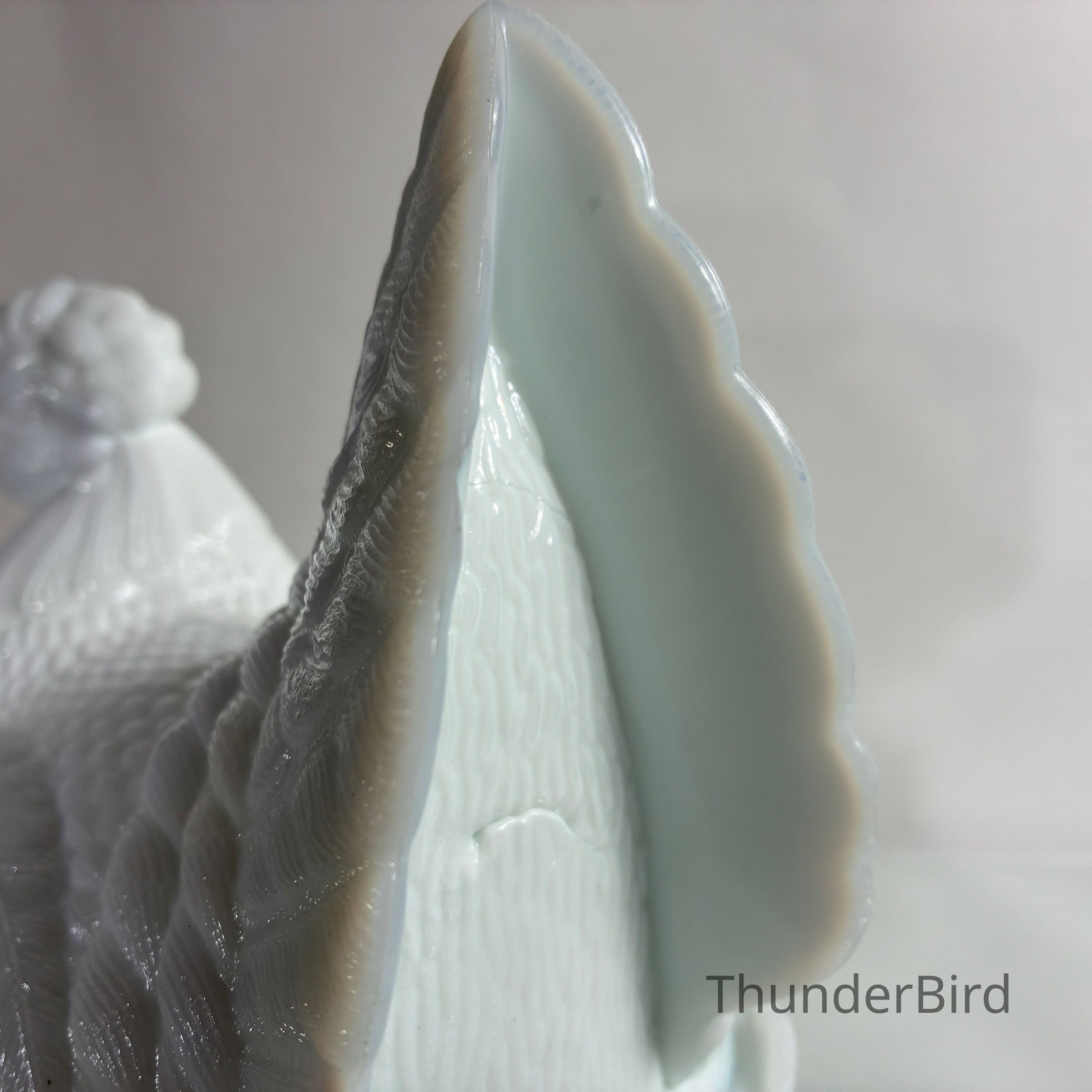 A finely detailed and beautifully moulded opaline milk glass hen-on-nest covered dish, likely dating to the late 19th or early 20th century. The bluish tinge to the thinner glass edges and the soft internal glow of the opaline are consistent with early French production.
