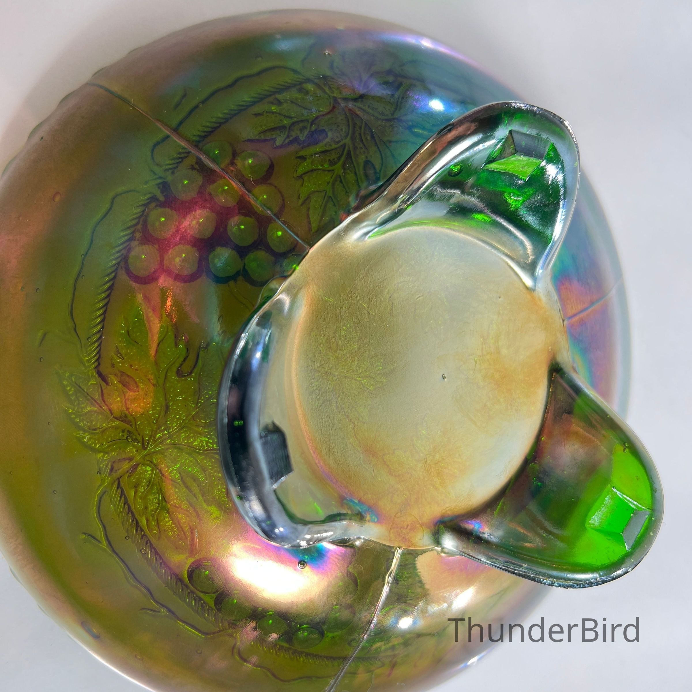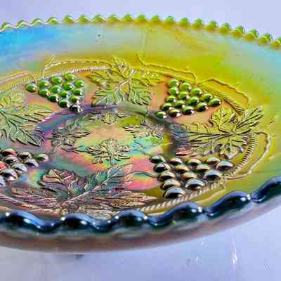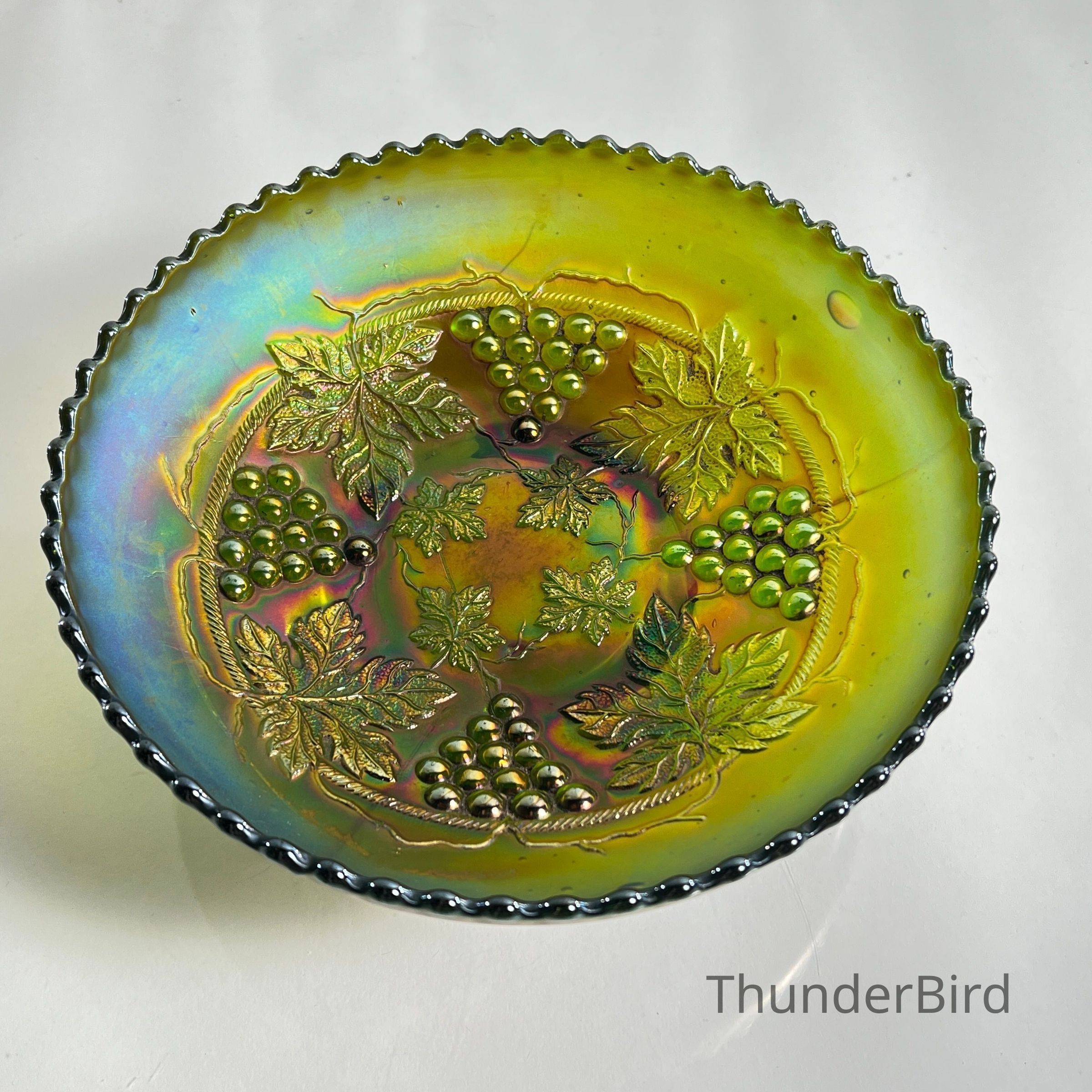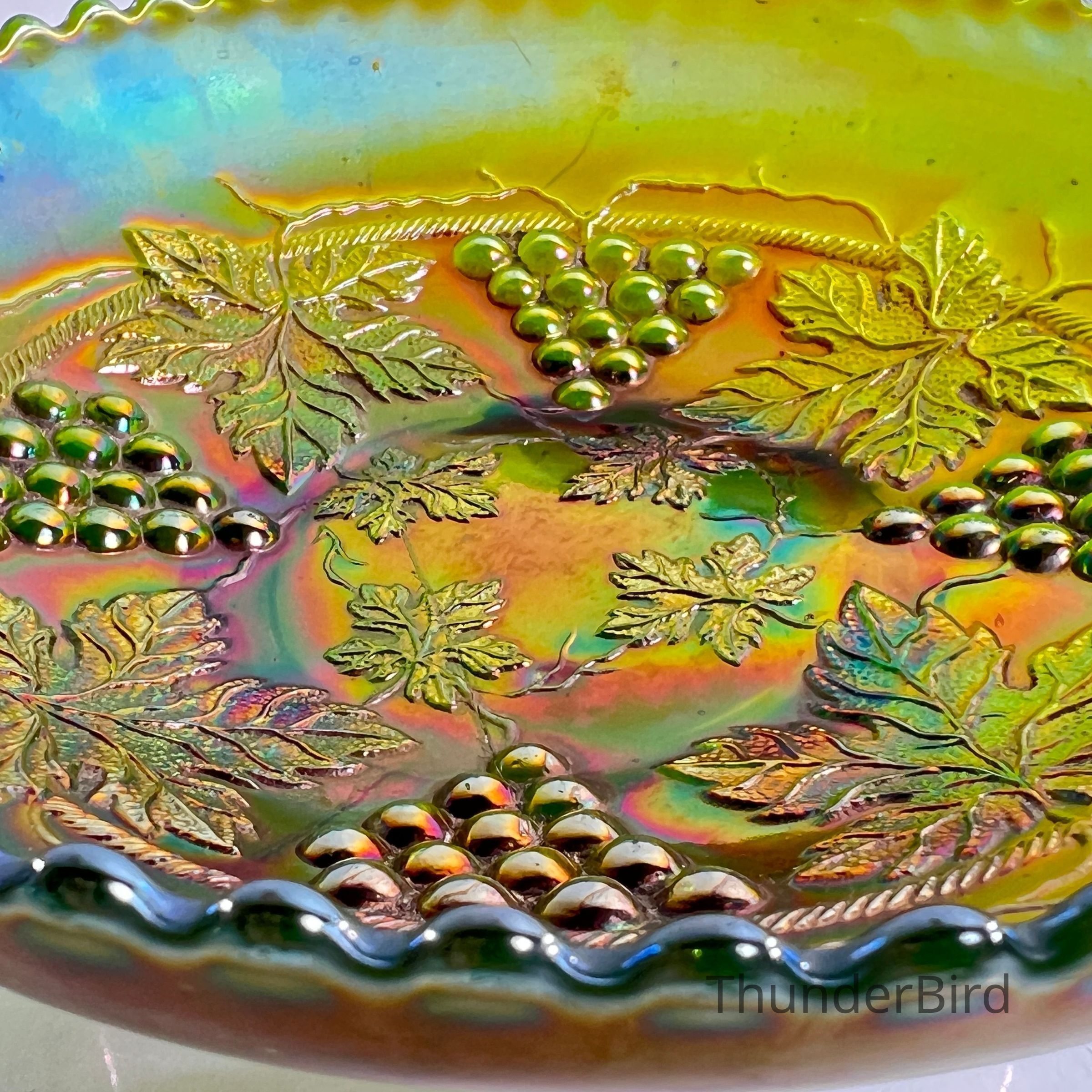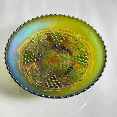 12.9.25a Antique Fenton Carnival Glass Footed Bowl – Grape & Leaf Pattern, IridescentEntry/Object ID