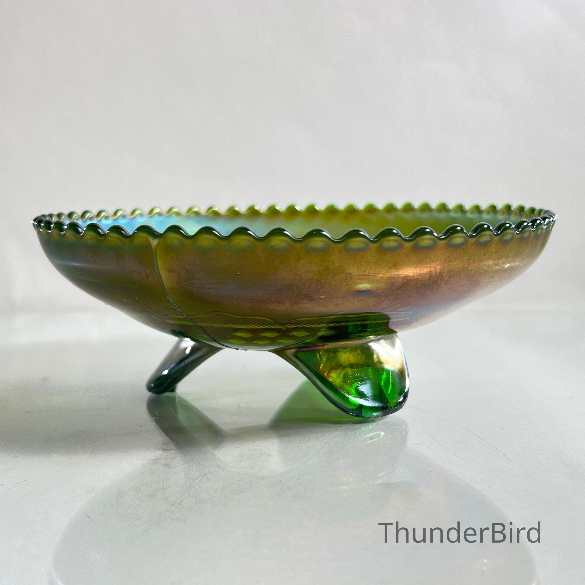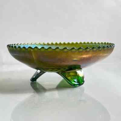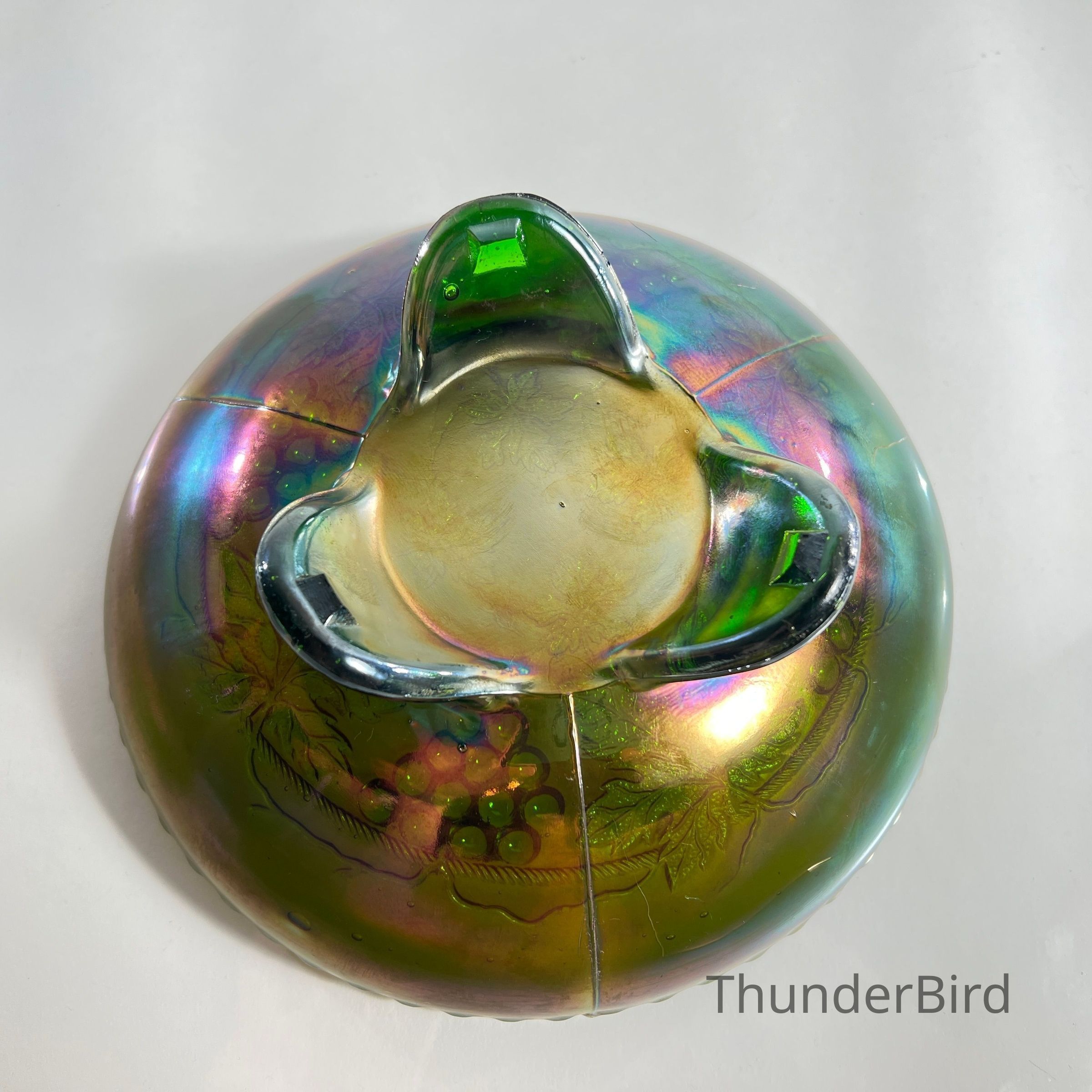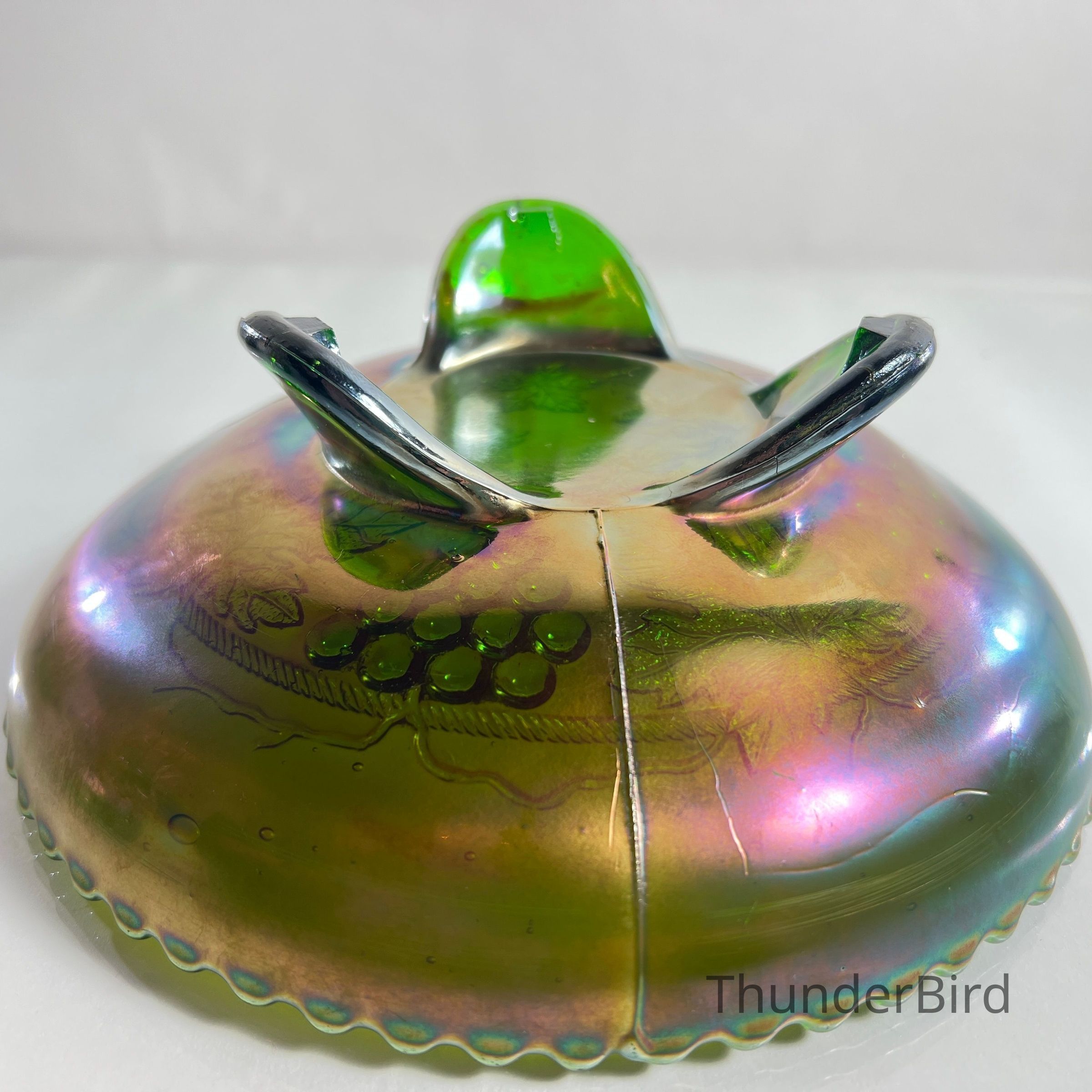 An early 20th-century Carnival Glass bowl by Fenton Glass Company, featuring the well-known “Grape and Leaf” pressed pattern. This piece stands on three clear green glass feet and displays a vibrant iridescent finish, with rich tones of gold, purple, and green reflecting across the surface.