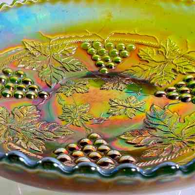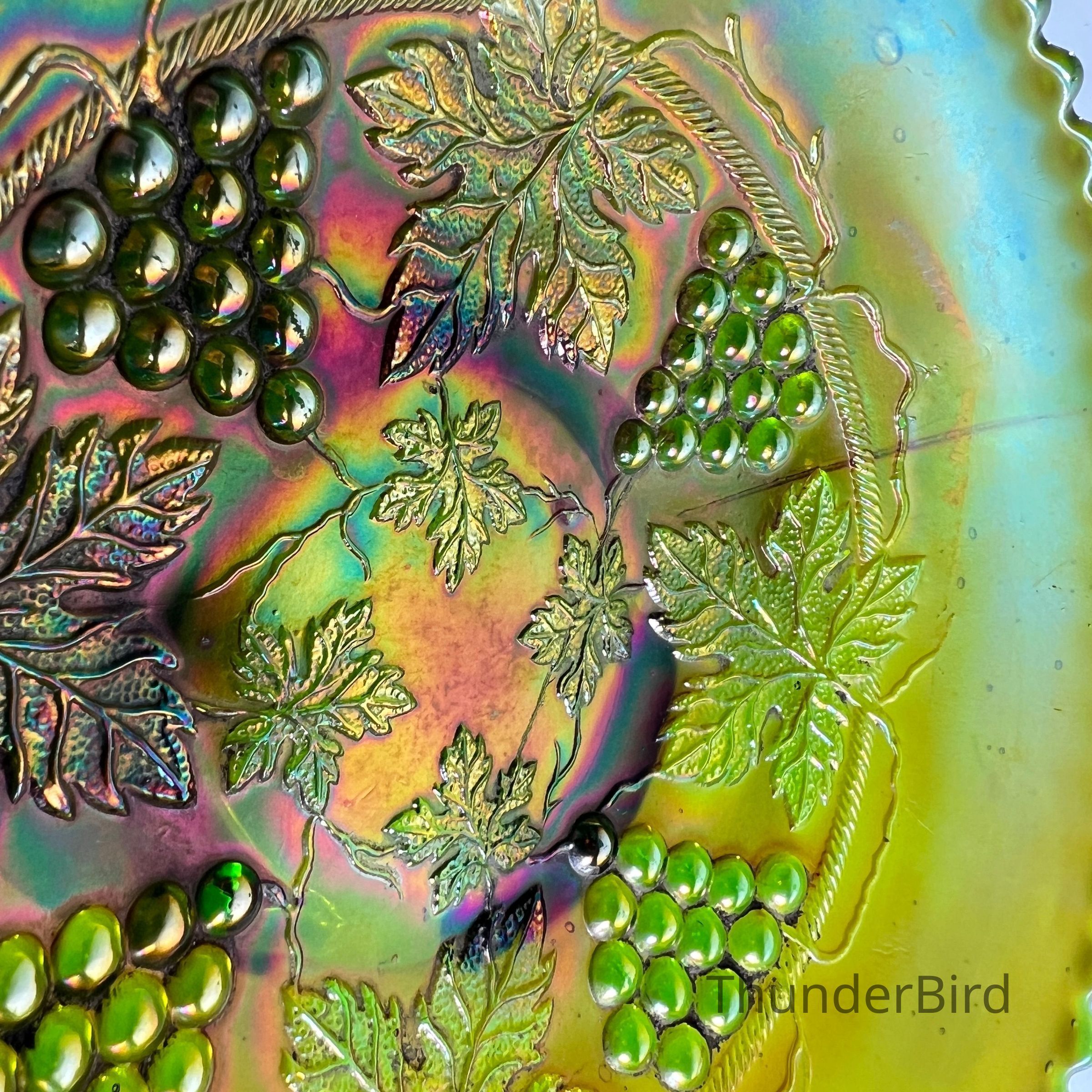 The design depicts clusters of grapes and serrated vine leaves in high relief, radiating from the centre. This pattern was a popular motif in American pressed glass during the Carnival Glass era (c. 1907–1930s), and Fenton was among the first to commercially produce this style.