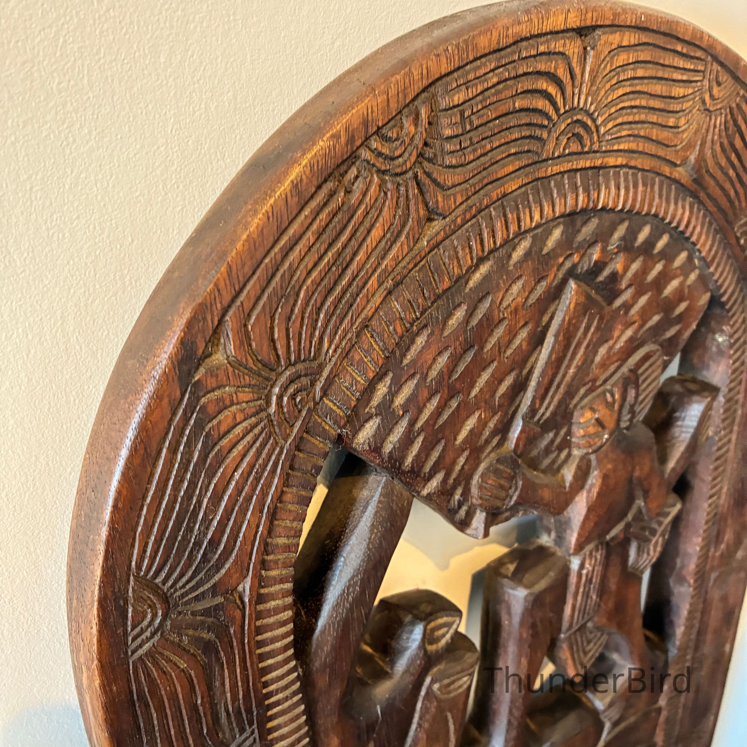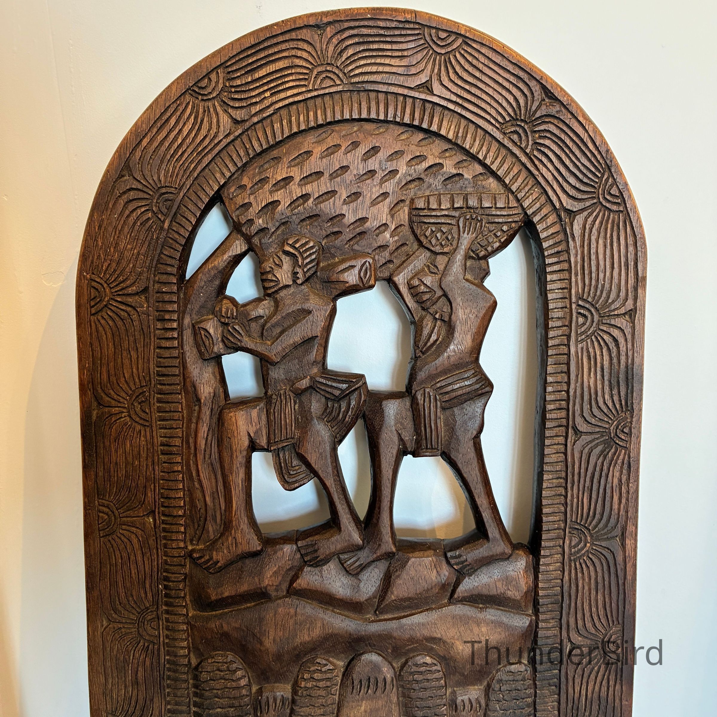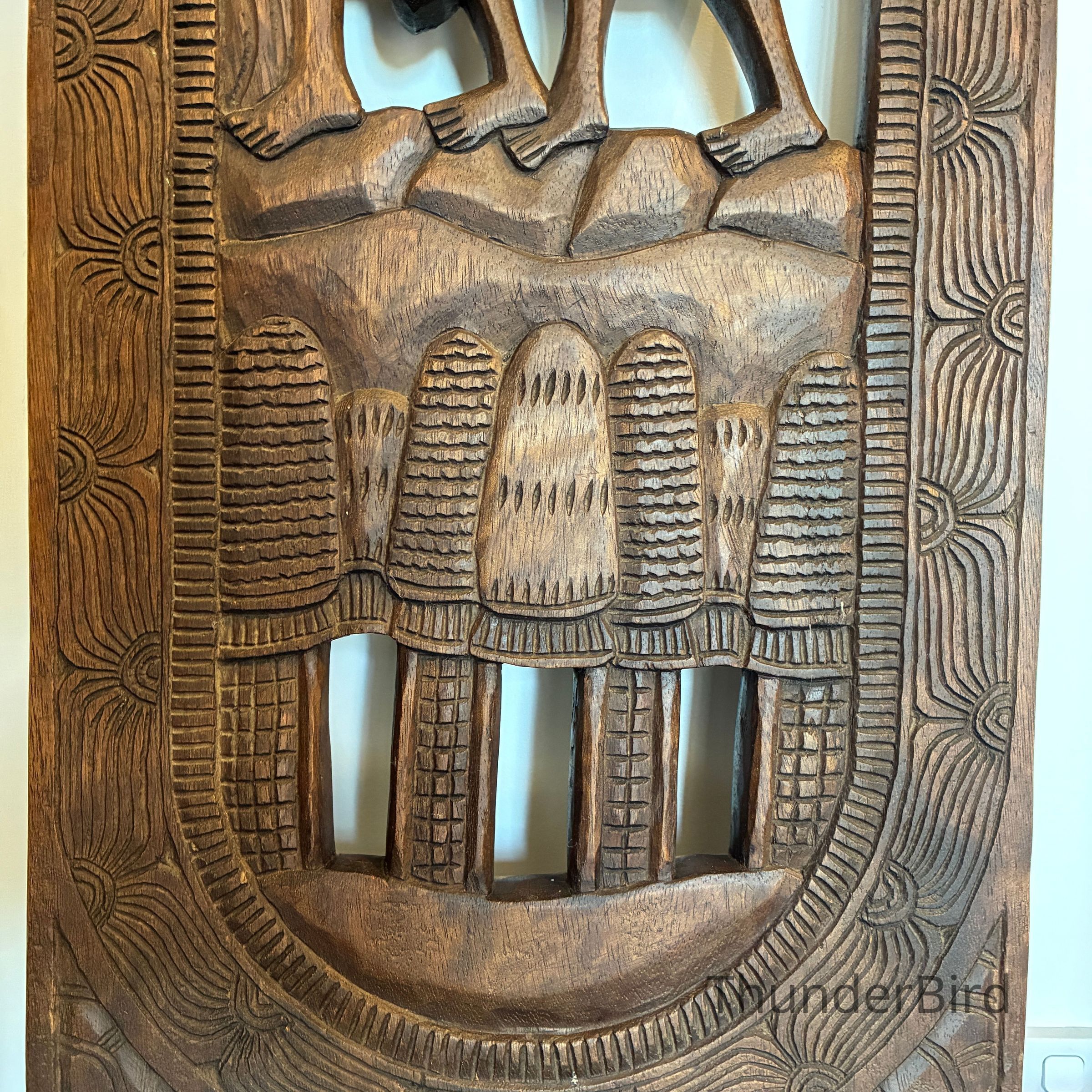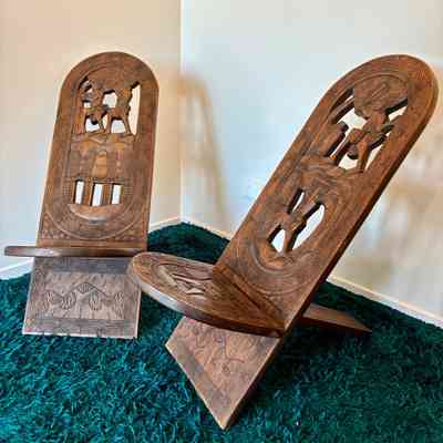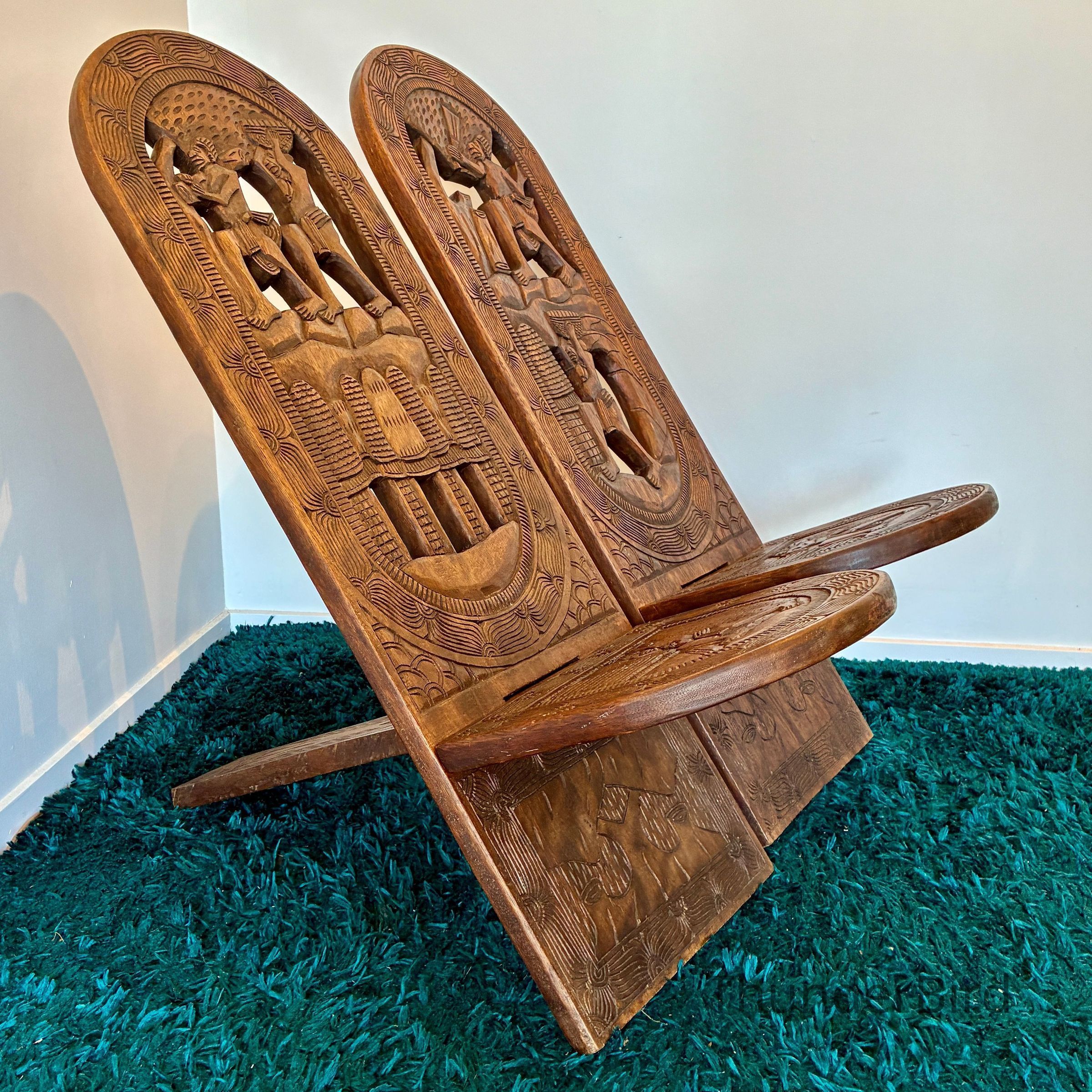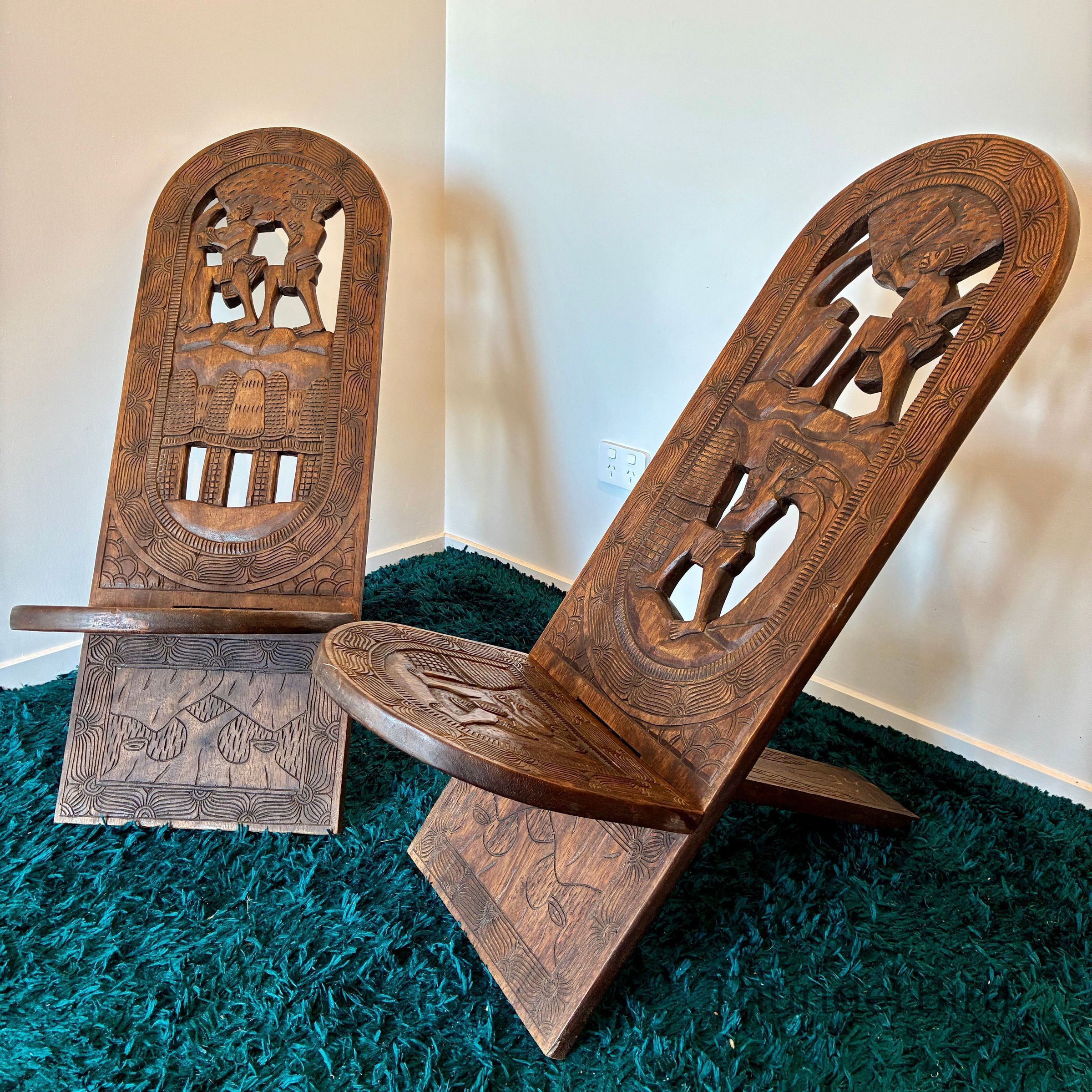 Each chair features elaborate, deeply incised carvings depicting scenes of traditional village life. These chairs were traditionally used during childbirth or as ceremonial seating, symbolising strength, protection, and maternal life.