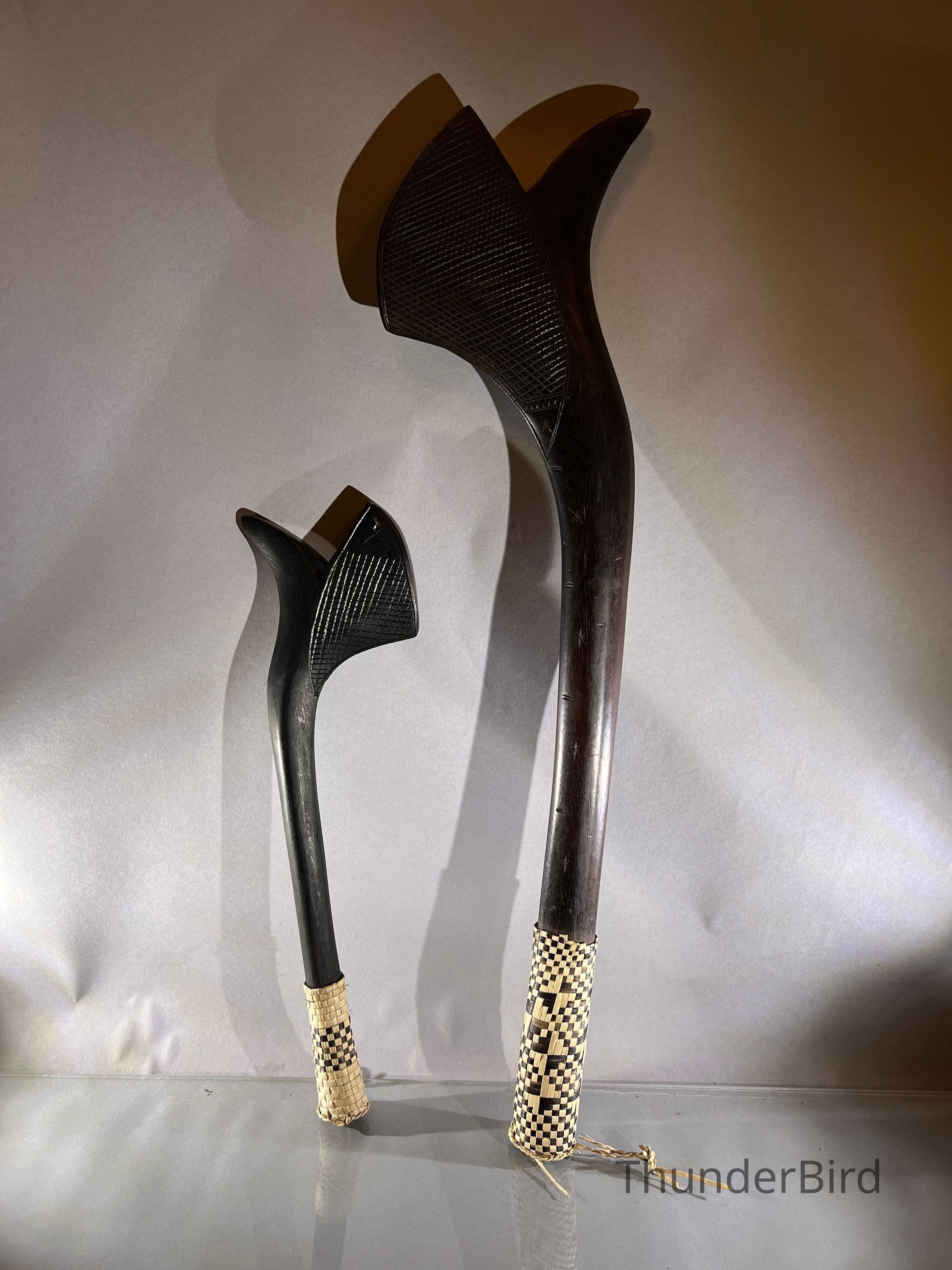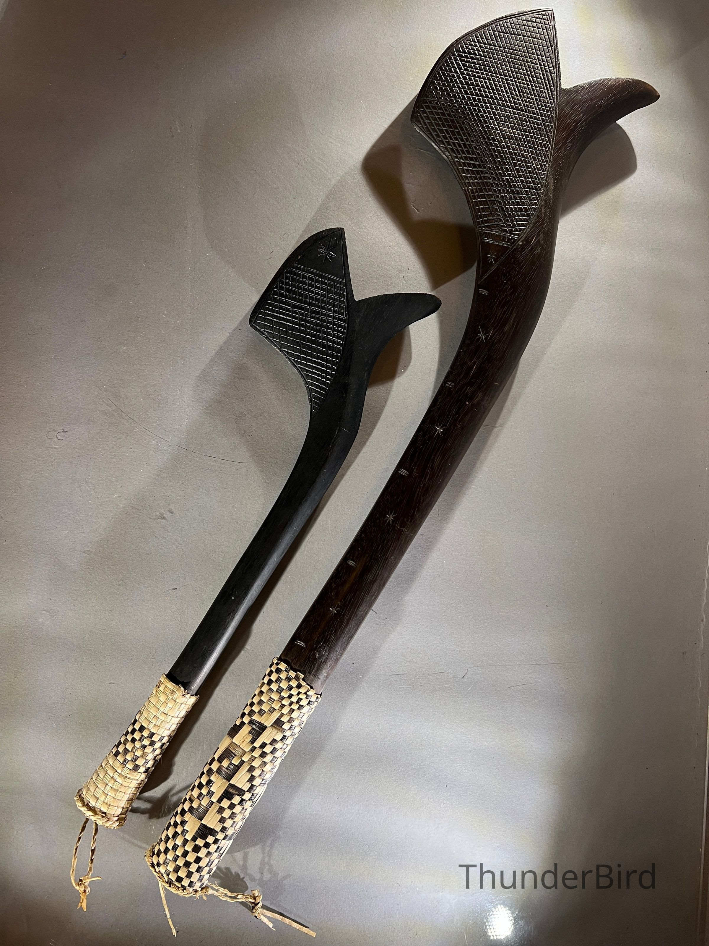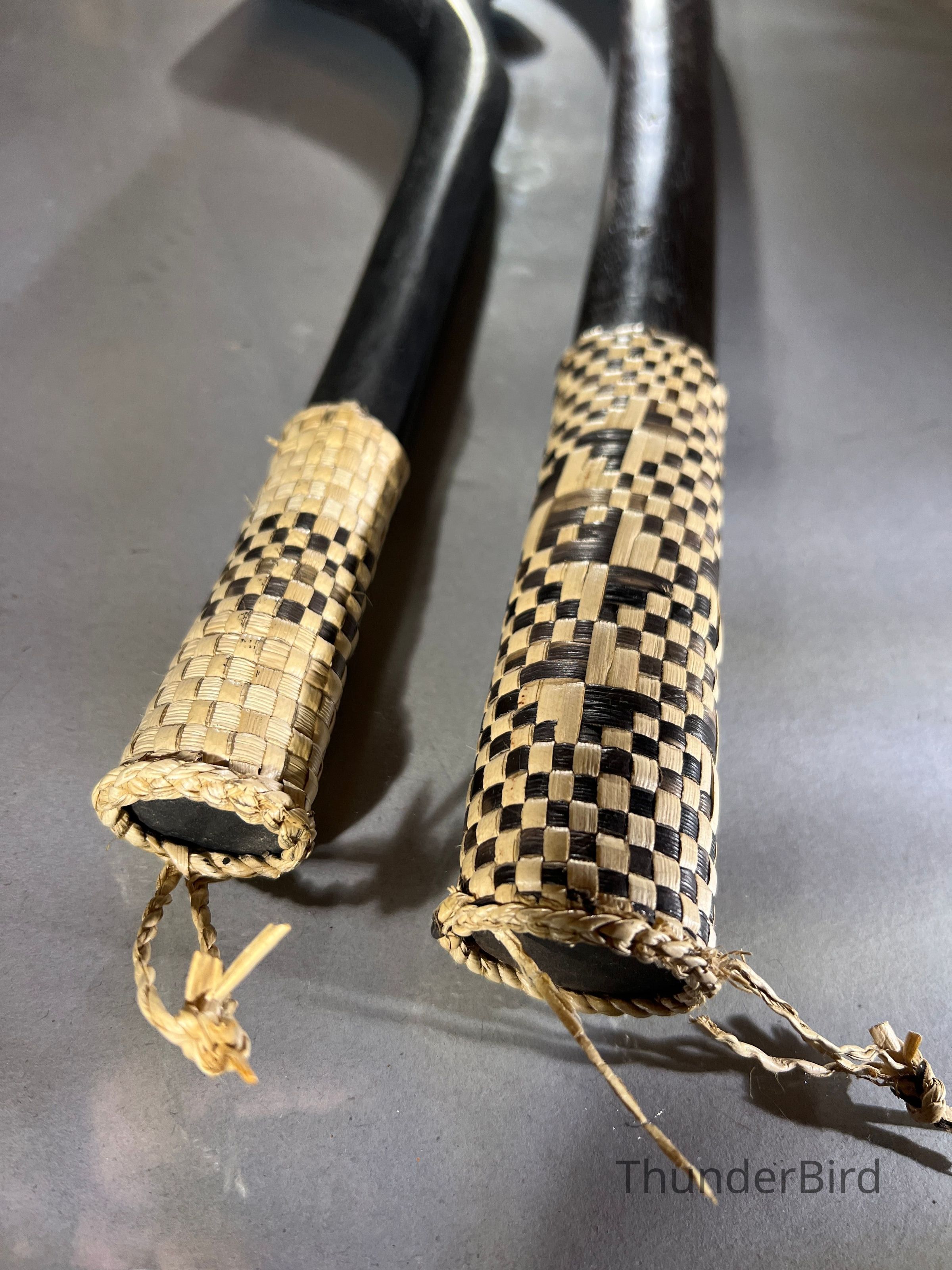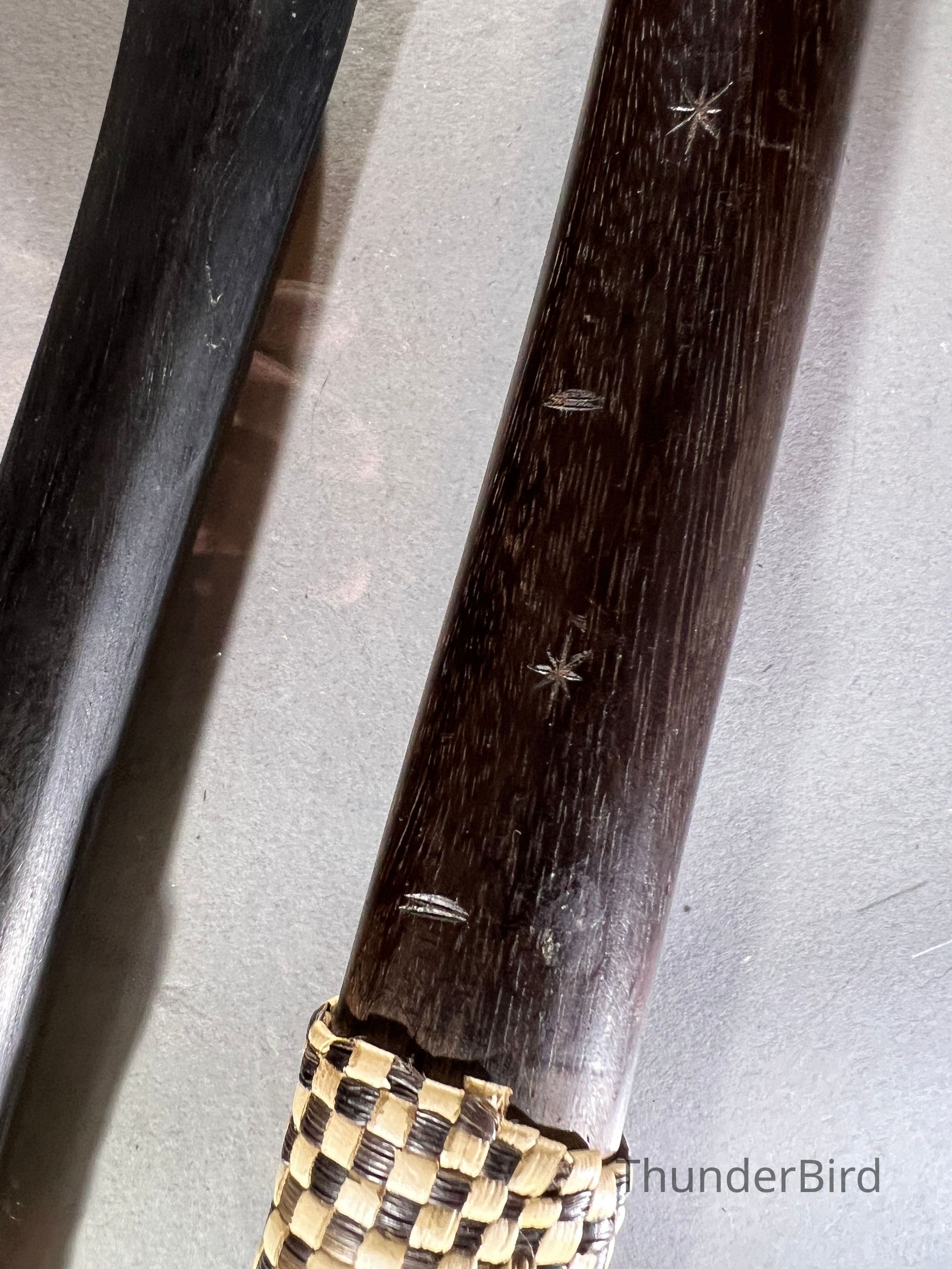 A striking pair of traditional hand-carved Pacific Island war clubs, featuring intricate cross-hatch carving and finely woven natural fibre grips. These clubs are crafted from dark hardwood and exhibit detailed geometric and starburst motifs. Such clubs were historically used in ceremonial, status, and combat contexts across various Pacific cultures.