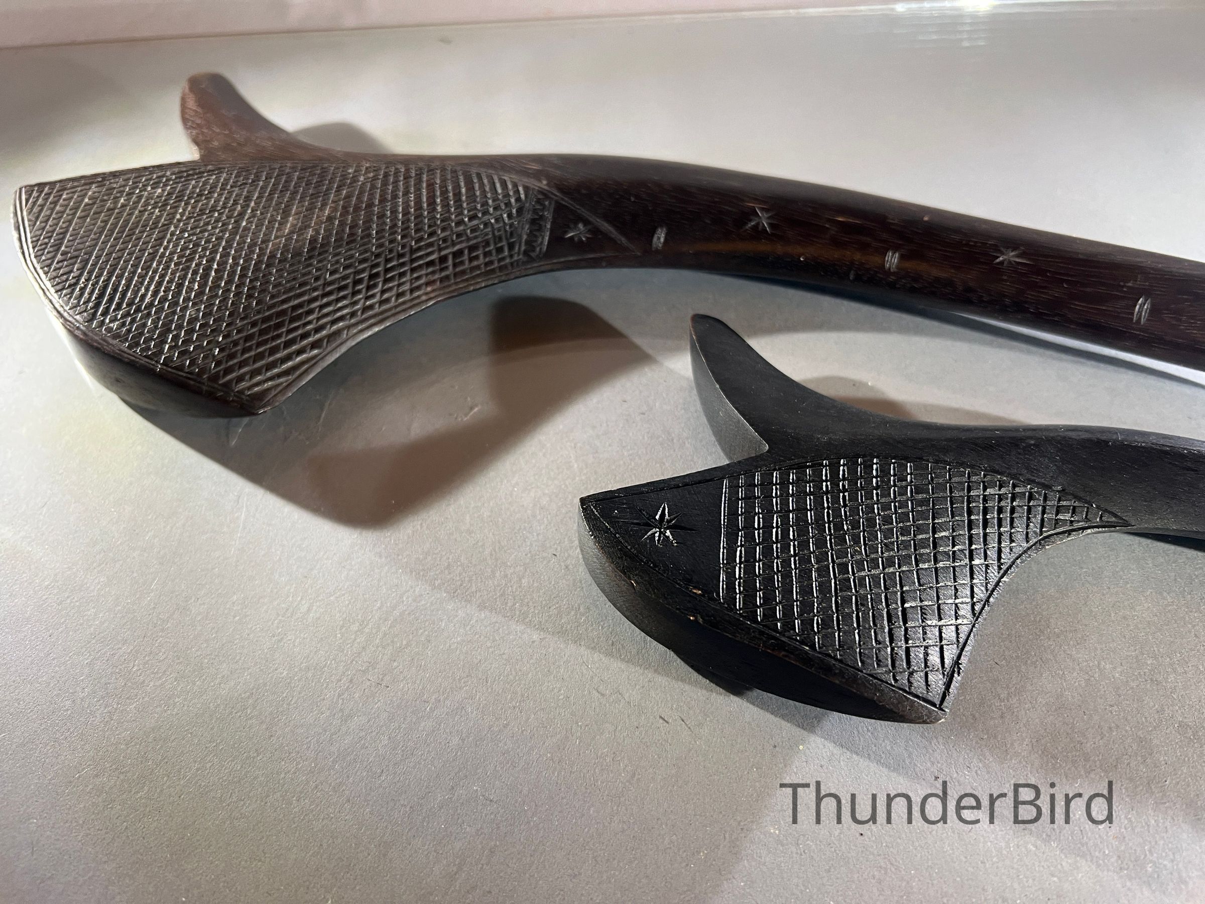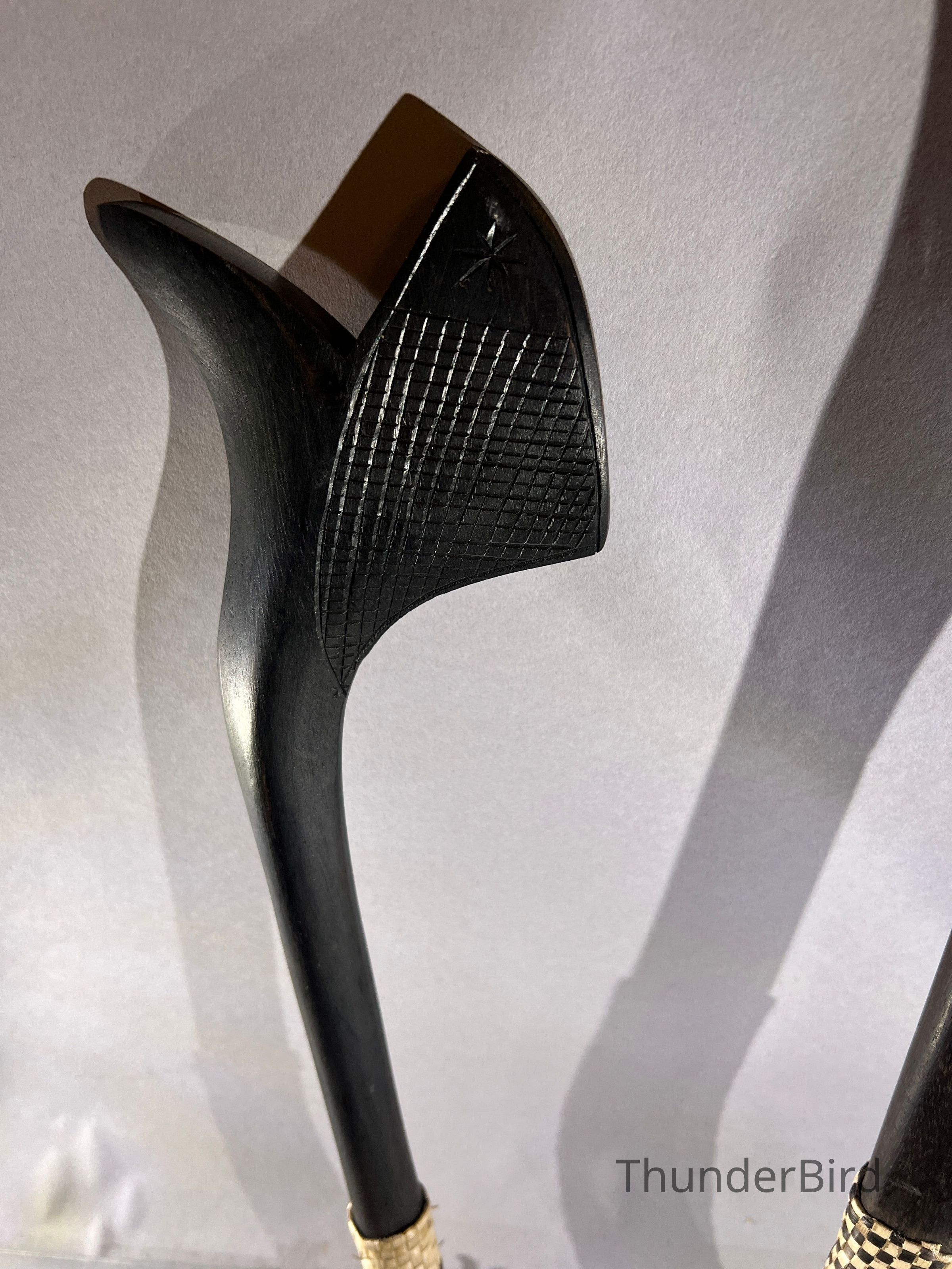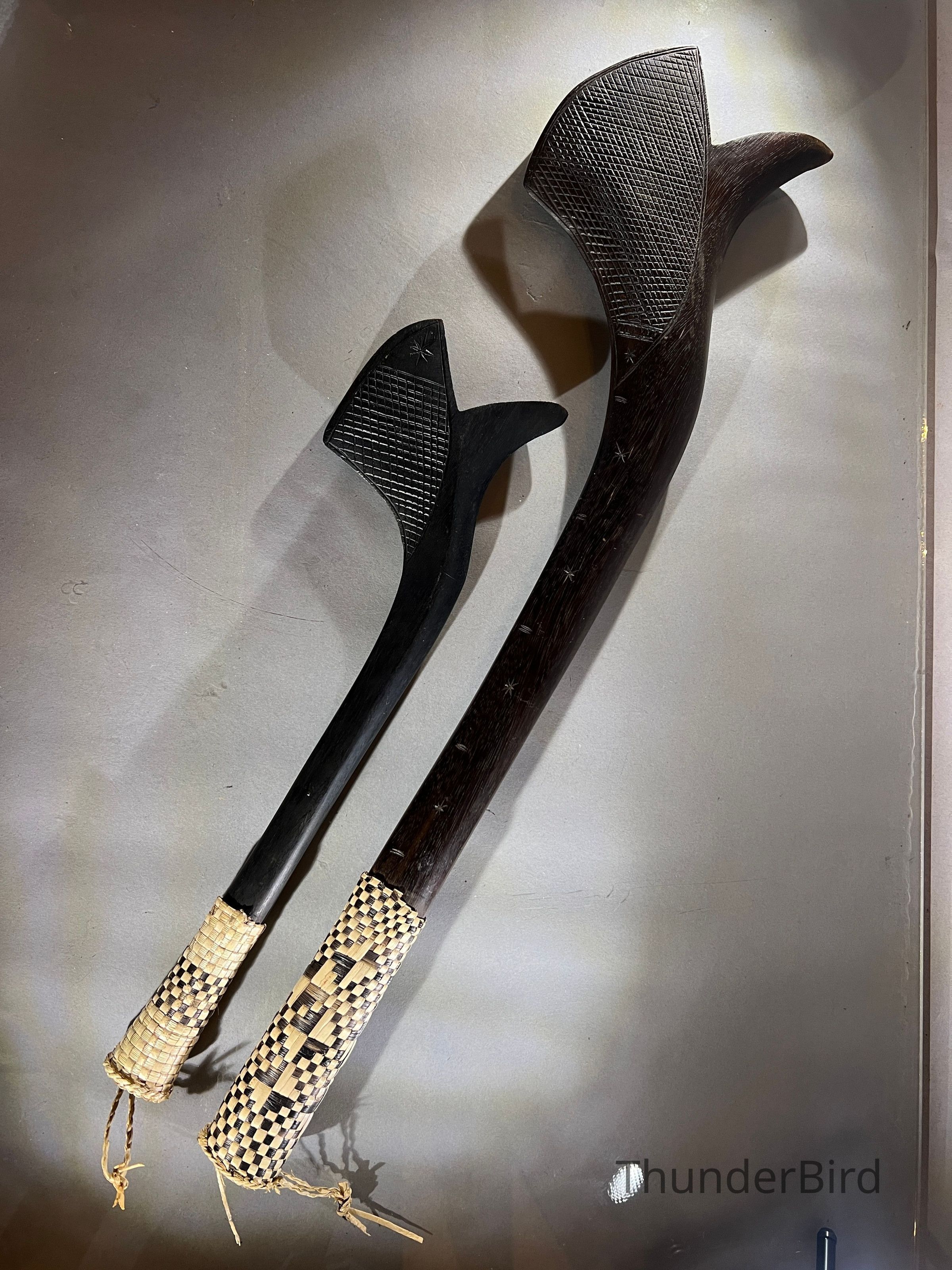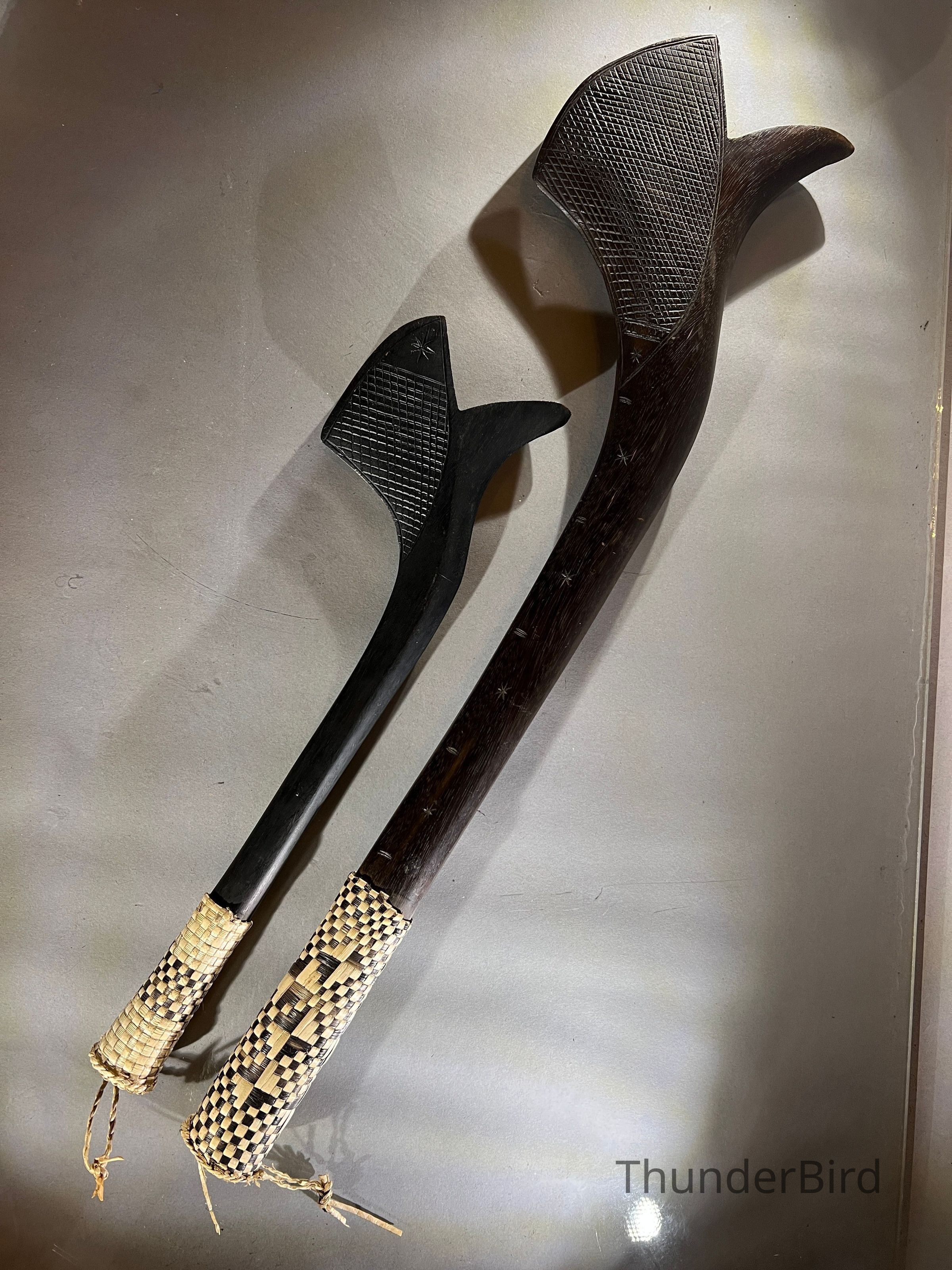 A striking pair of traditional hand-carved Pacific Island war clubs, featuring intricate cross-hatch carving and finely woven natural fibre grips. These clubs are crafted from dark hardwood and exhibit detailed geometric and starburst motifs. Such clubs were historically used in ceremonial, status, and combat contexts across various Pacific cultures.