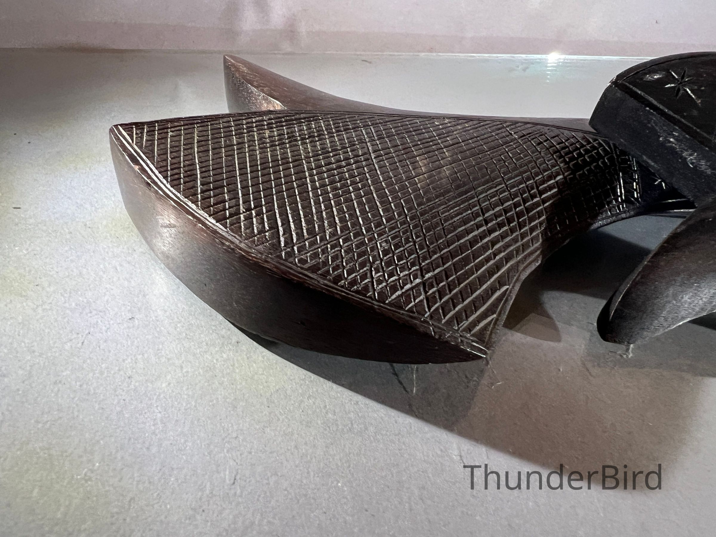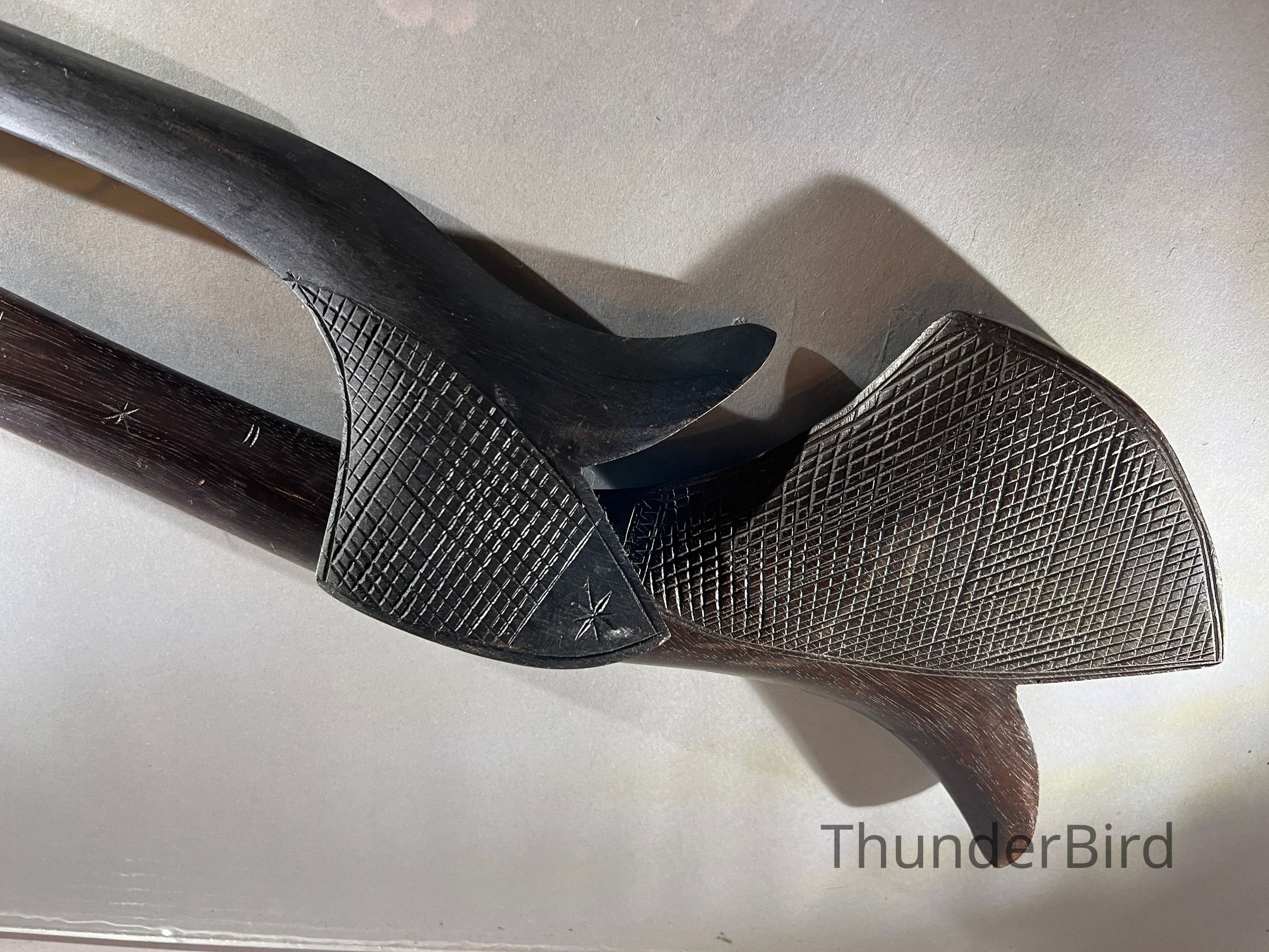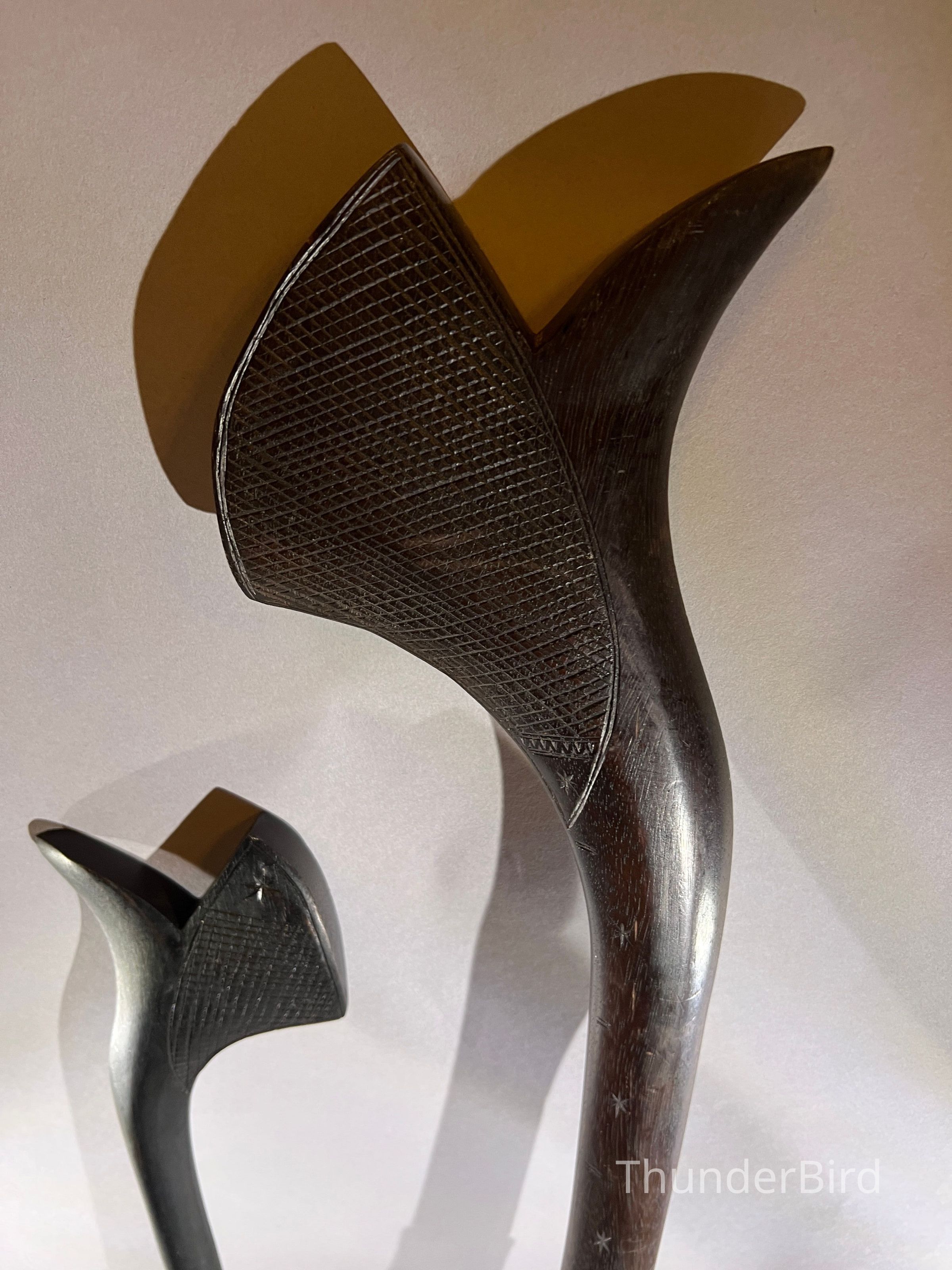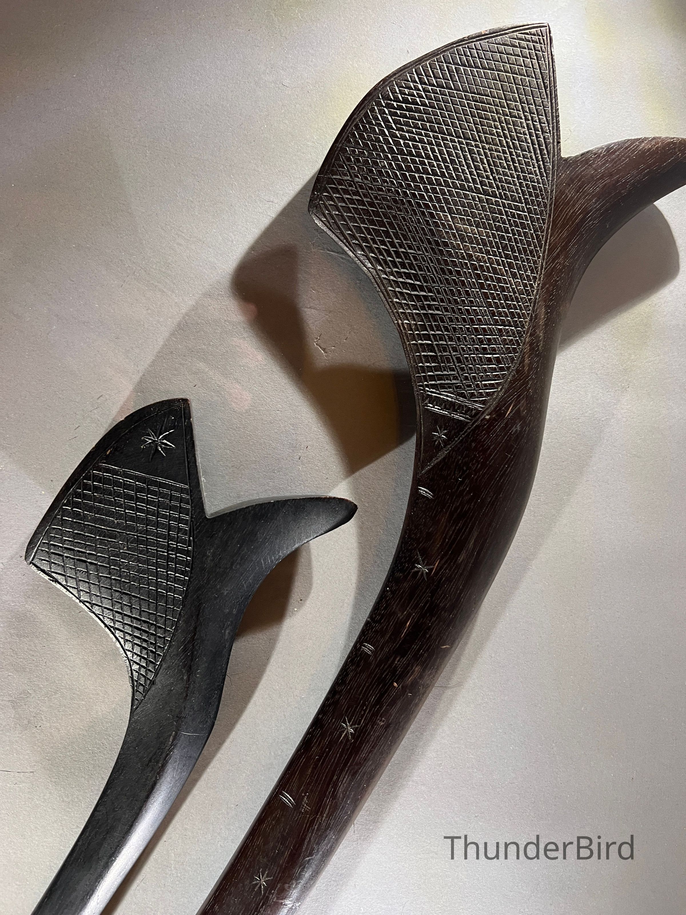 A striking pair of traditional hand-carved Pacific Island war clubs, featuring intricate cross-hatch carving and finely woven natural fibre grips. These clubs are crafted from dark hardwood and exhibit detailed geometric and starburst motifs. Such clubs were historically used in ceremonial, status, and combat contexts across various Pacific cultures.