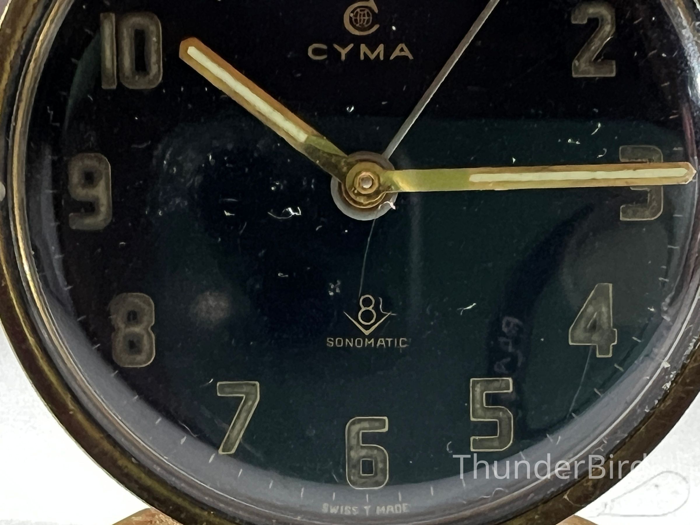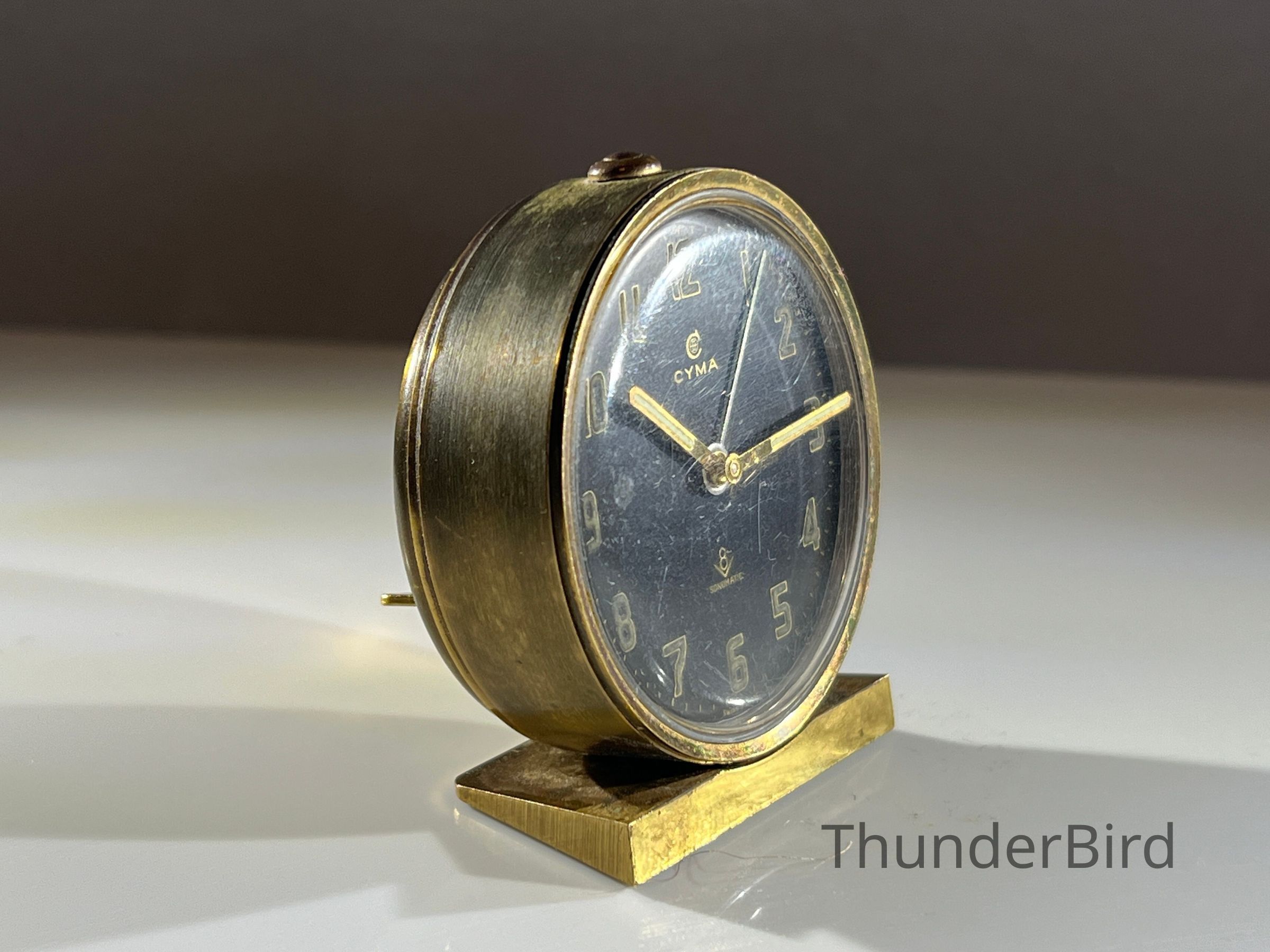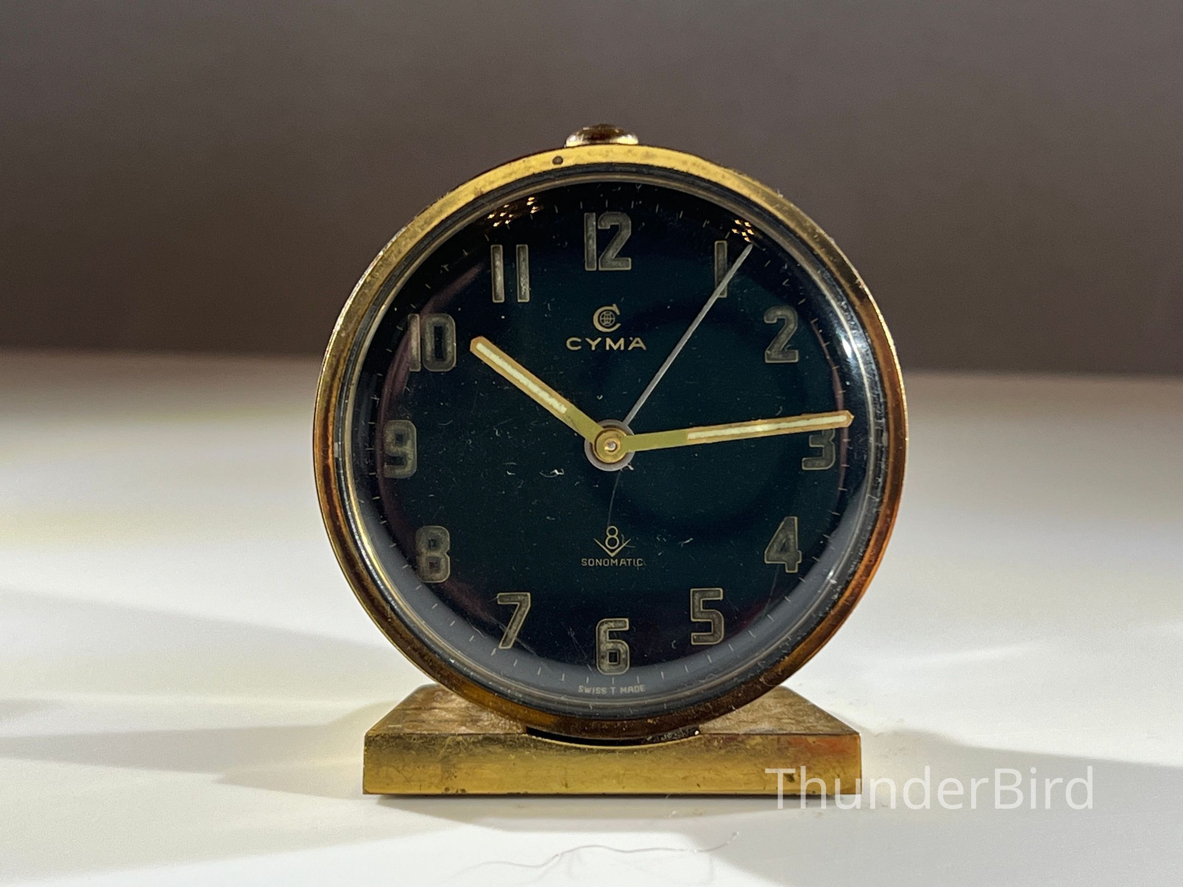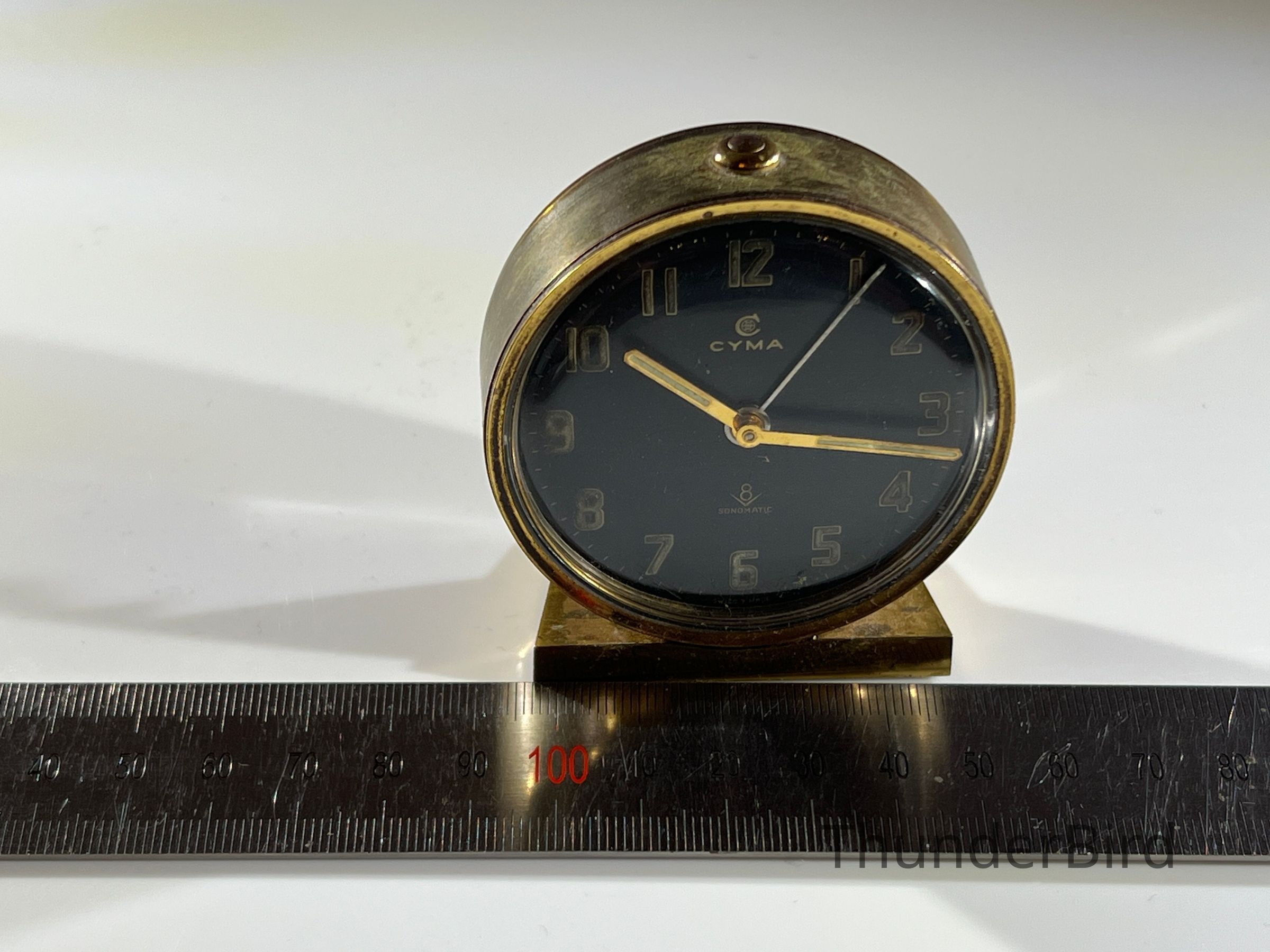 A vintage Cyma Sonomatic Swiss-made clock featuring a classic black dial with gold-tone numerals and hands. This compact, solidly built timepiece has a brass case with an aged patina. The lever movement runs on 17 jewels and includes an integrated alarm function, this little clock will run for 8 days! Marked "Cyma Watch Co. Swiss" on the reverse, along with Cyma’s patent and adjustment settings.