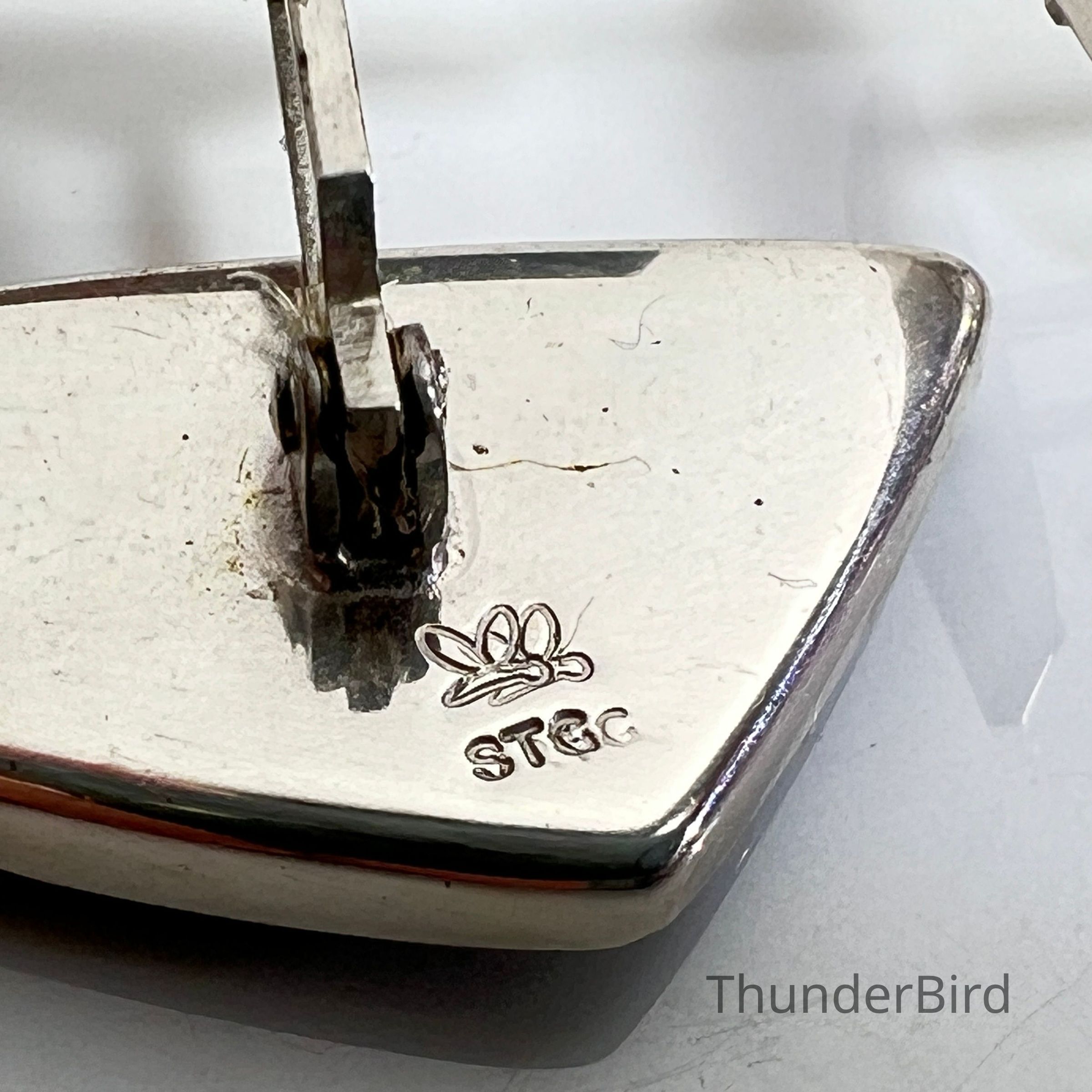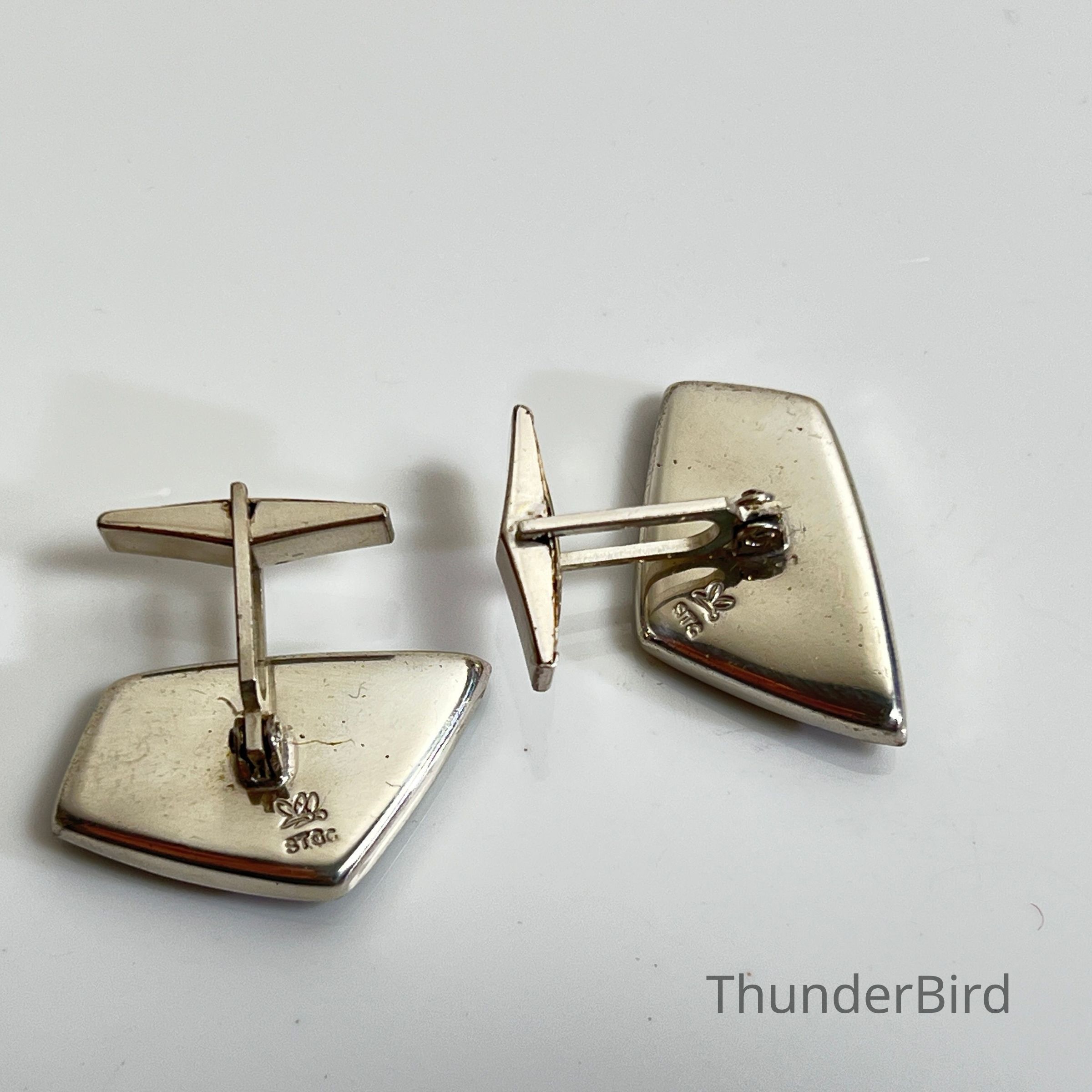 A pair of vintage cufflinks featuring vibrant natural New Zealand paua shell inlays set in sterling silver. Each cufflink is marked “STG” (denoting sterling silver) alongside a butterfly or bee maker’s mark. These angular, mid-century designs are representative of the era’s bold styling and local craftsmanship.