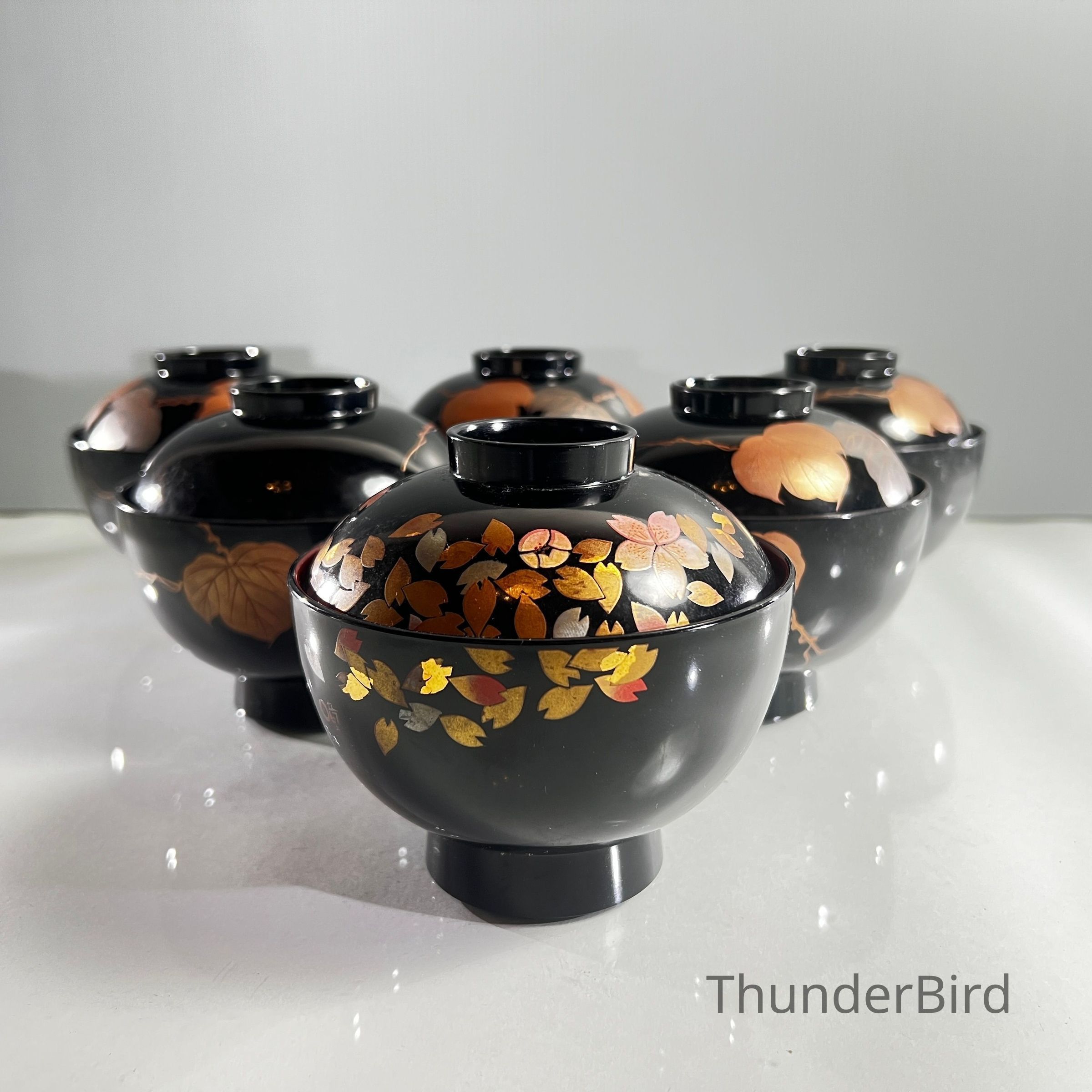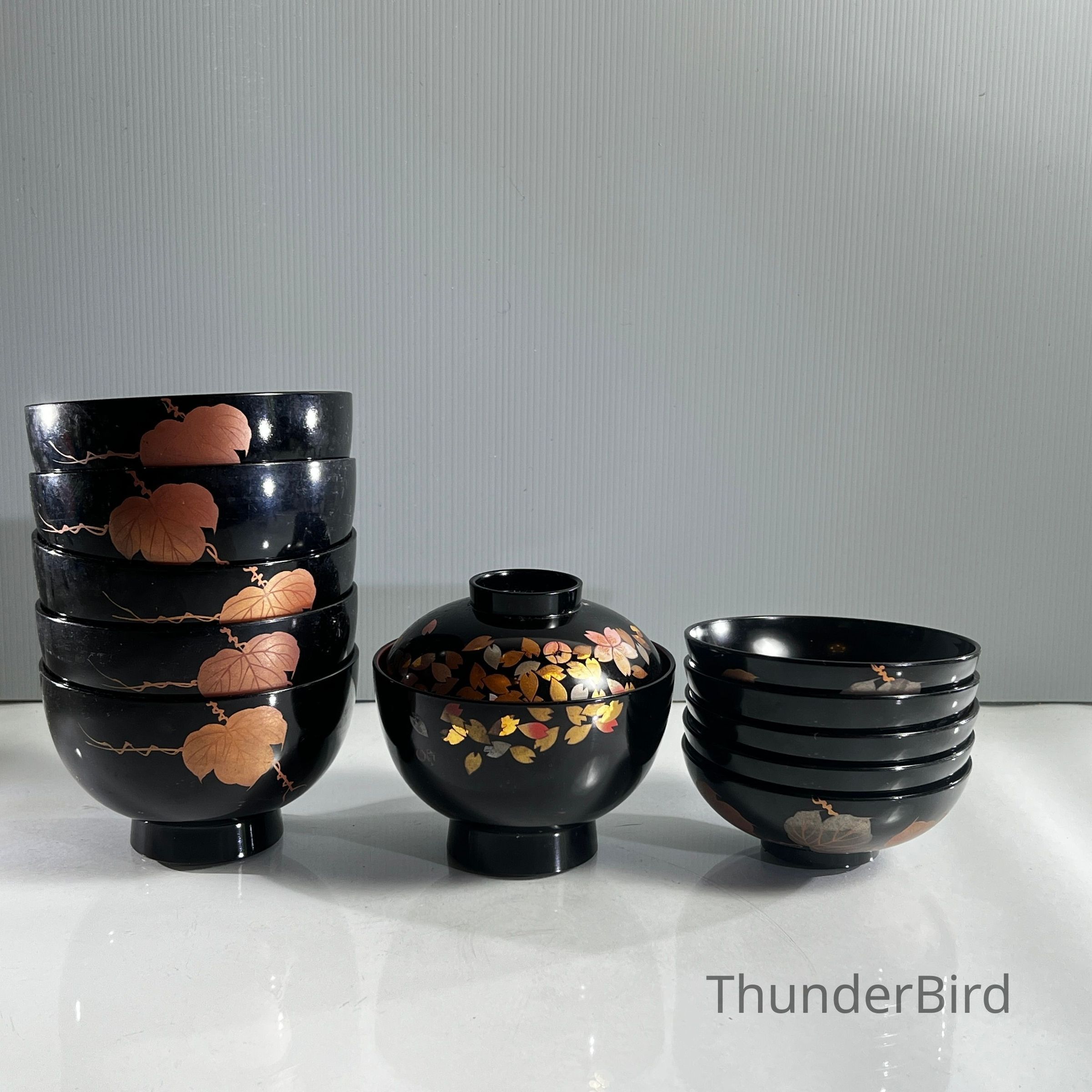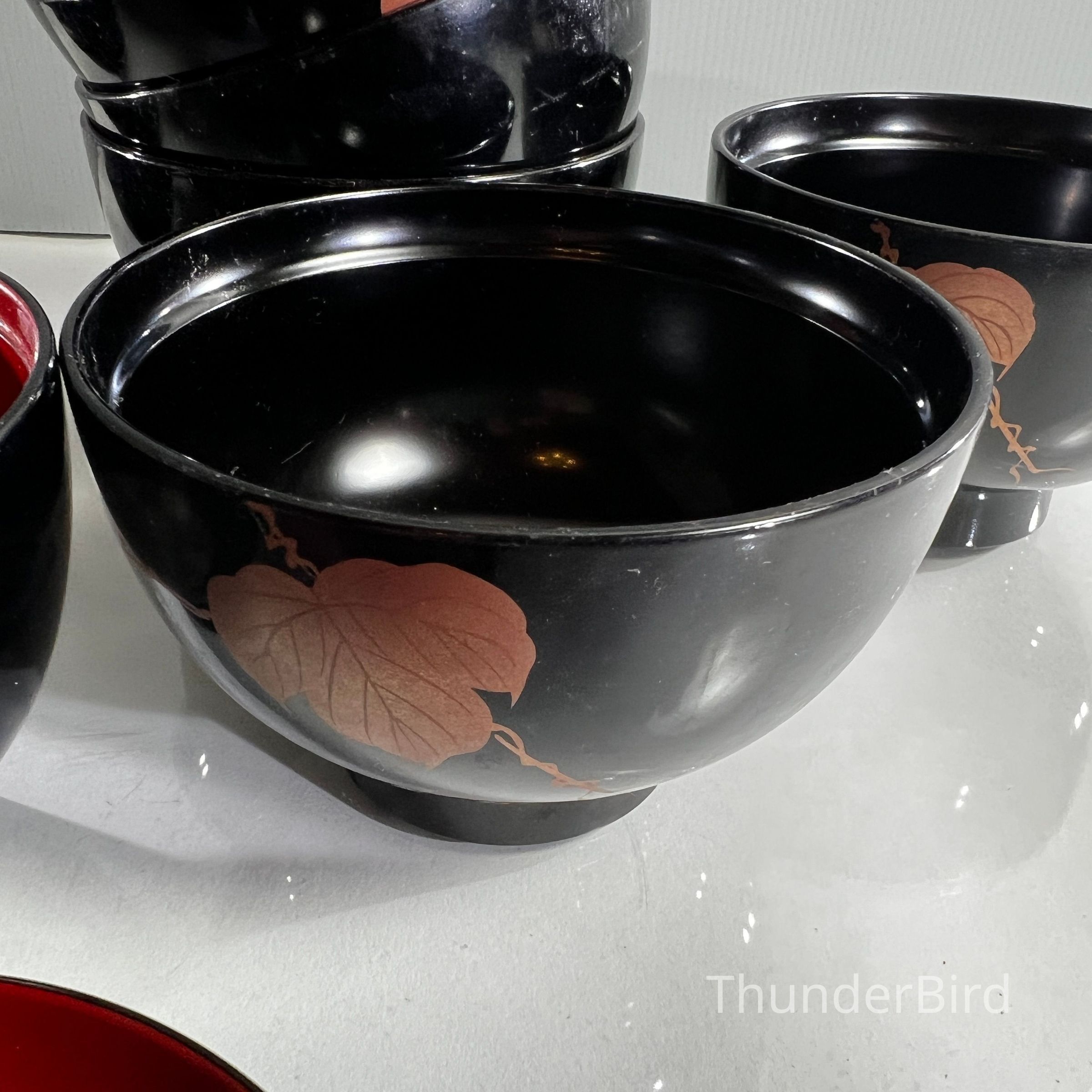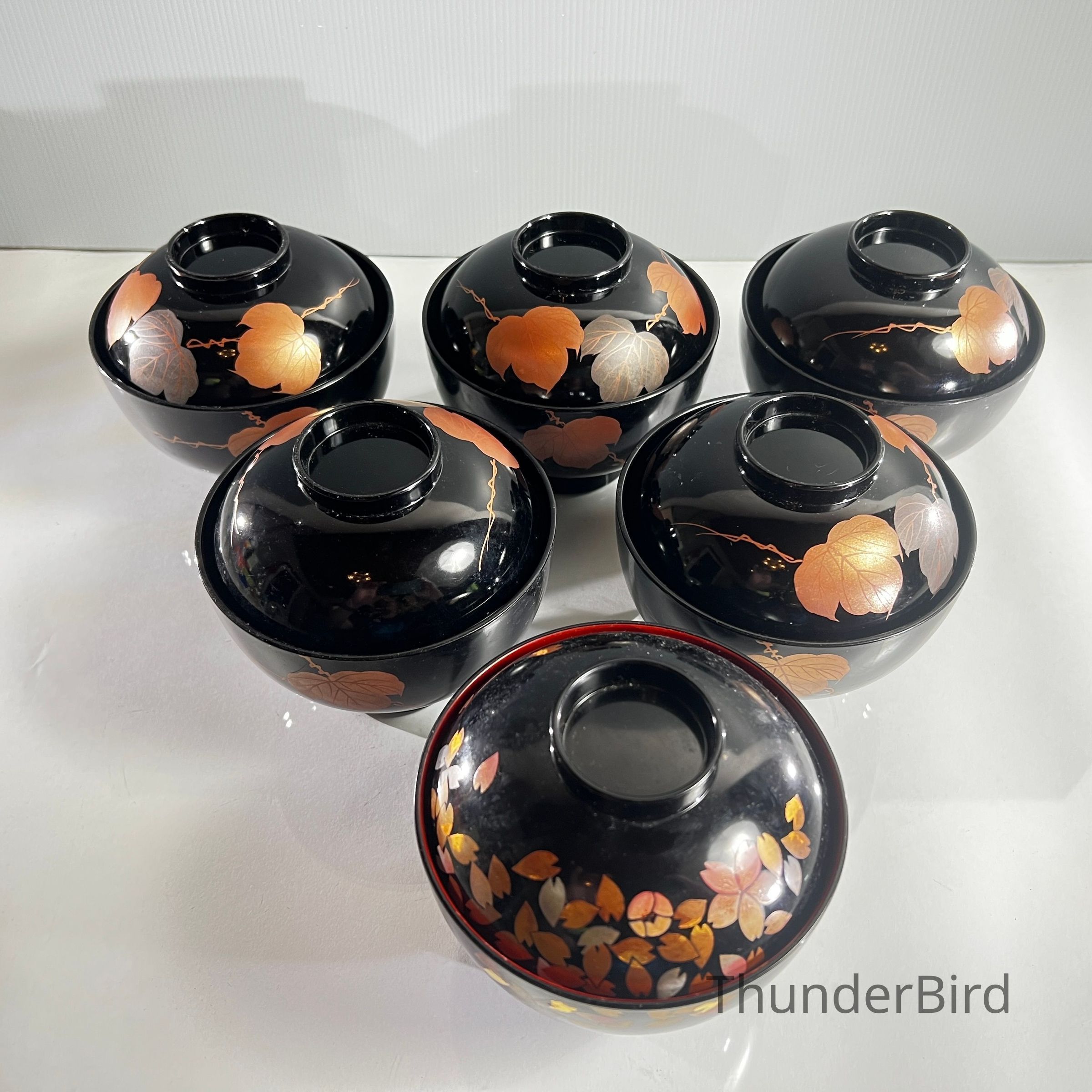 A beautiful vintage Japanese lacquerware set featuring six lidded soup/noodle bowls, each decorated with hand-painted gold and copper botanical motifs. Five bowls feature a black interior with matching lids and a red maker’s seal to the base; one bowl has a traditional vermillion-red interior. Classic Japanese lacquerware, lightweight yet durable, and ideal for serving or display.