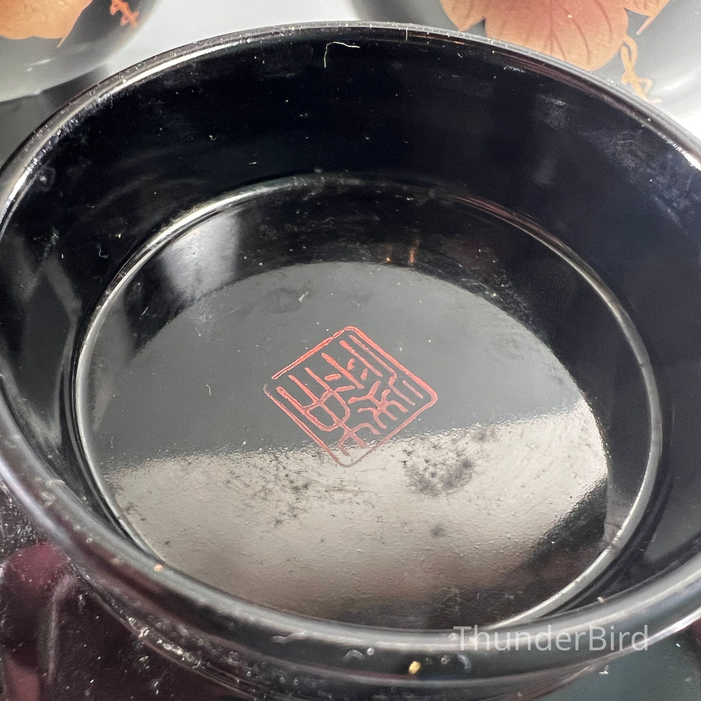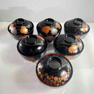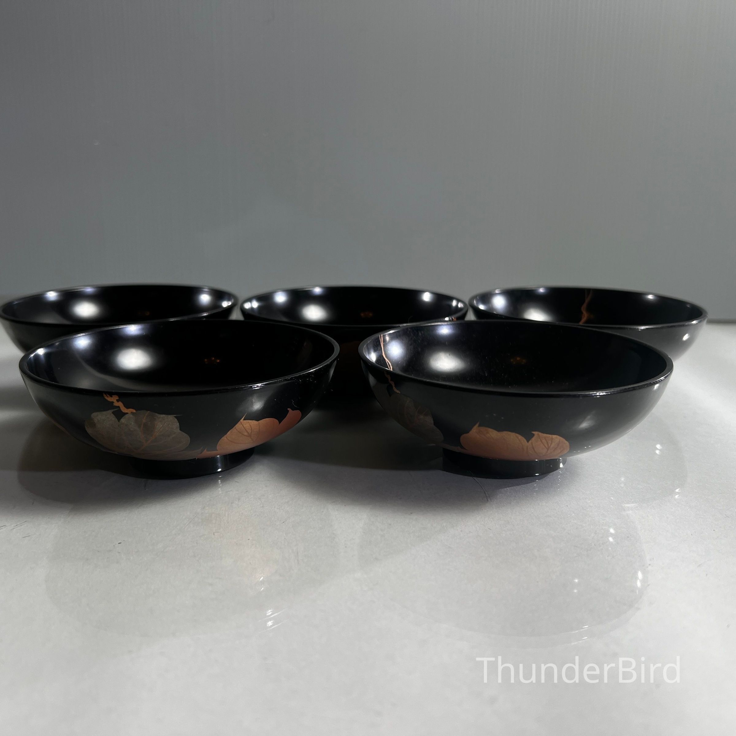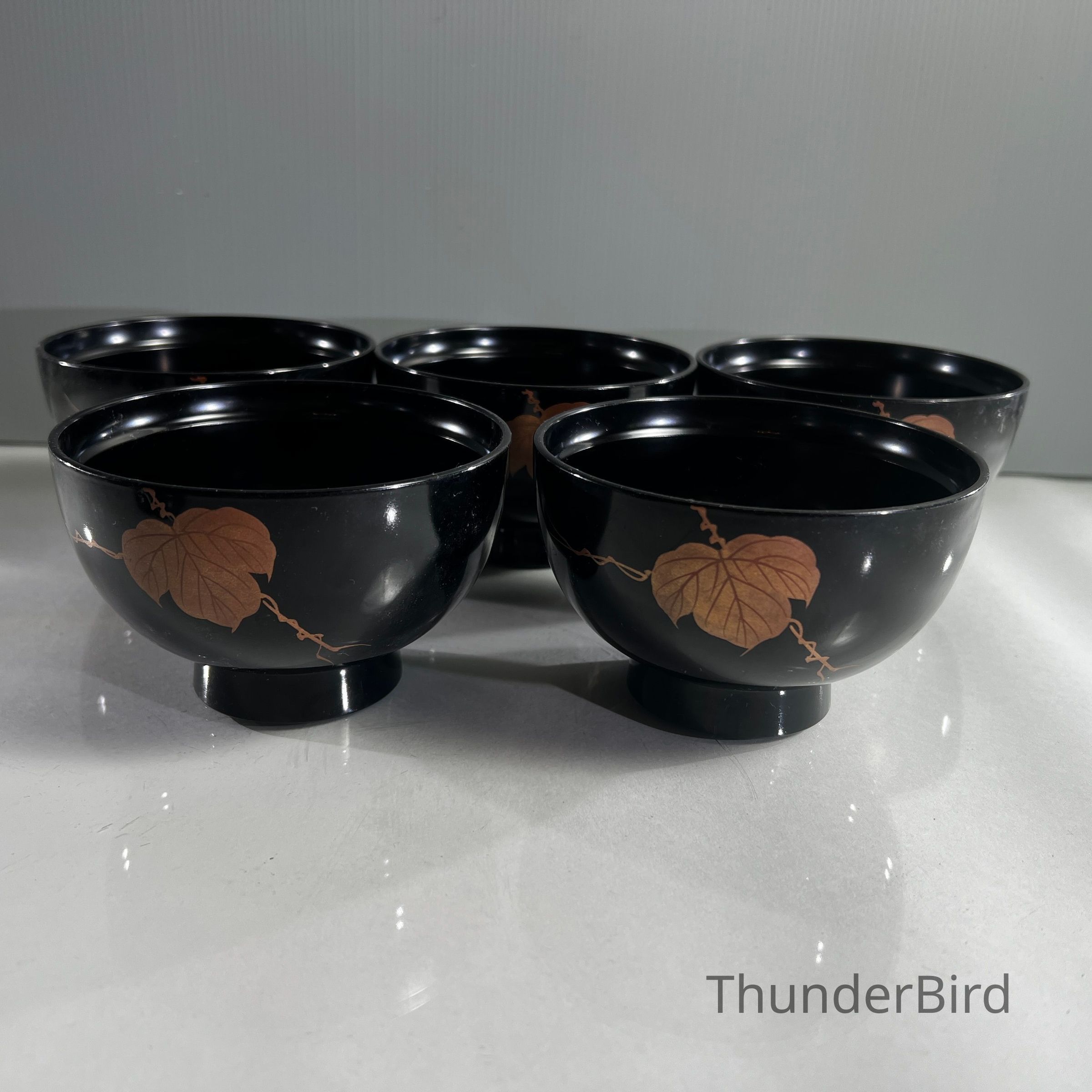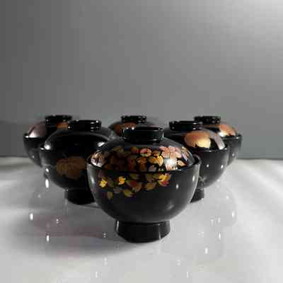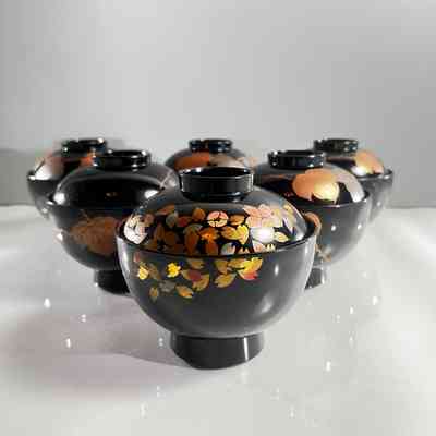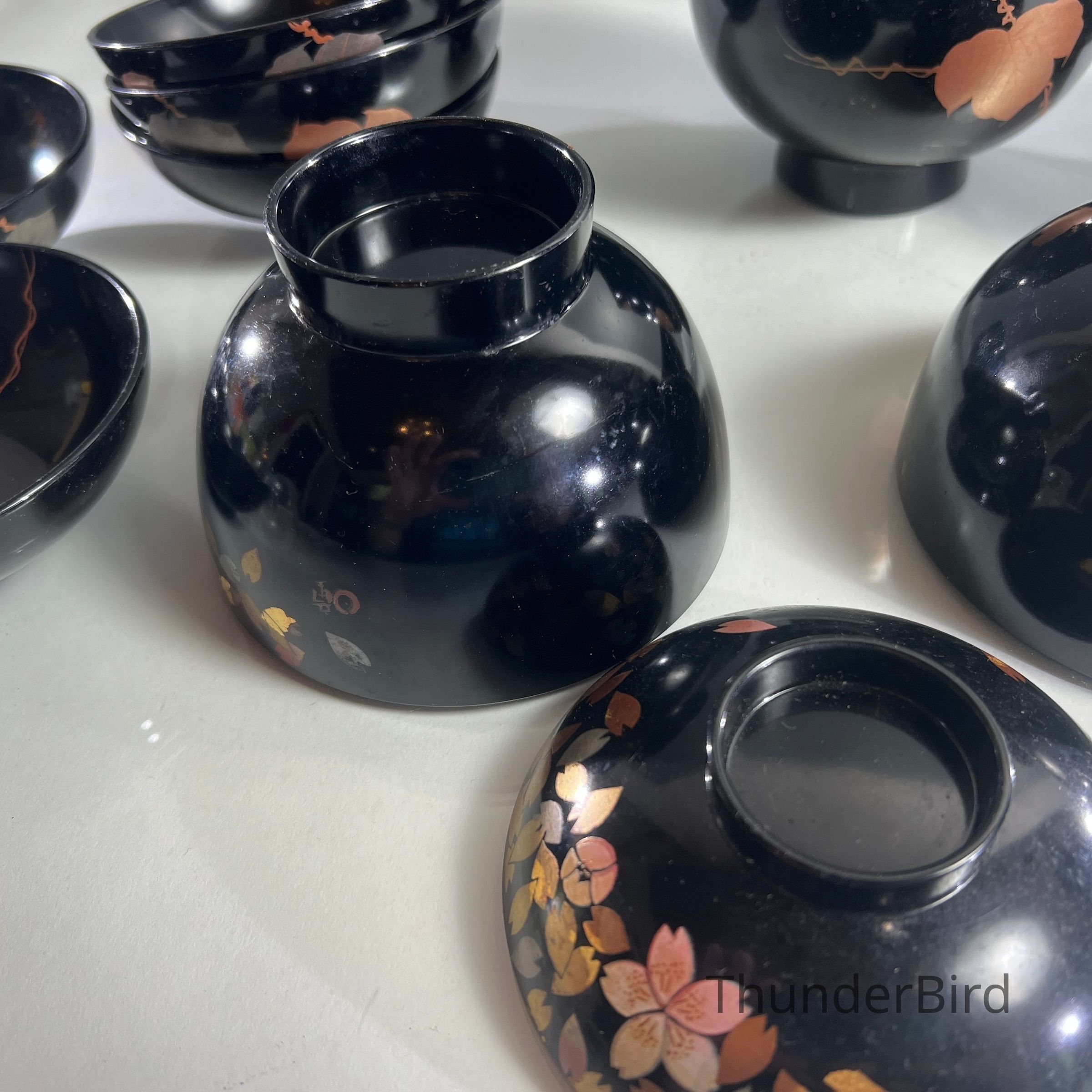 A beautiful vintage Japanese lacquerware set featuring six lidded soup/noodle bowls, each decorated with hand-painted gold and copper botanical motifs. Five bowls feature a black interior with matching lids and a red maker’s seal to the base; one bowl has a traditional vermillion-red interior. Classic Japanese lacquerware, lightweight yet durable, and ideal for serving or display.