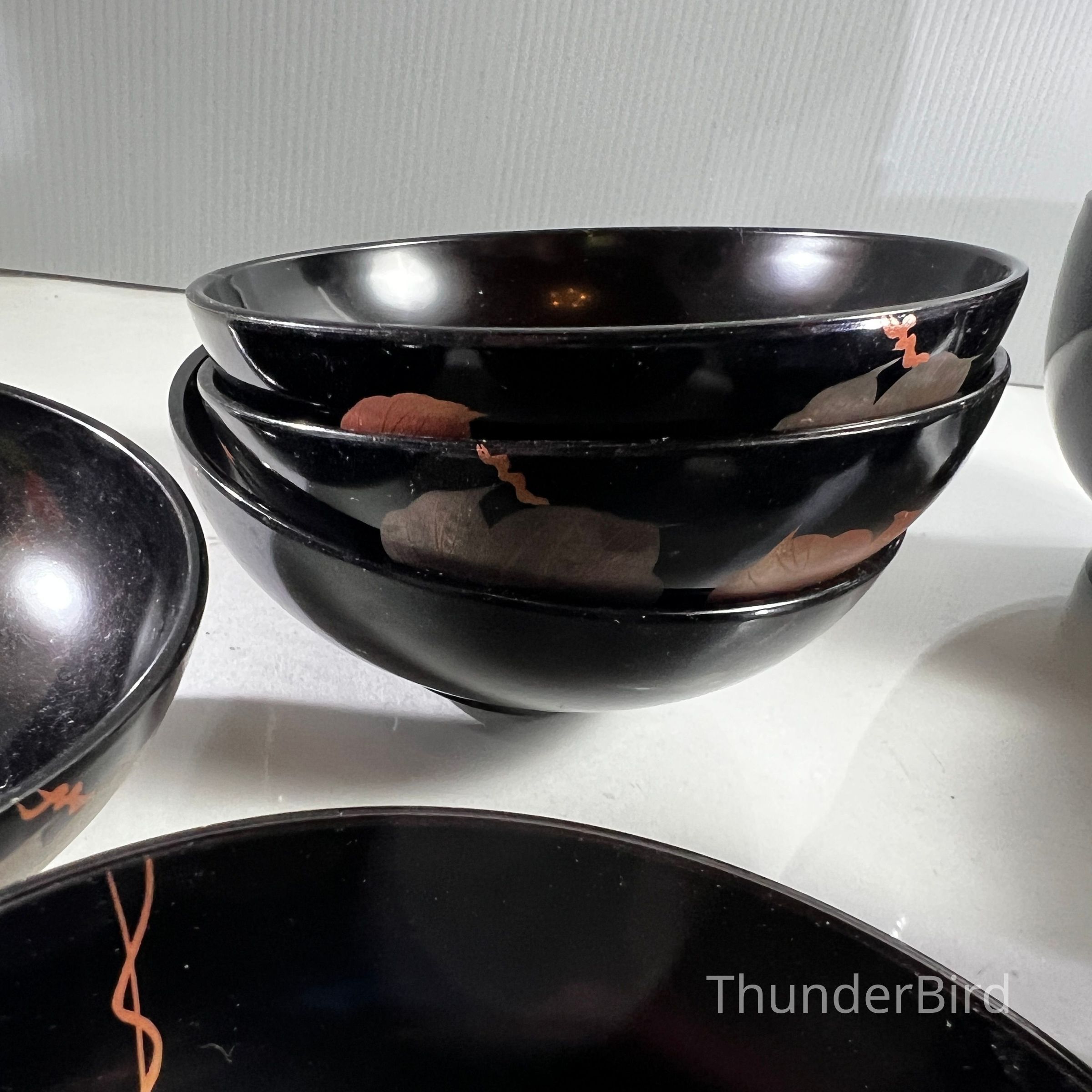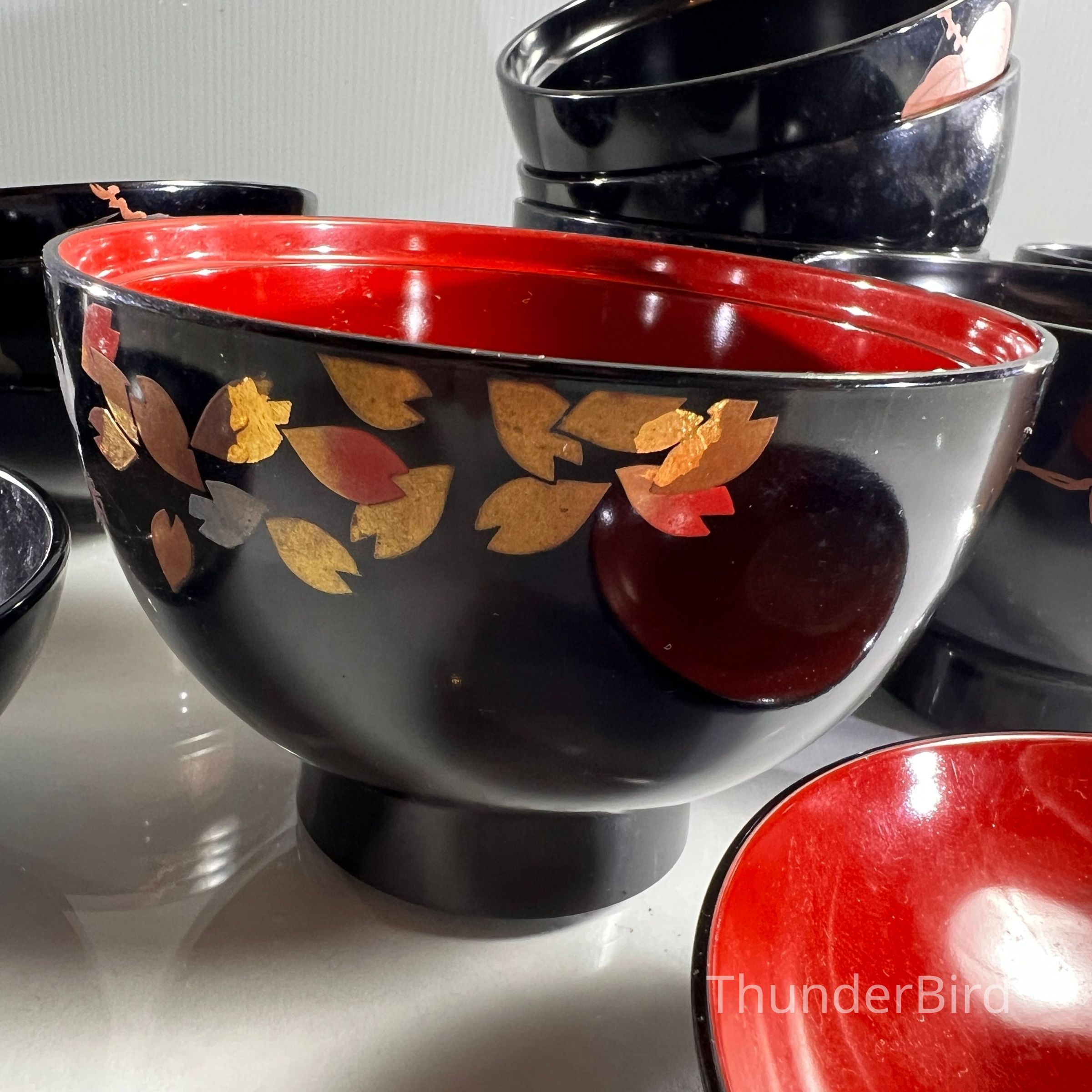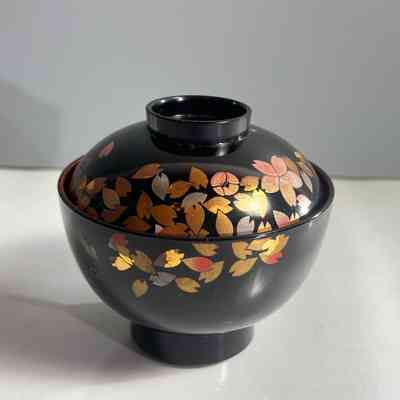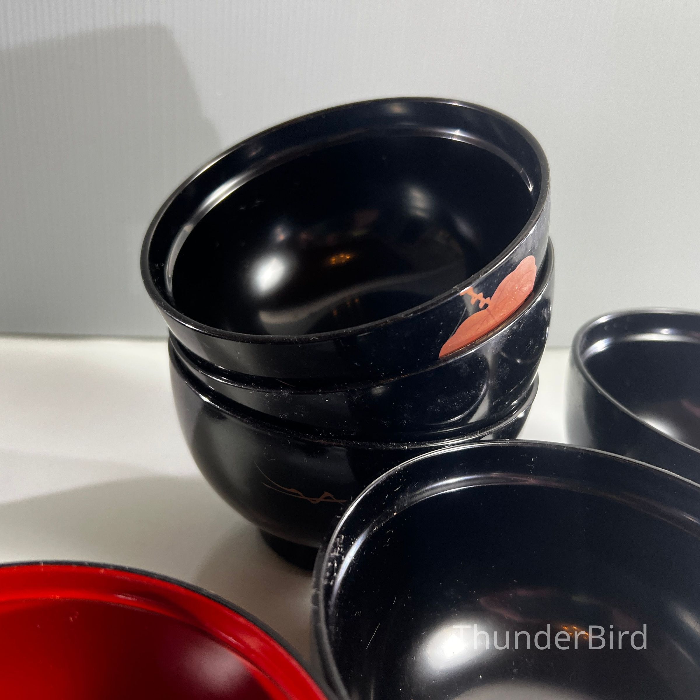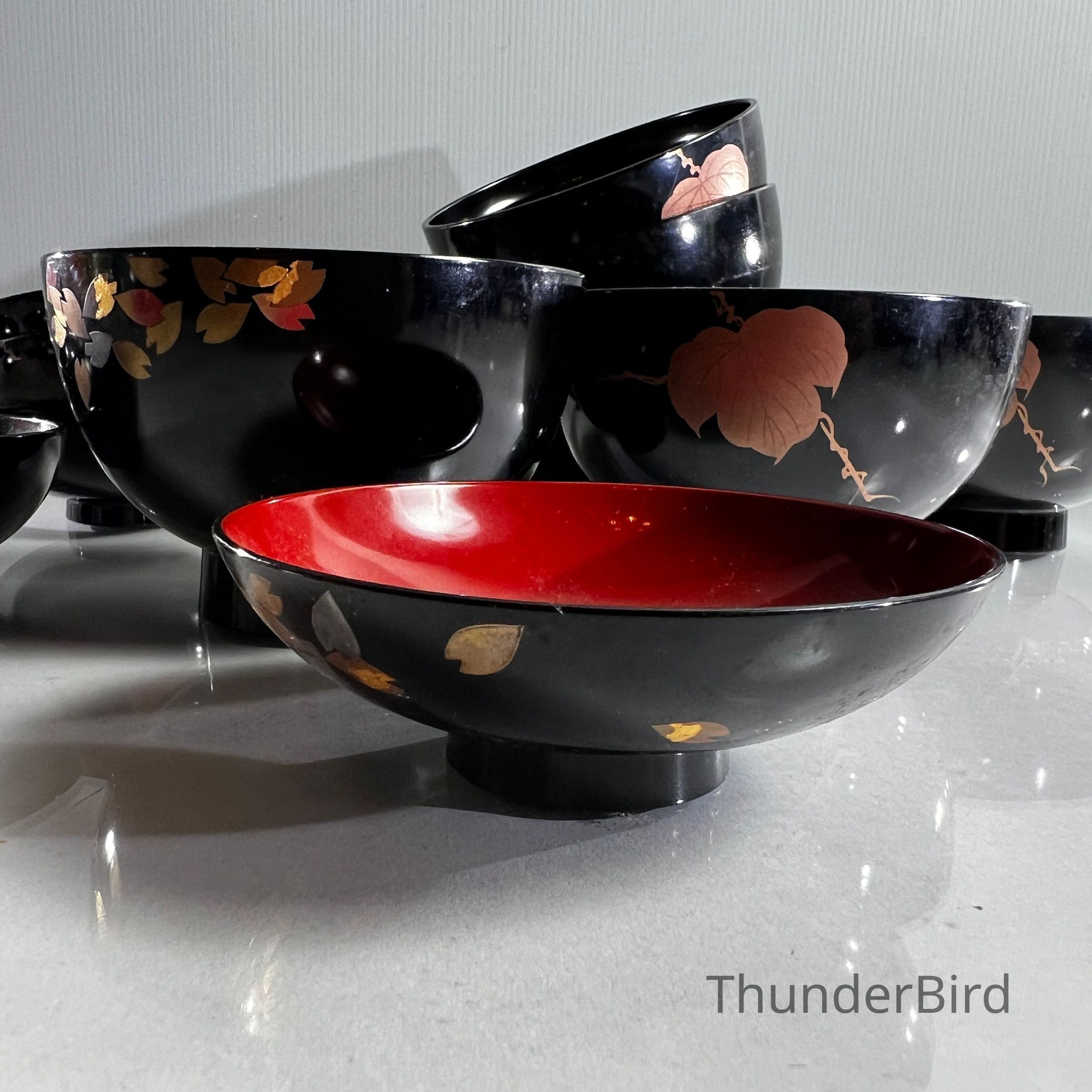 A beautiful vintage Japanese lacquerware set featuring six lidded soup/noodle bowls, each decorated with hand-painted gold and copper botanical motifs. Five bowls feature a black interior with matching lids and a red maker’s seal to the base; one bowl has a traditional vermillion-red interior. Classic Japanese lacquerware, lightweight yet durable, and ideal for serving or display.